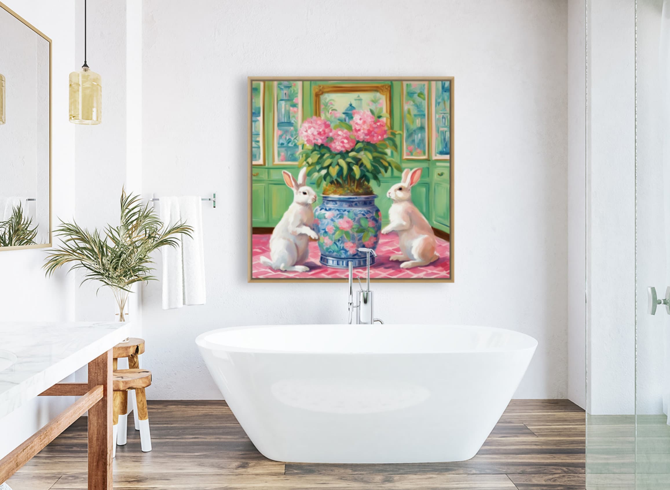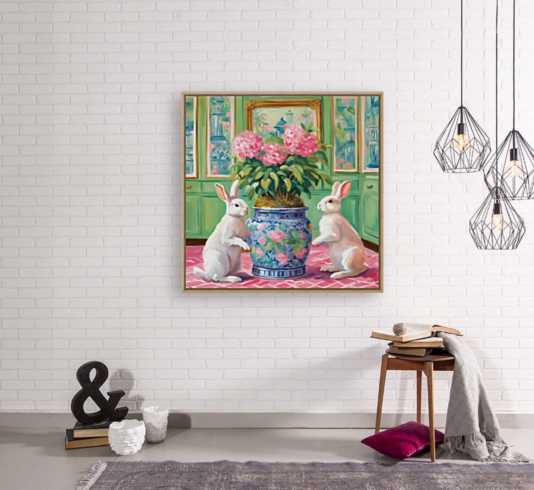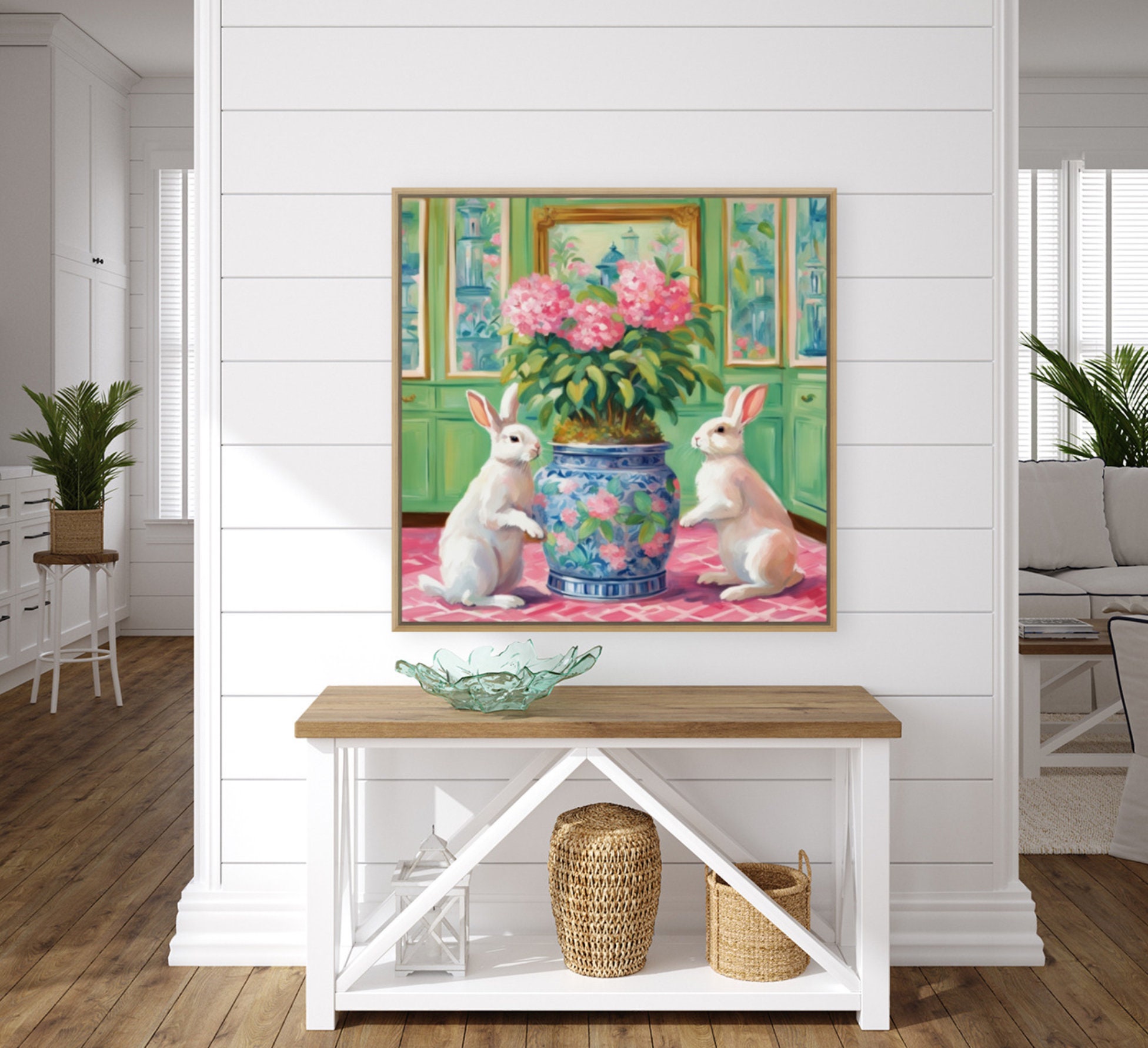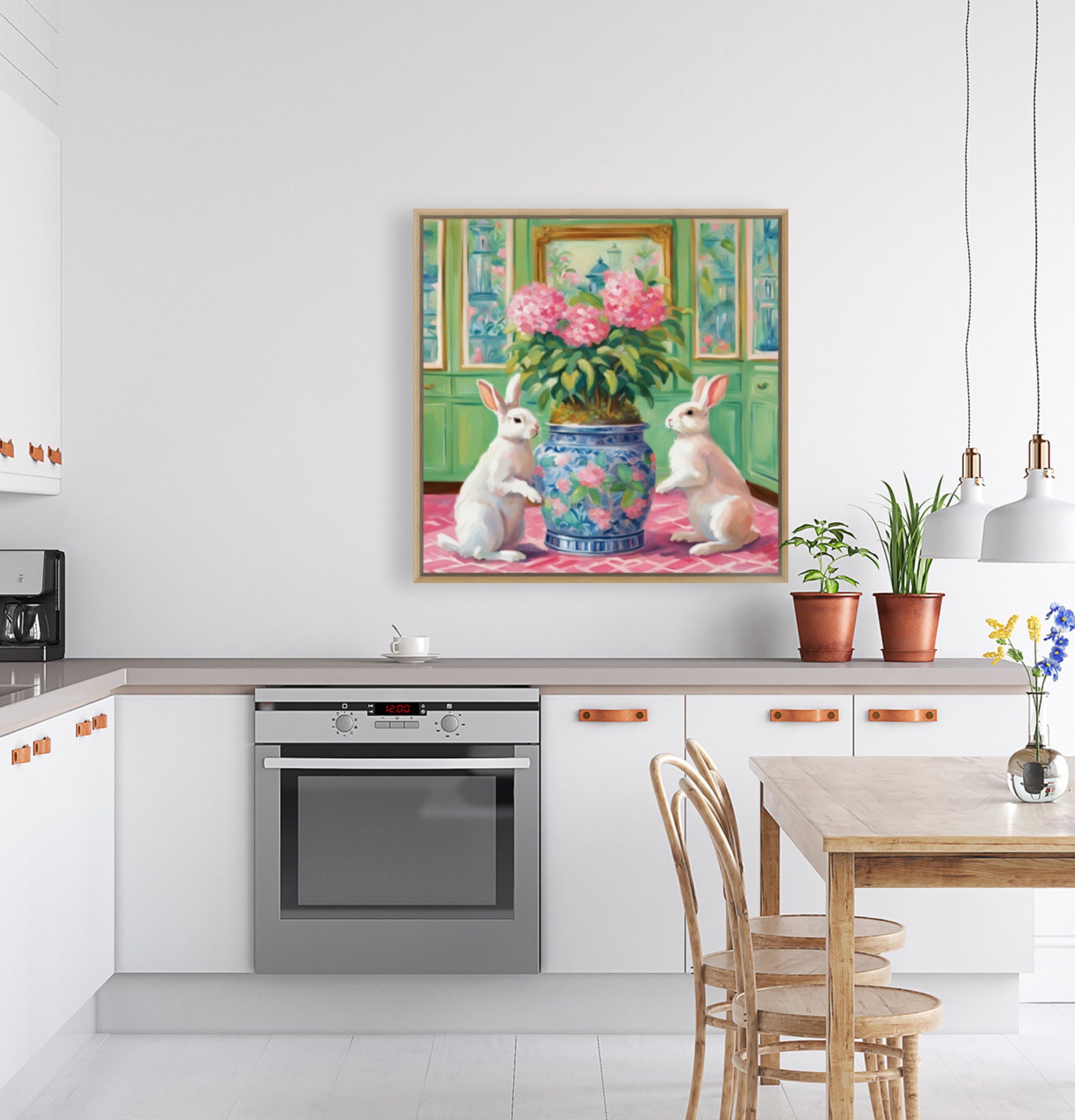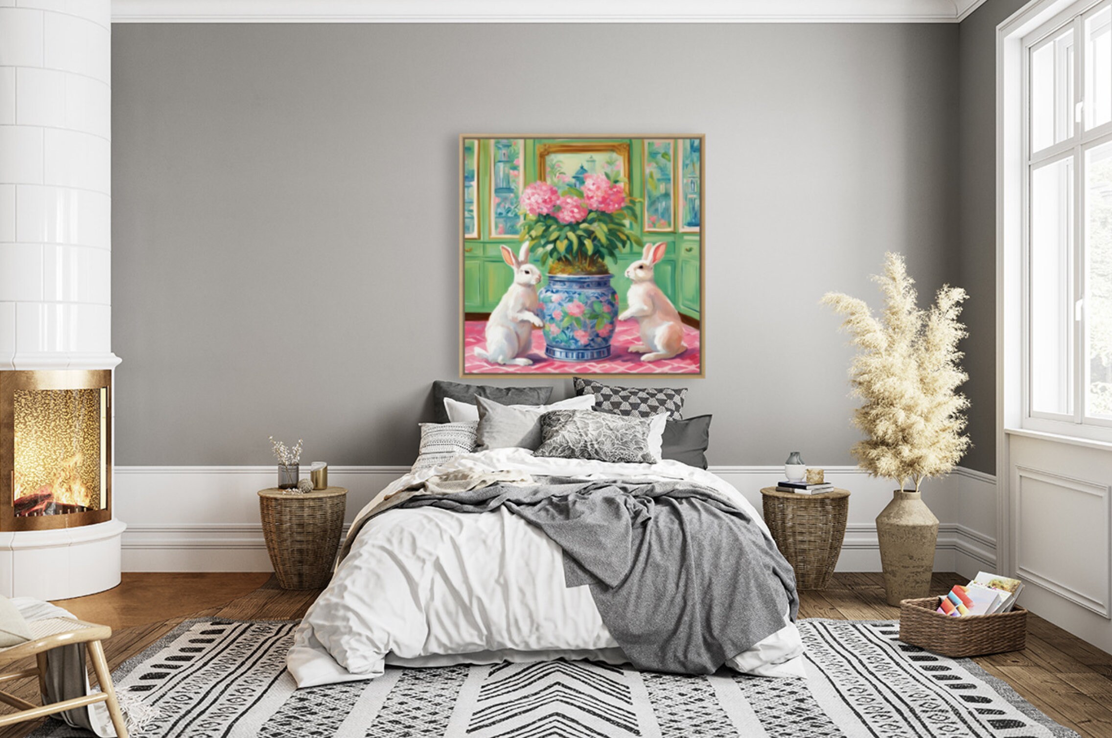 Grandmillennial art, Bunnies and hydrangea bush, whimsical fine art