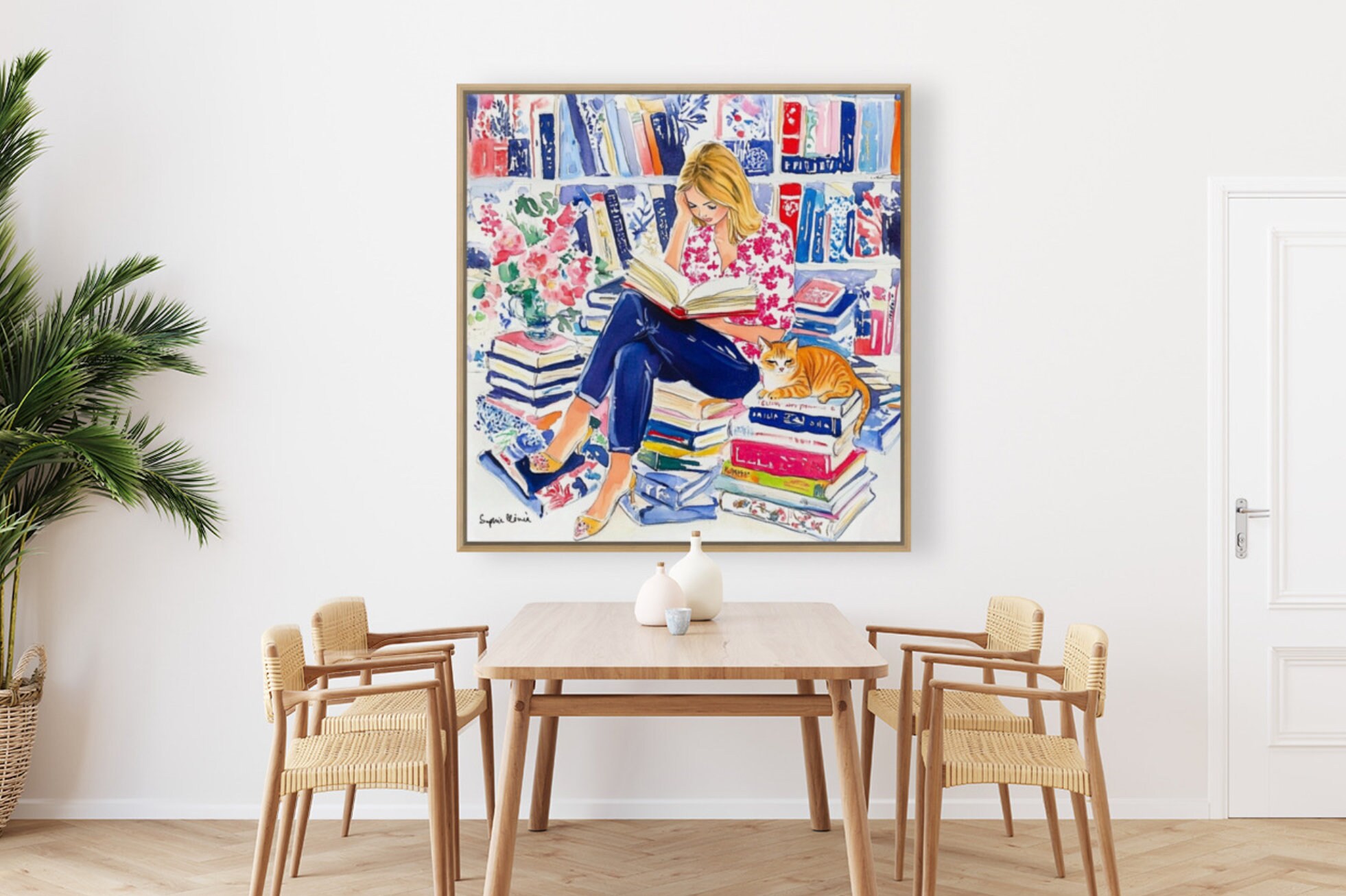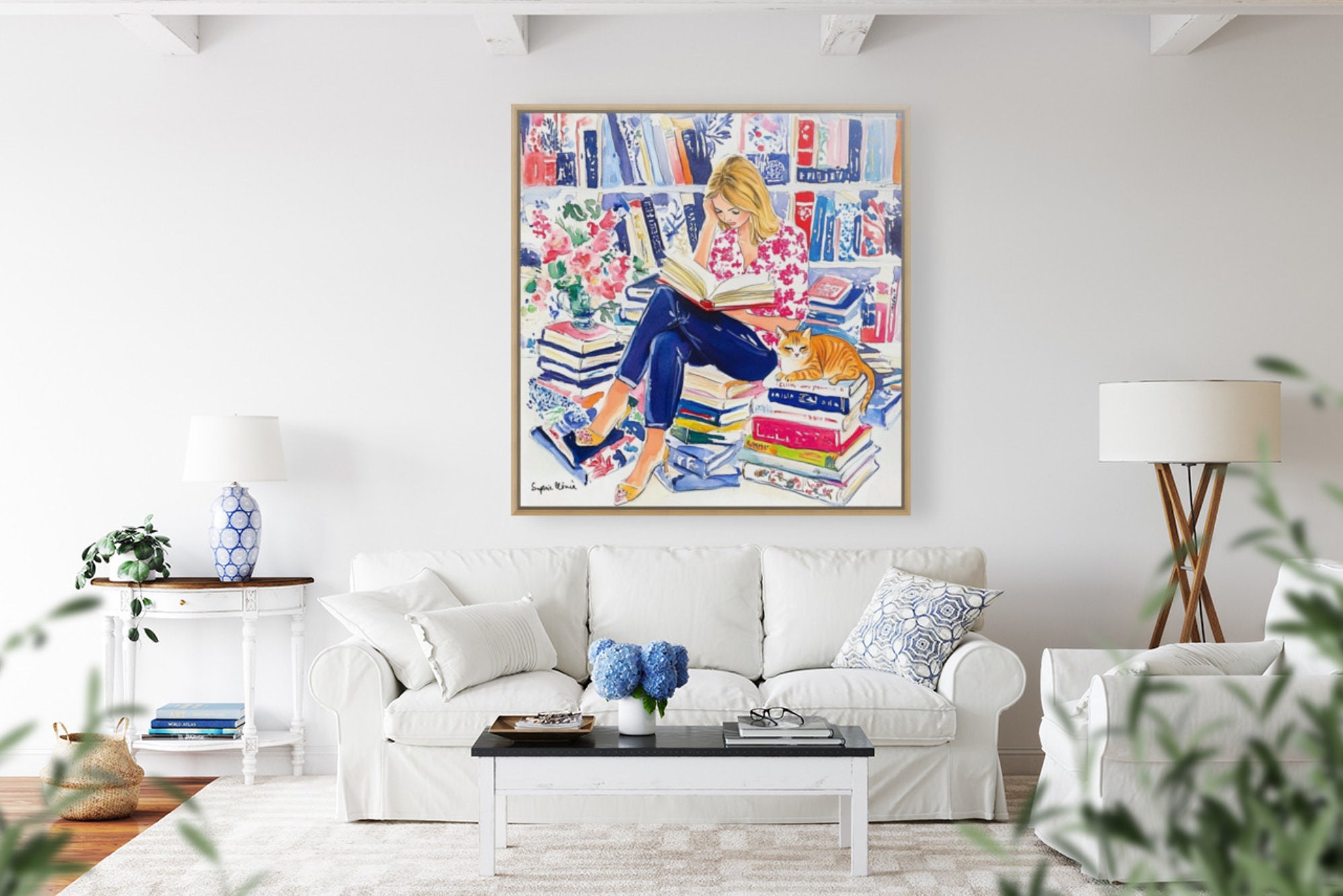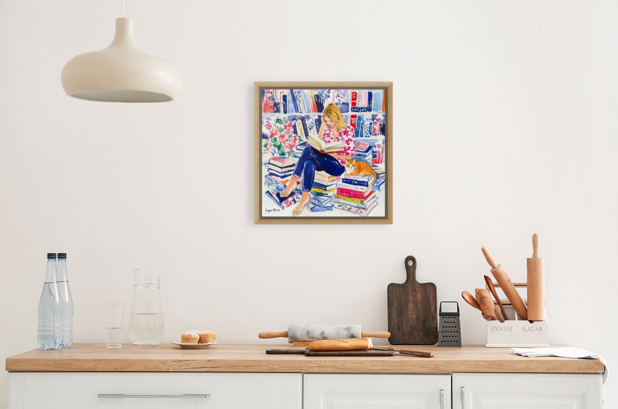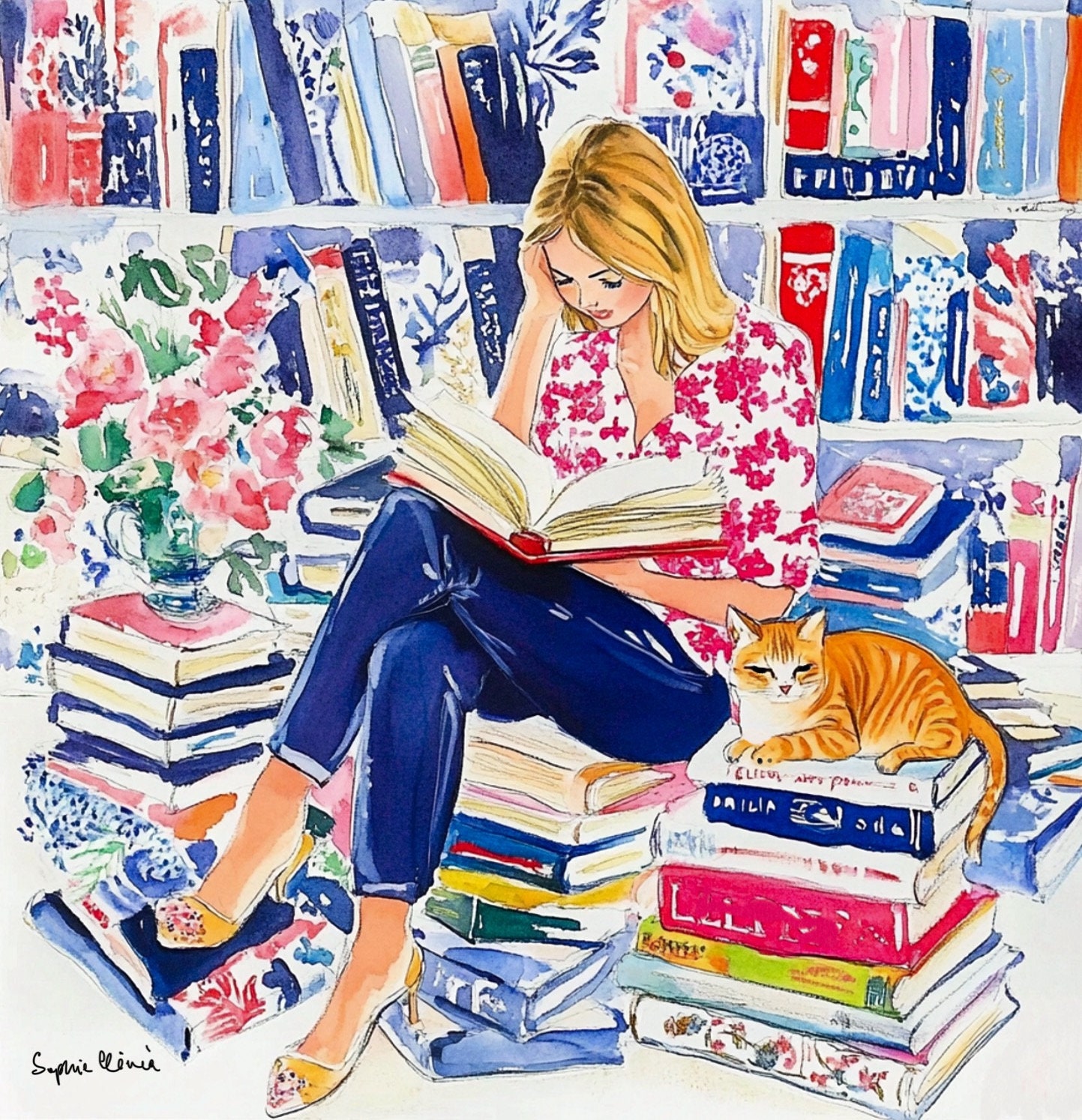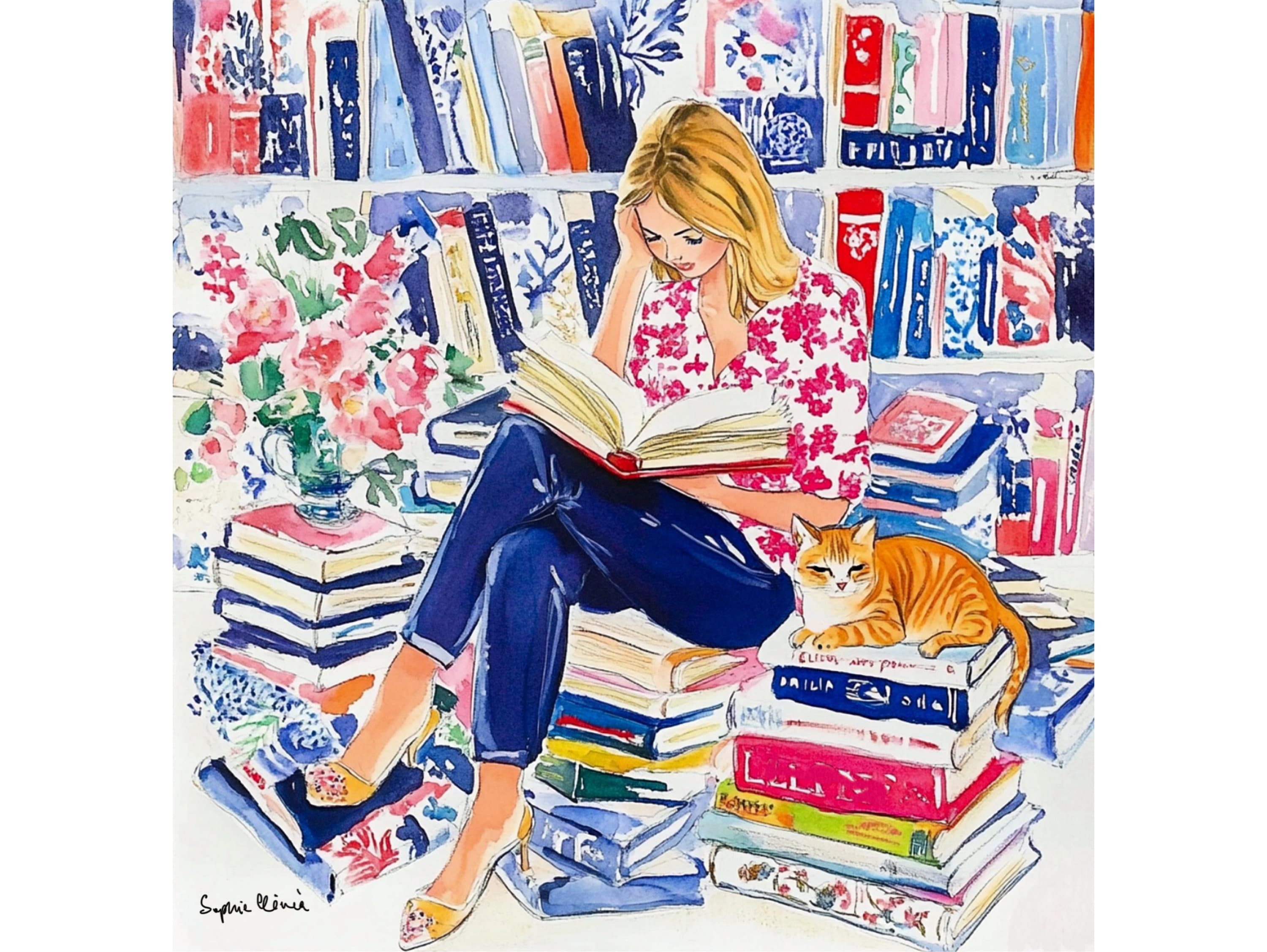 Grandmillennial art, In The Library, whimsical watercolor and pen sketch
