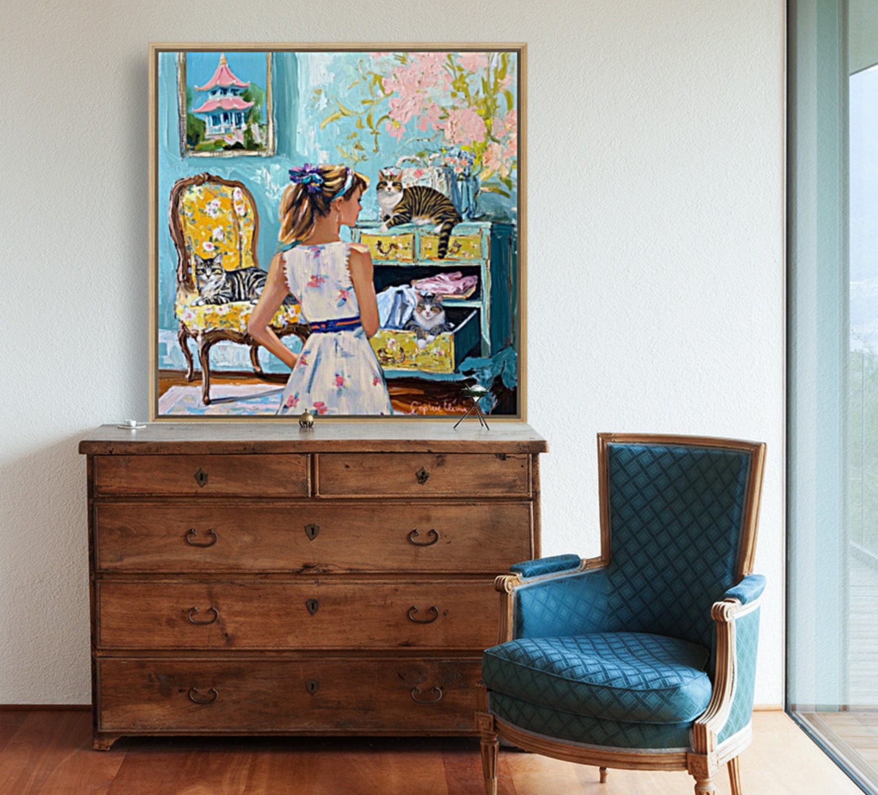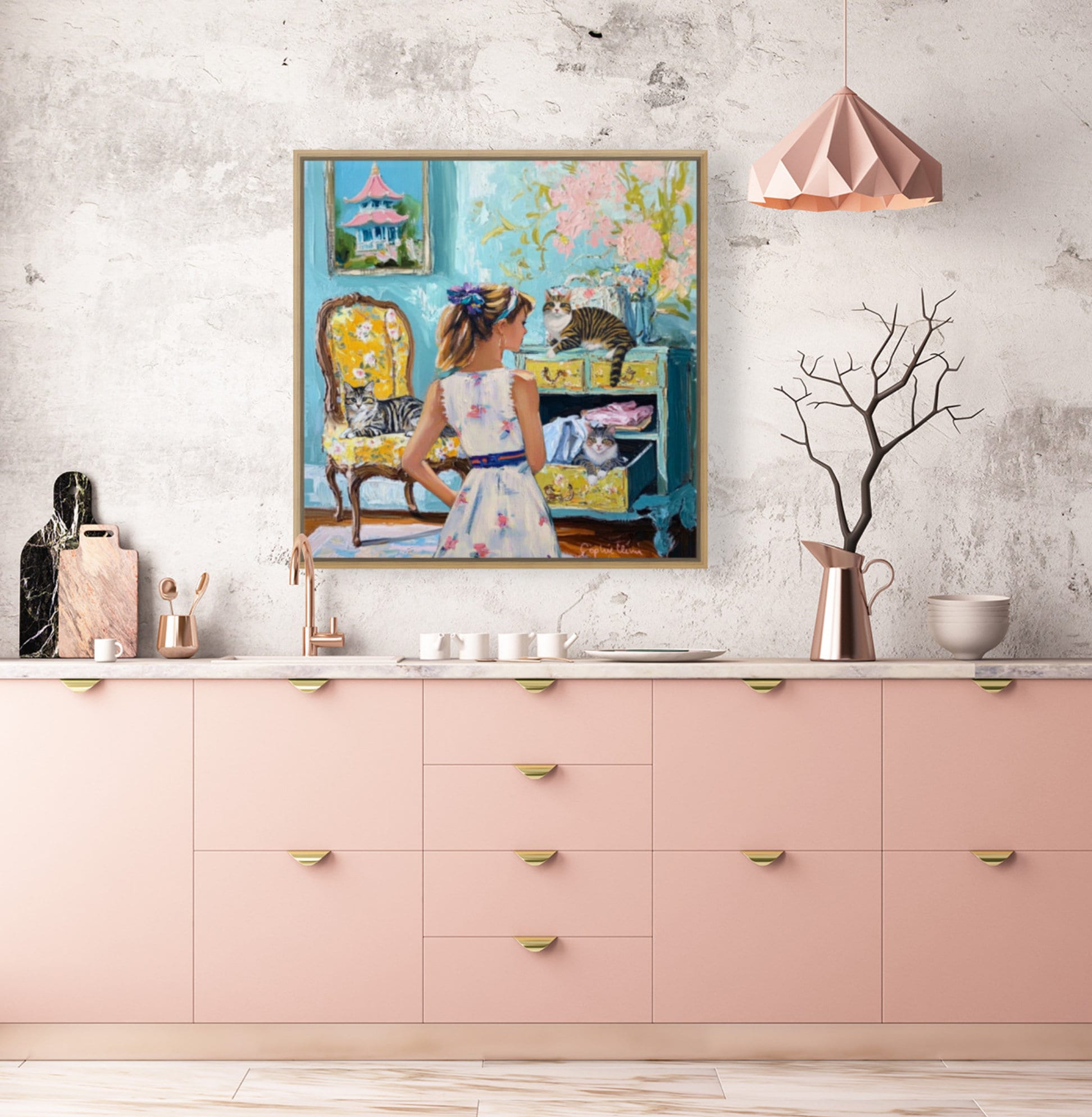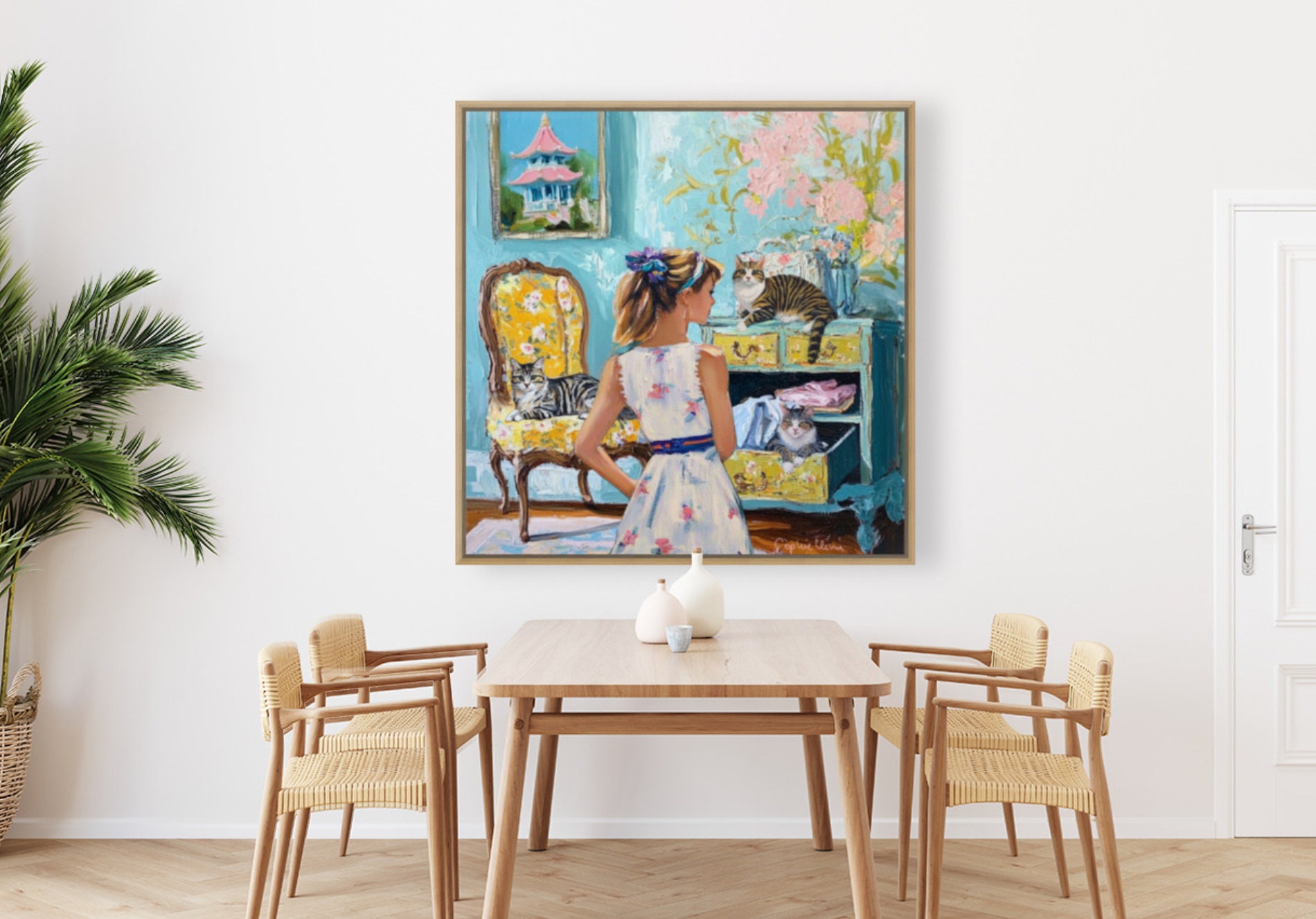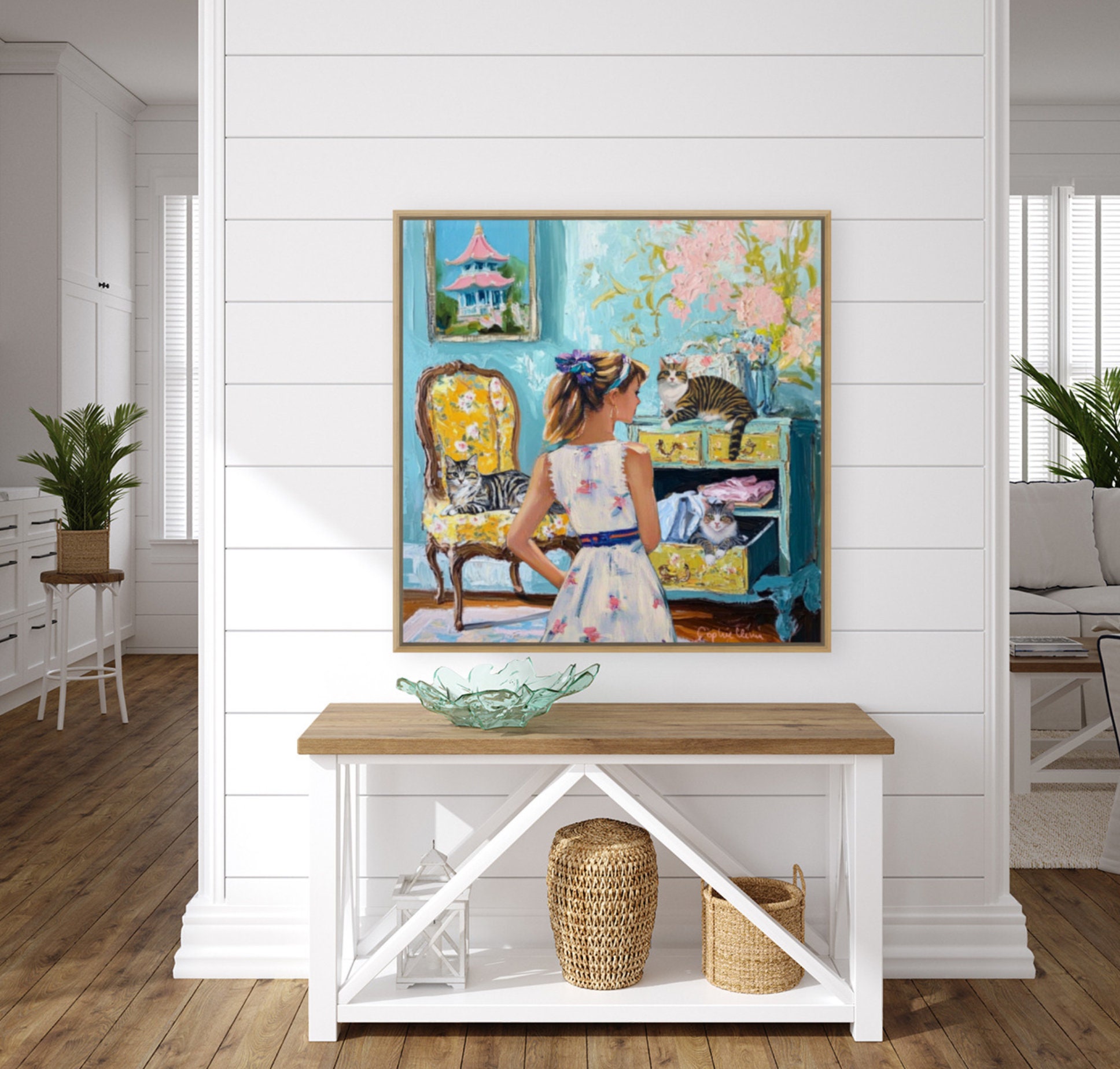 Whimsical Grandmillennial Cat Illustration: Caught Red-Pawed Fine Art for Preppy Interior Decor