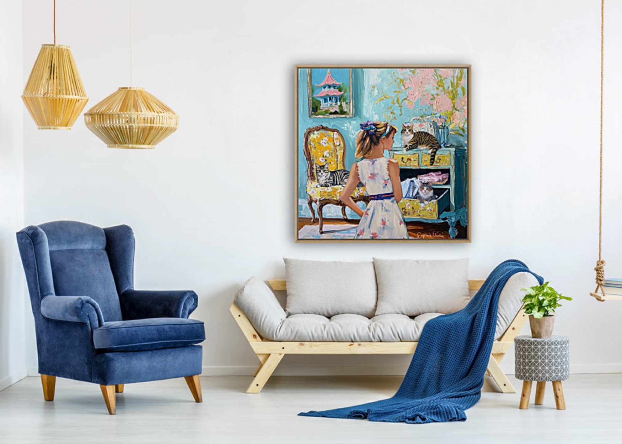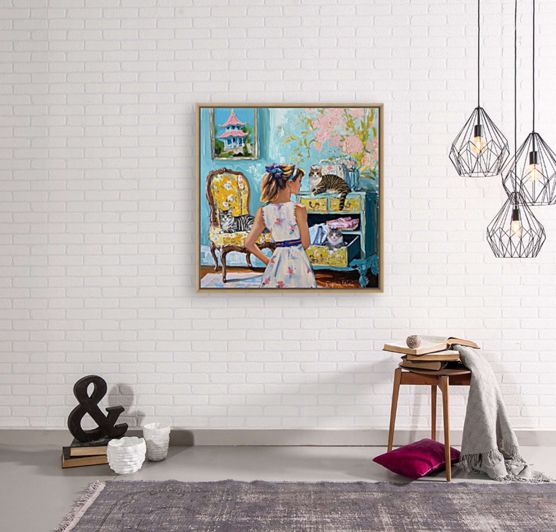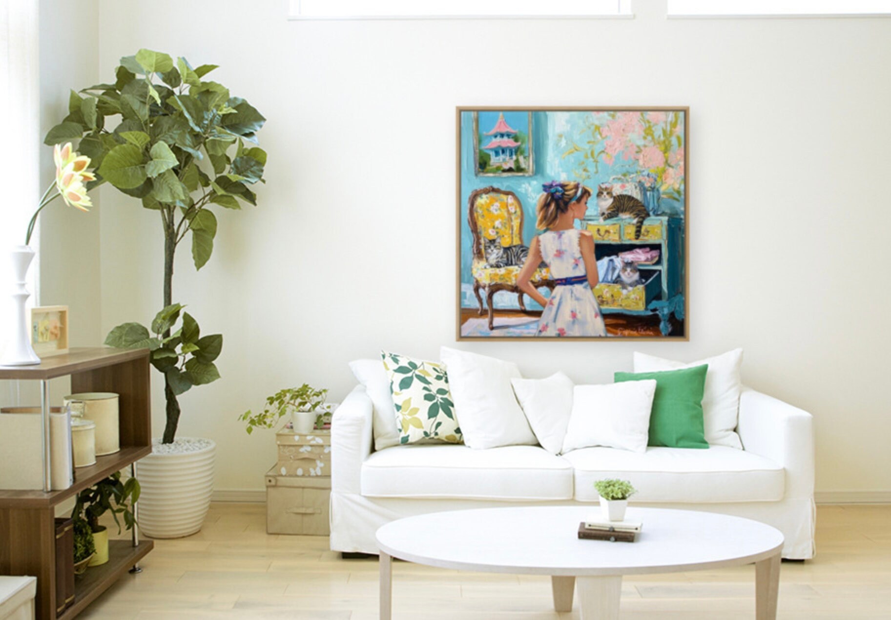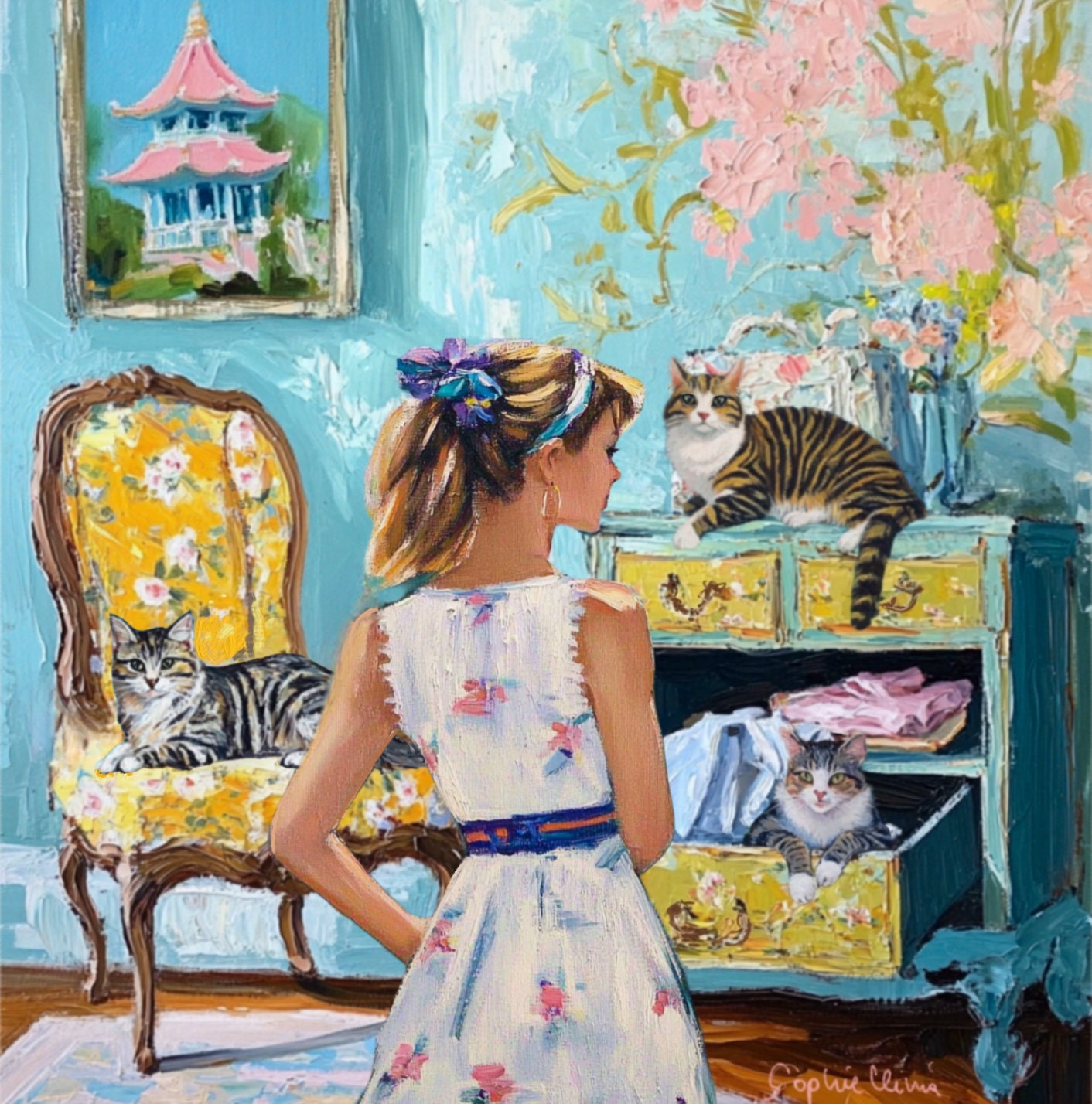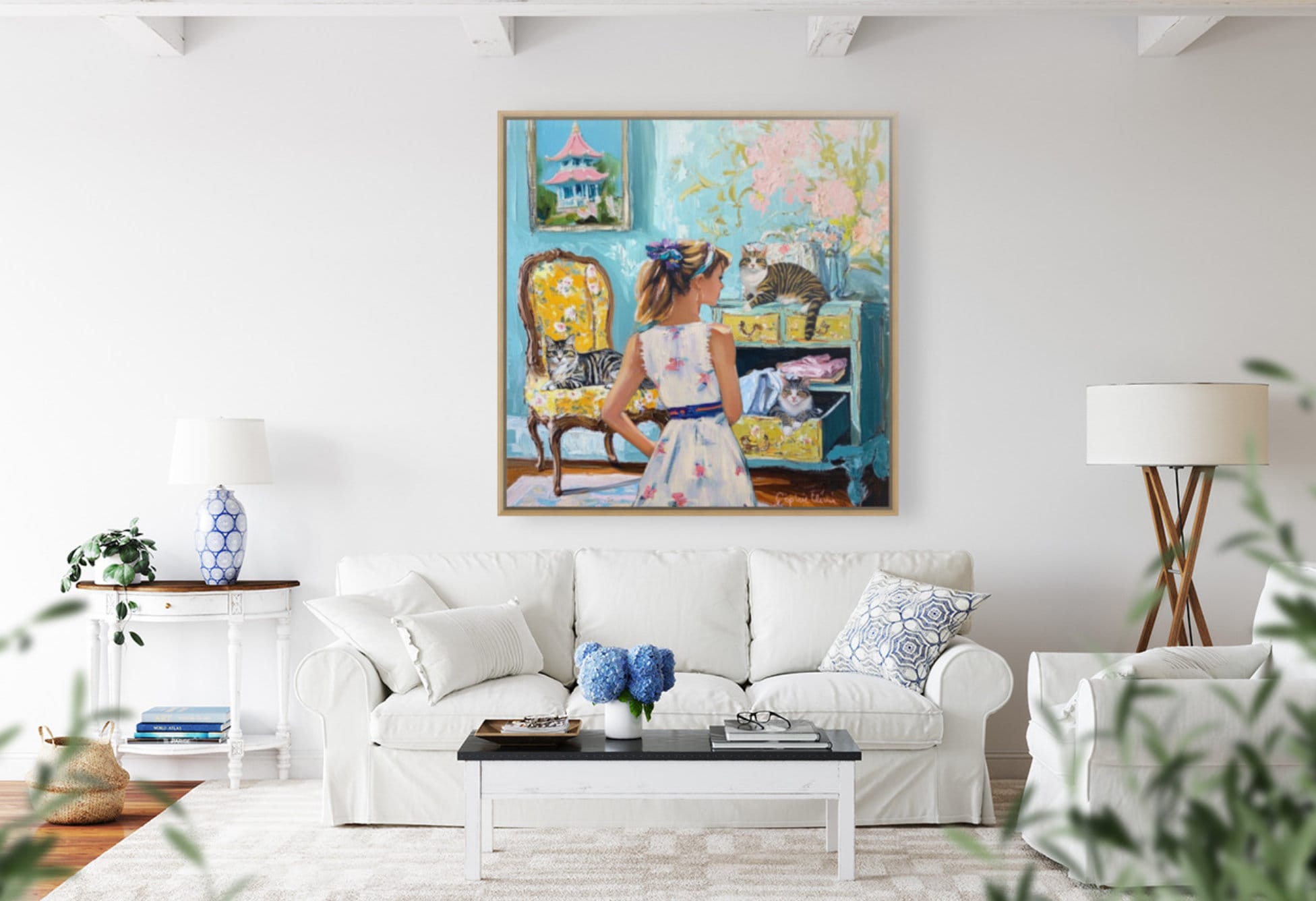 Whimsical Grandmillennial Cat Illustration: Caught Red-Pawed Fine Art for Preppy Interior Decor
