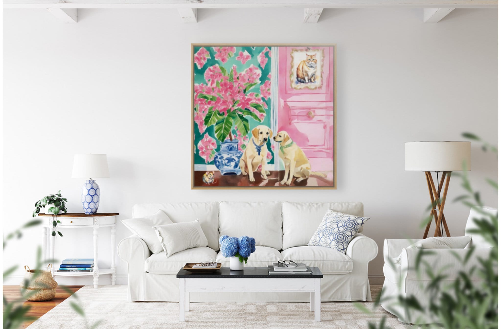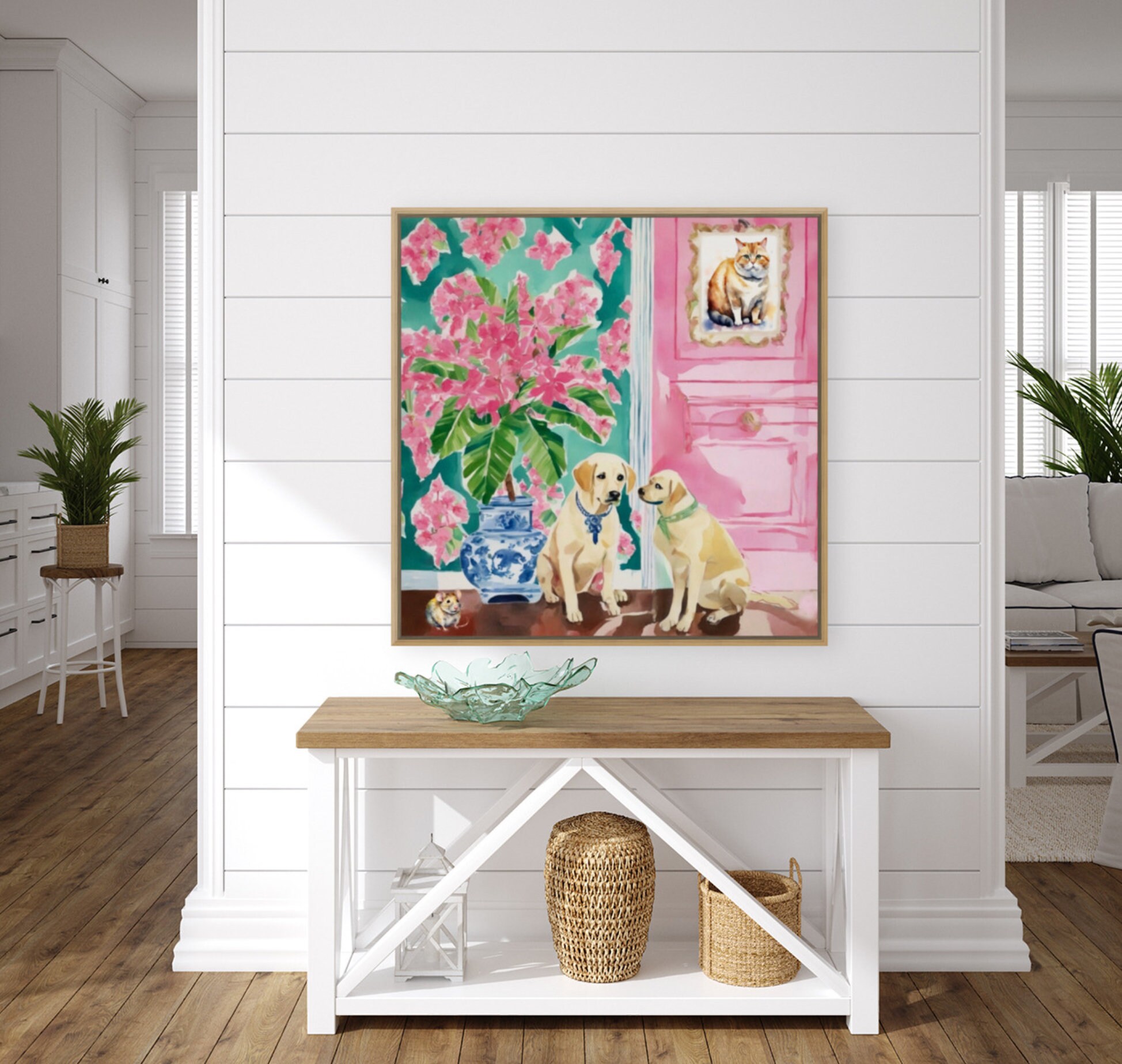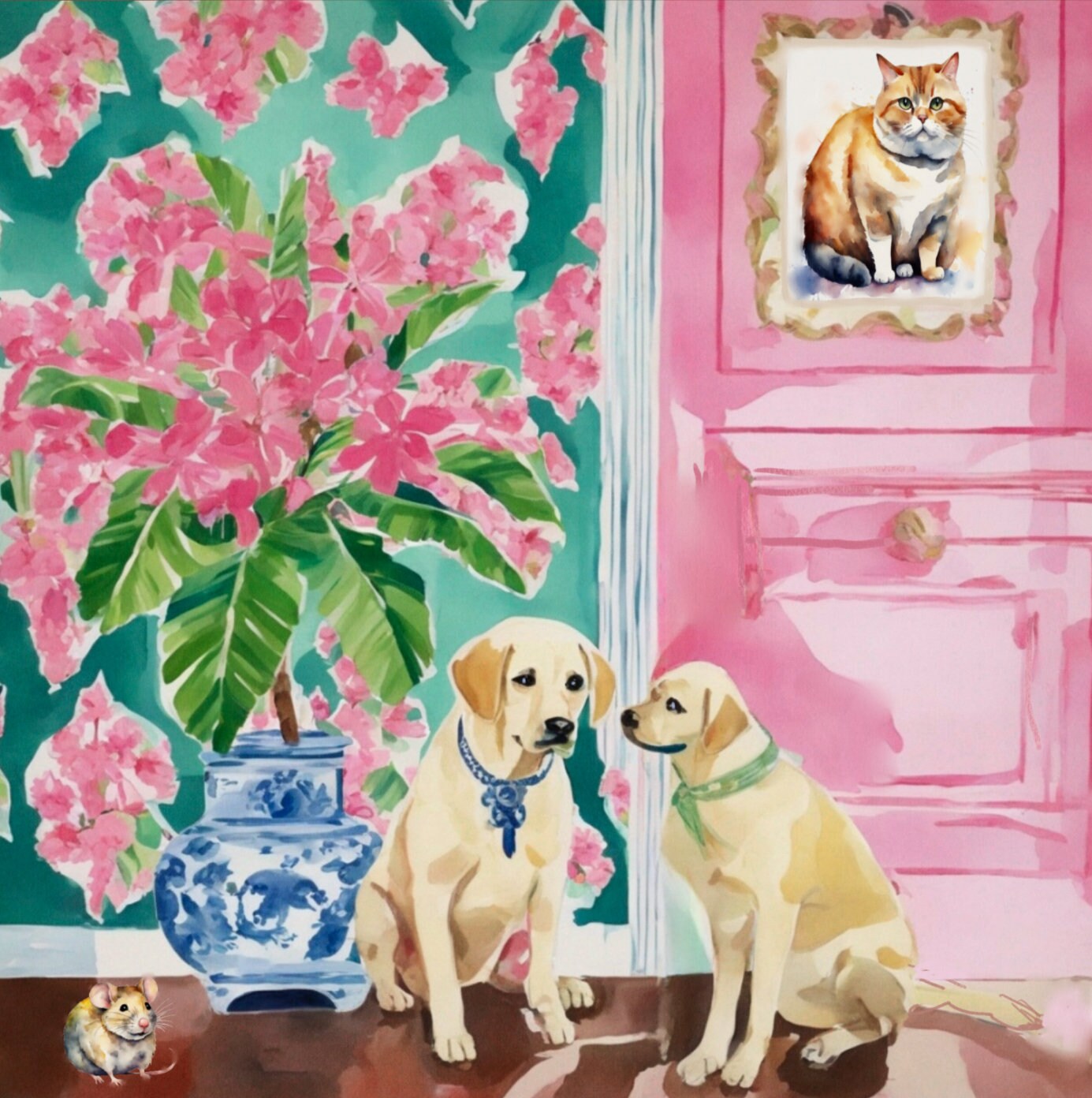Grandmillennial art, They brought a cat home, preppy whimsical watercolor