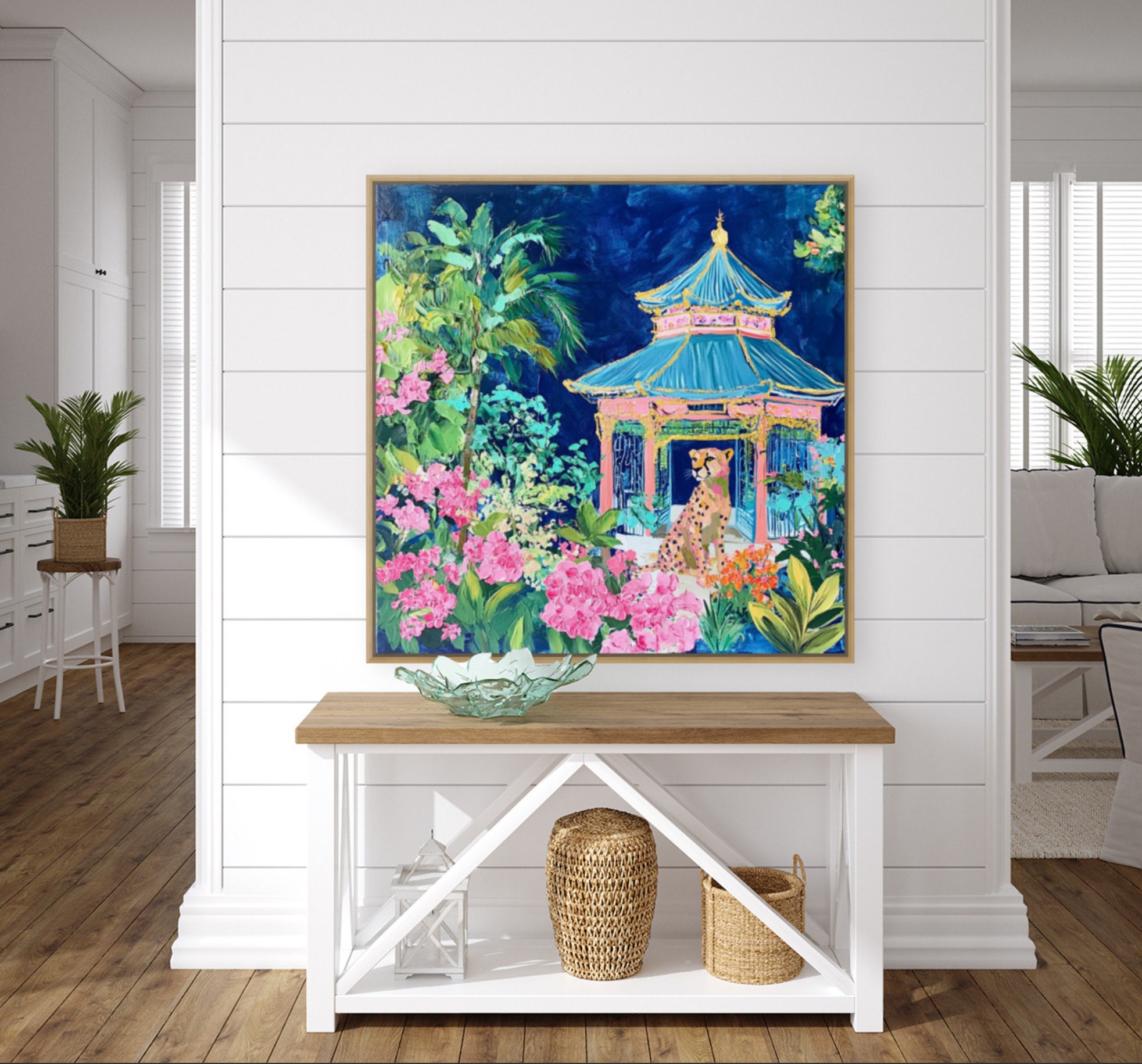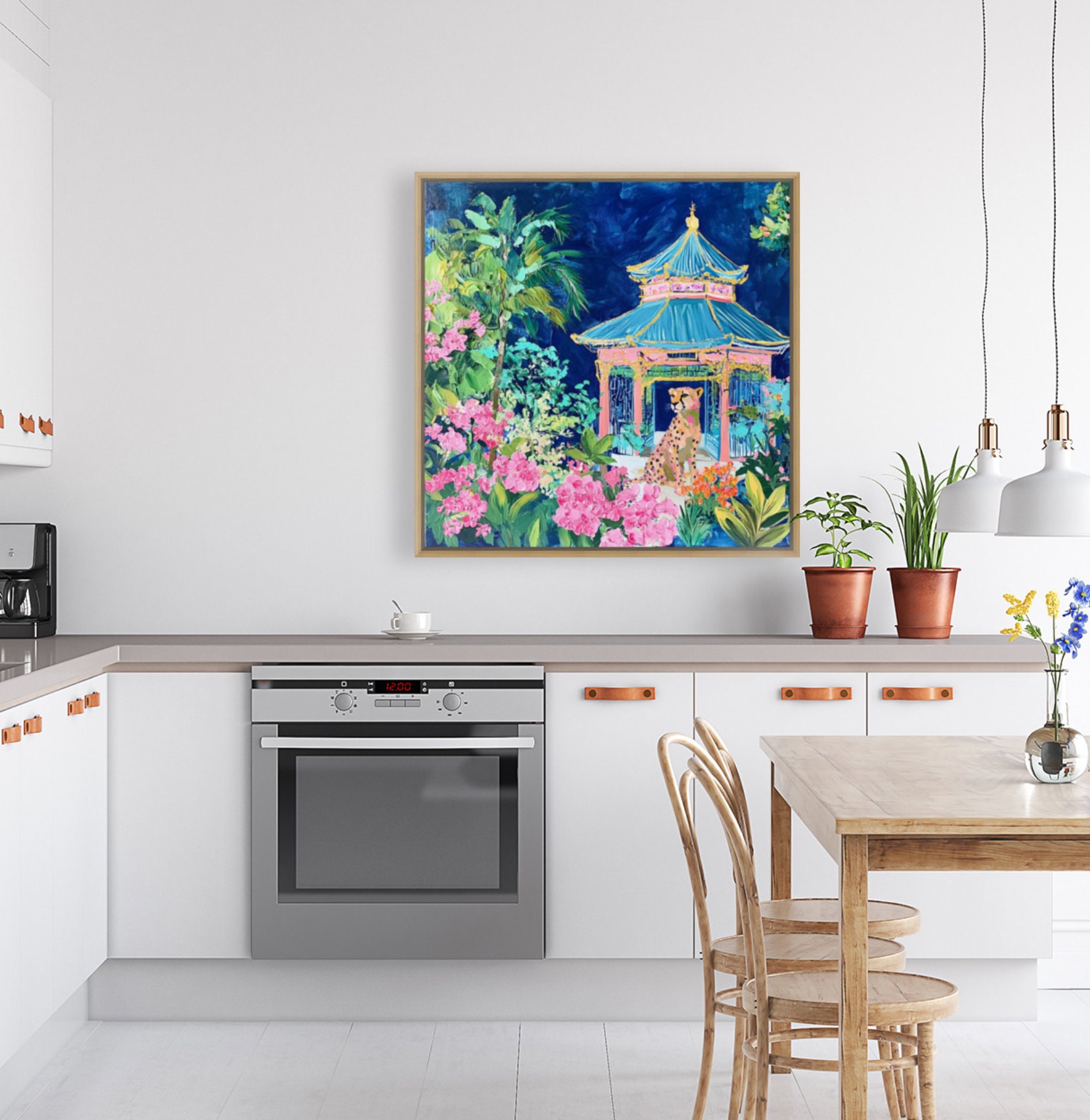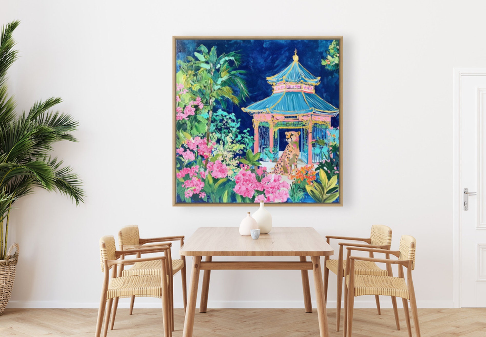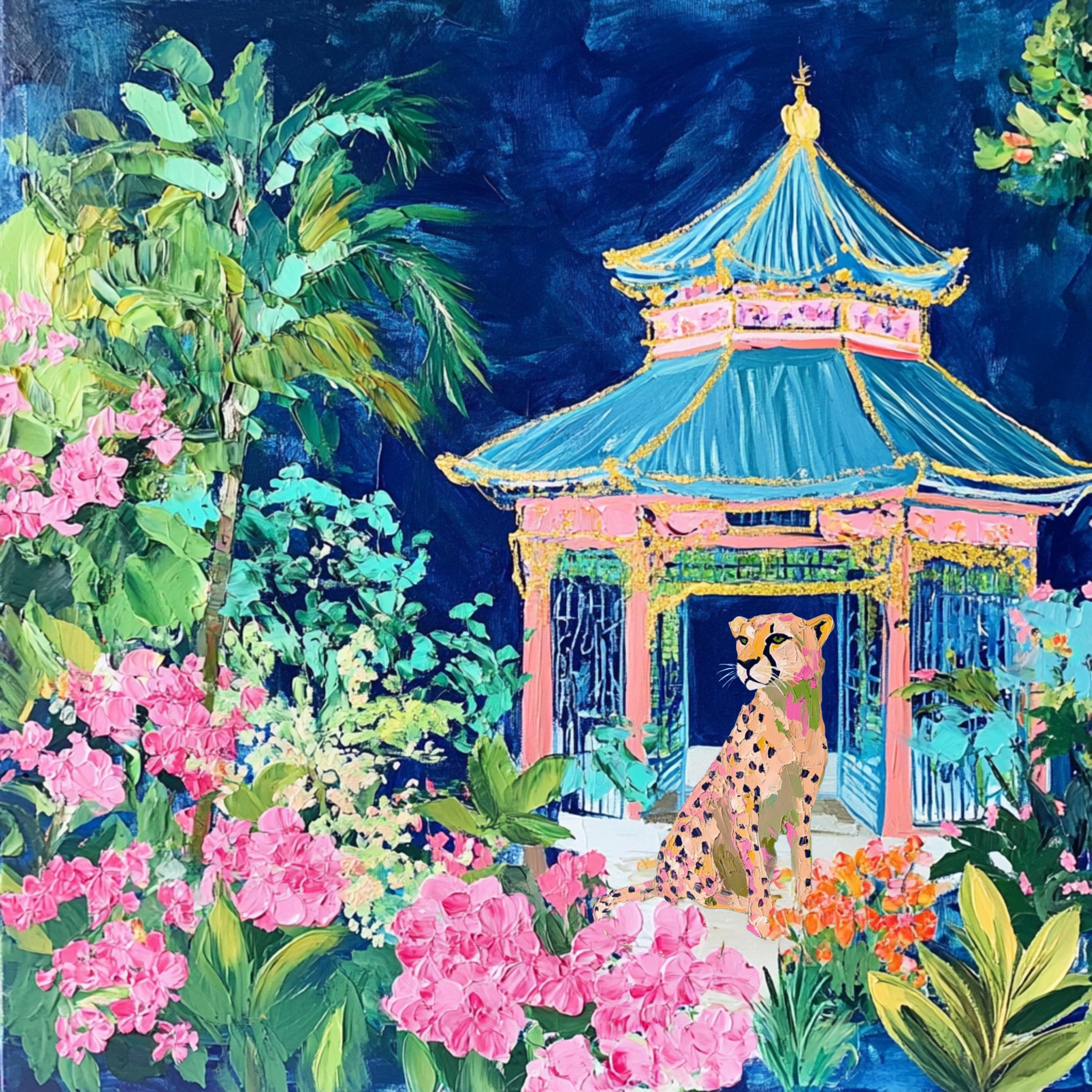 Grandmillennial Chinoiserie Art Print: Cheetah in Pagoda Garden