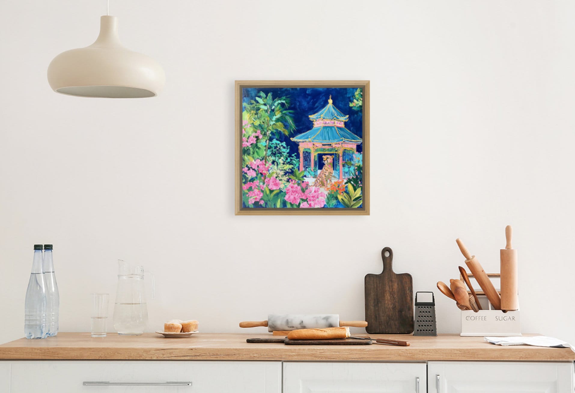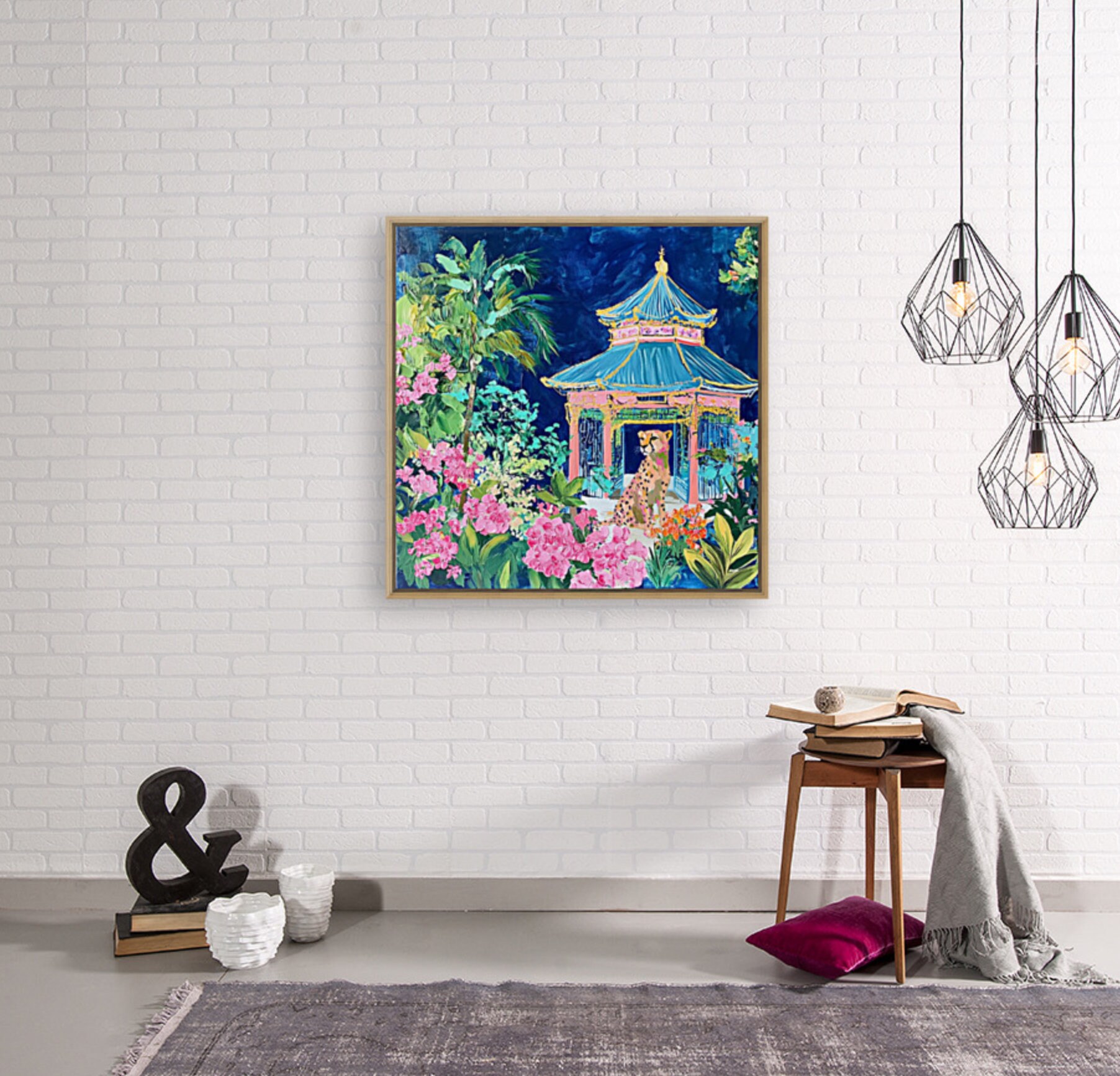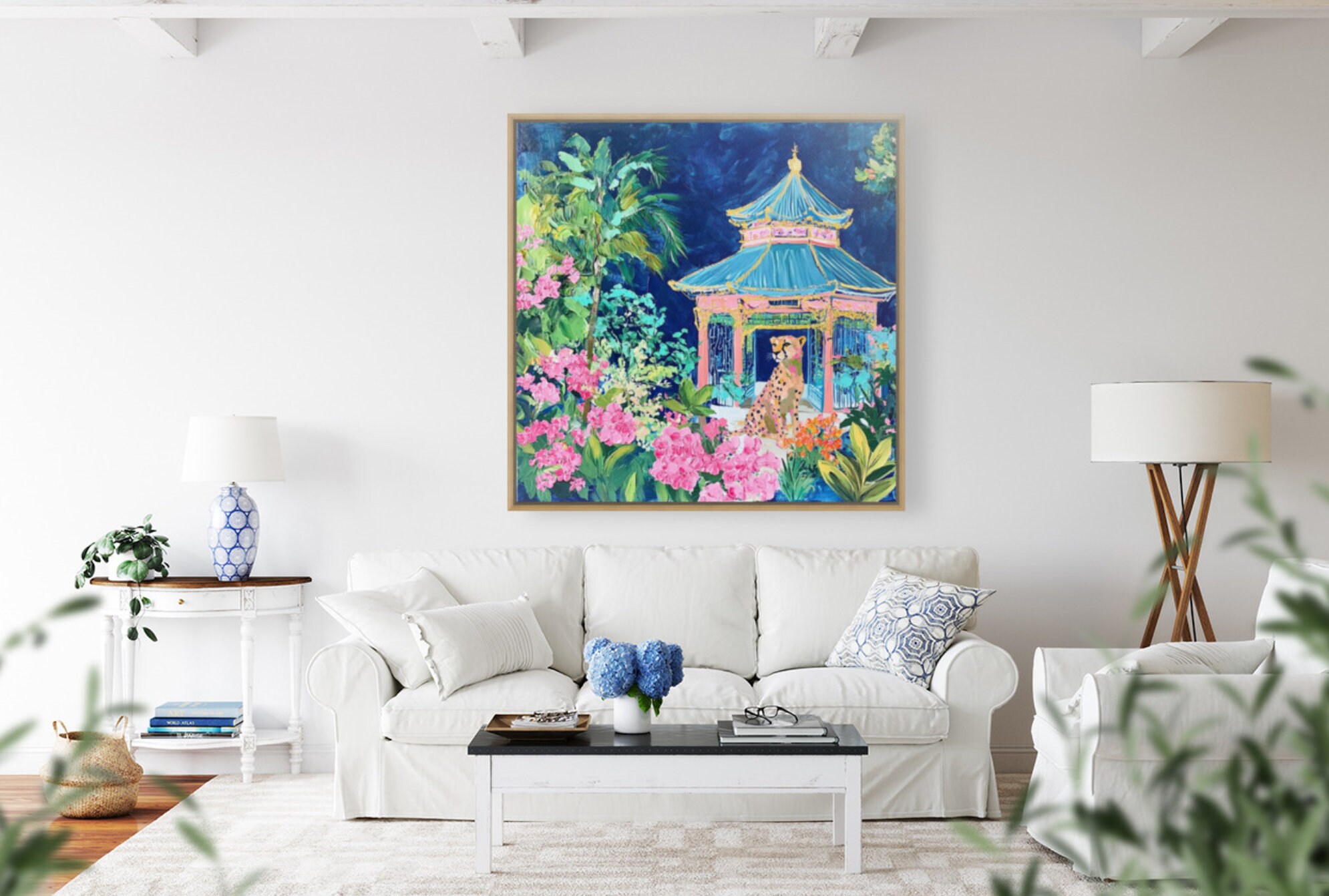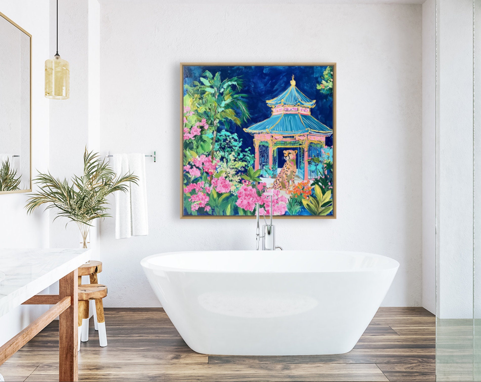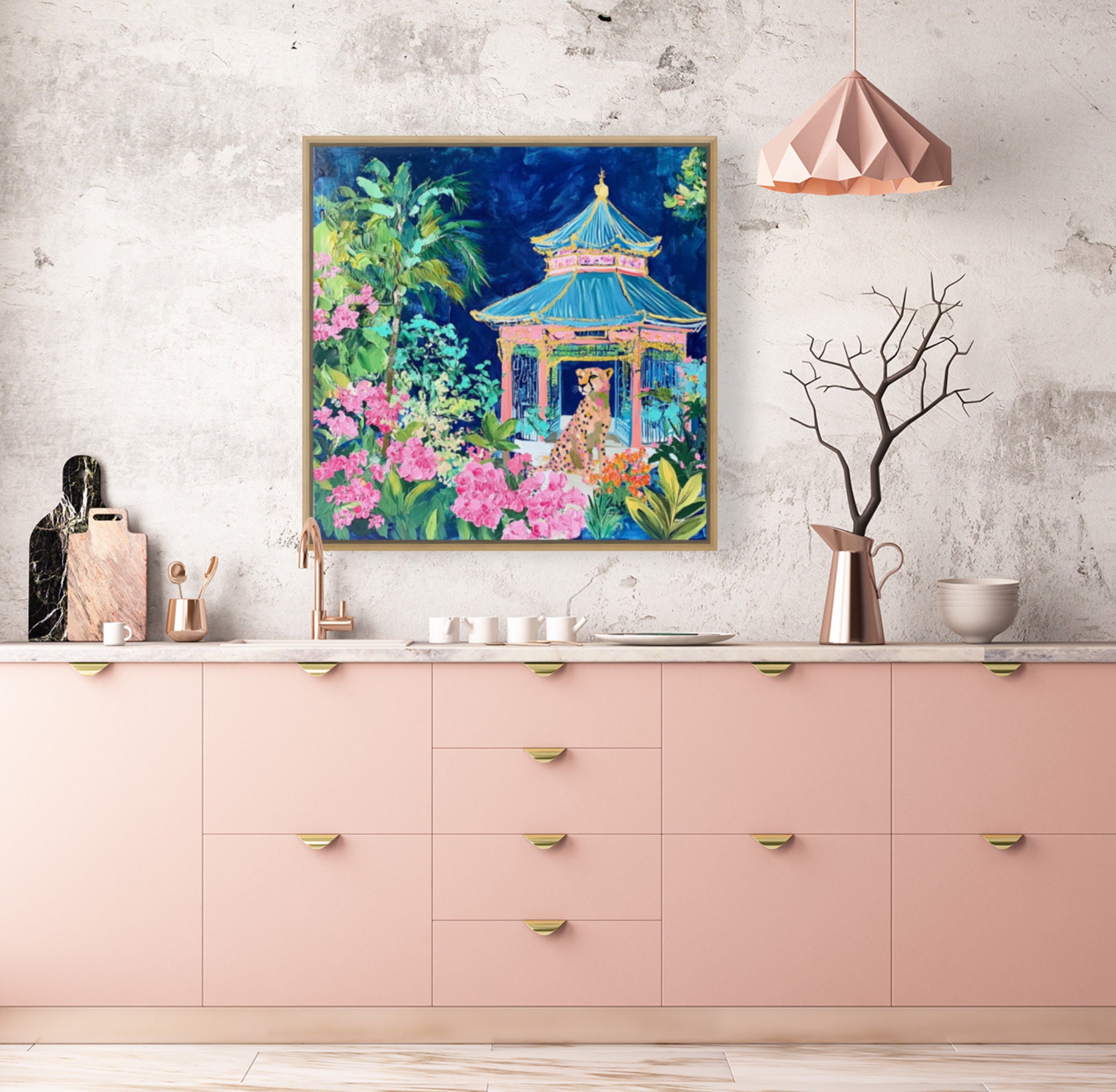 Grandmillennial Chinoiserie Art Print: Cheetah in Pagoda Garden