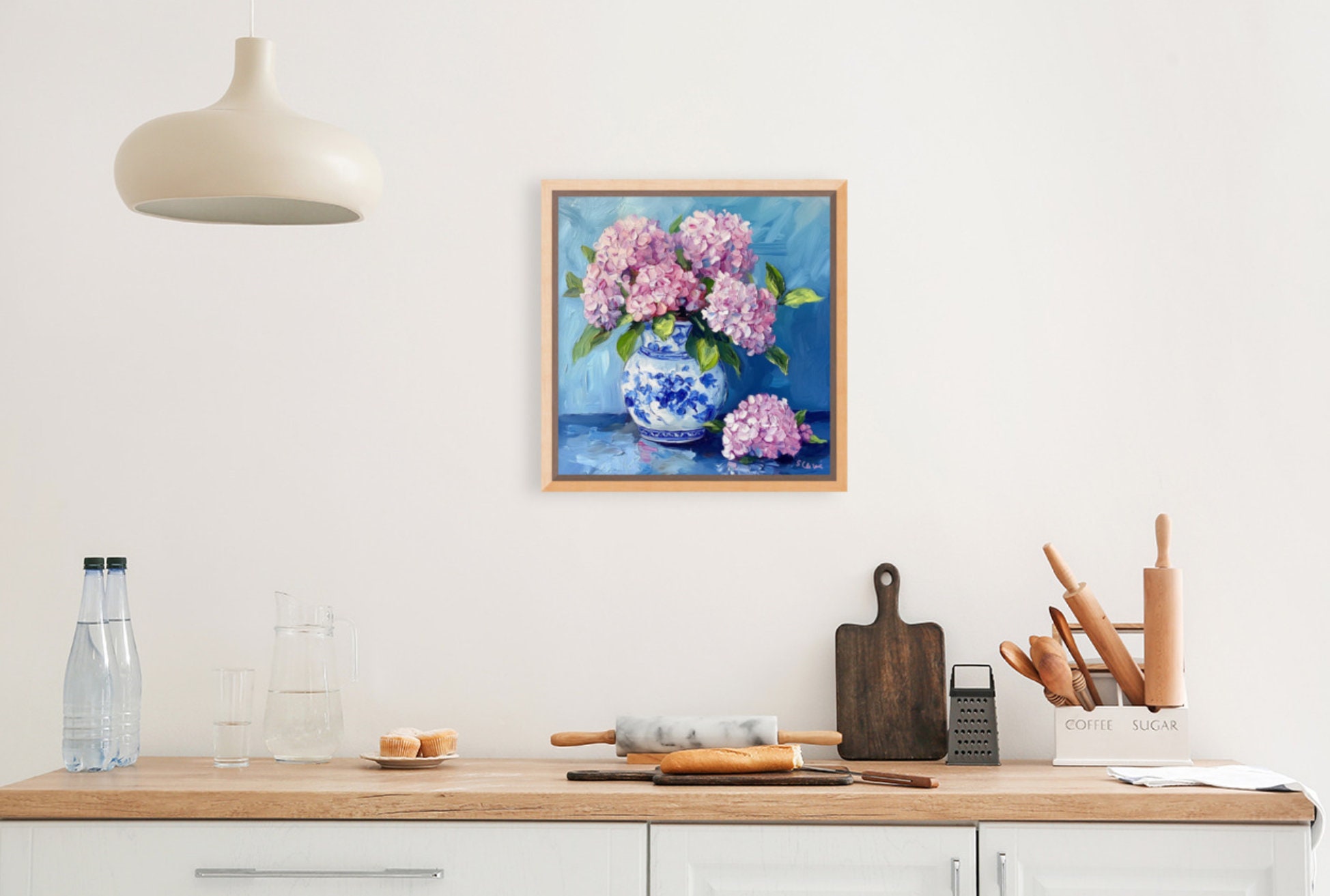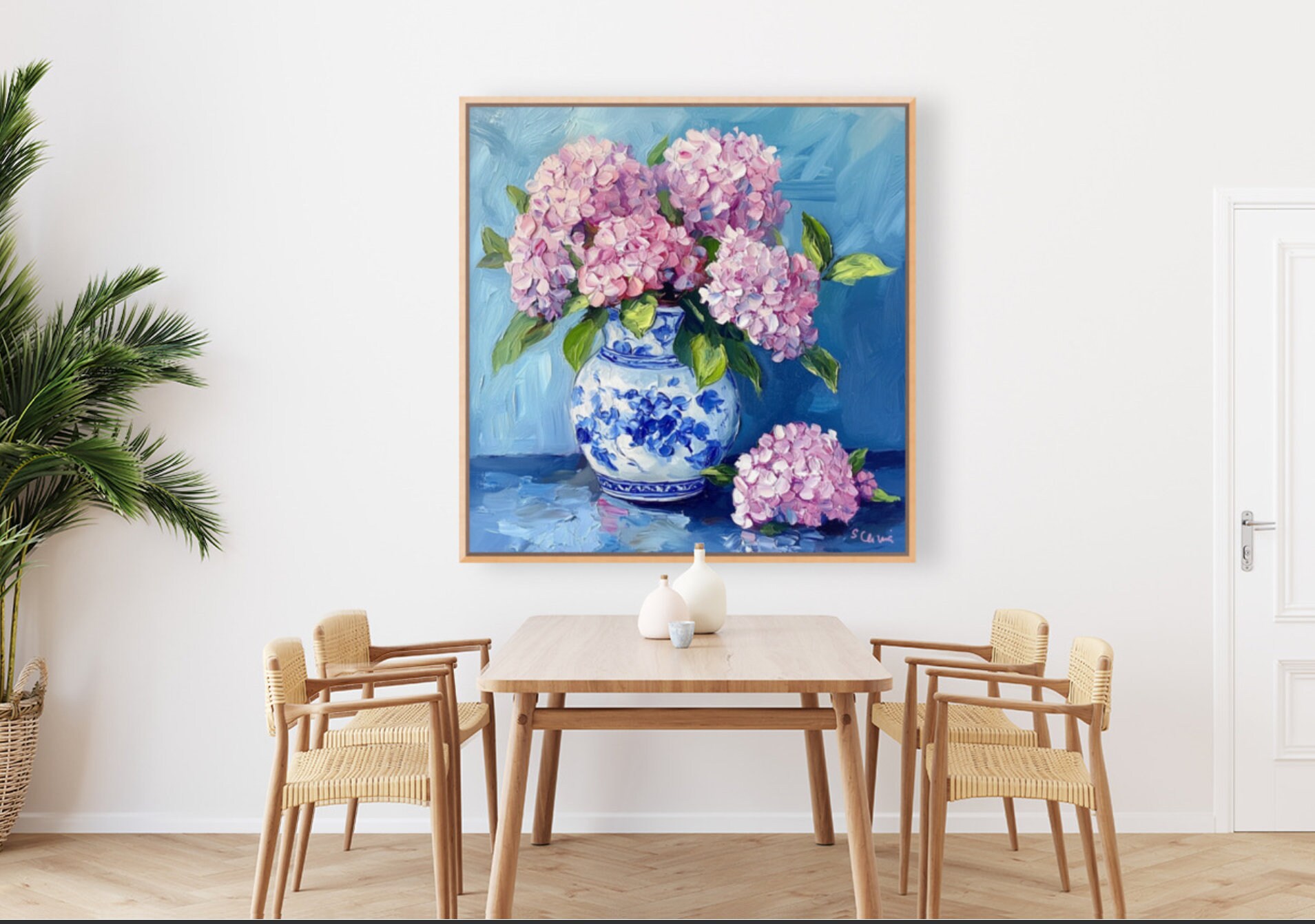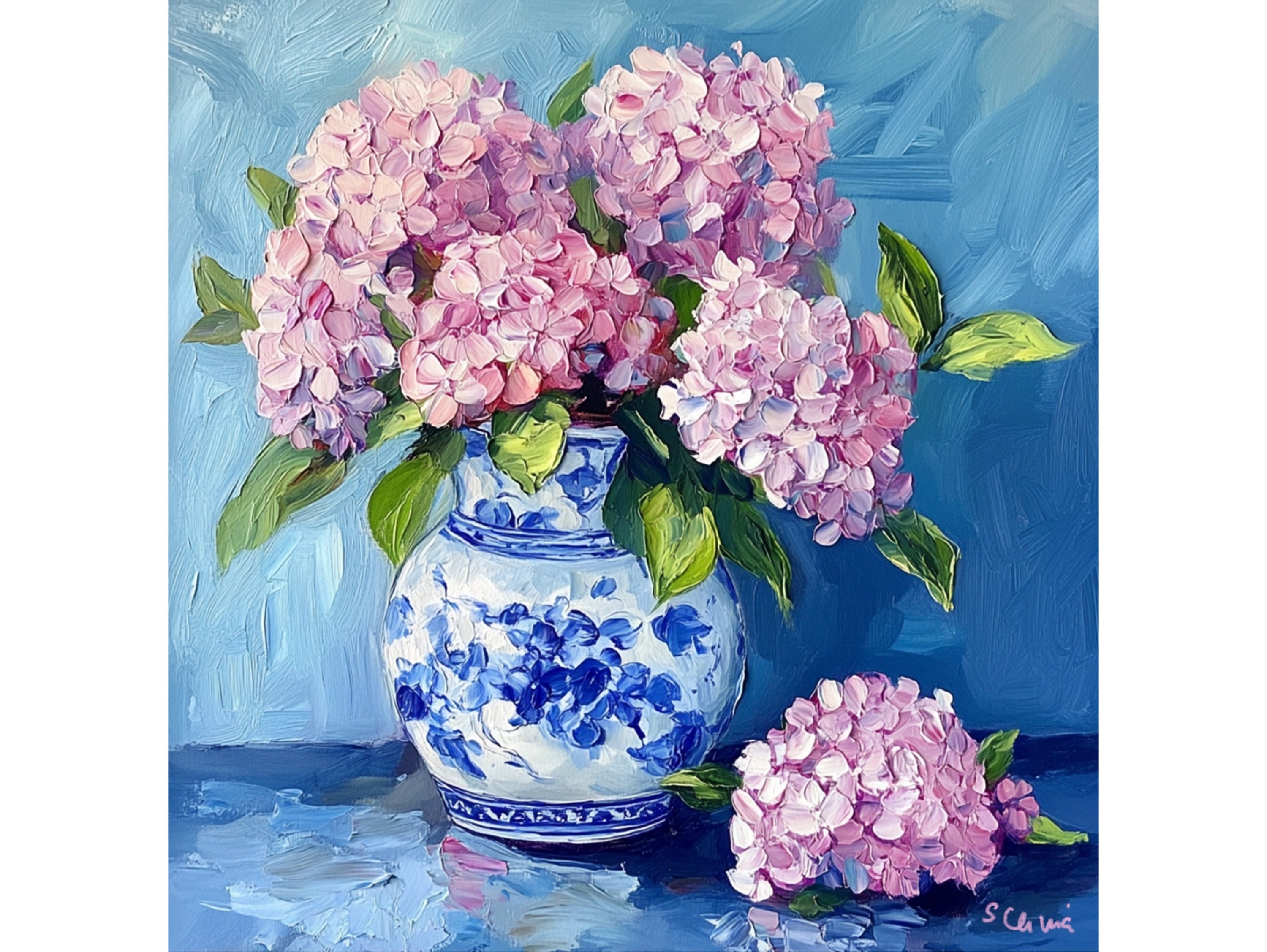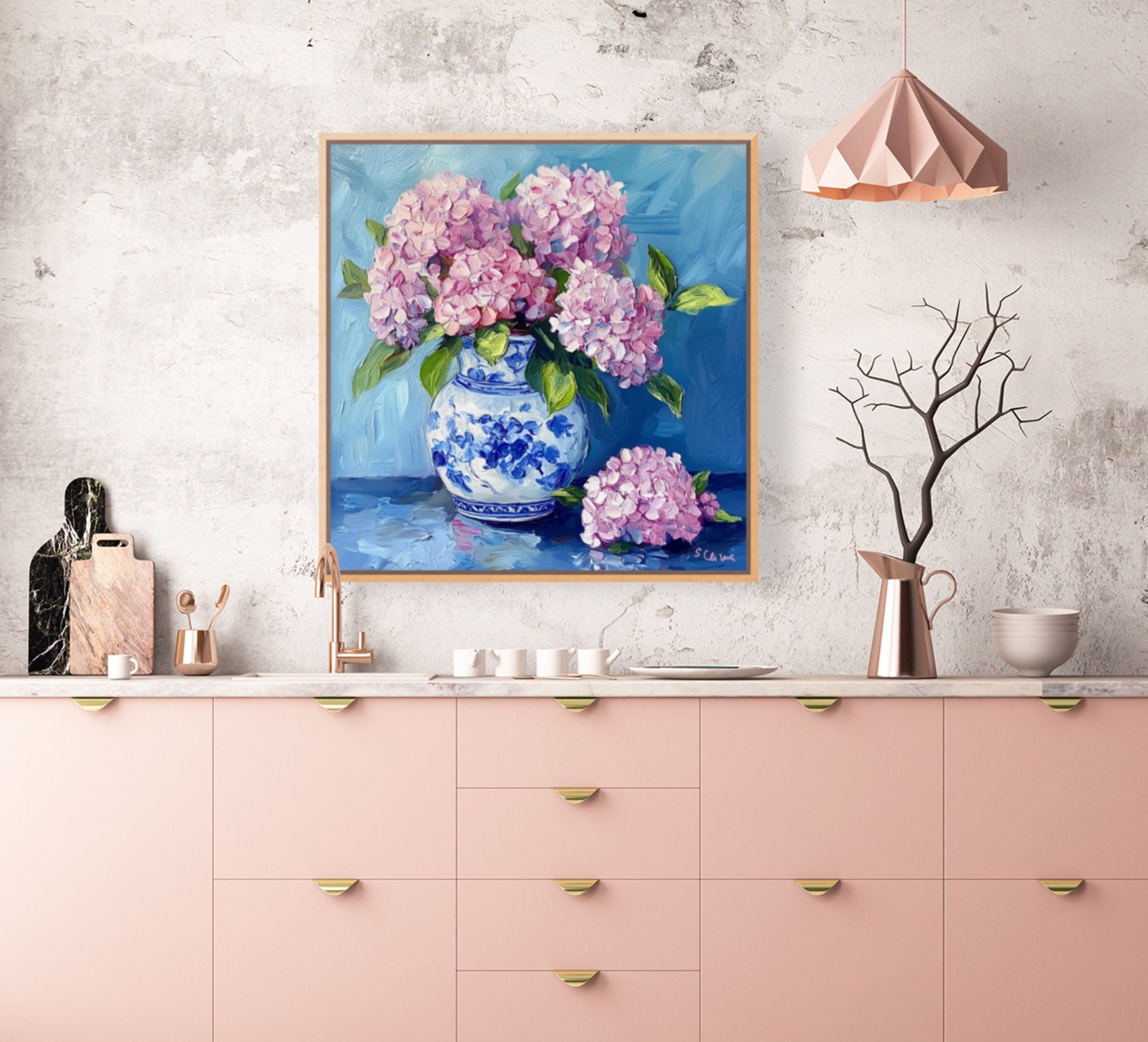 Grandmillennial art, Pink Hydrangea in ginger jar, fine art print