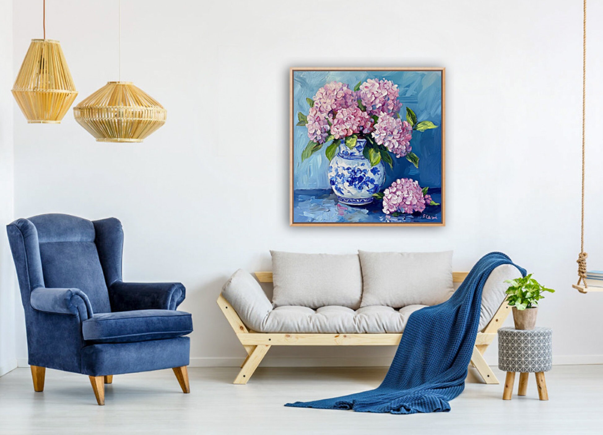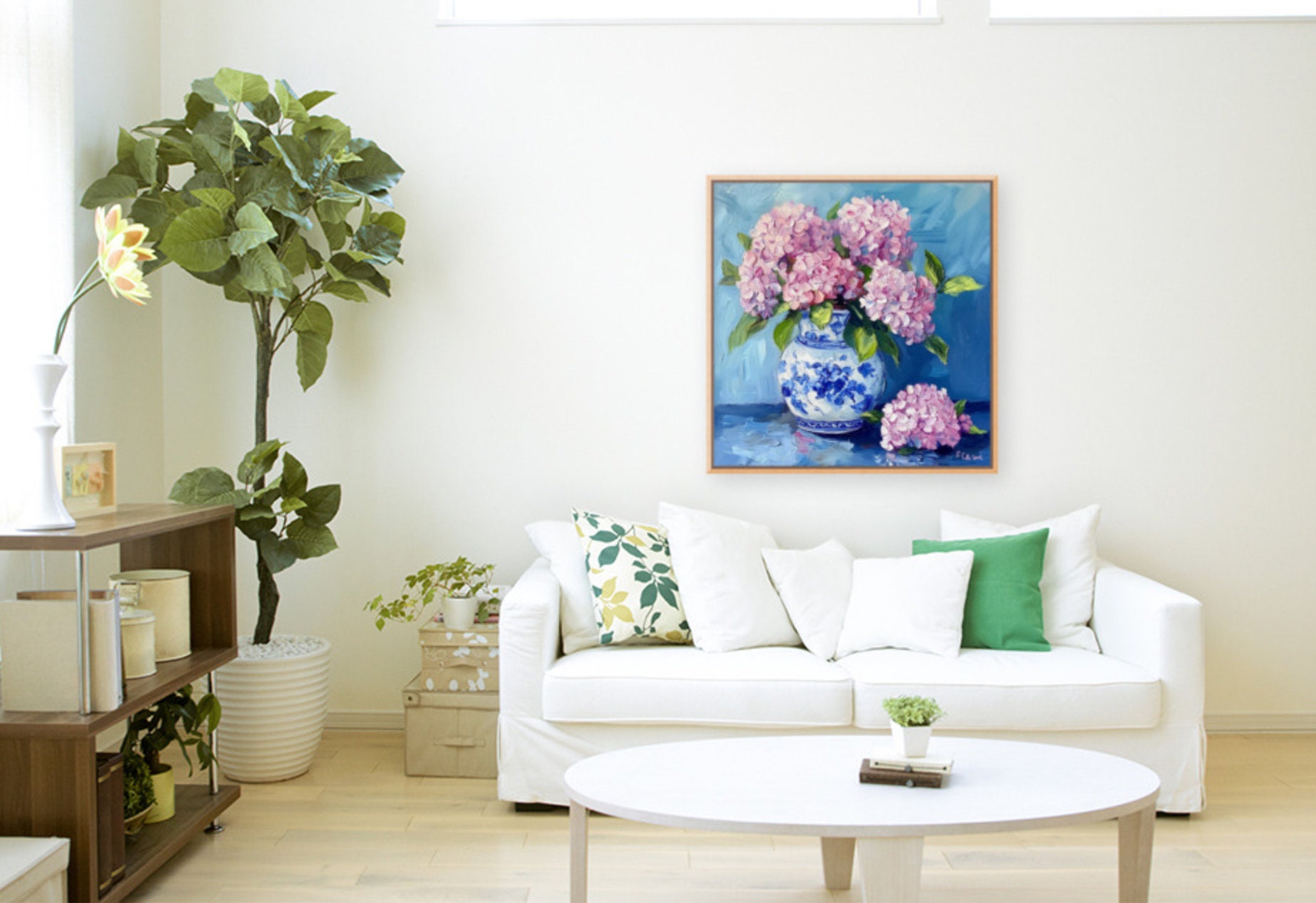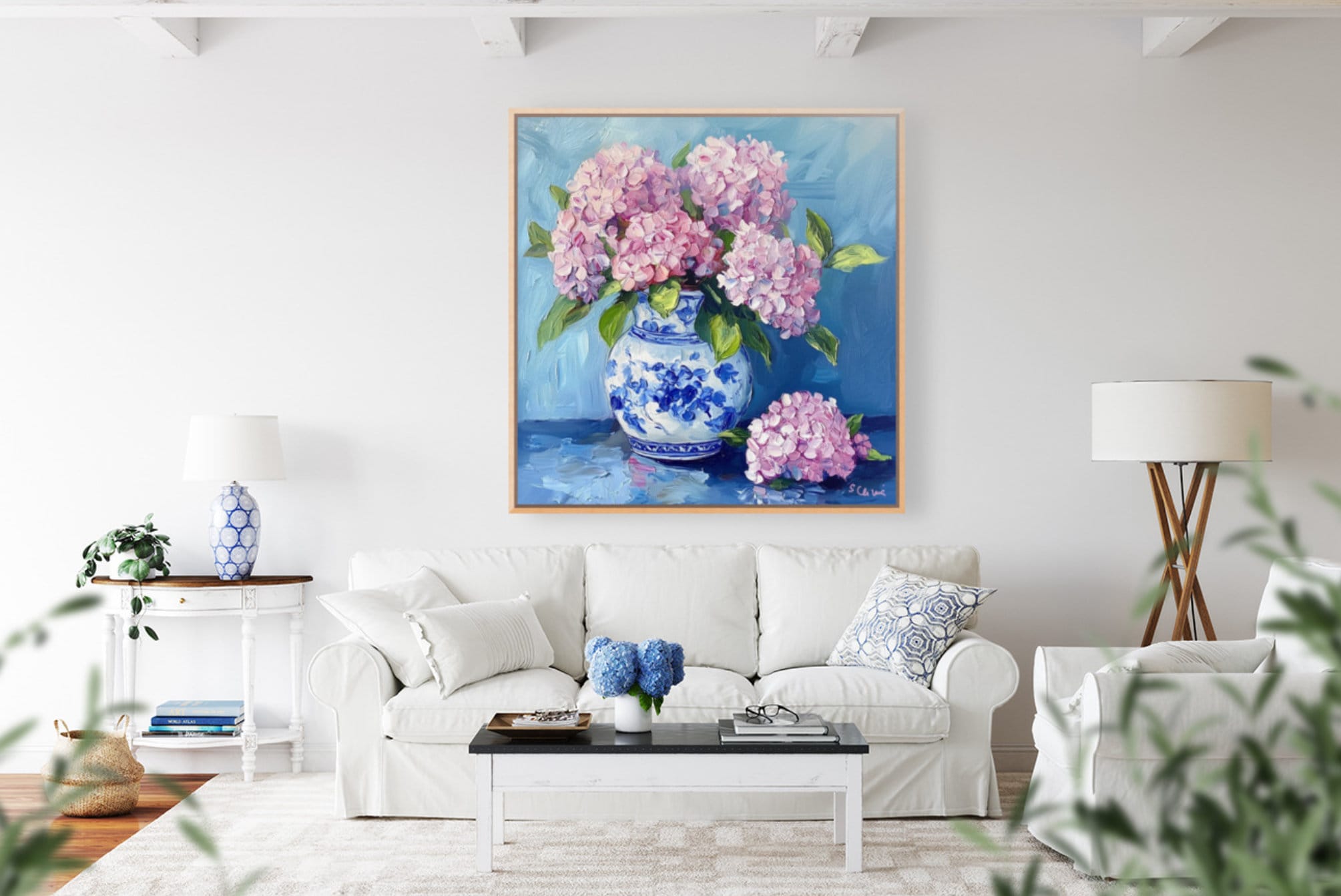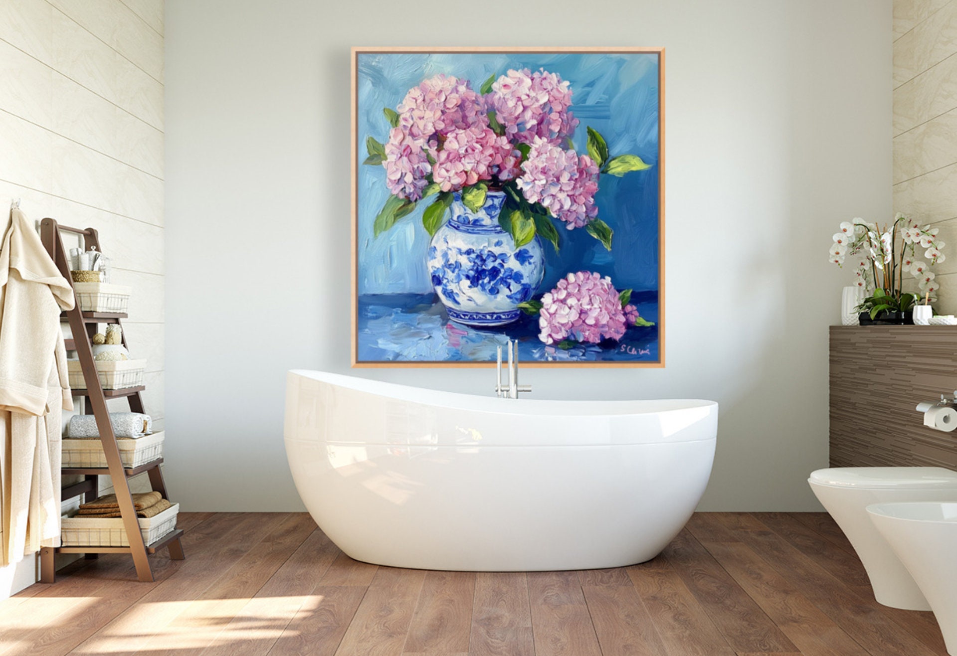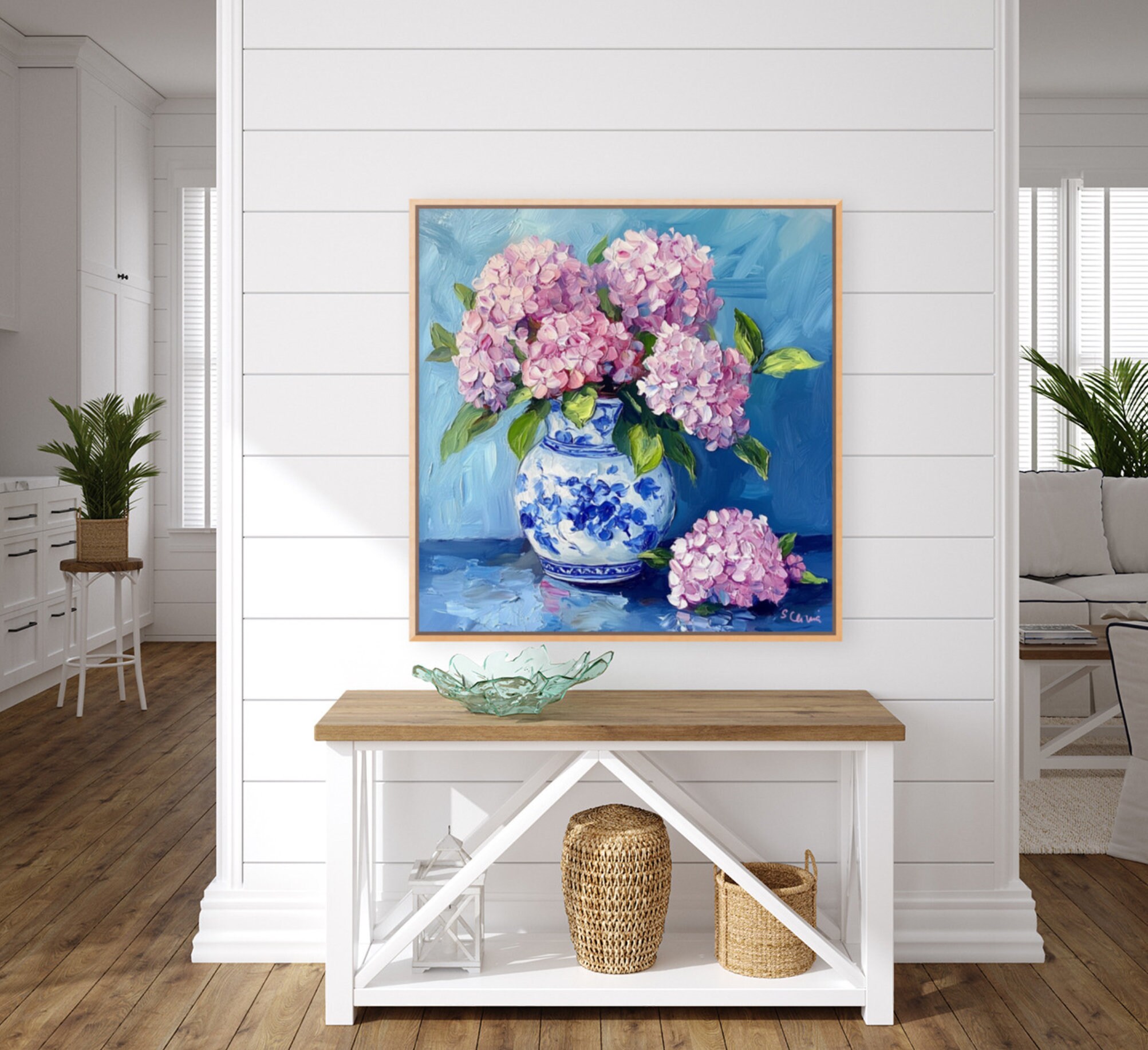 Grandmillennial art, Pink Hydrangea in ginger jar, fine art print