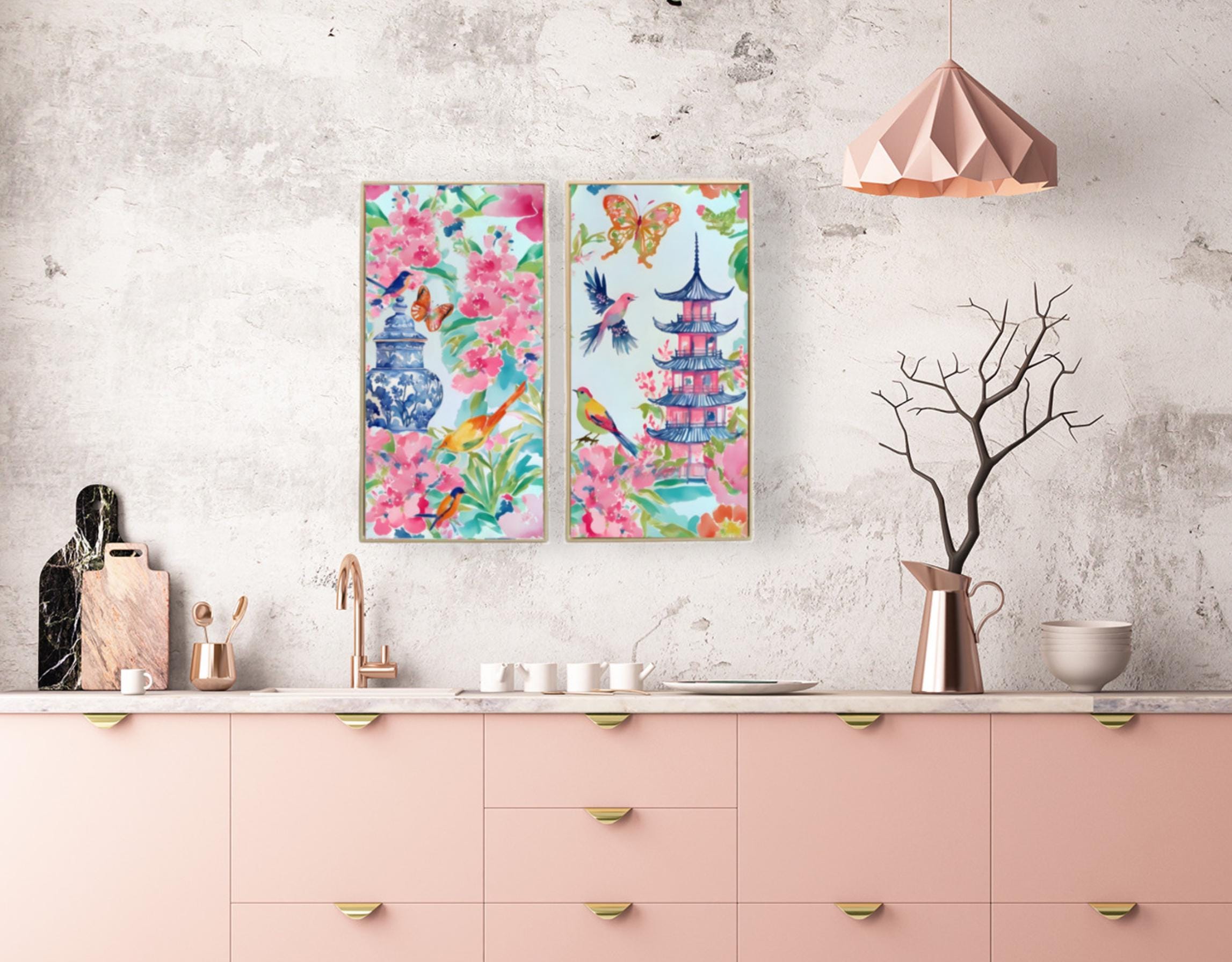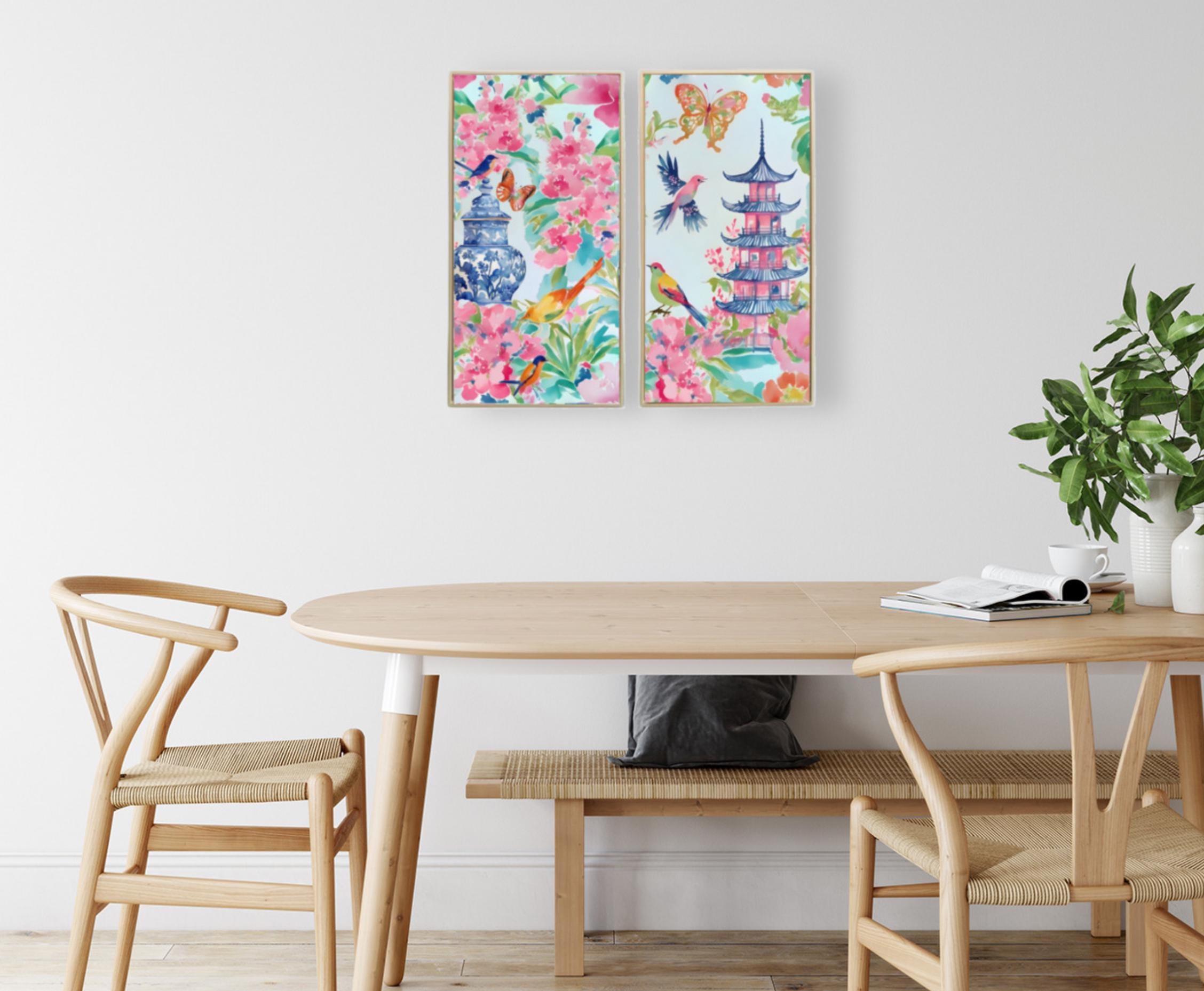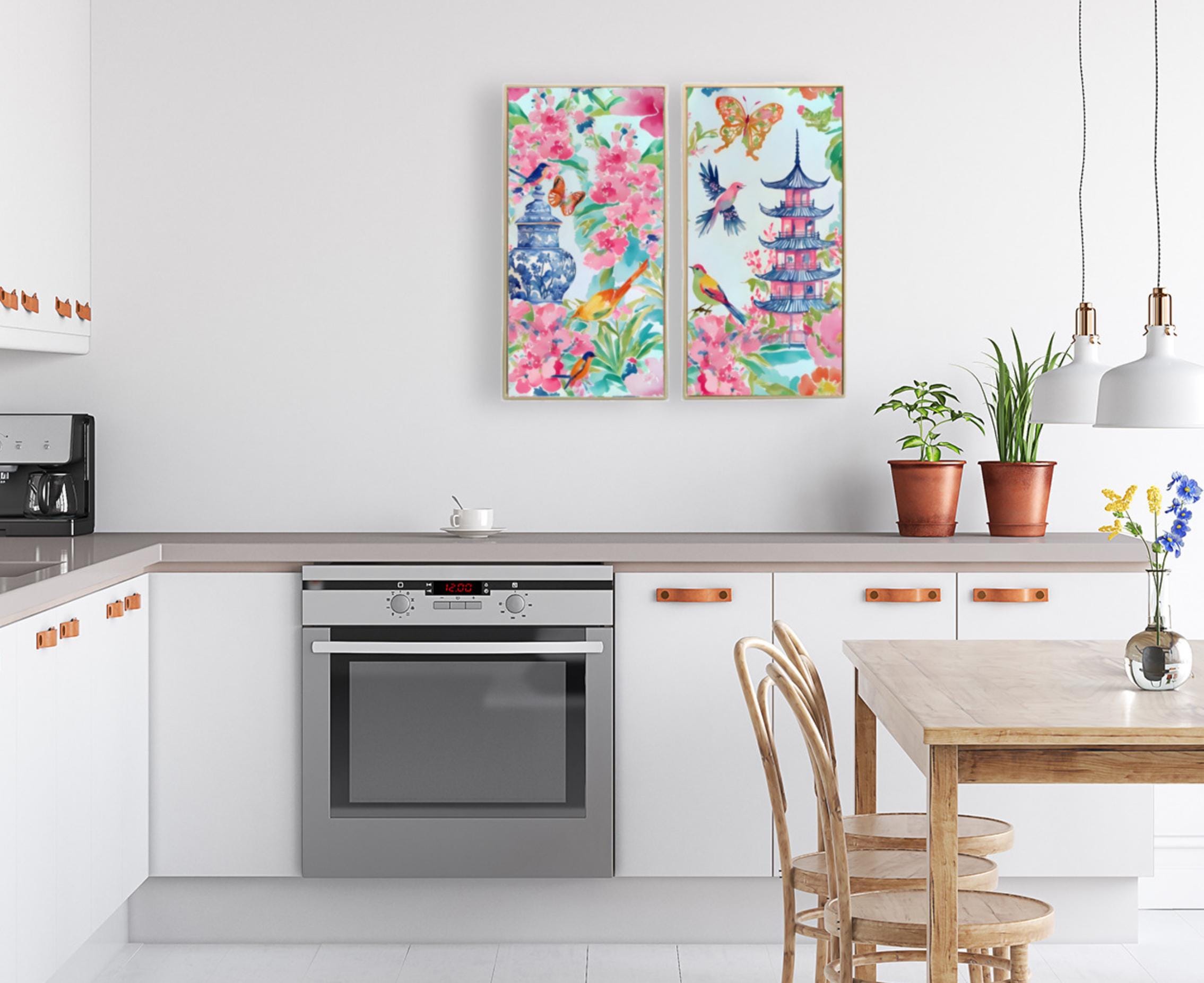 PLEASE NOTE SIZES ARE IN CM. Sophie’s original paintings reproduced as fine art print on superb quality Hahnemuhle paper 310gsm with professional archival grade Epson ink to achieve crisp, vibrant finish. The original watercolor is a modern, preppy take on traditional chinoiserie. For the matching curtains, fabrics, cushion covers and homedecor visit Sophie’s Spoonflower shop: www.spoonflower.com/profiles/sophieclimaart. The prints are shipped carefully rolled in a rigid tube.