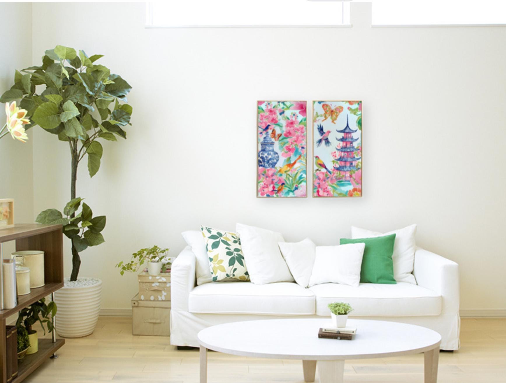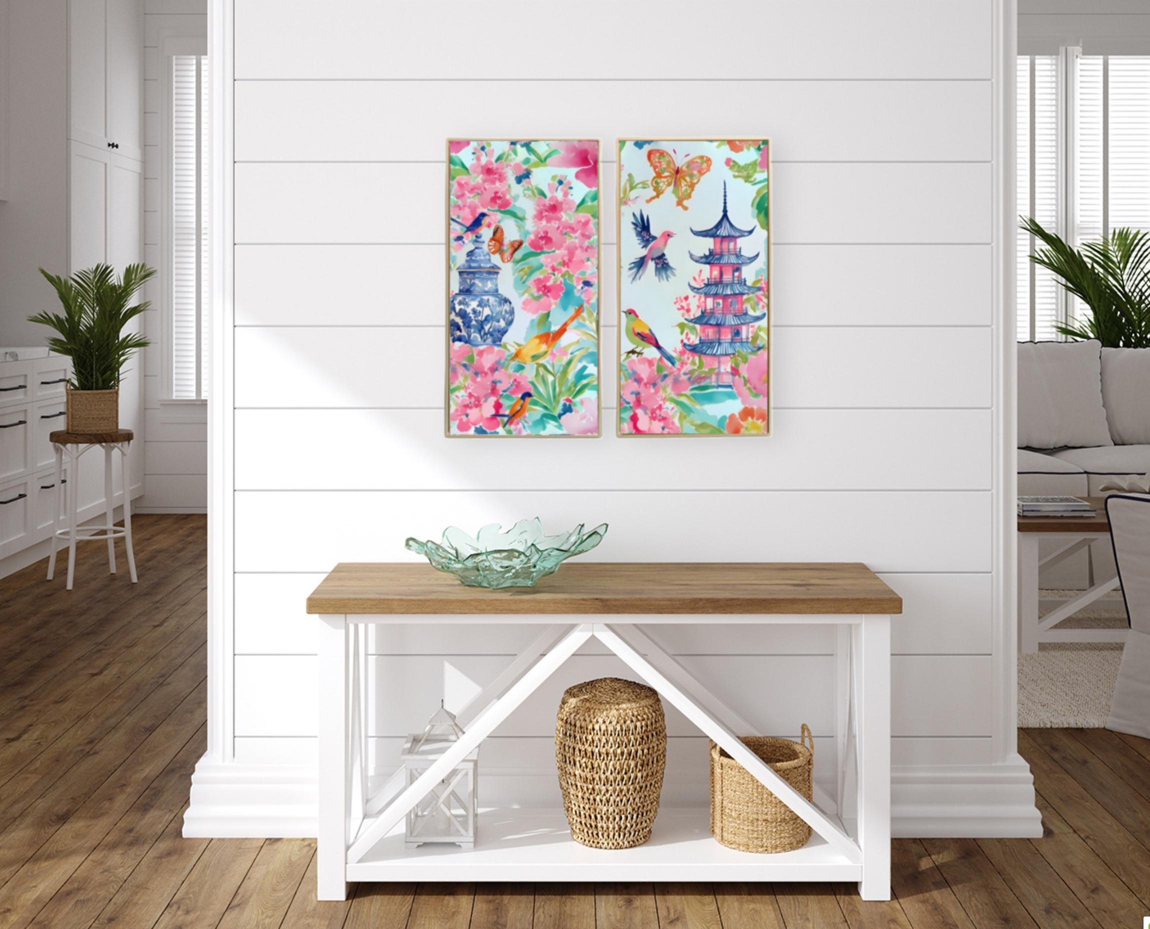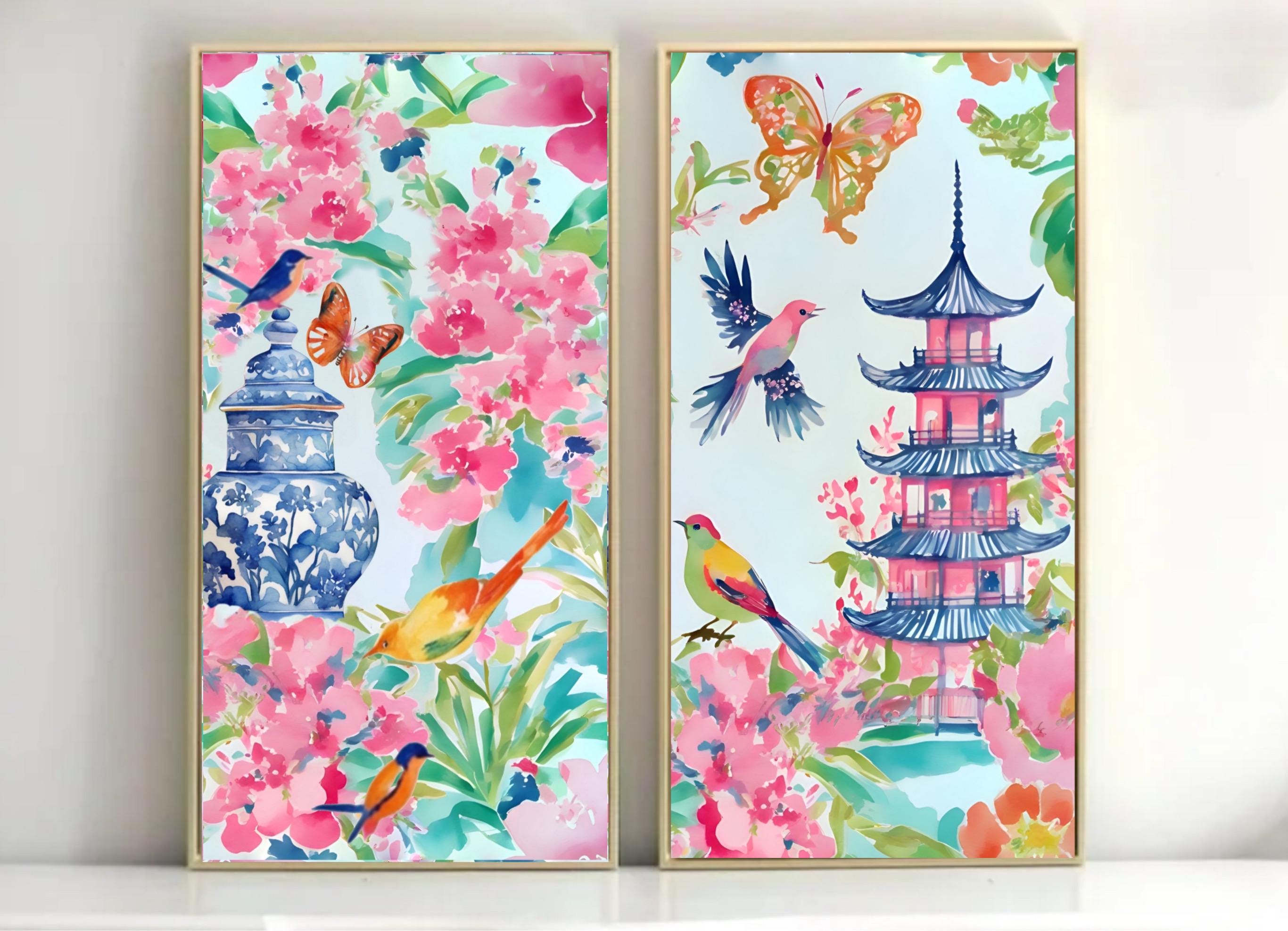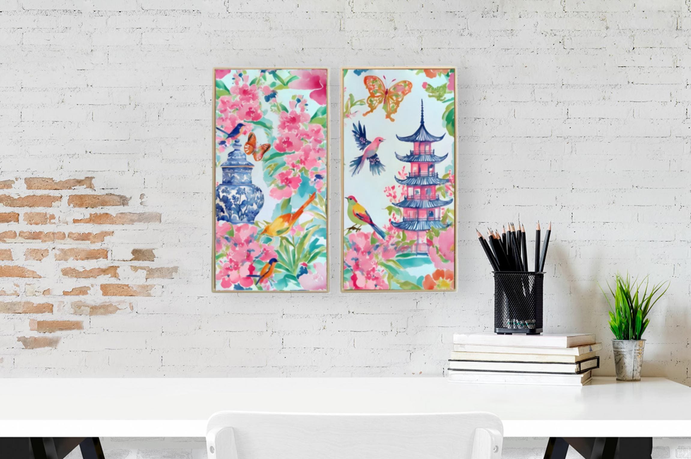 PLEASE NOTE SIZES ARE IN CM. Sophie’s original paintings reproduced as fine art print on superb quality Hahnemuhle paper 310gsm with professional archival grade Epson ink to achieve crisp, vibrant finish. The original watercolor is a modern, preppy take on traditional chinoiserie. For the matching curtains, fabrics, cushion covers and homedecor visit Sophie’s Spoonflower shop: www.spoonflower.com/profiles/sophieclimaart. The prints are shipped carefully rolled in a rigid tube.