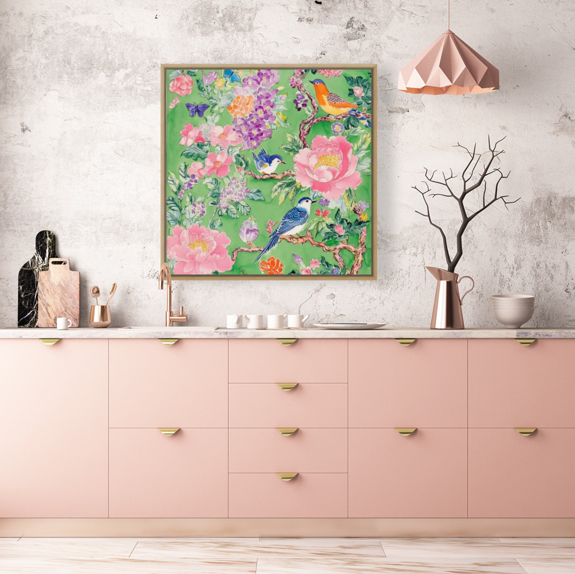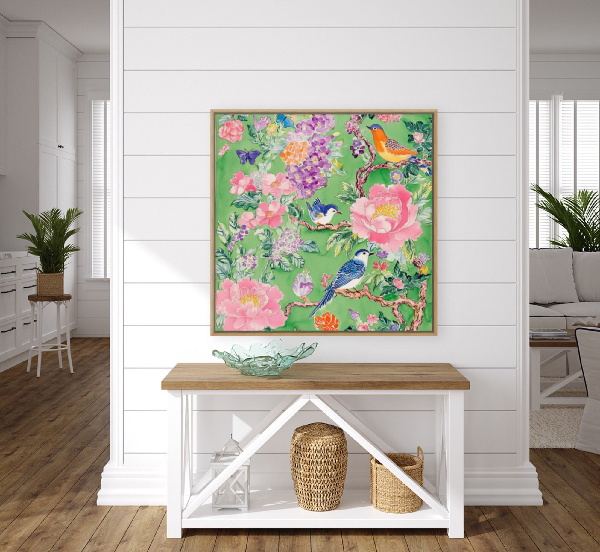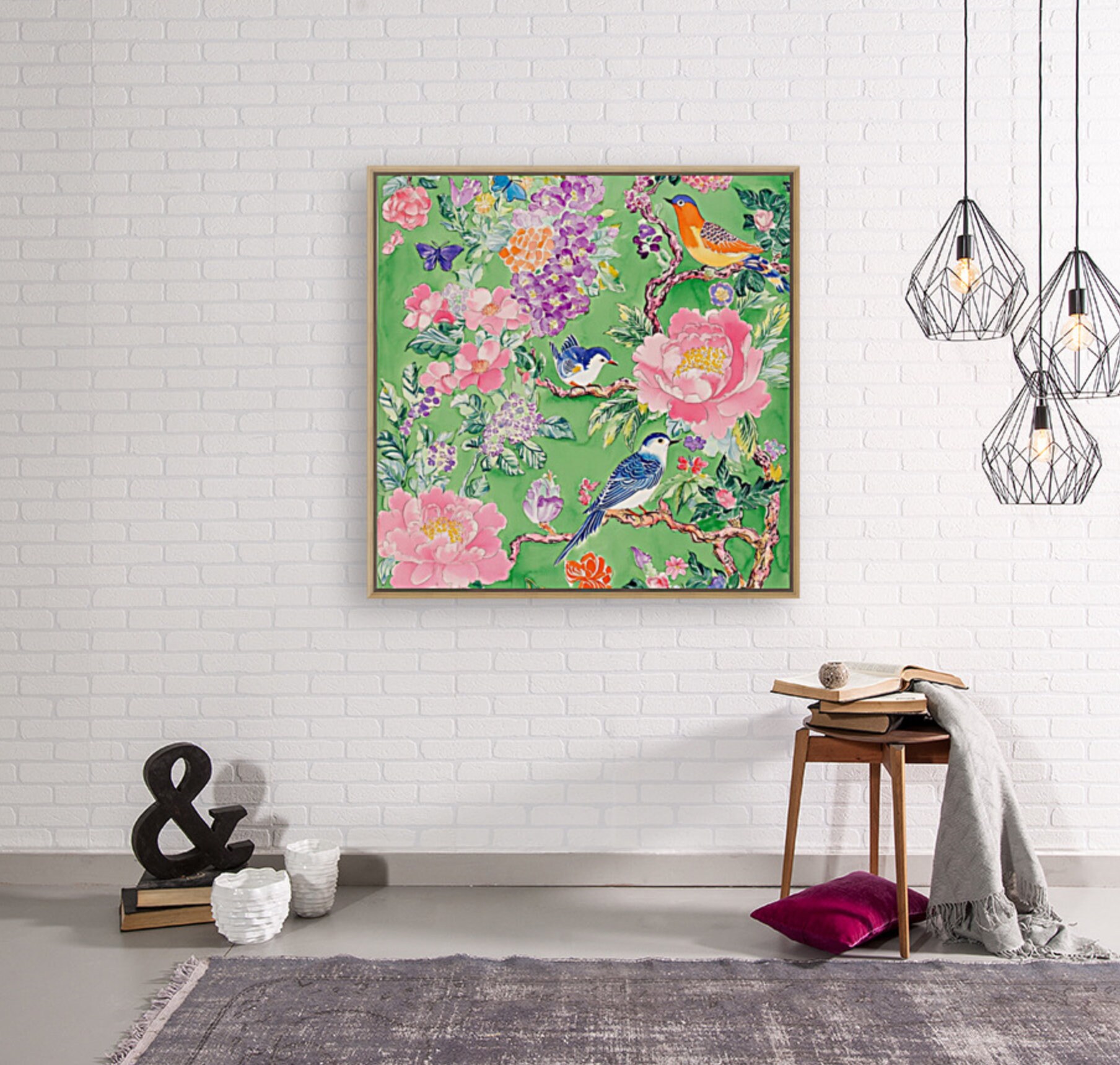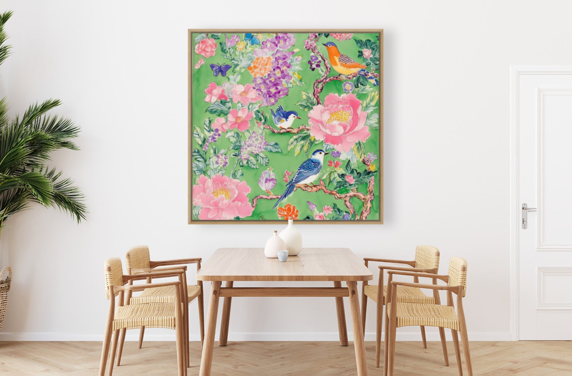 Chinoiserie art, Birds and flowers chinoisetie on apple green part 1, Giclee art print