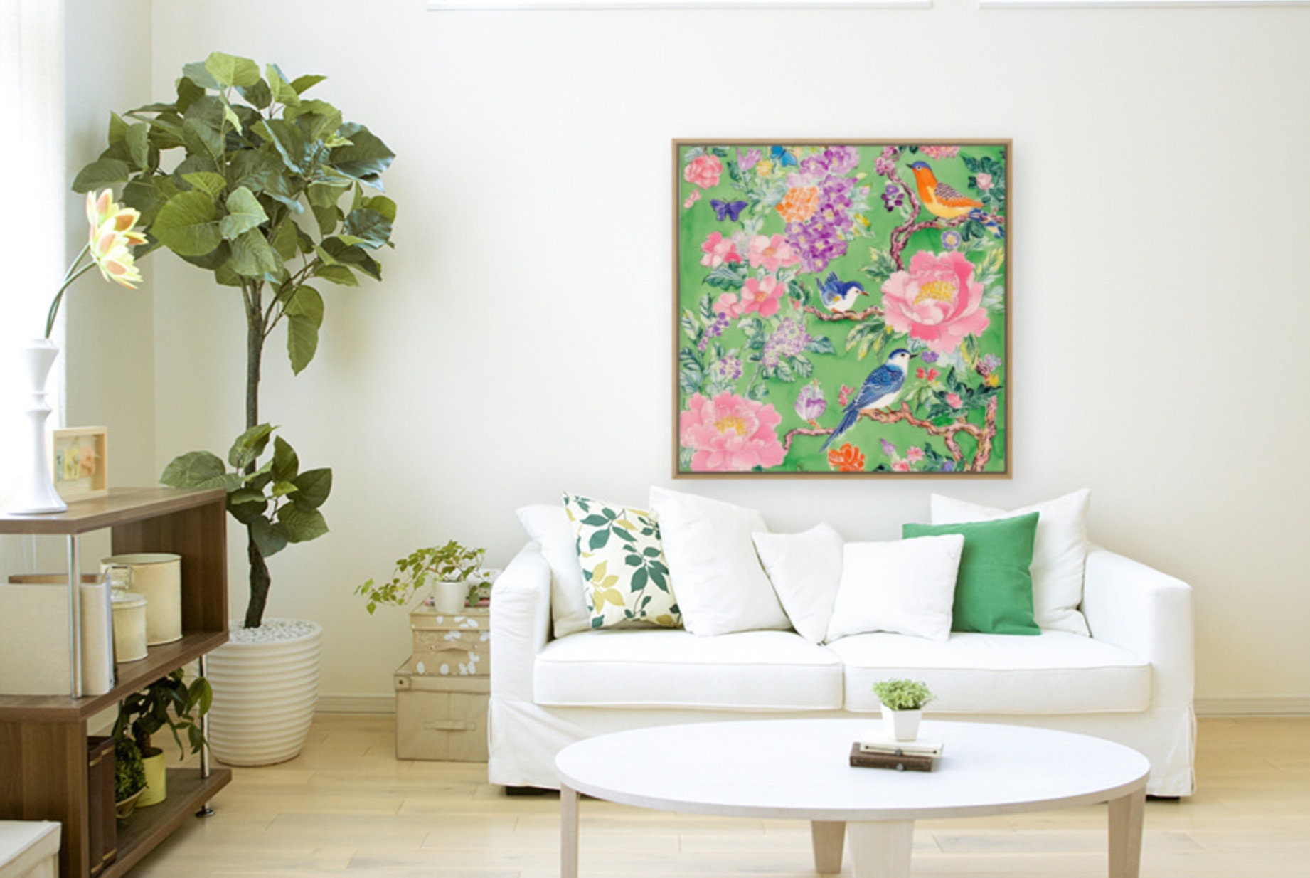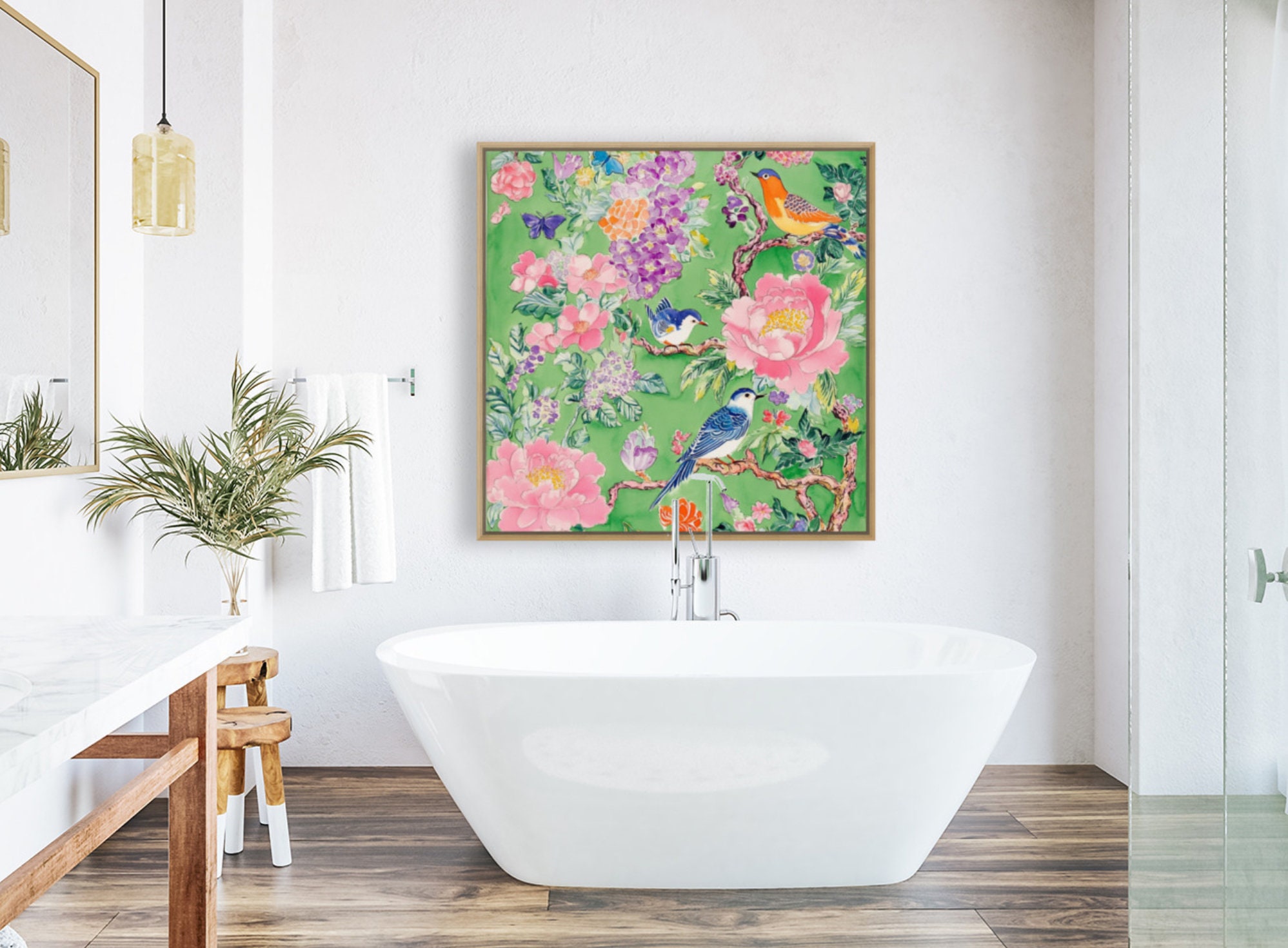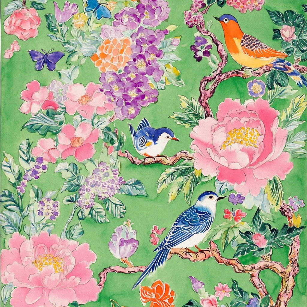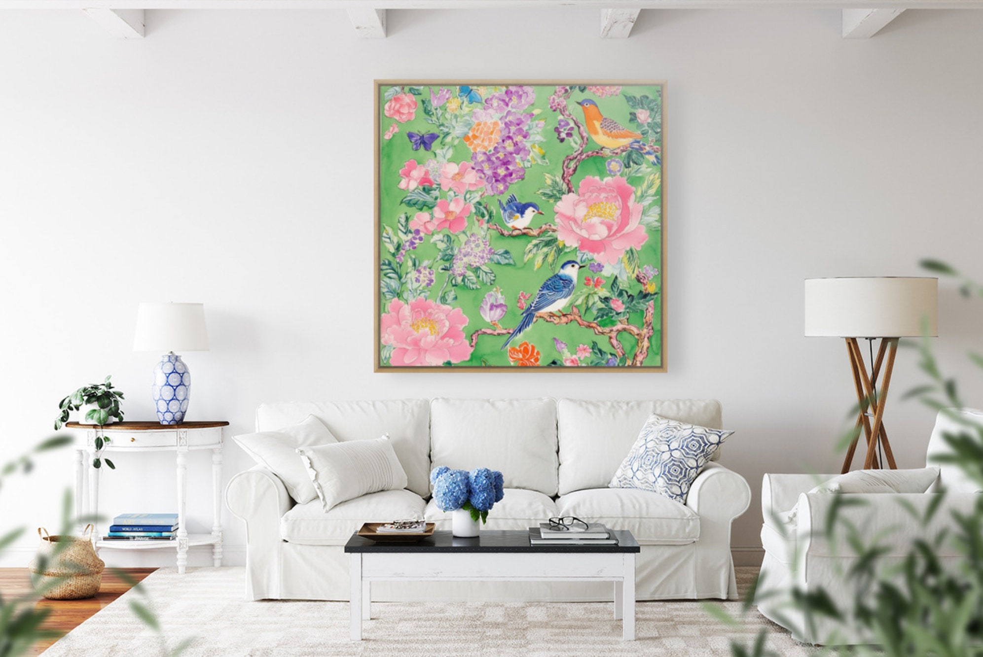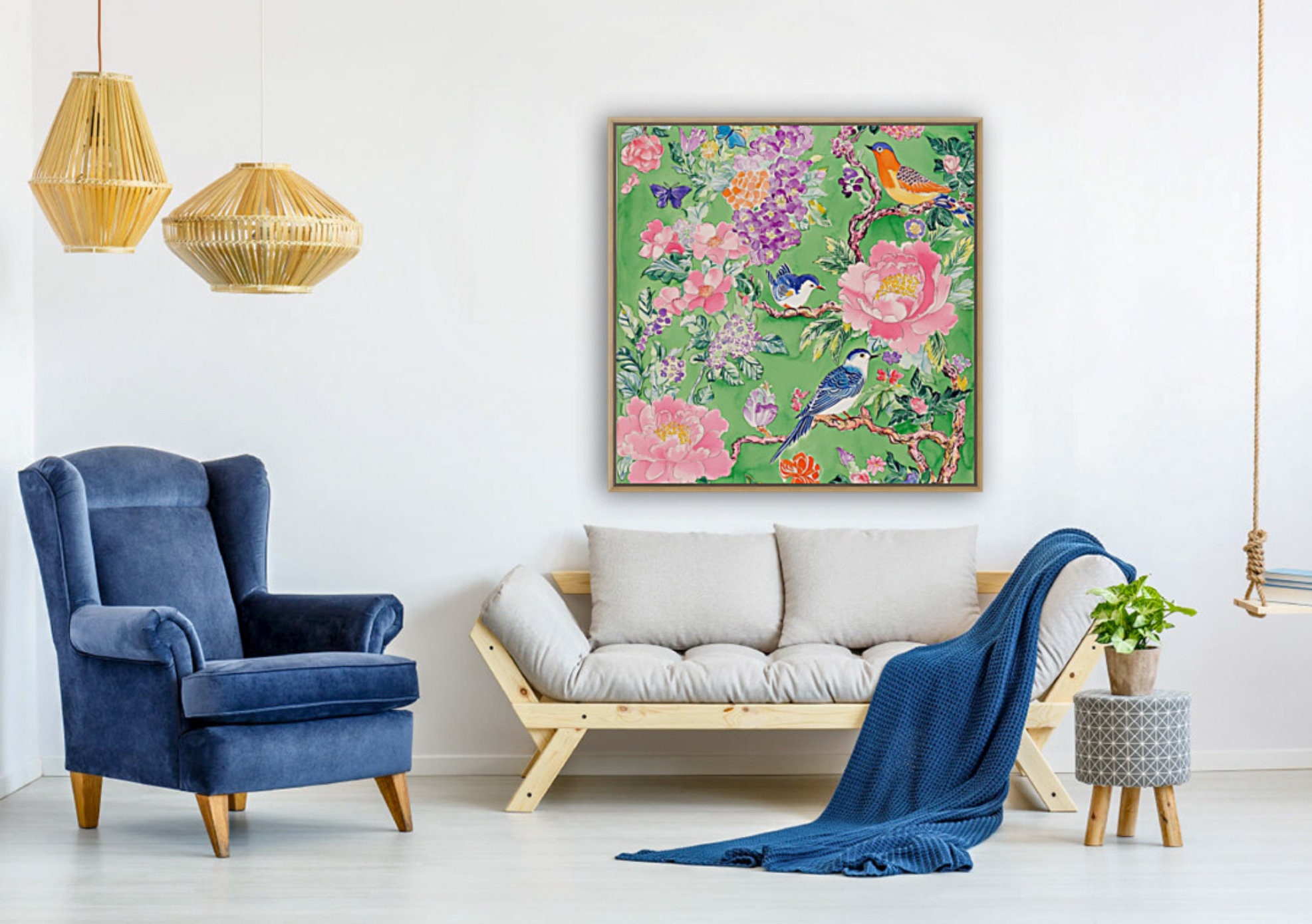 Chinoiserie art, Birds and flowers chinoisetie on apple green part 1, Giclee art print