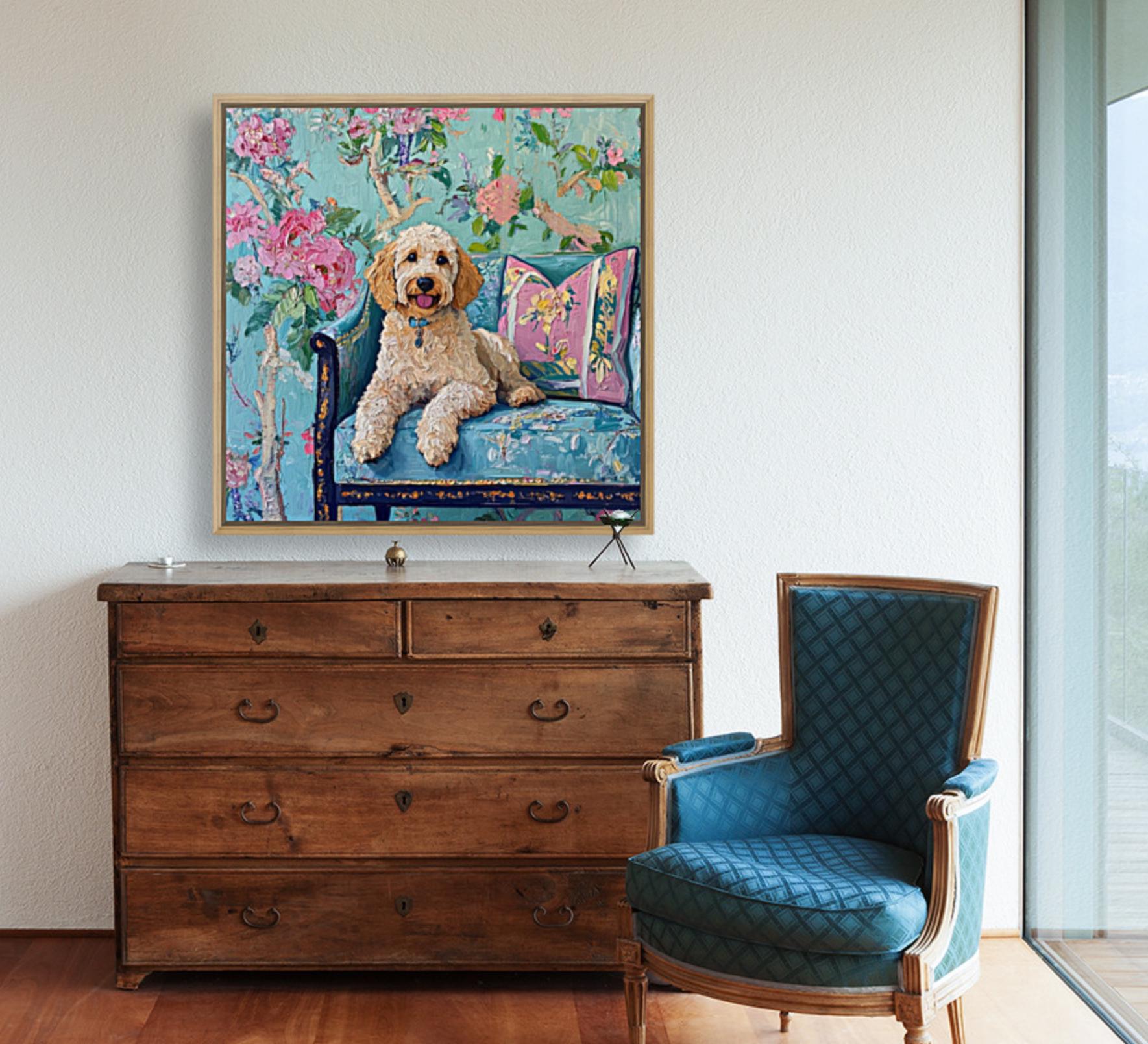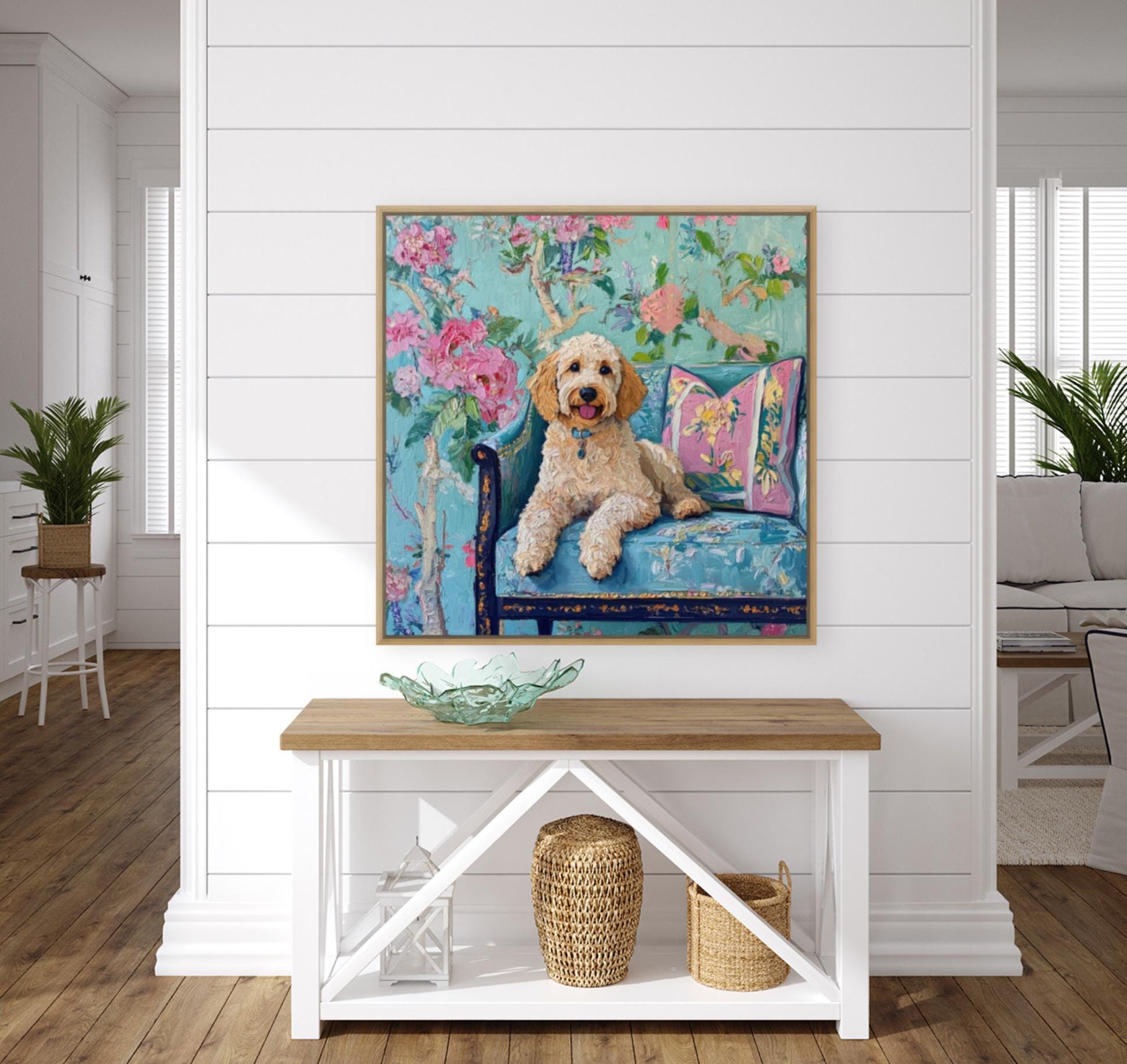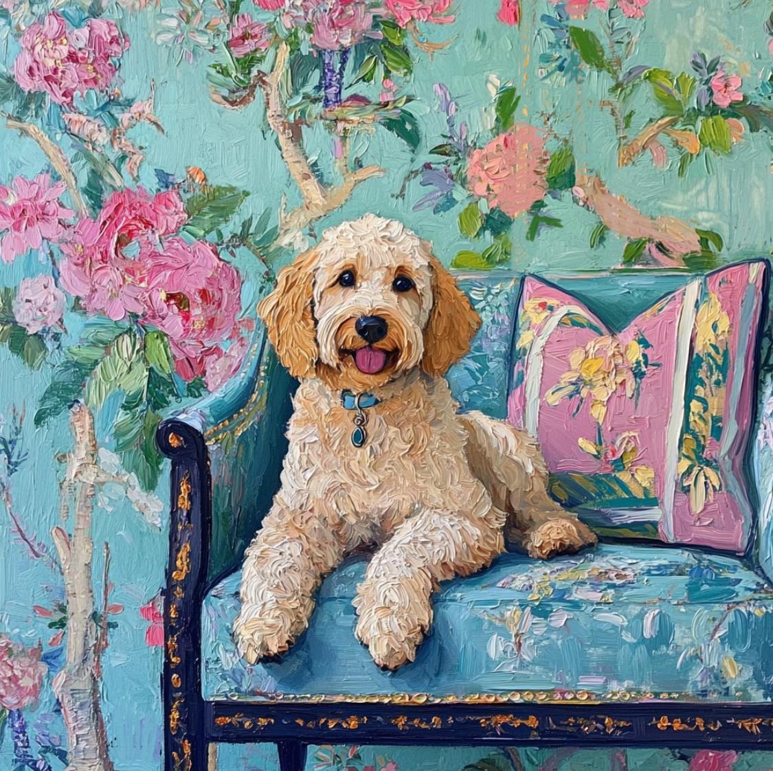 Grandmillennial art, Labradoodle in preppy chinoiserie interior, whimsical fine art