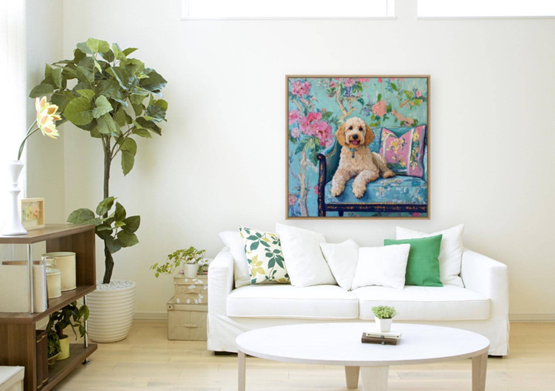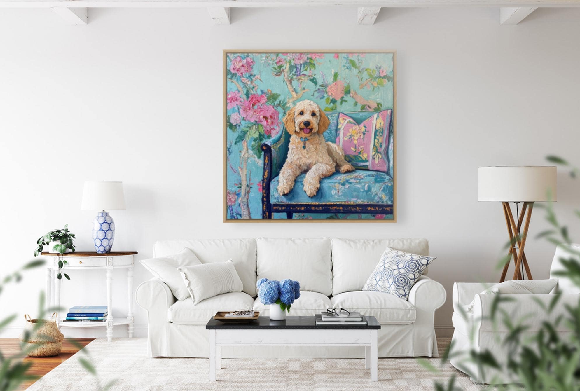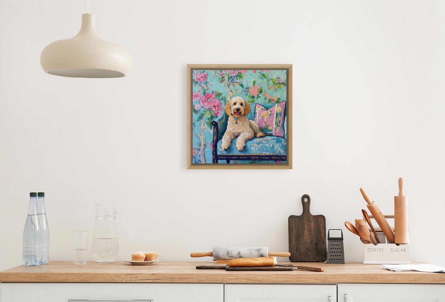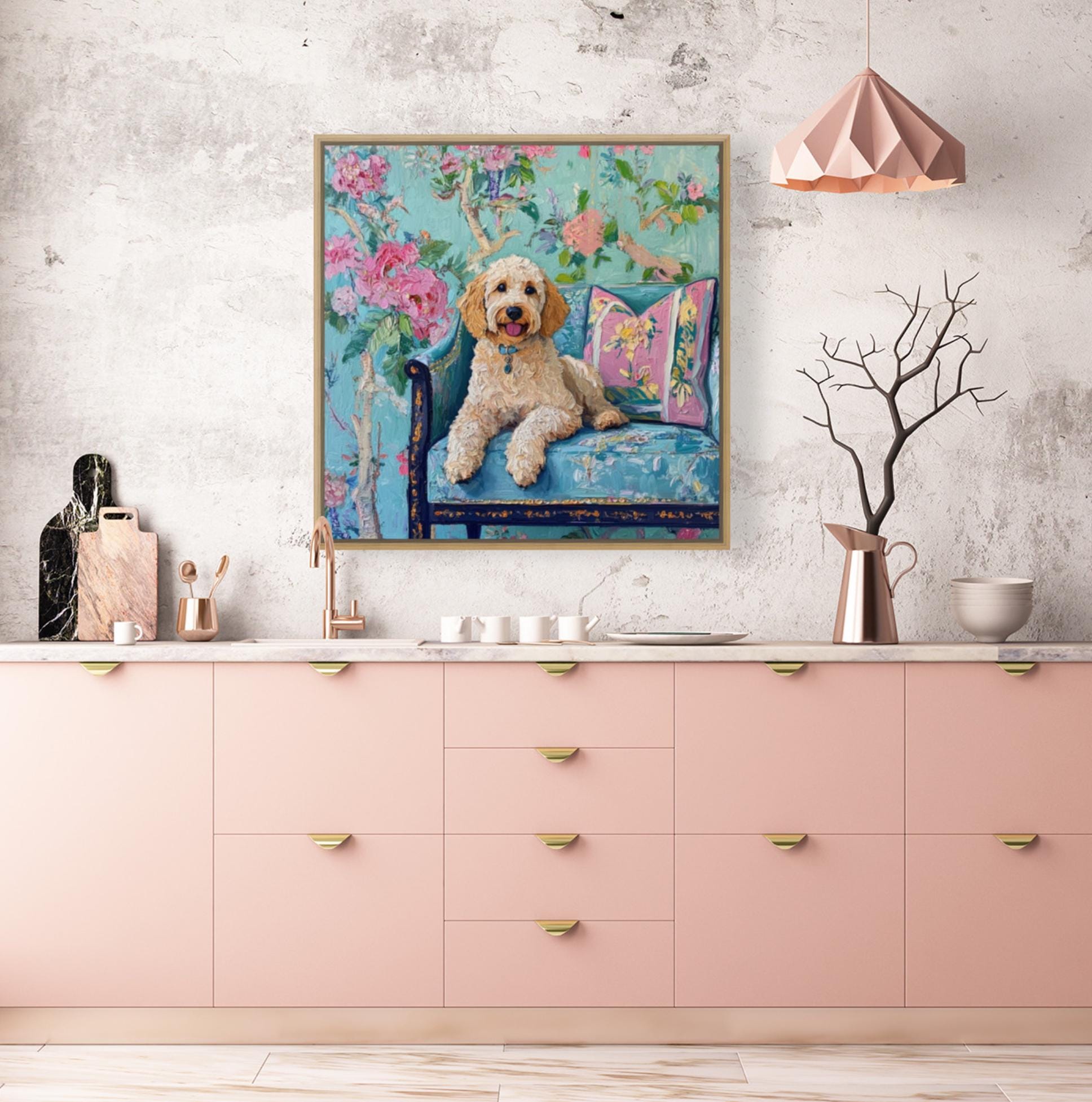 Grandmillennial art, Labradoodle in preppy chinoiserie interior, whimsical fine art