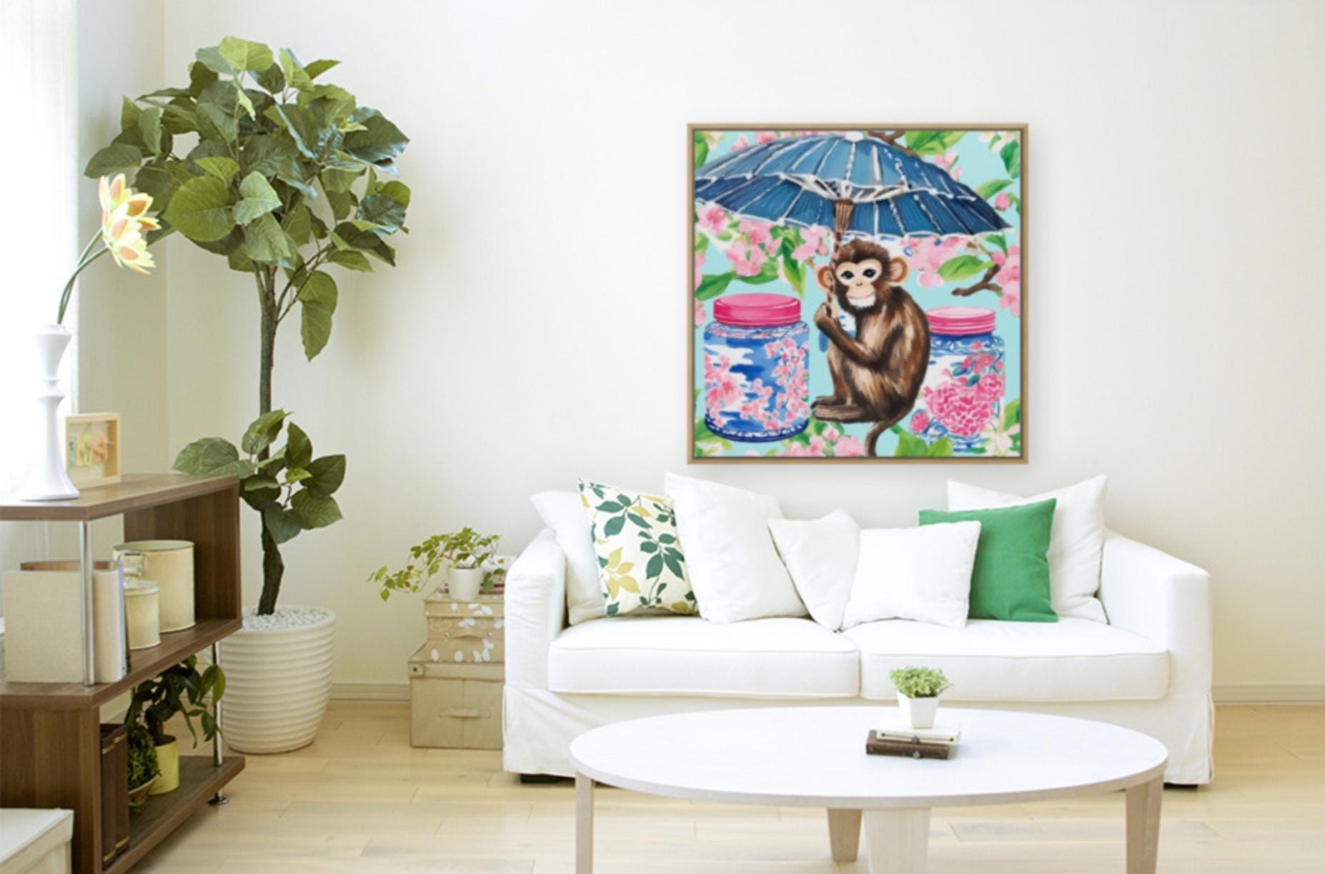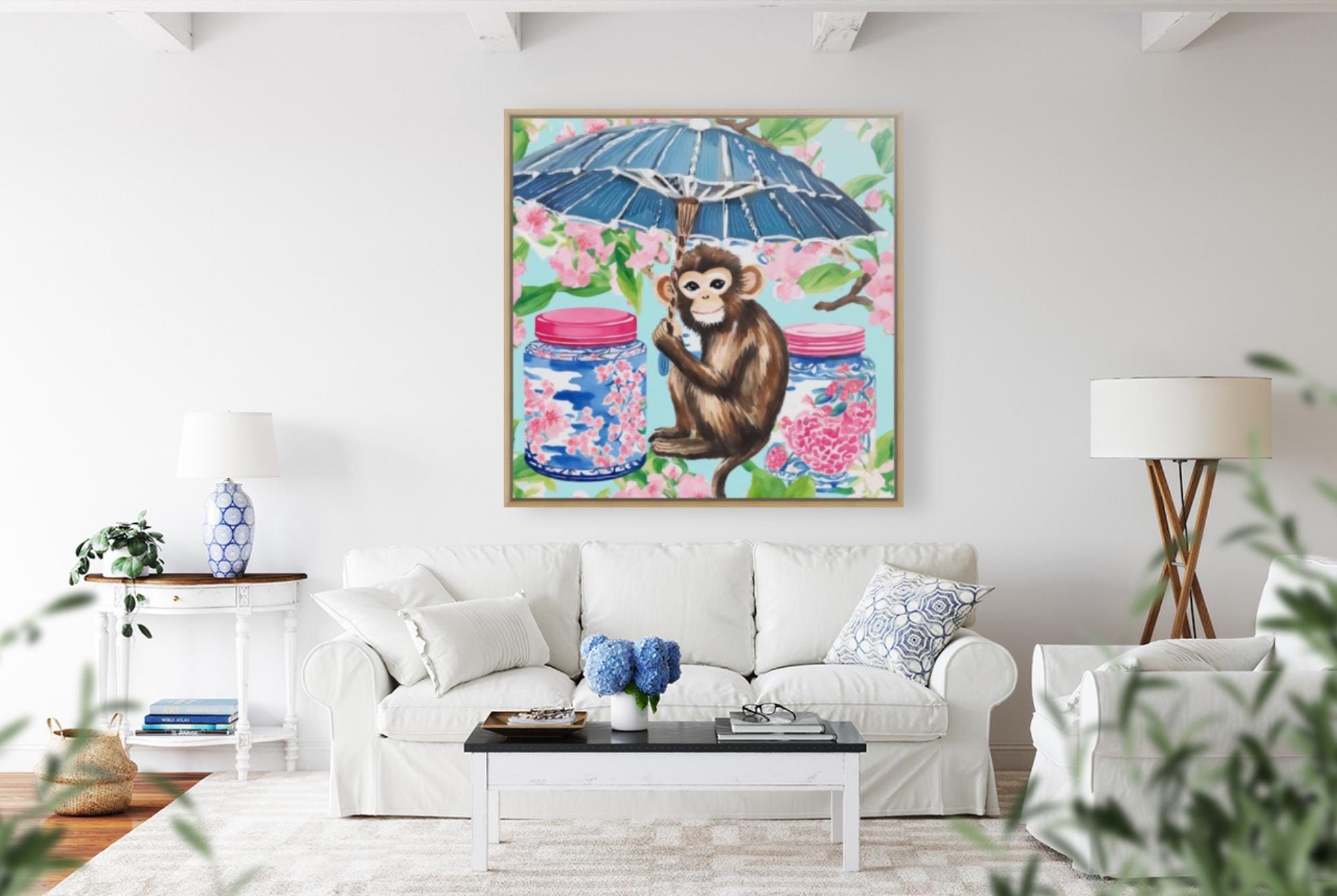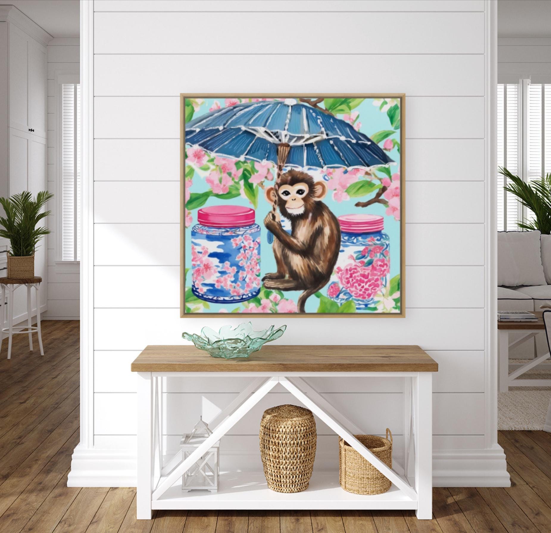Grandmillennial art, Monkey with blue umbrella, chinoiserie art print
