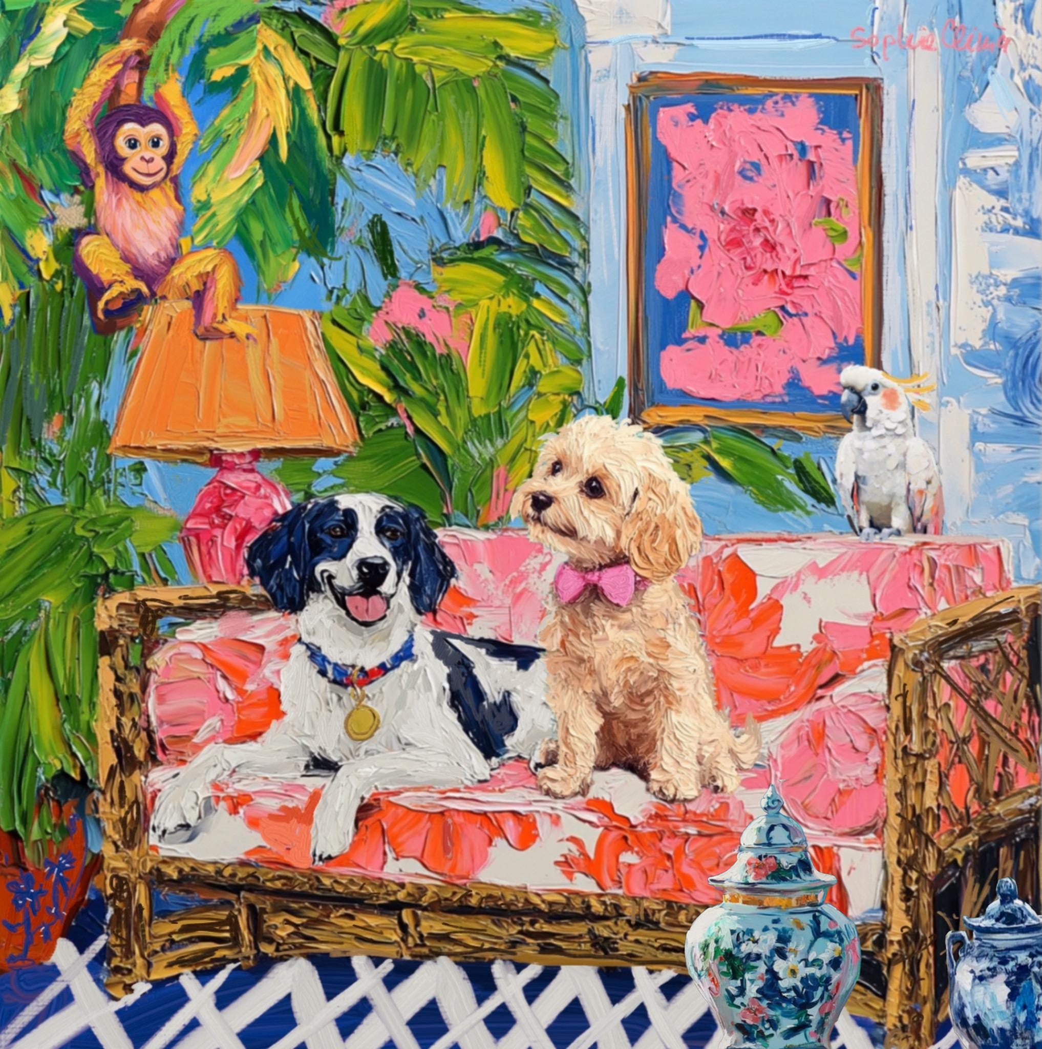 Grandmillennial art,Sunroom in Palm Beach, whimsical fine art