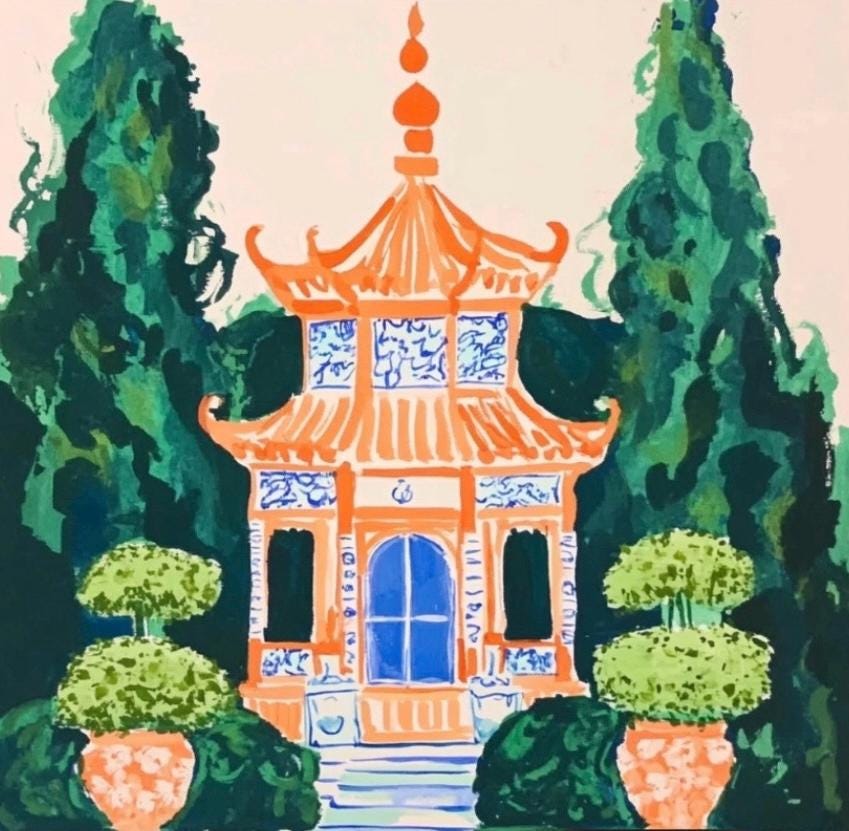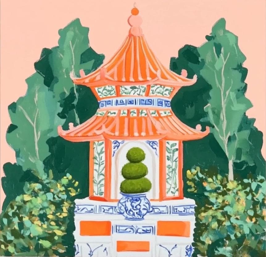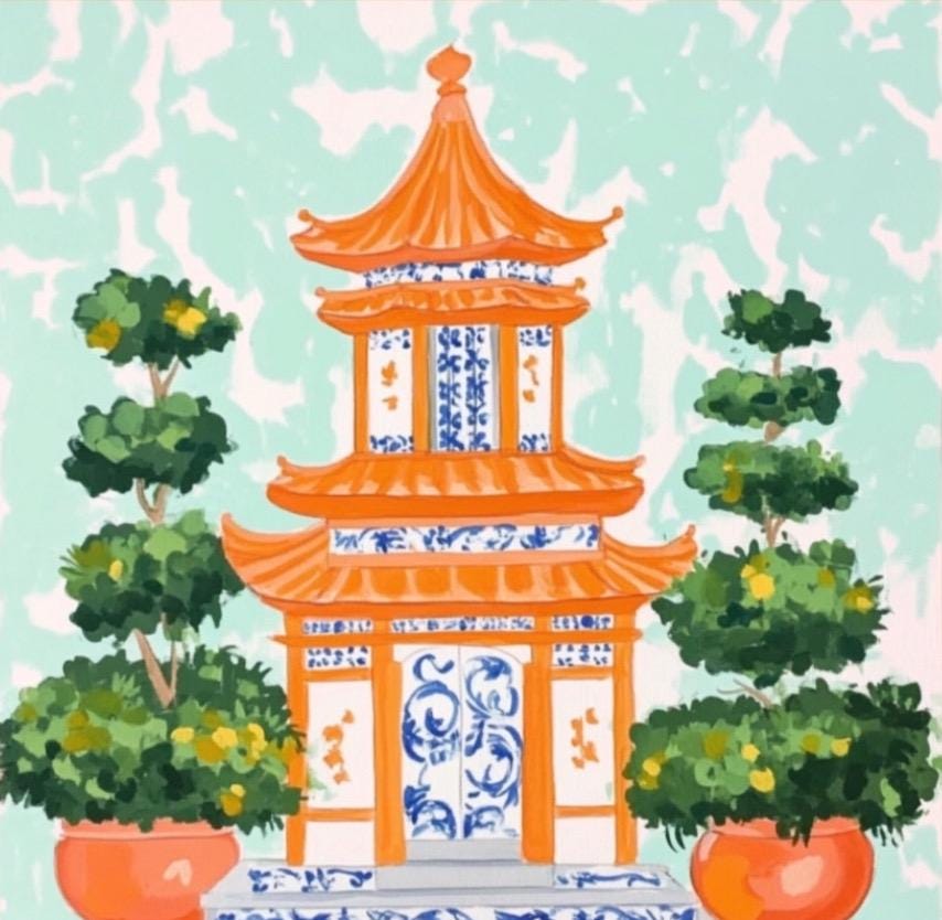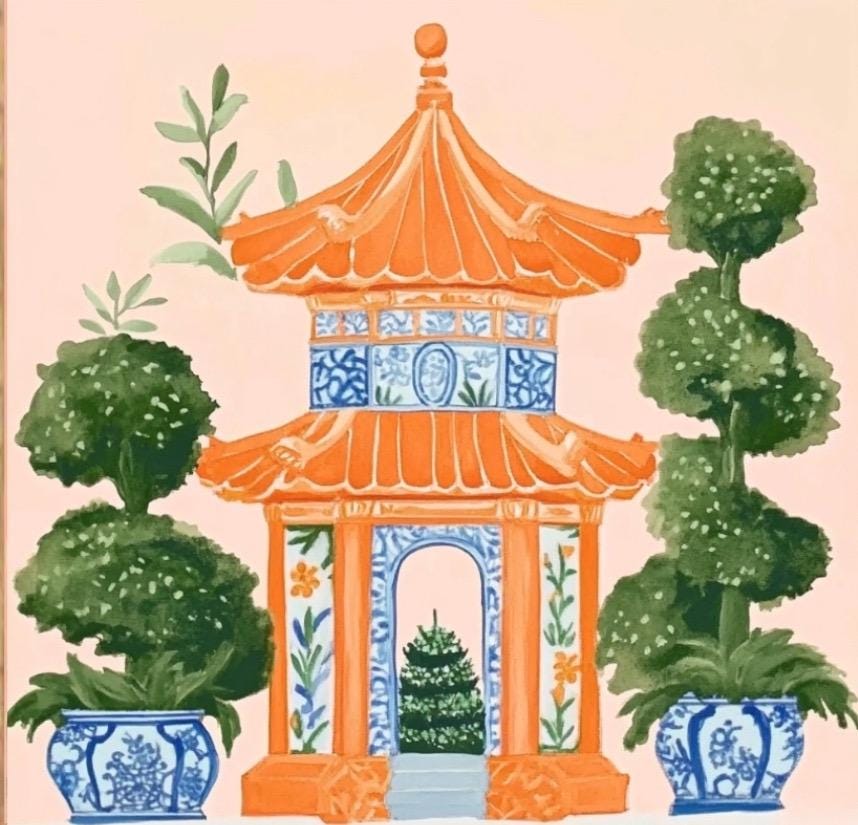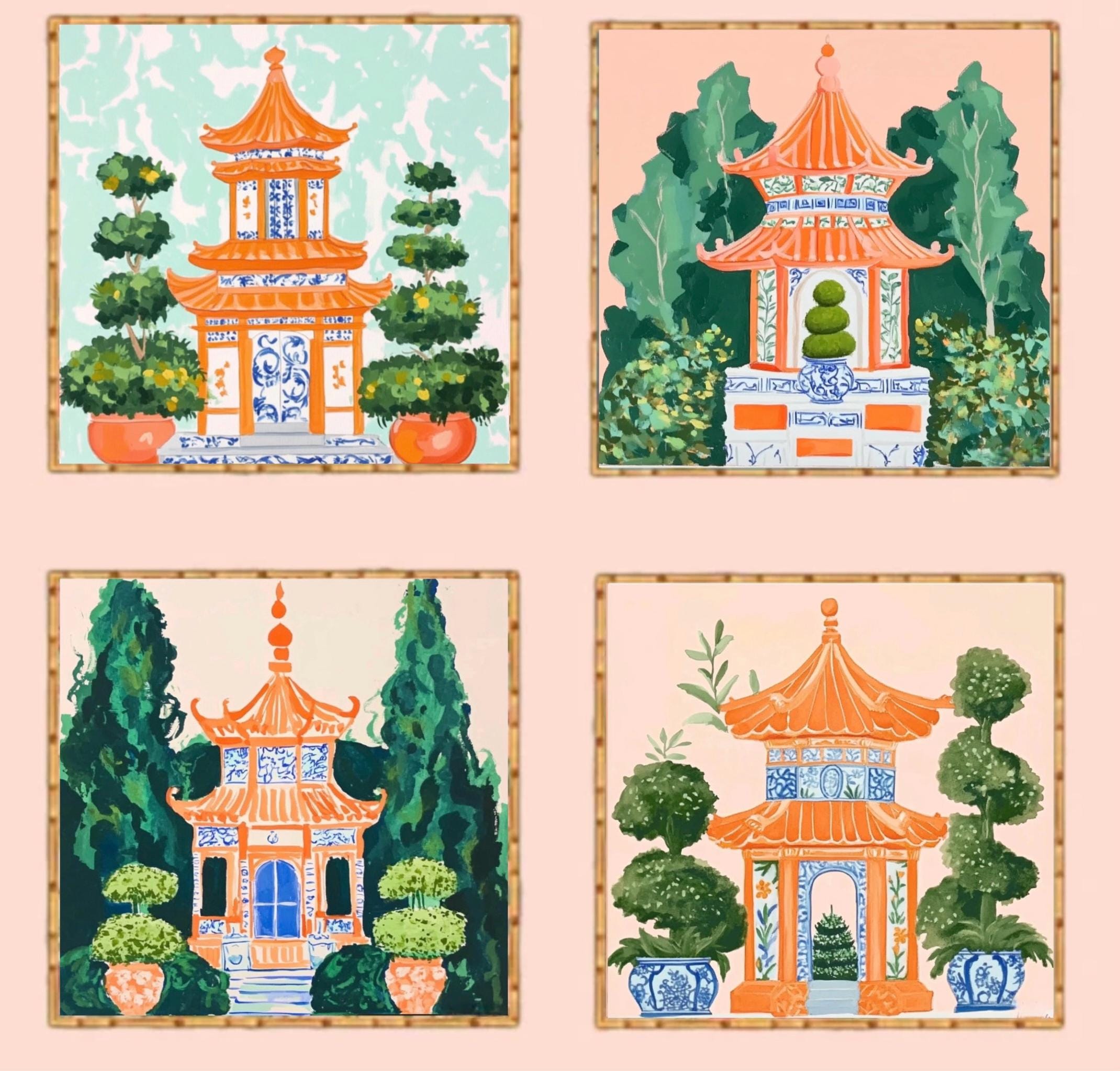 Chinoiserie Pagoda Prints: Orange Topiaries Watercolor Art, Set of 4