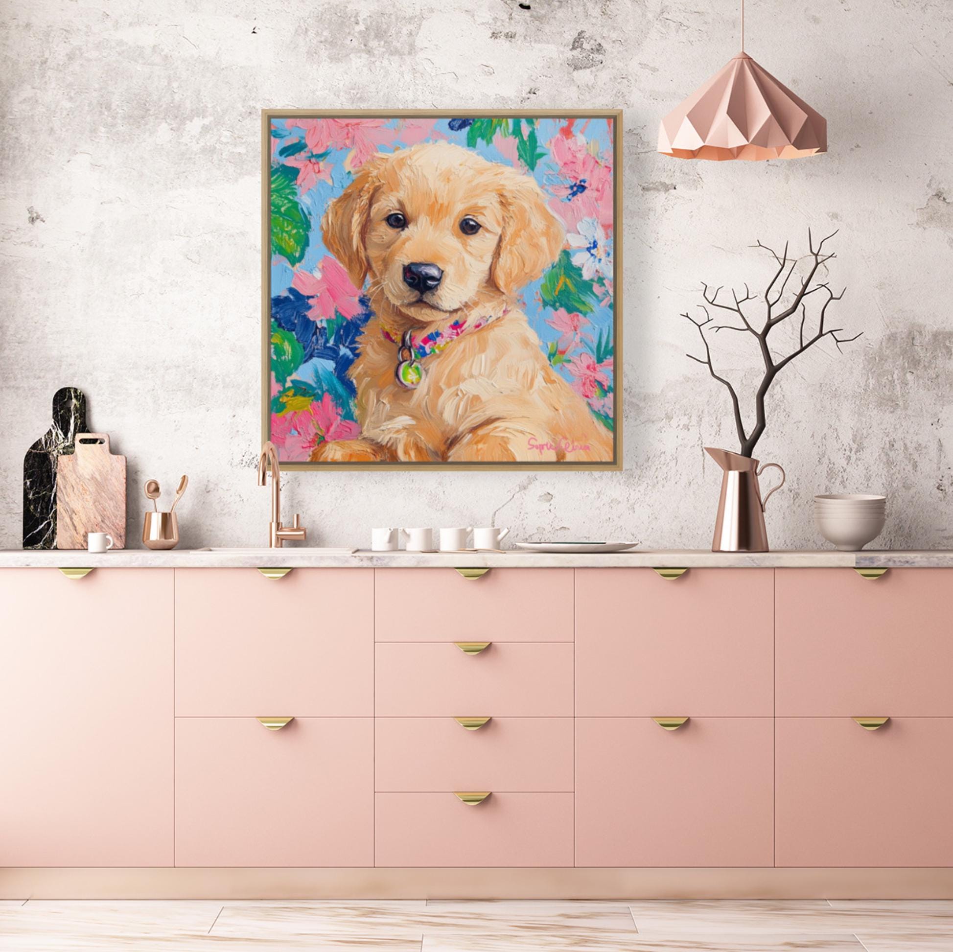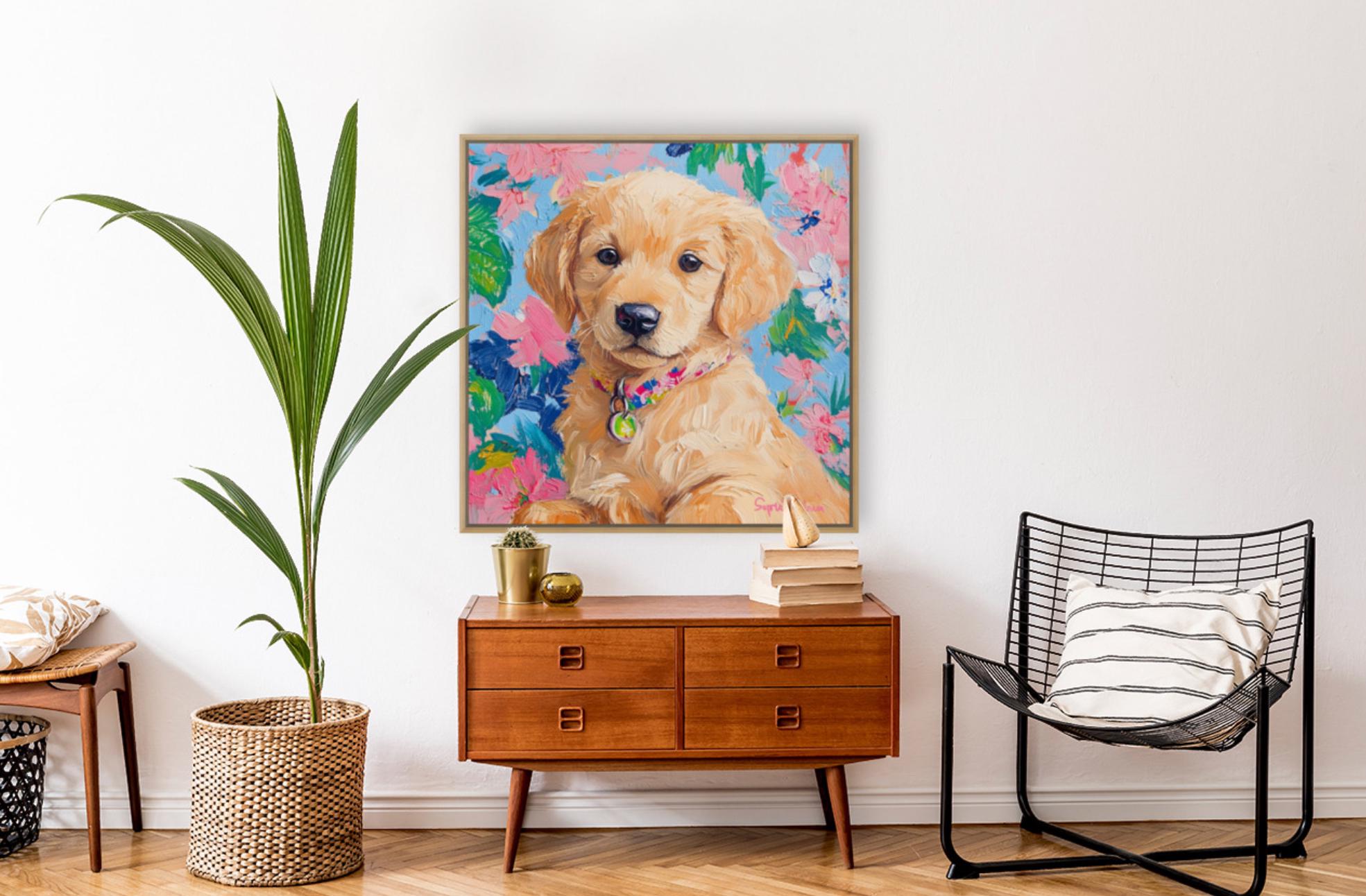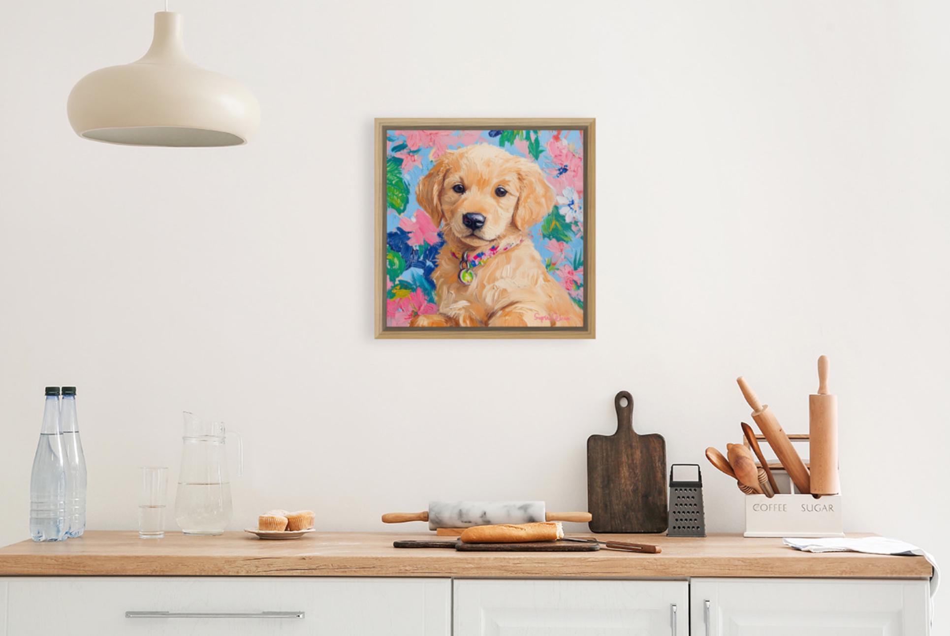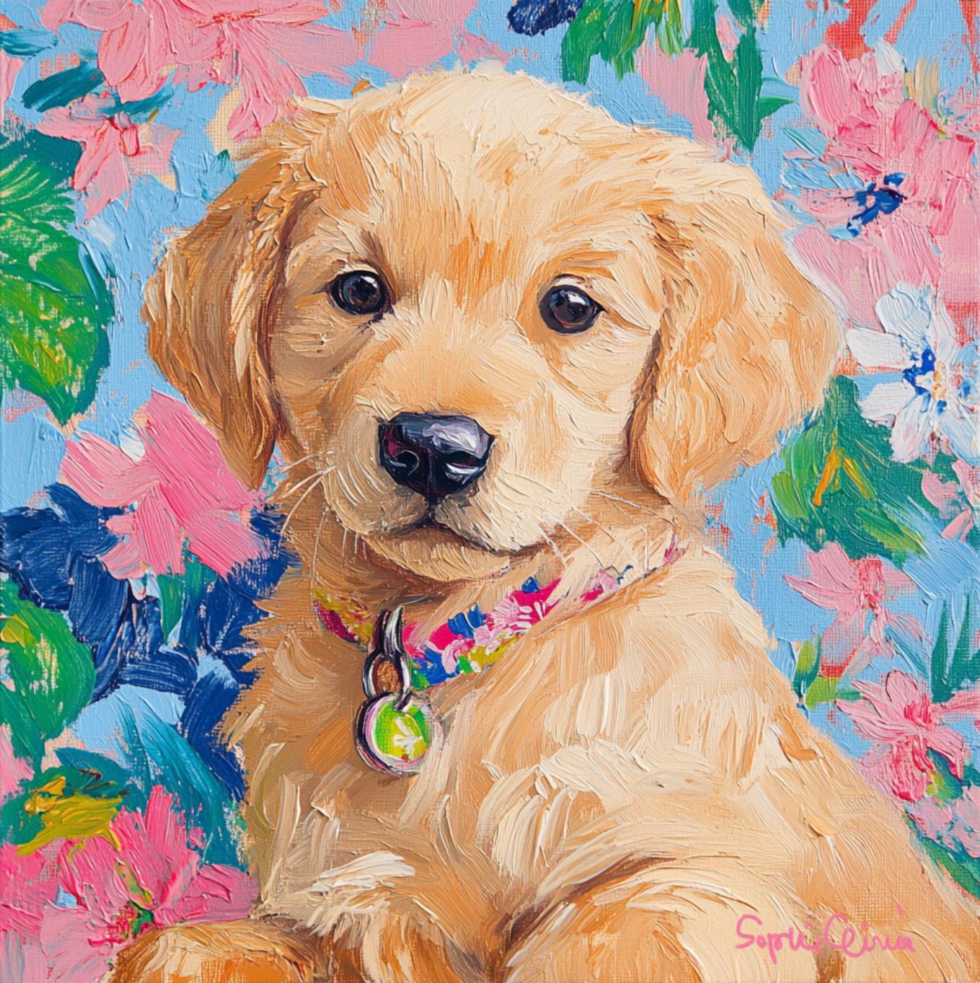 Grandmillennial art, portrait of Golden retriever puppy, whimsical fine art