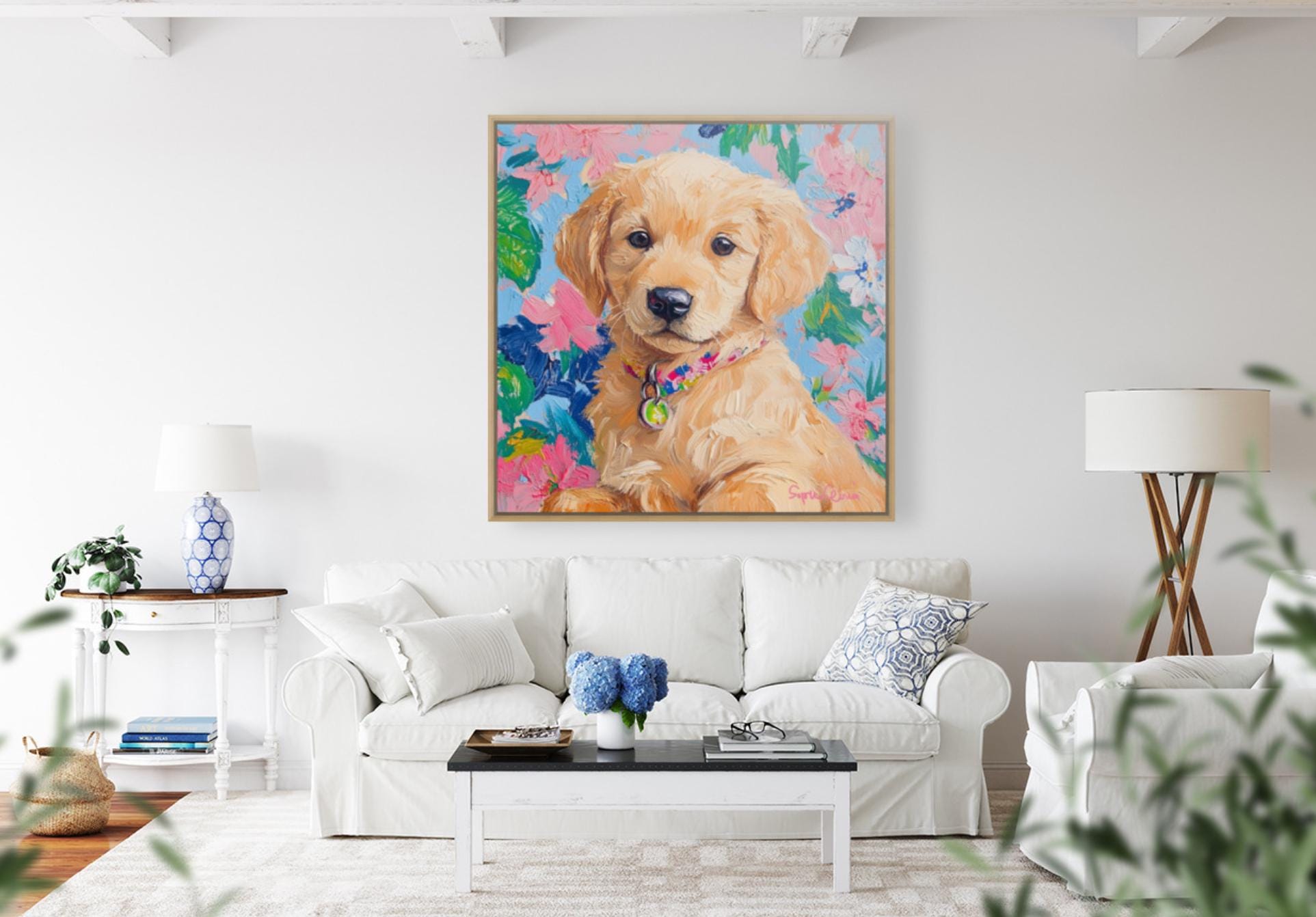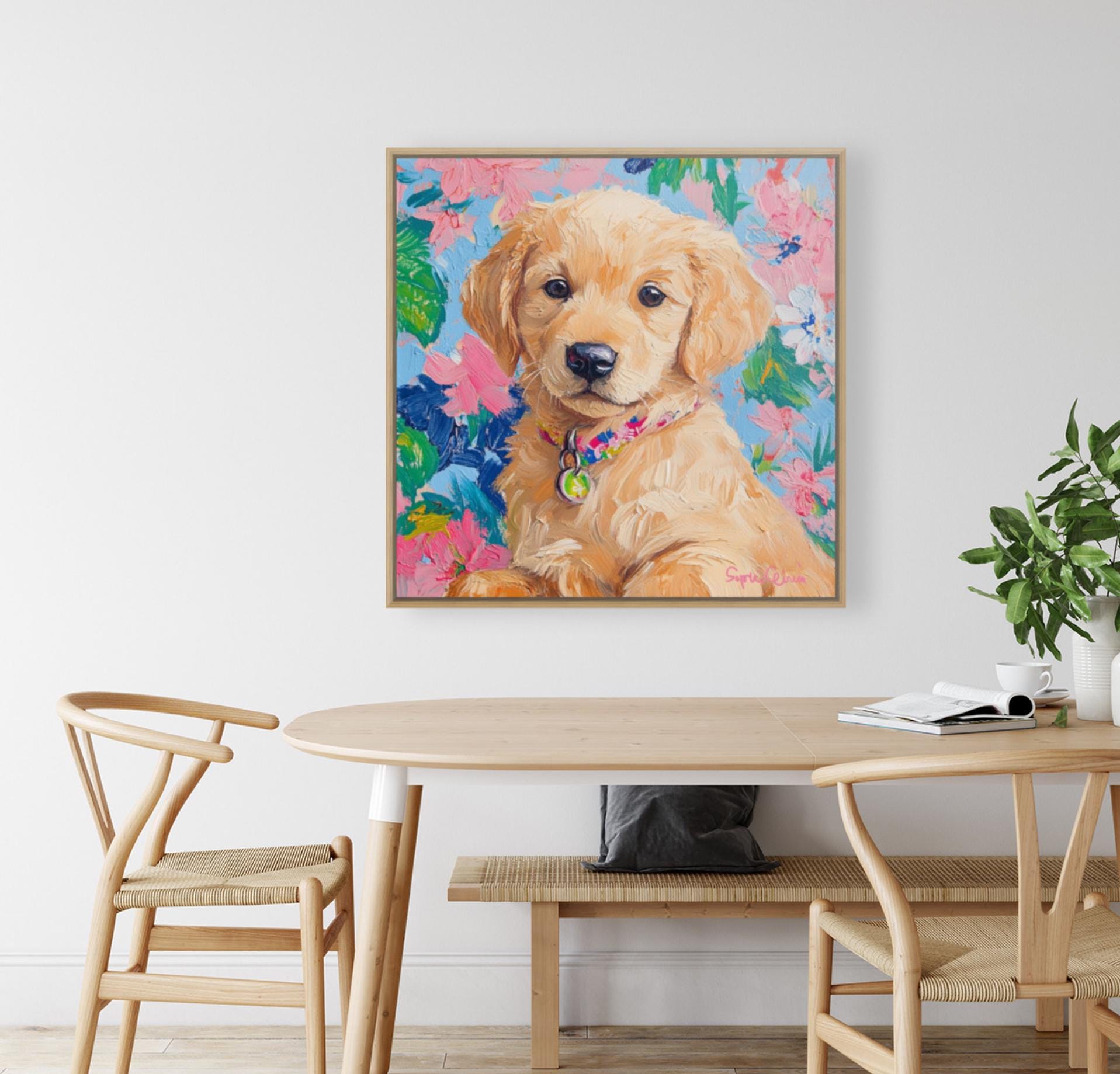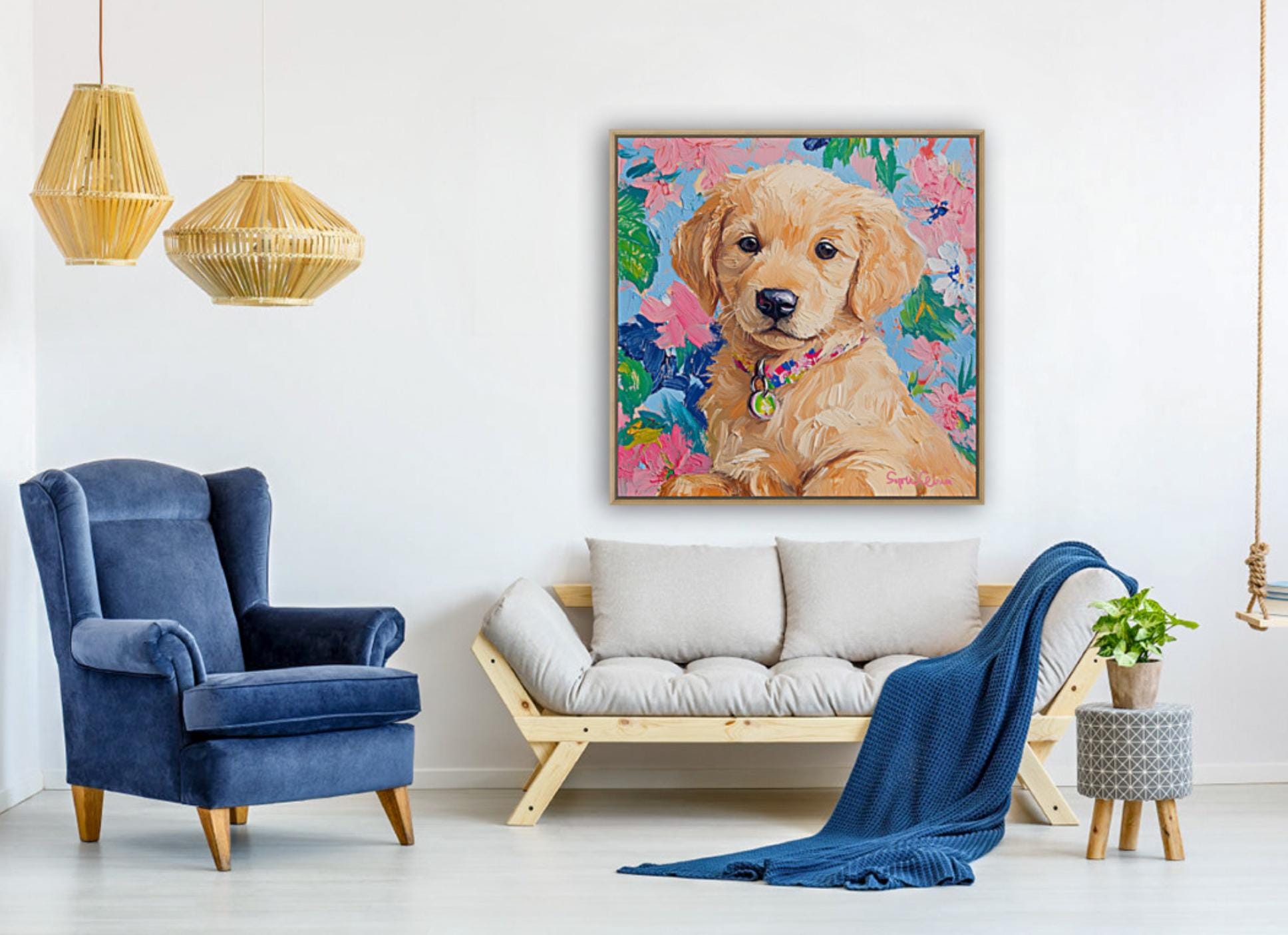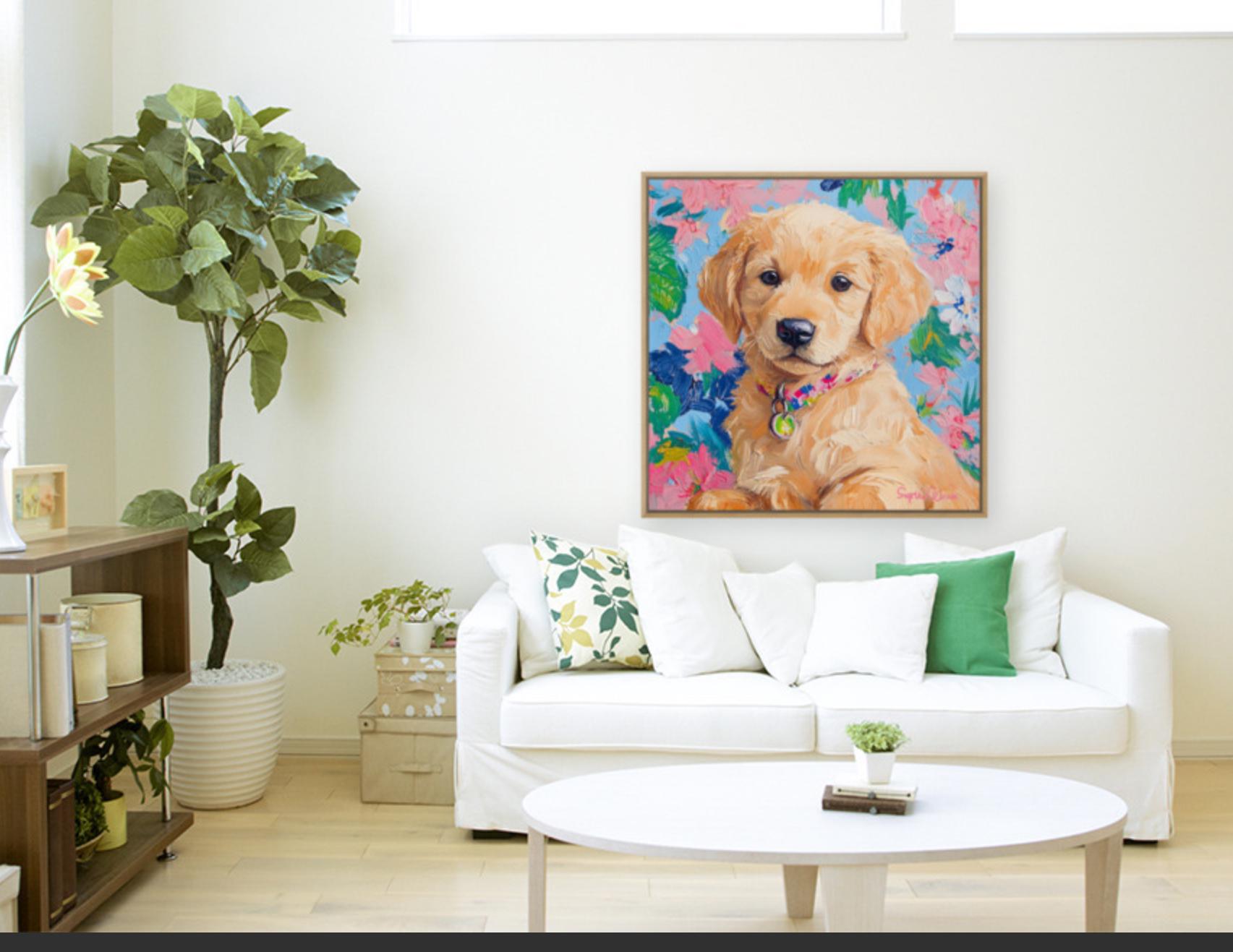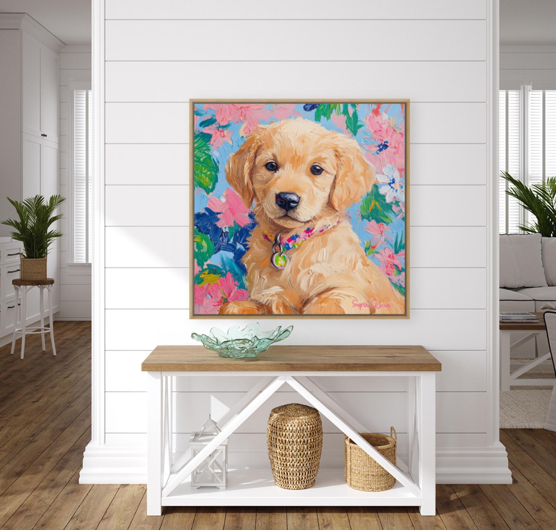 Grandmillennial art, portrait of Golden retriever puppy, whimsical fine art