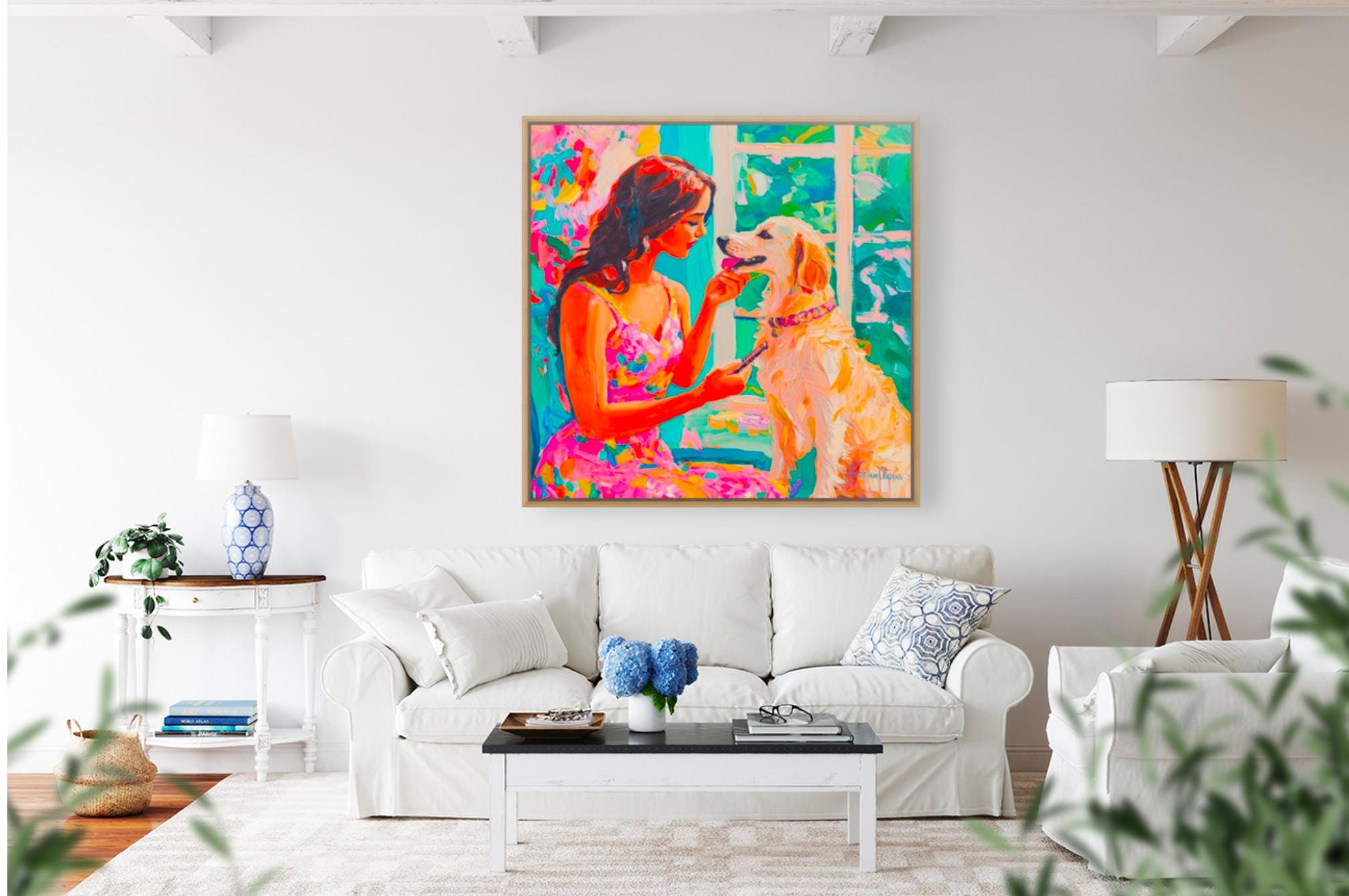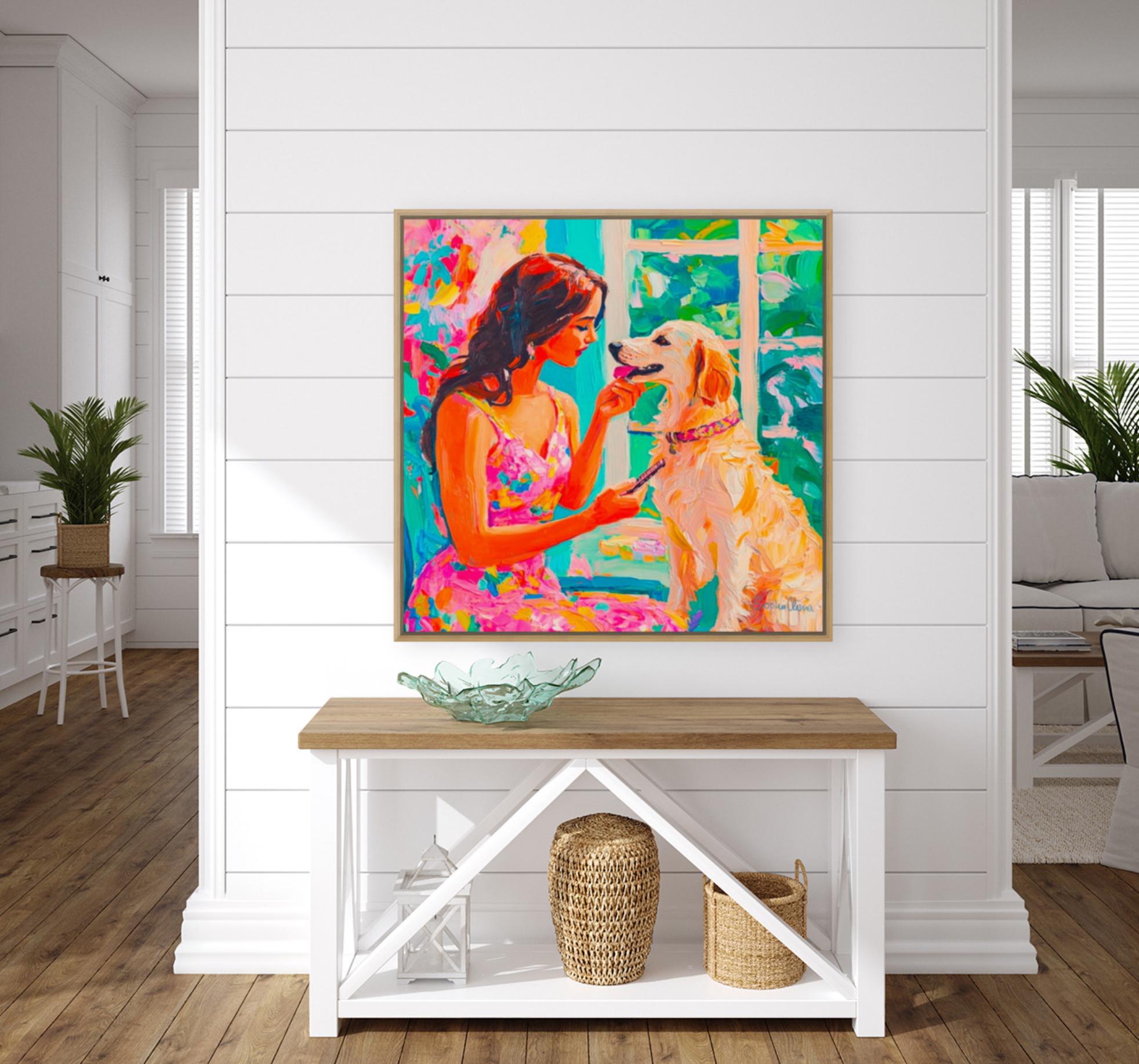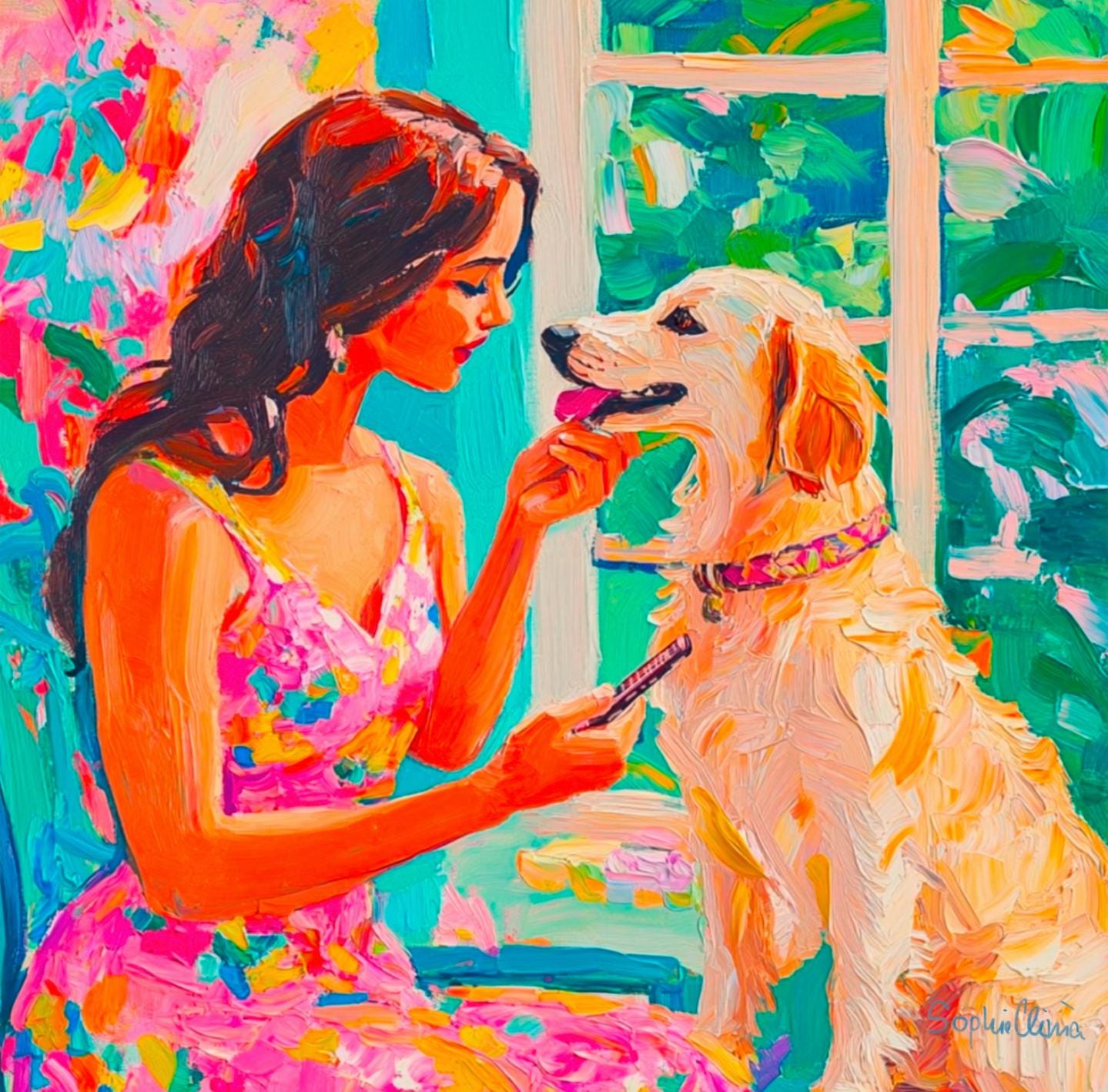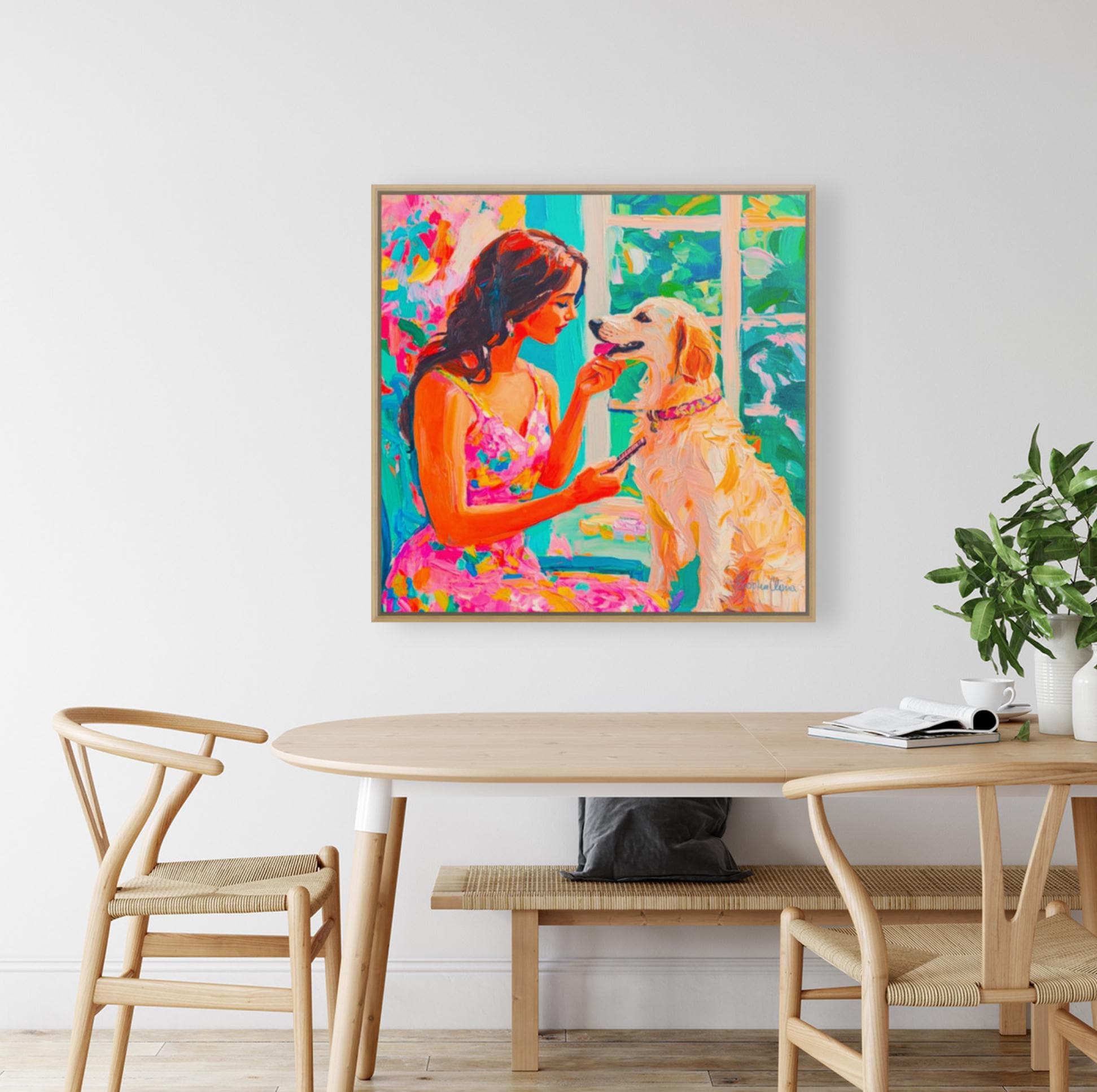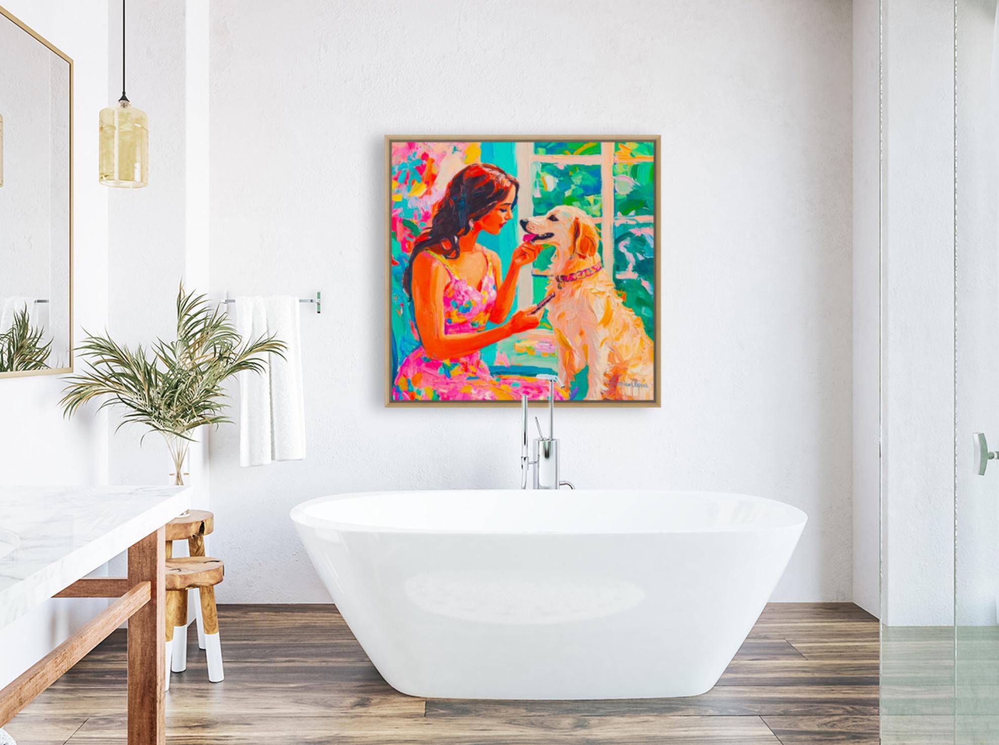 Grandmillennial art, Beauty Time, preppy Golden Retriever art