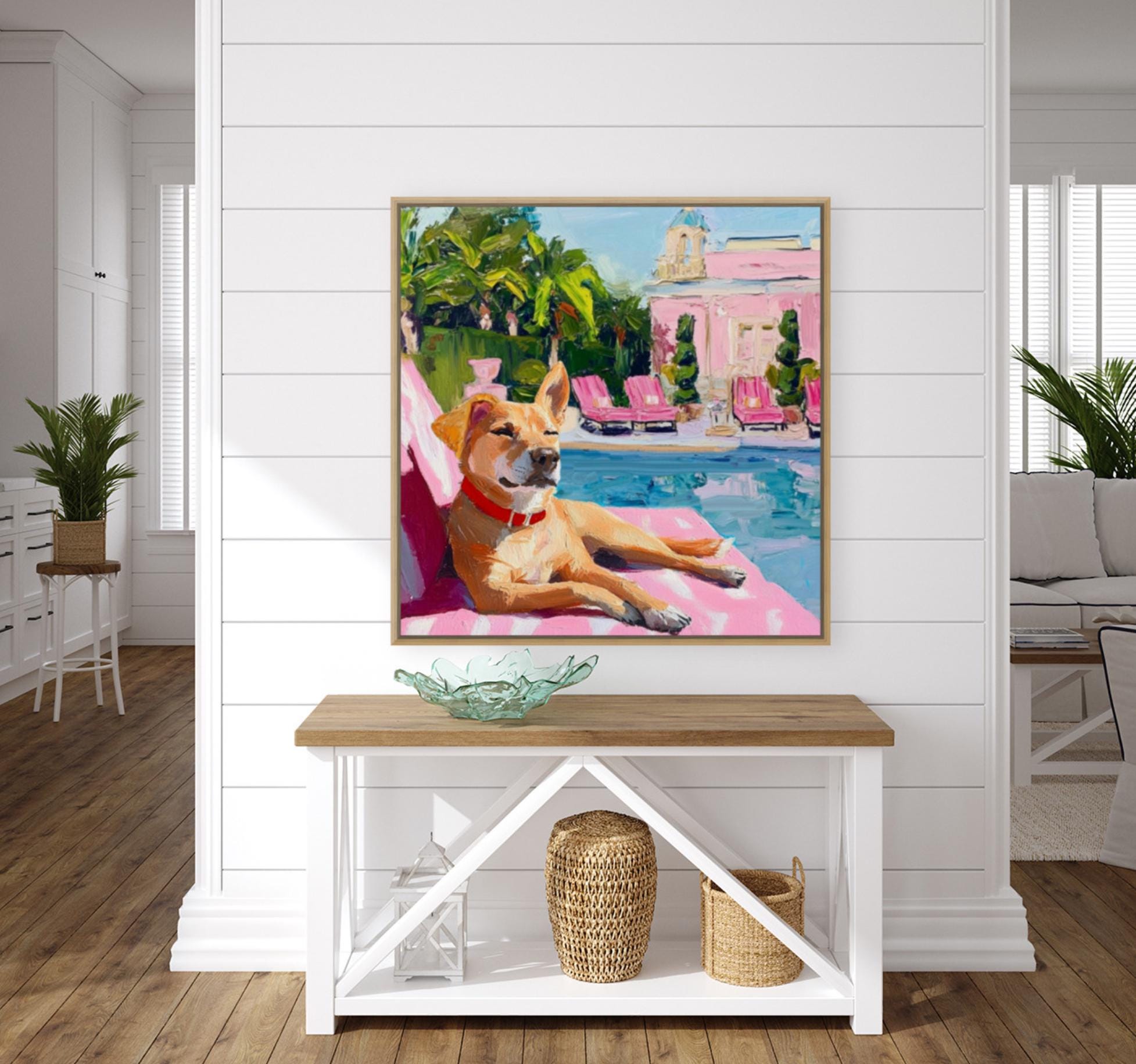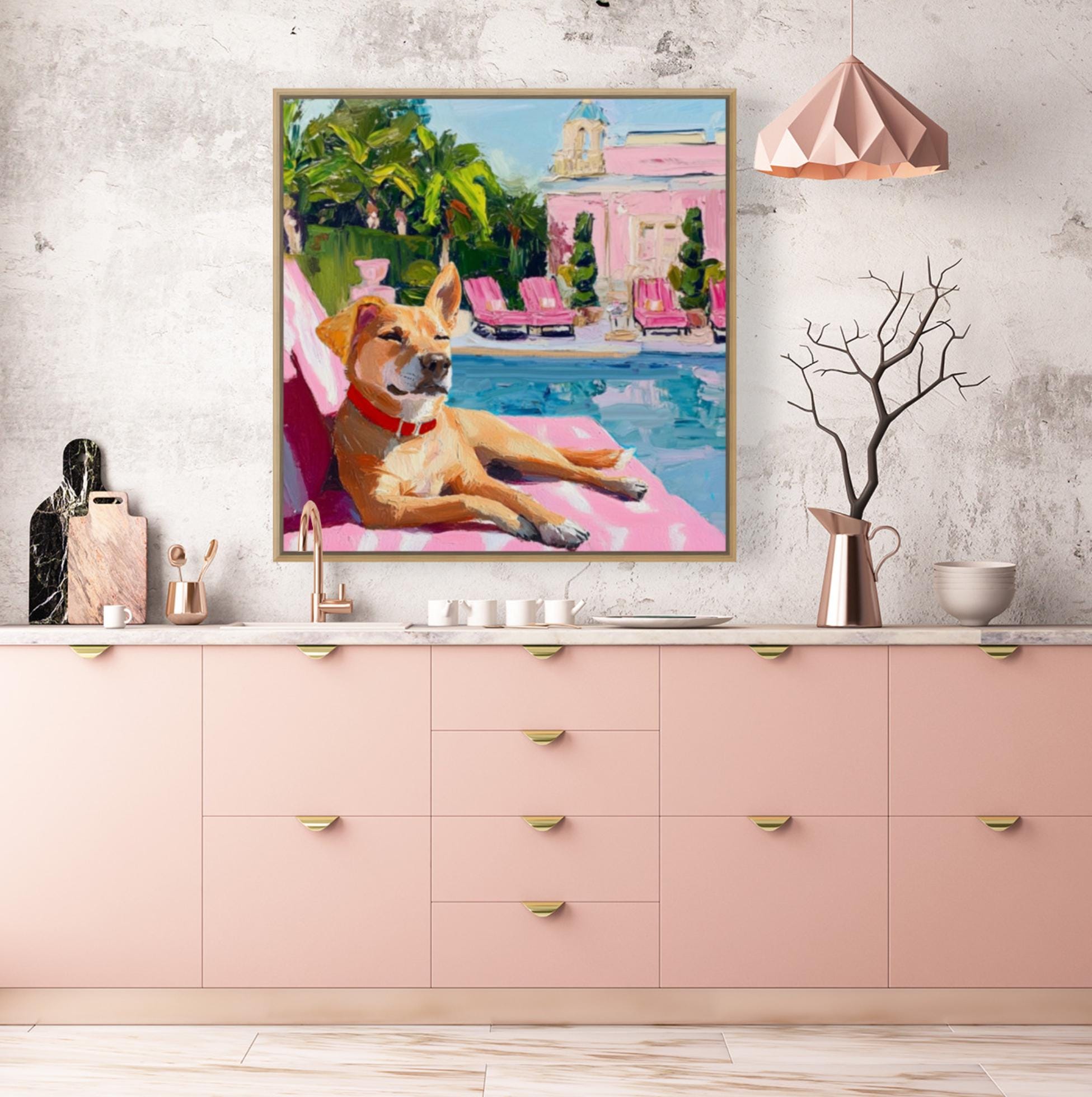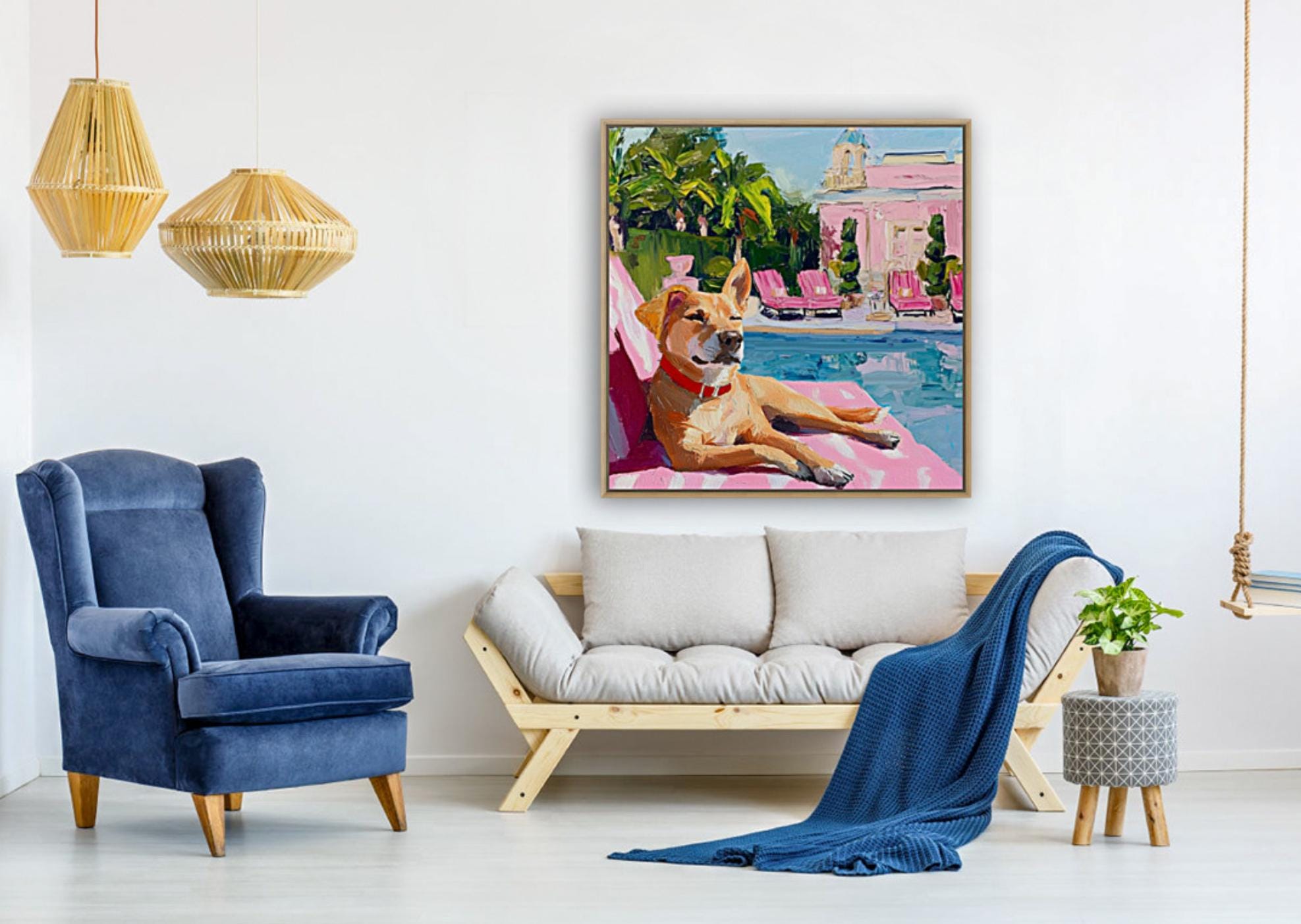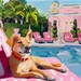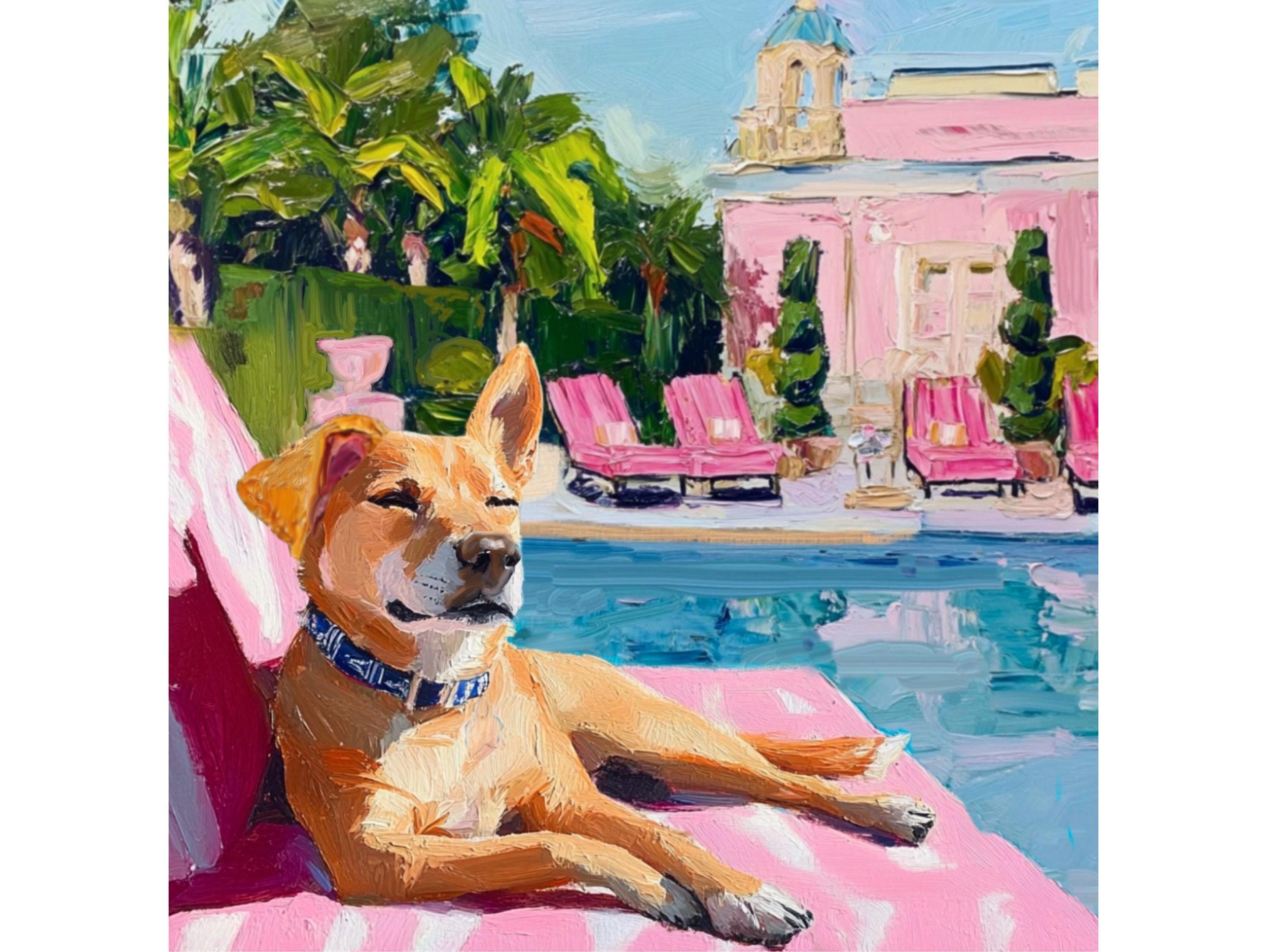 Grandmillennial art, Doggy near the swimming pool, whimsical fine art