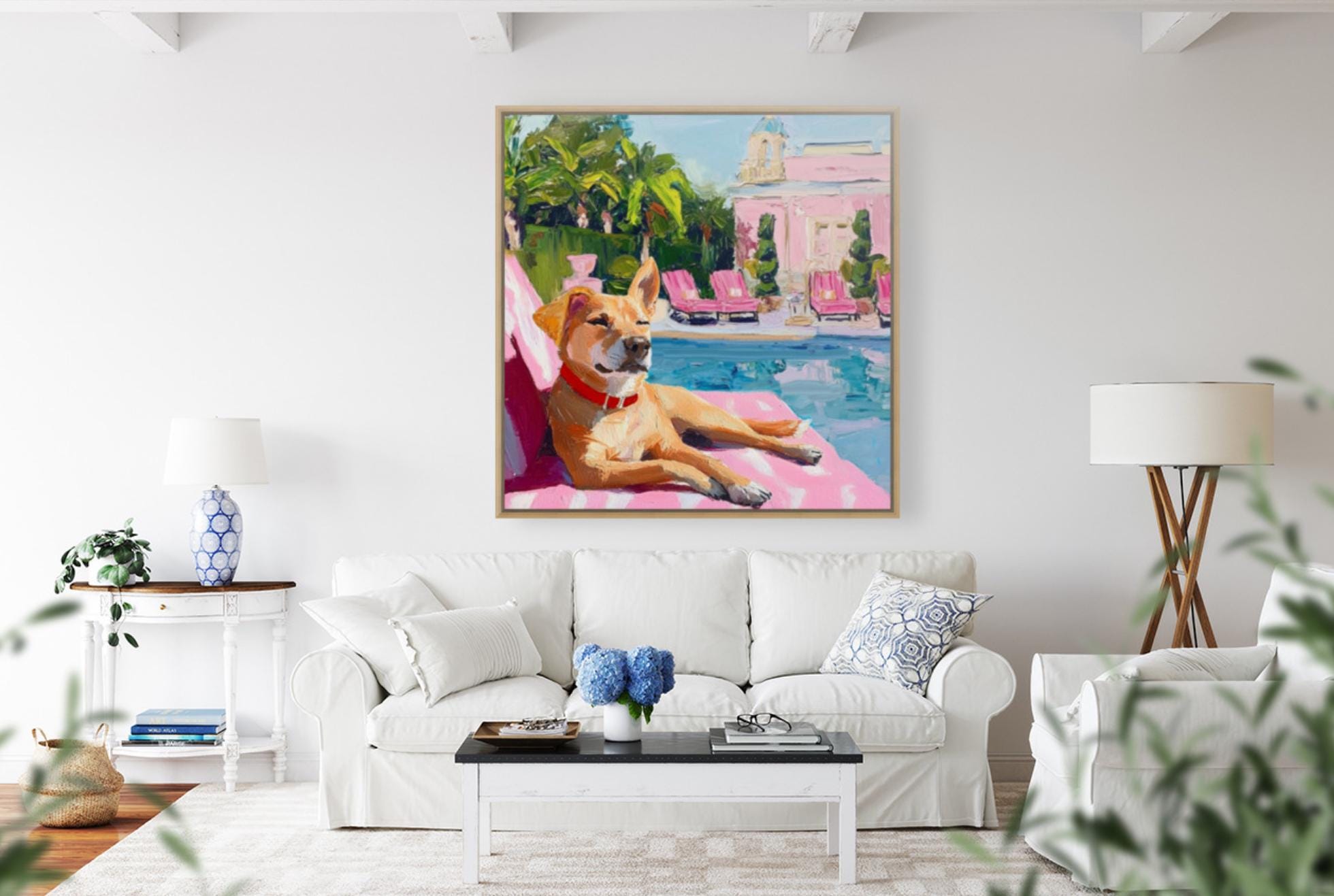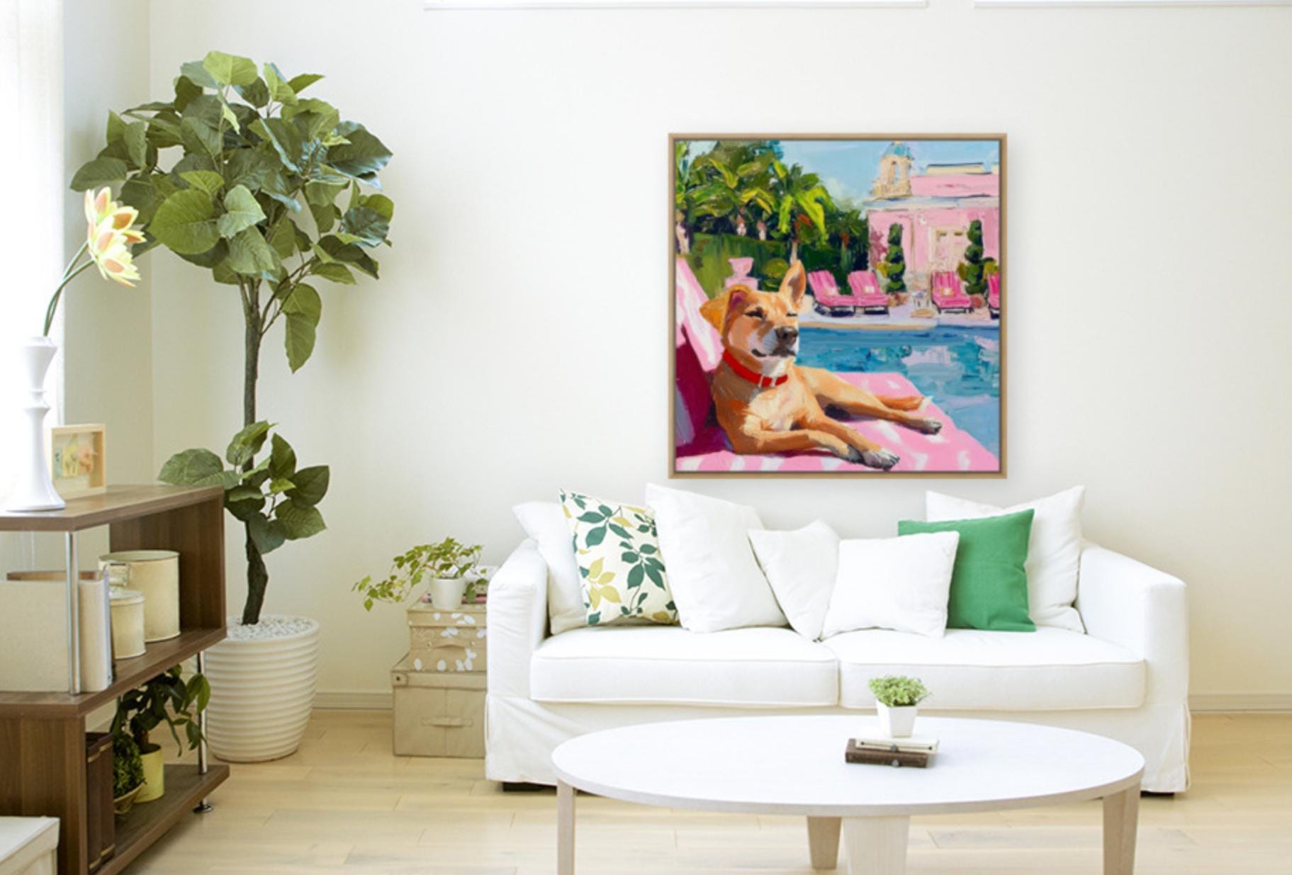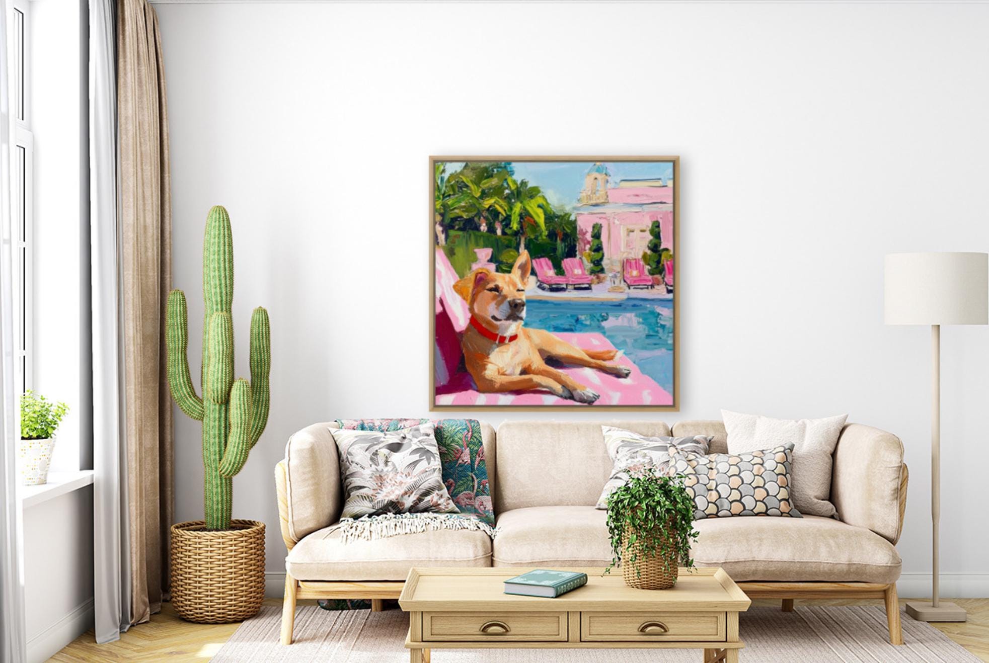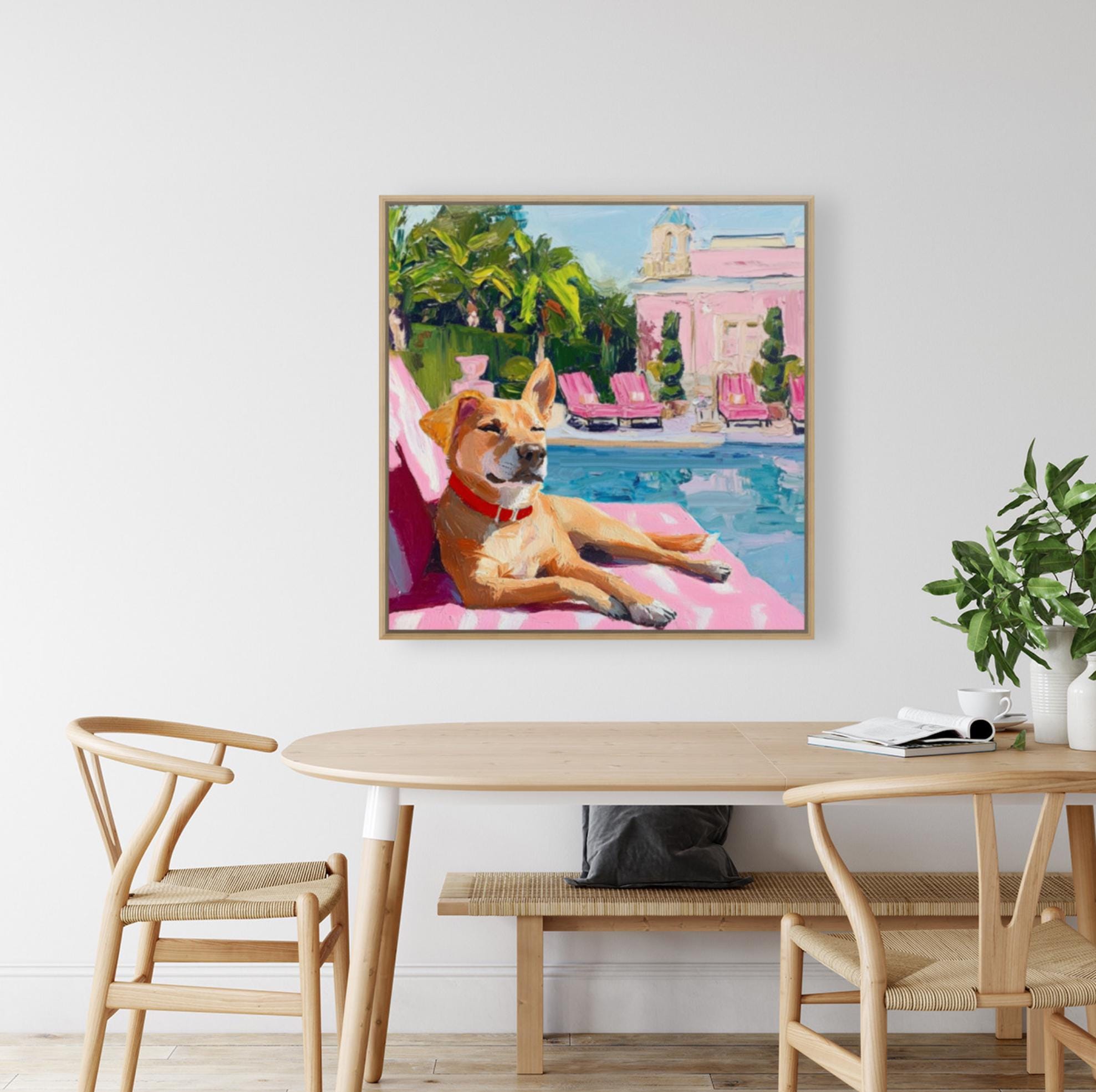Grandmillennial art, Doggy near the swimming pool, whimsical fine art