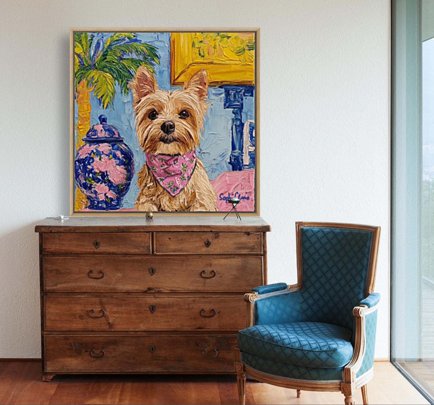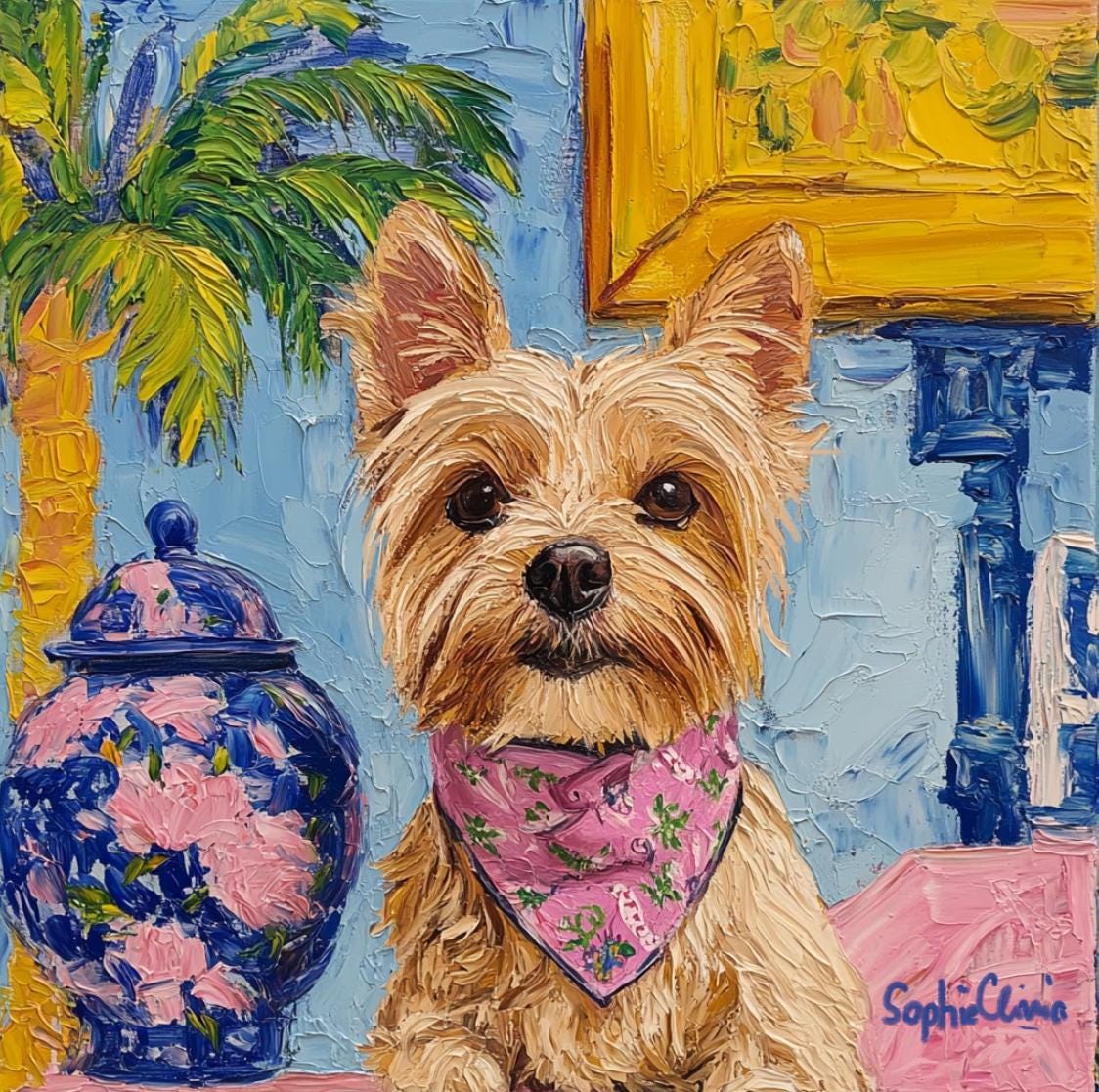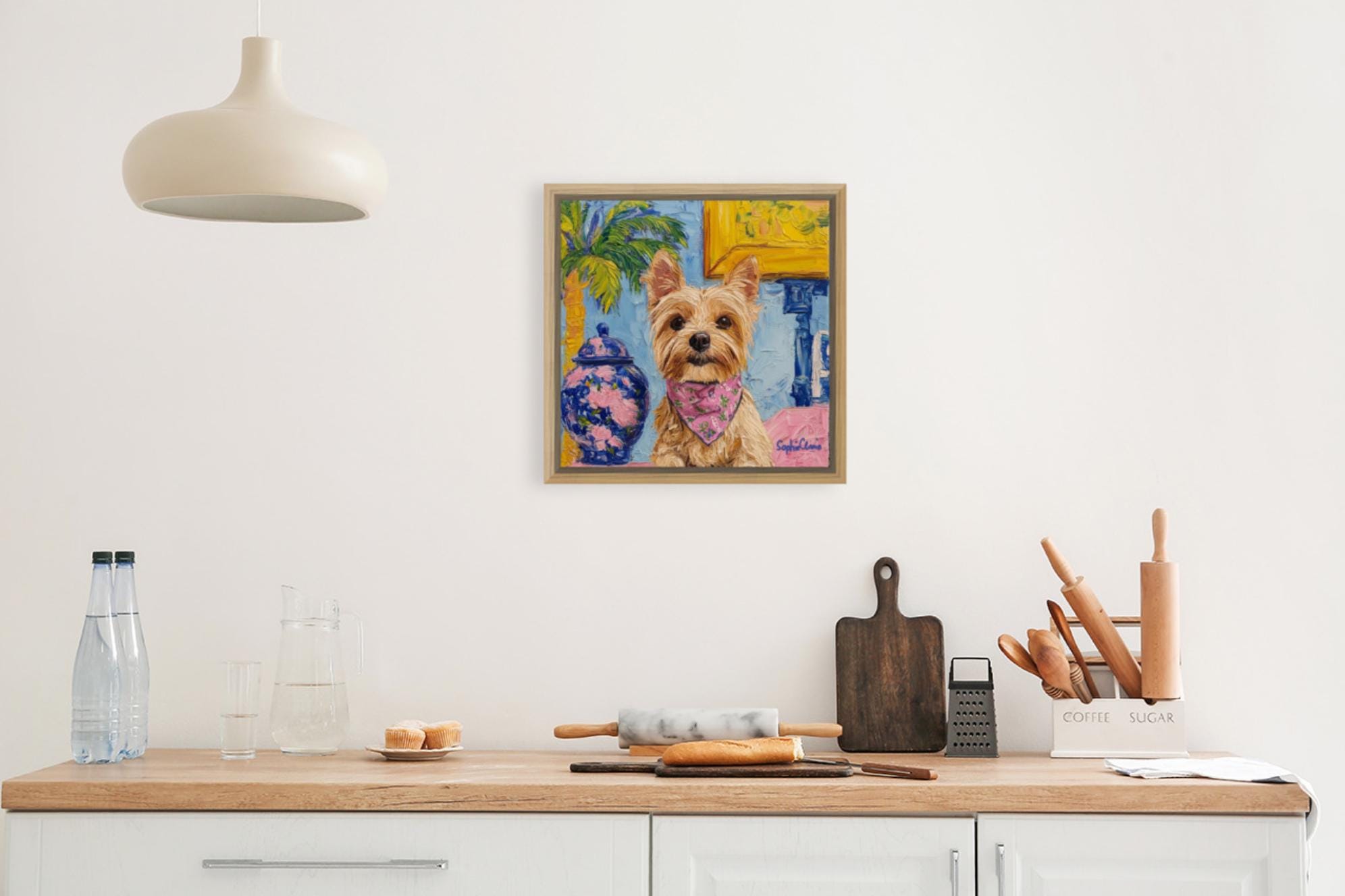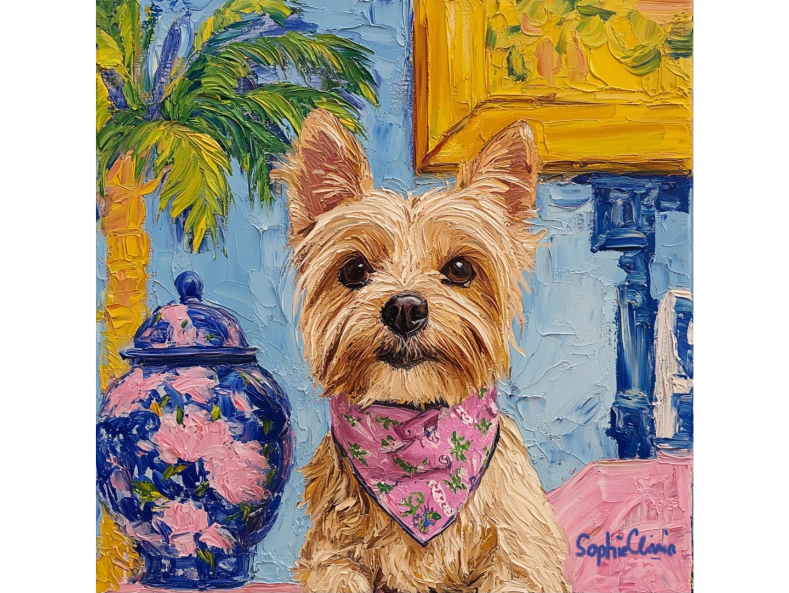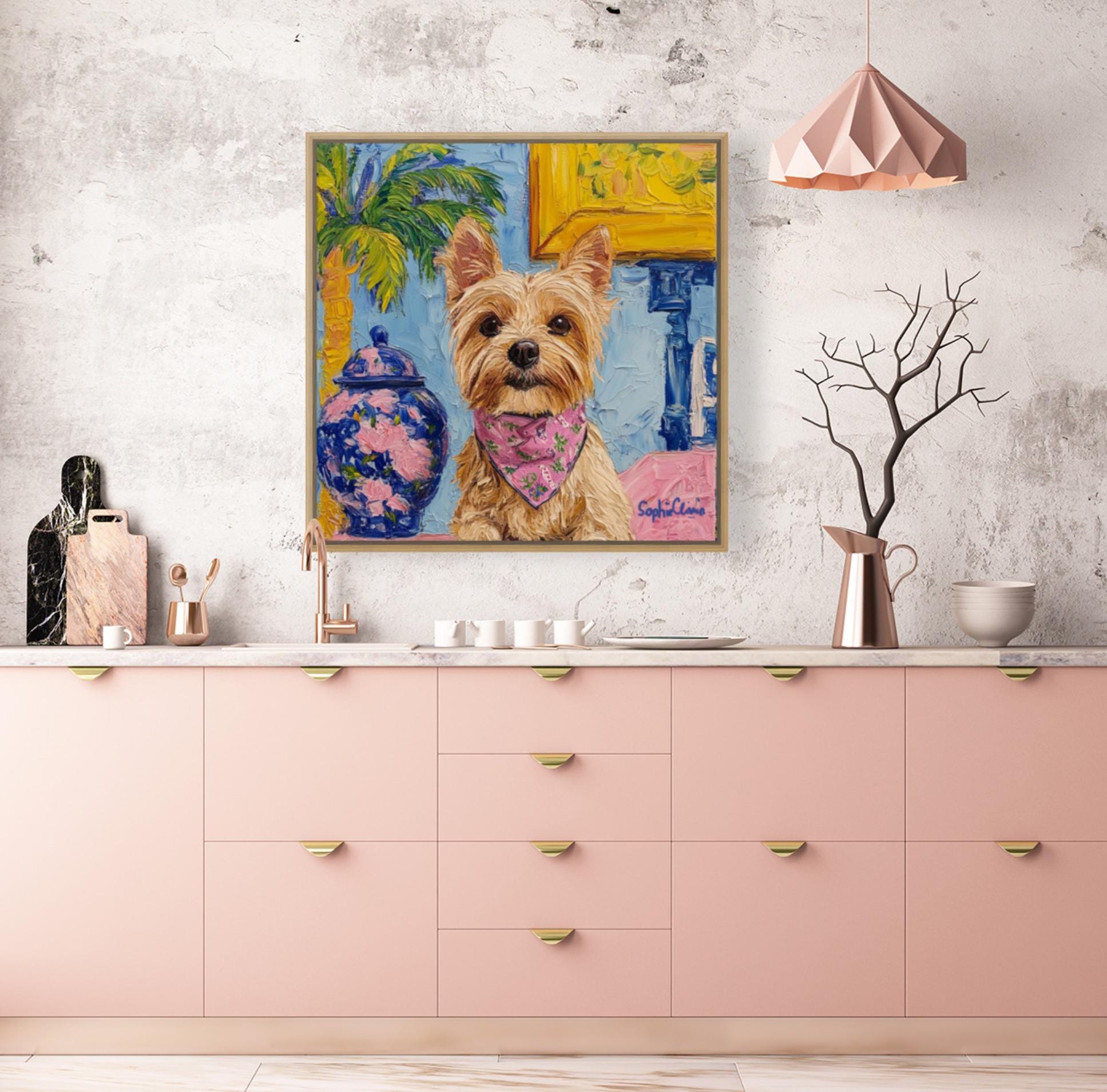 Grandmillennial art, Terrier in Pink Bandana, fine art dog print