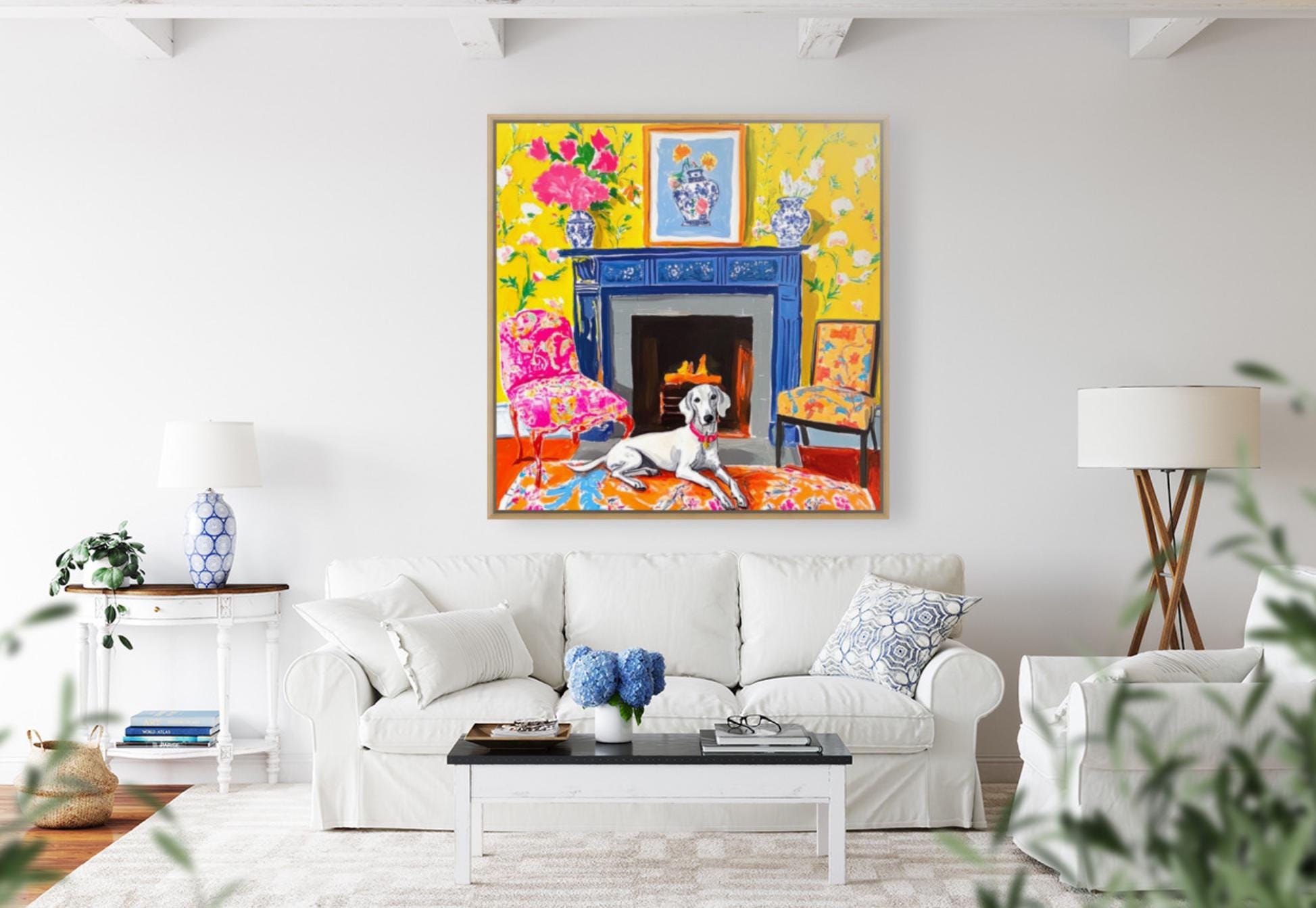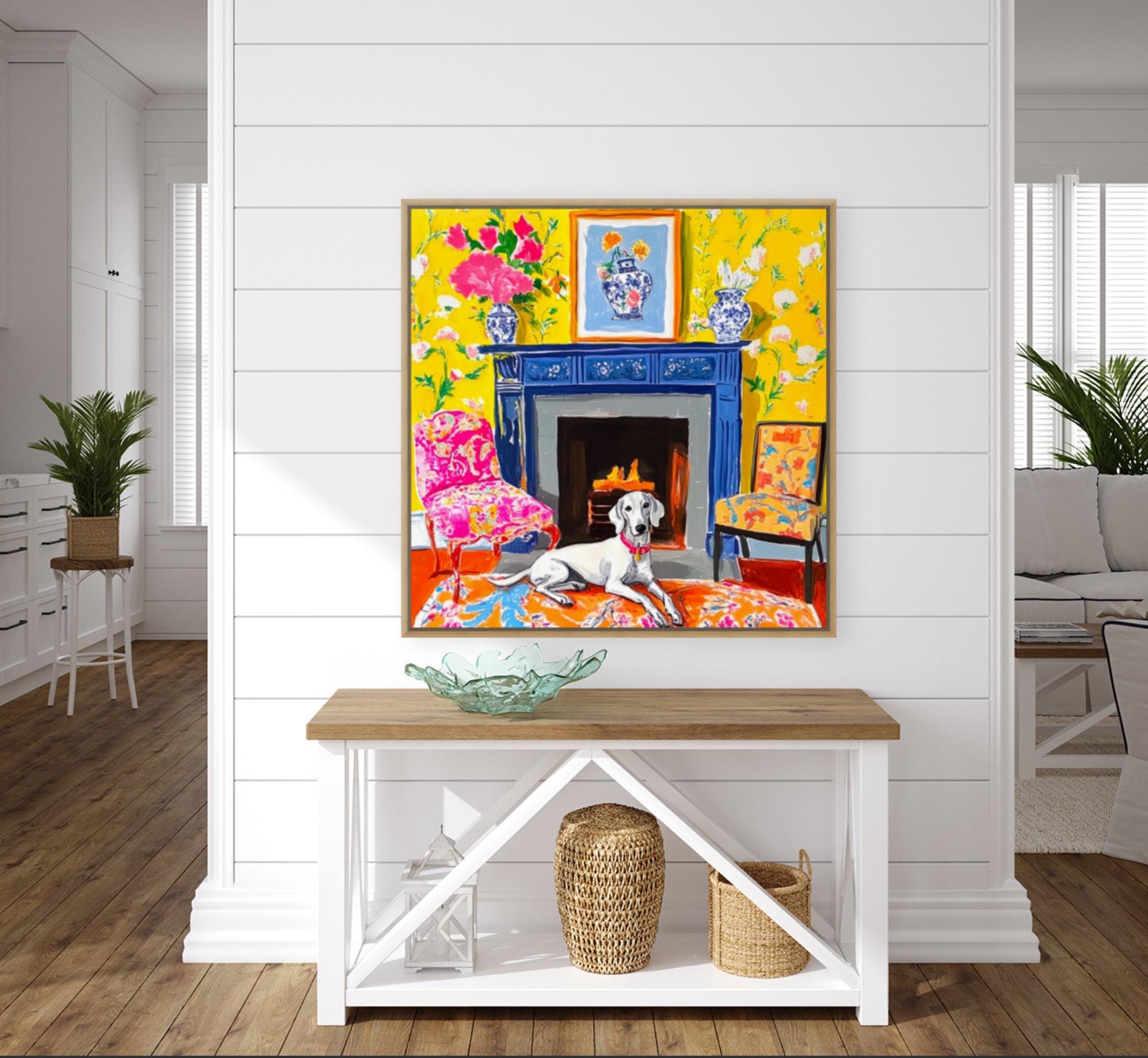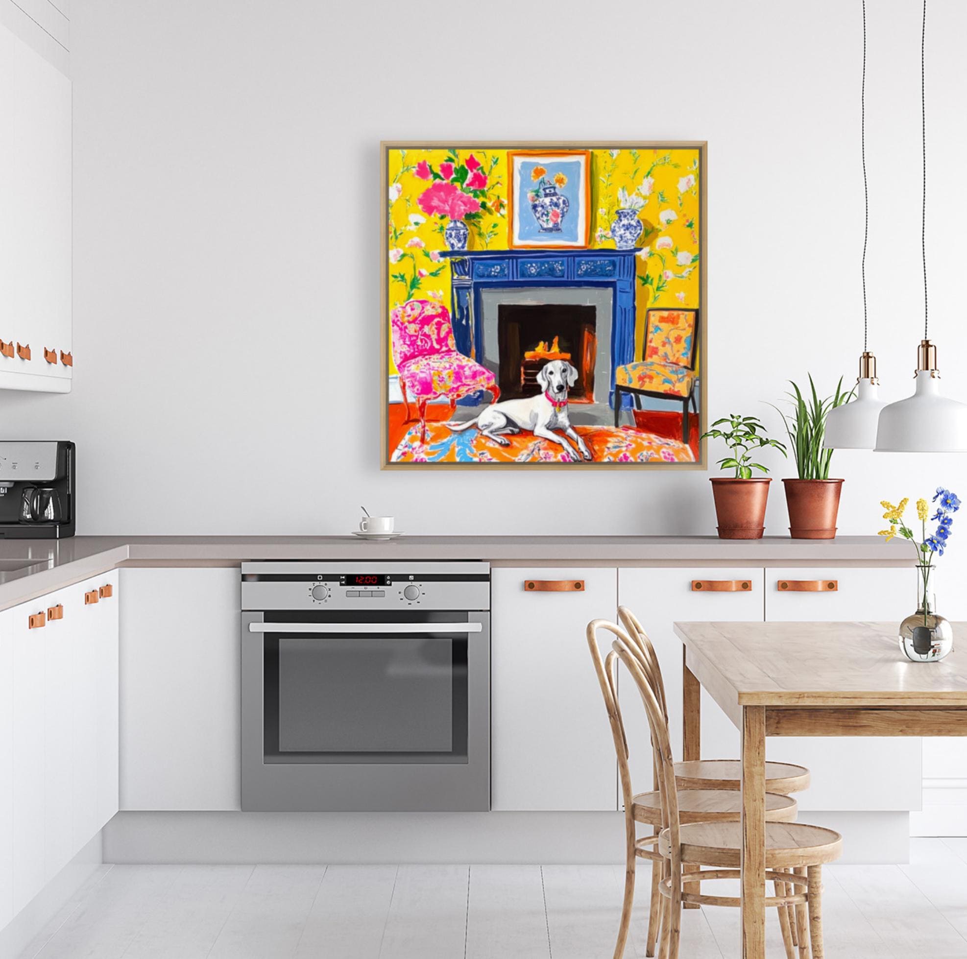 Grandmillennial art, Lurcher dog in preppy yellow interior, whimsical watercolor painting