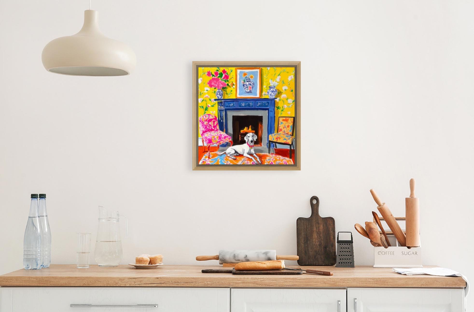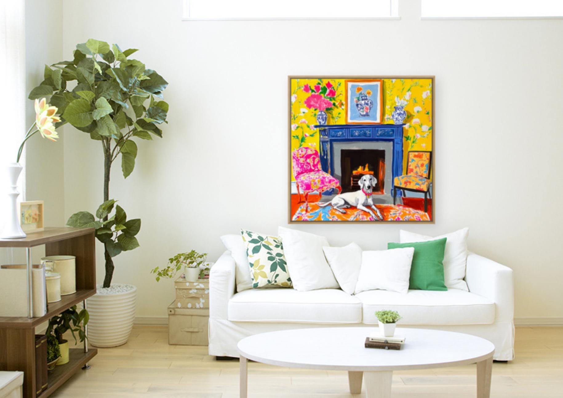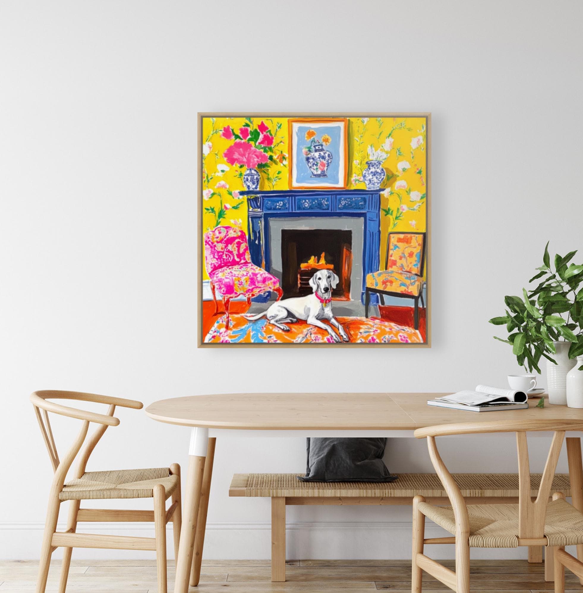 Grandmillennial art, Lurcher dog in preppy yellow interior, whimsical watercolor painting