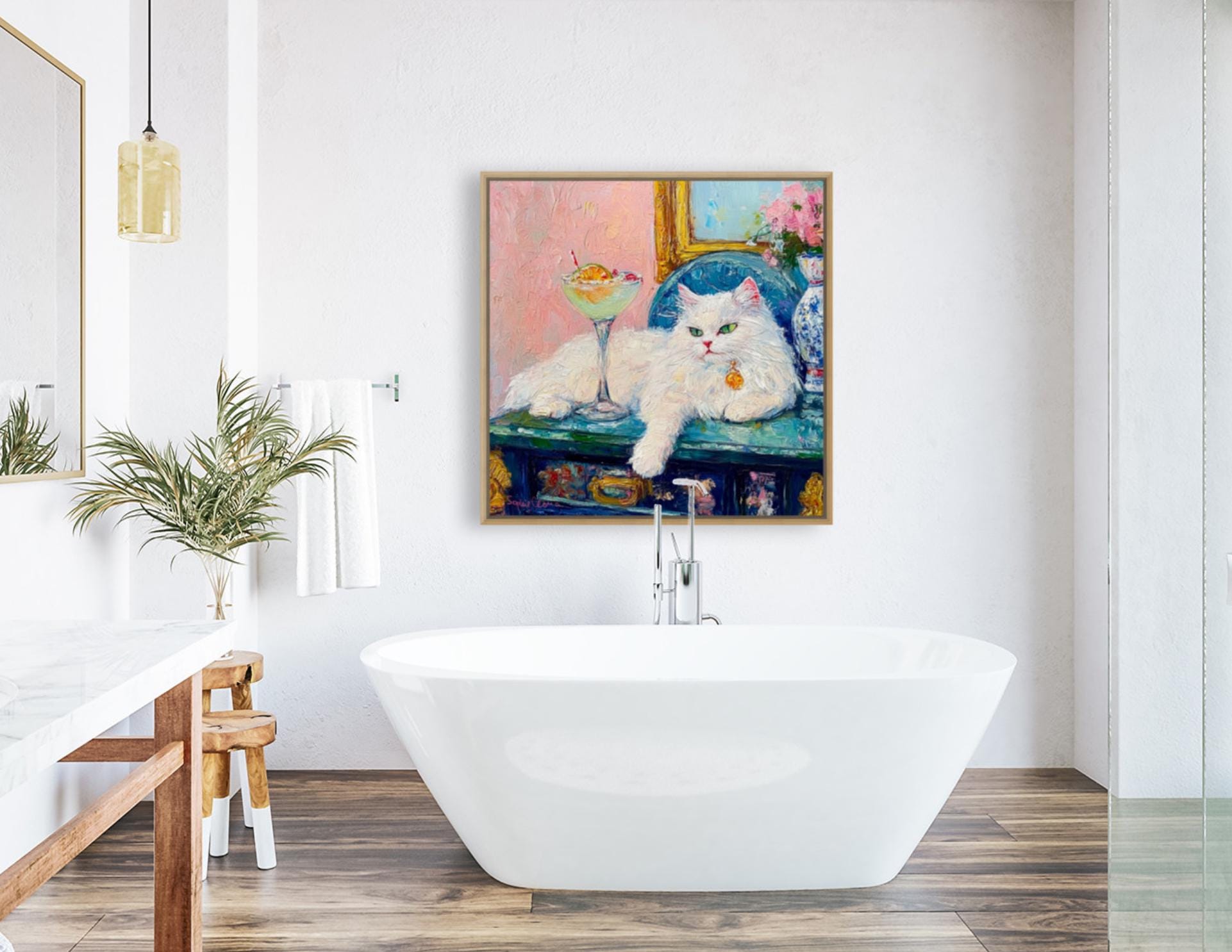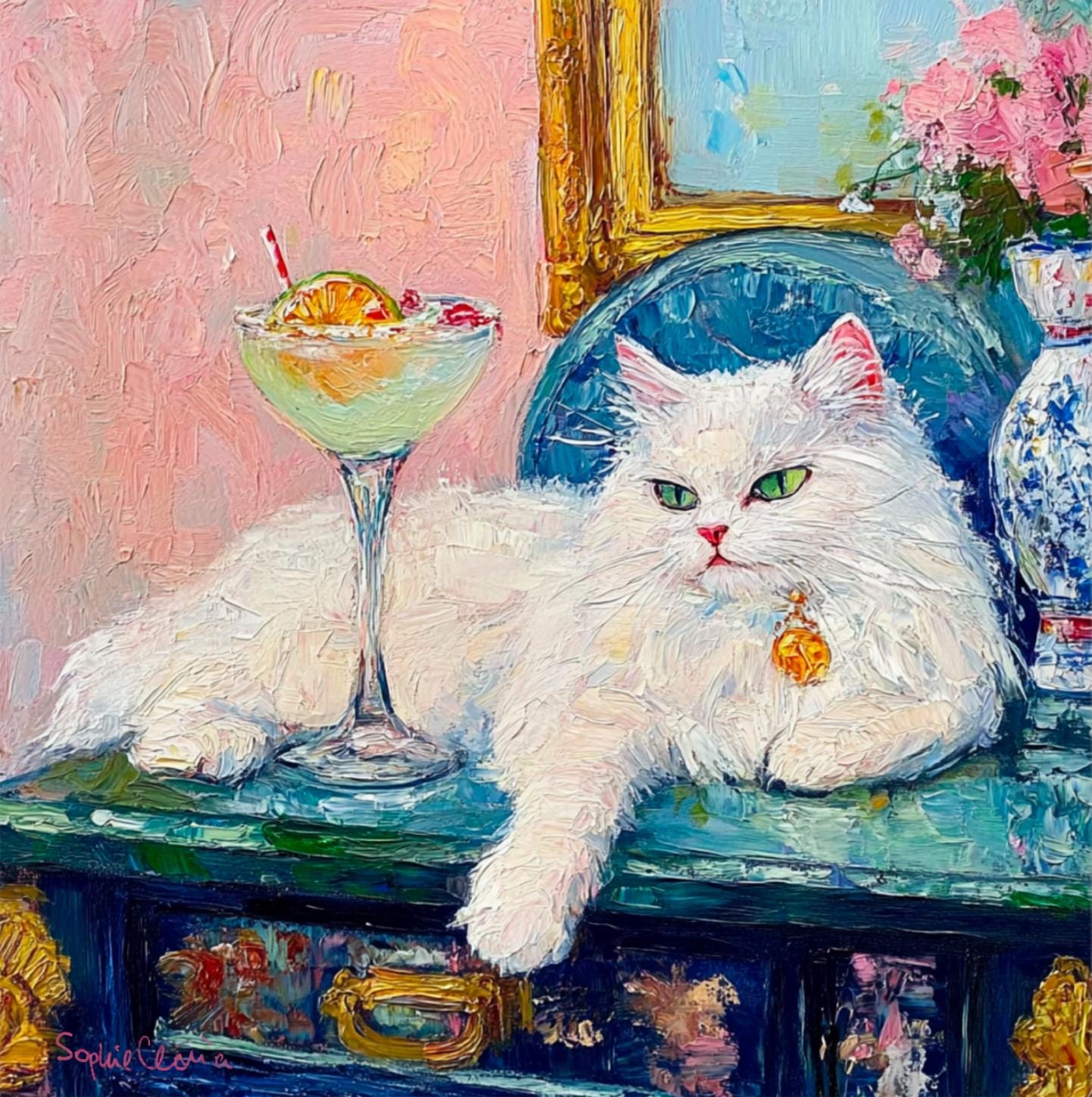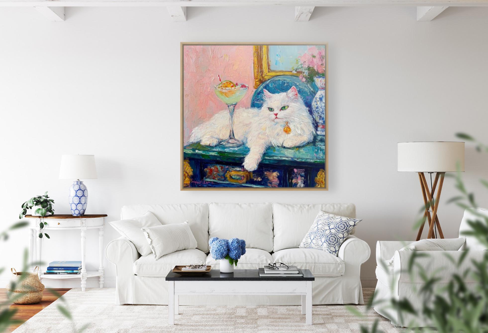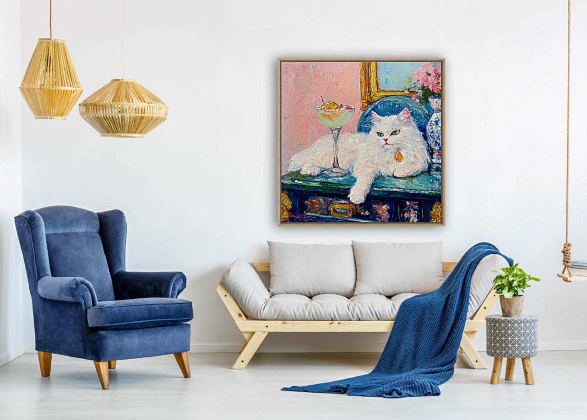 Grandmillennial art, A Glass of Catnip, whimsical cat art