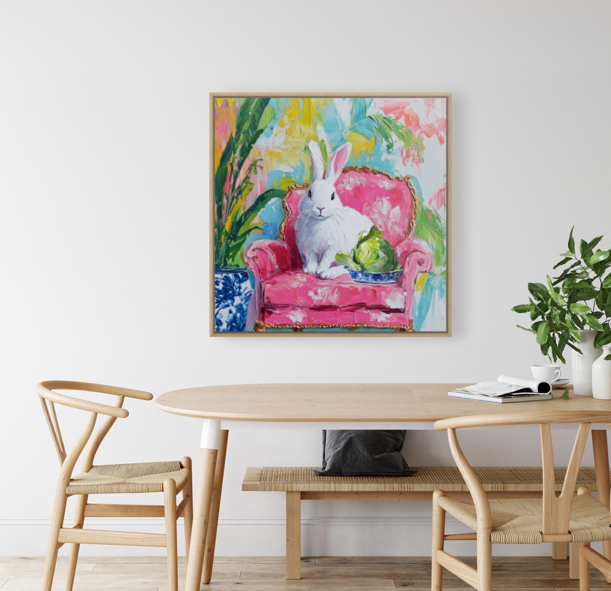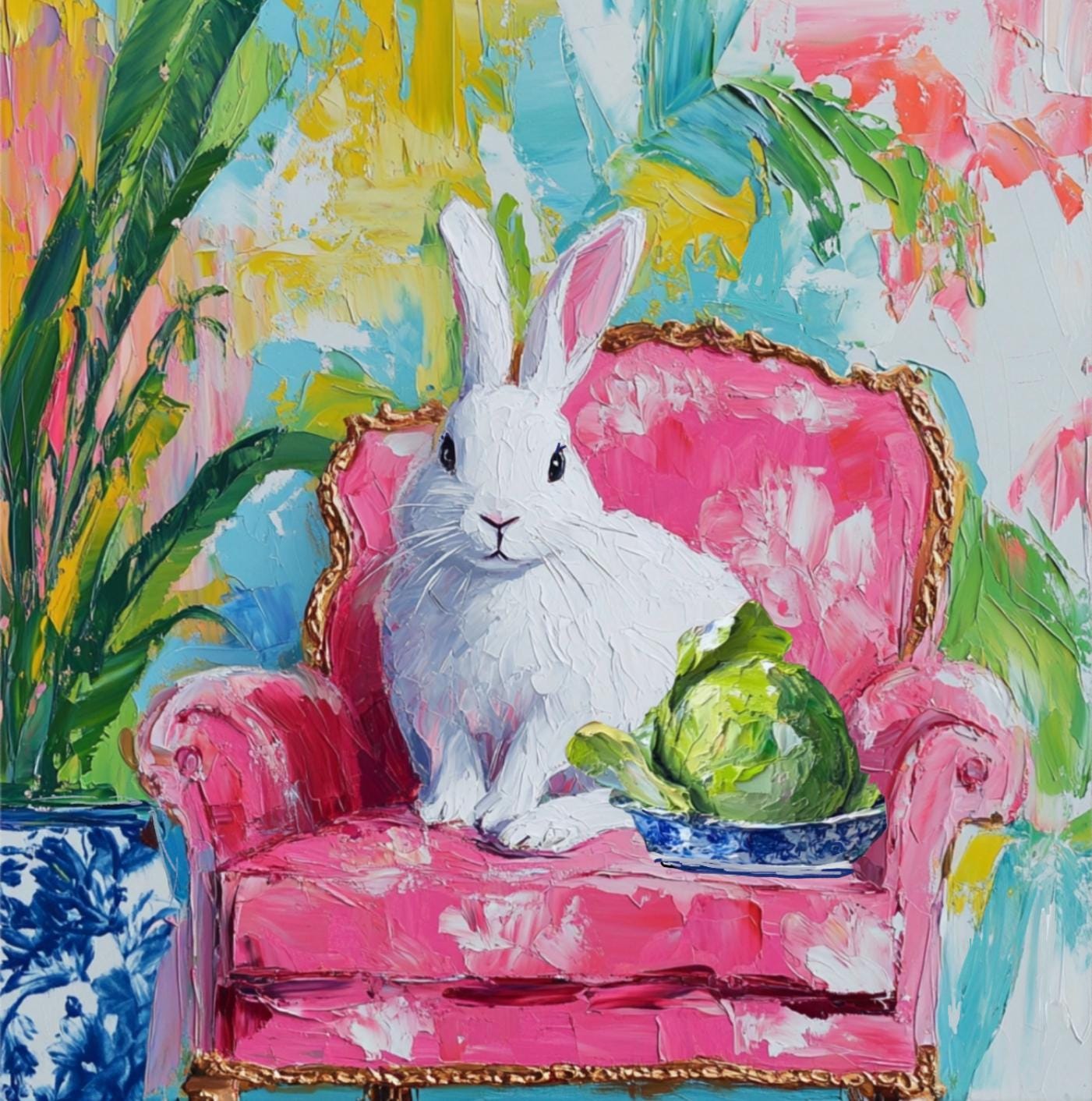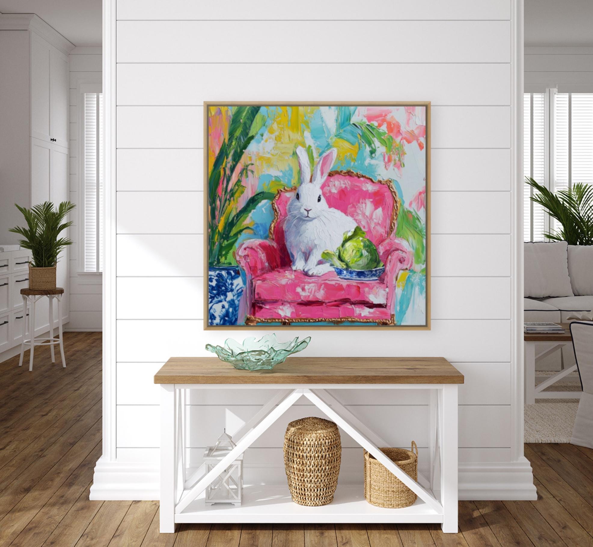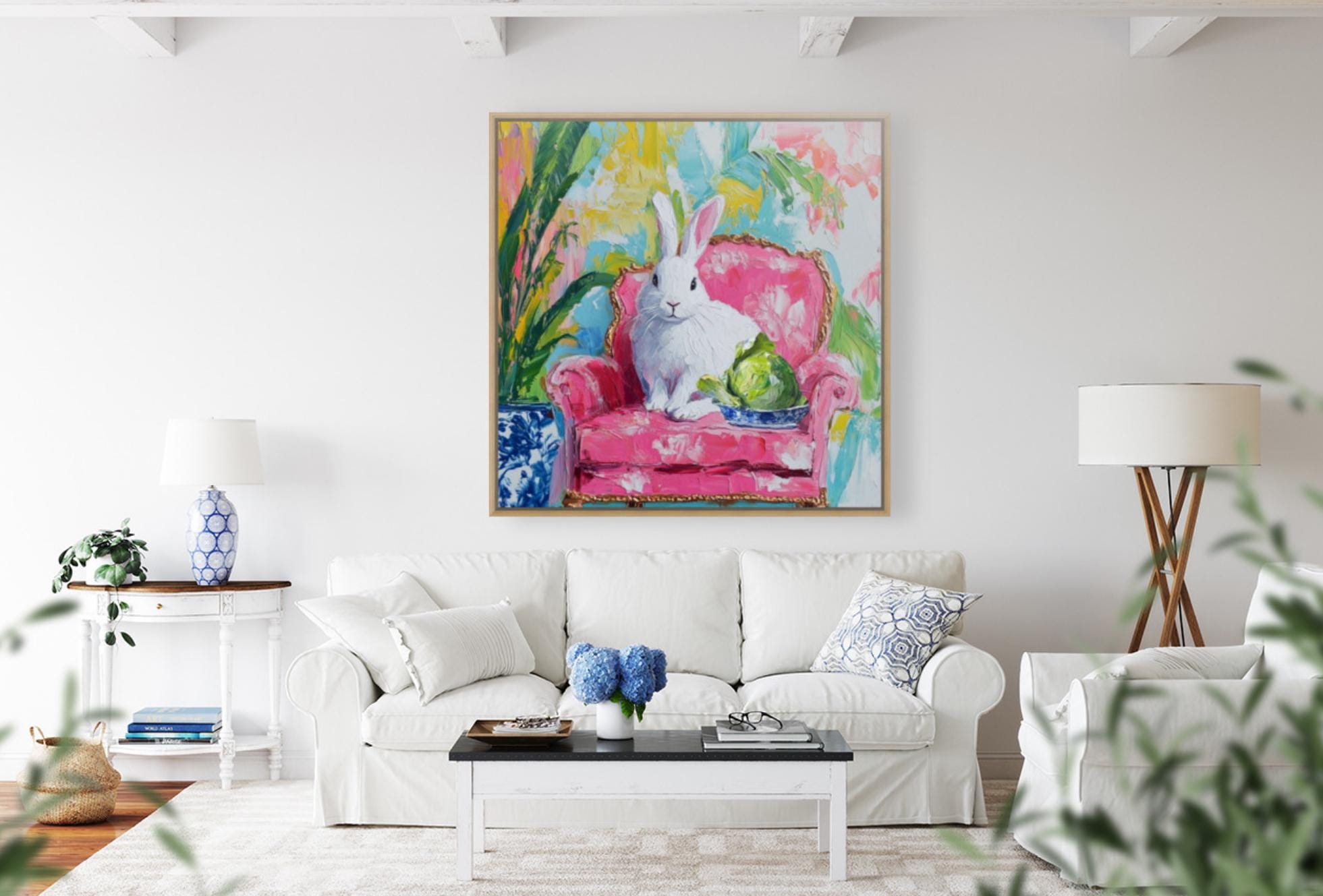 Grandmillennial art, Bunny on a pink chair, whimsical fine art