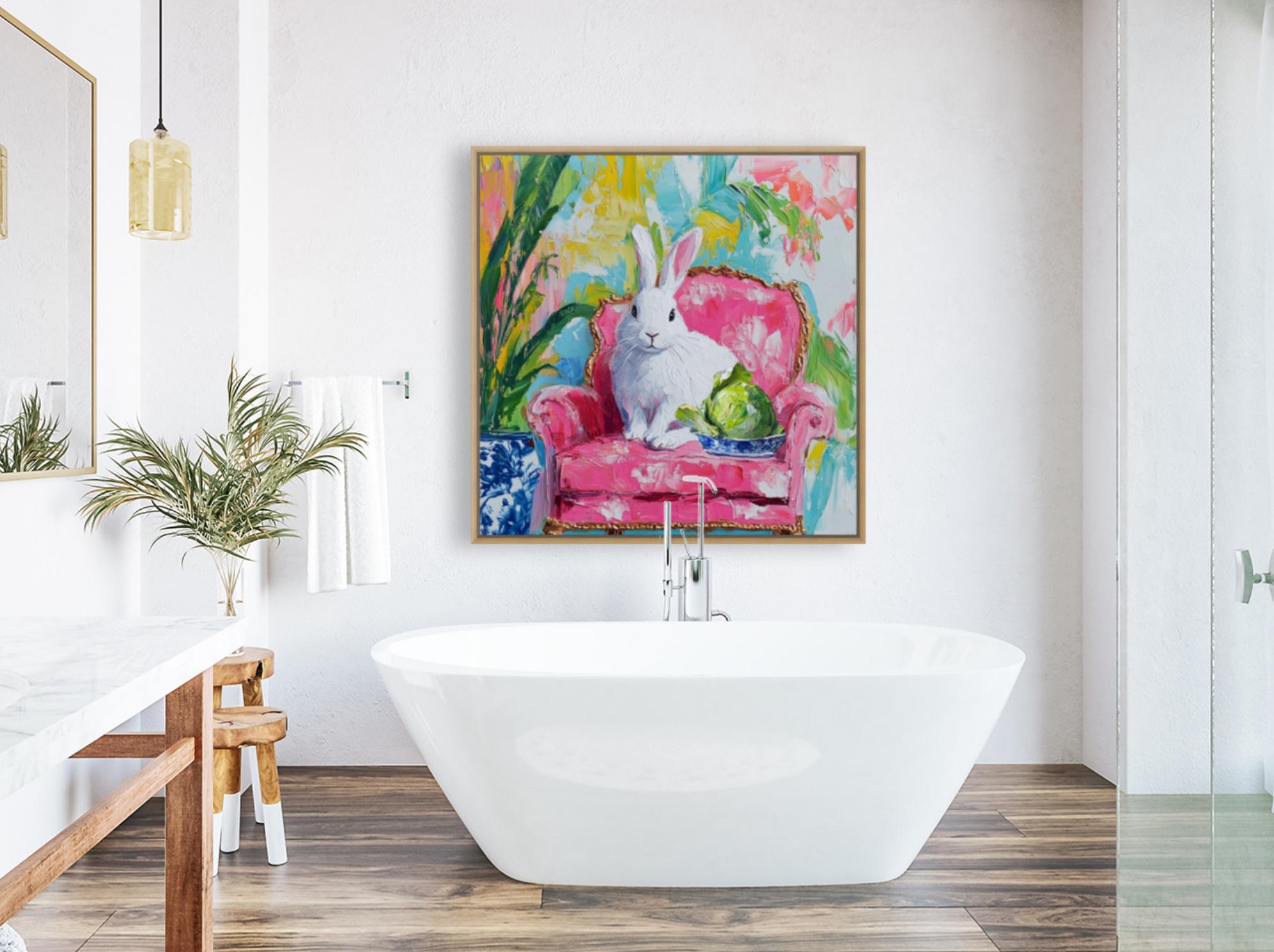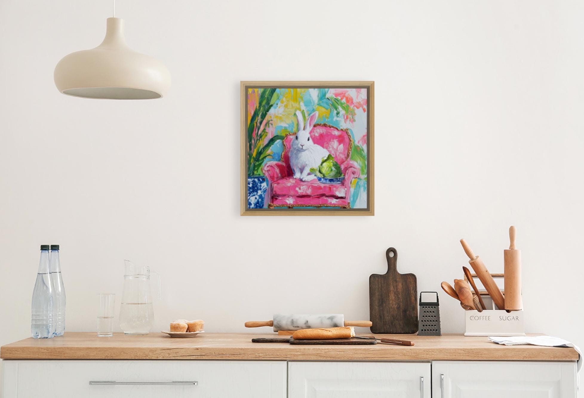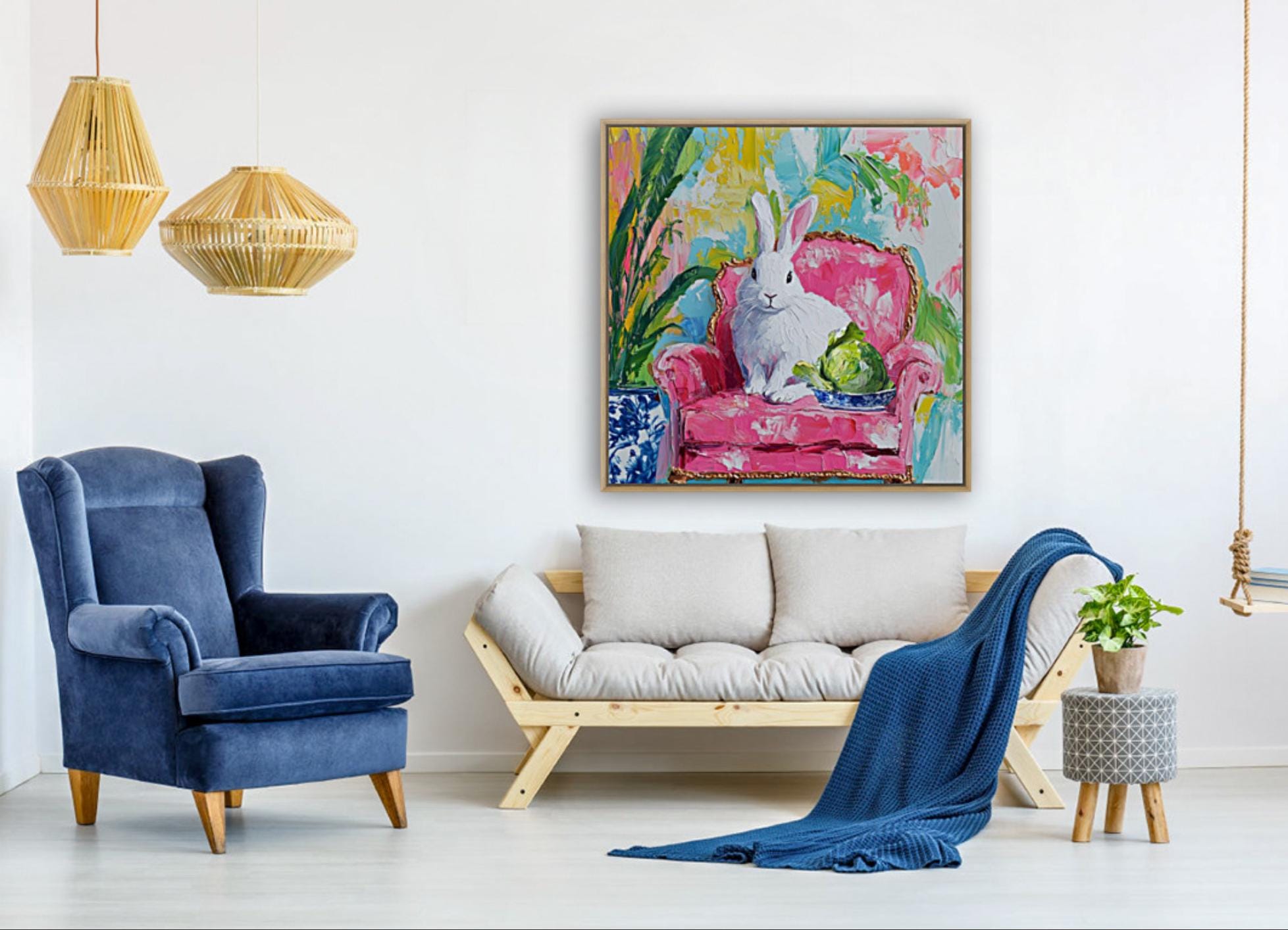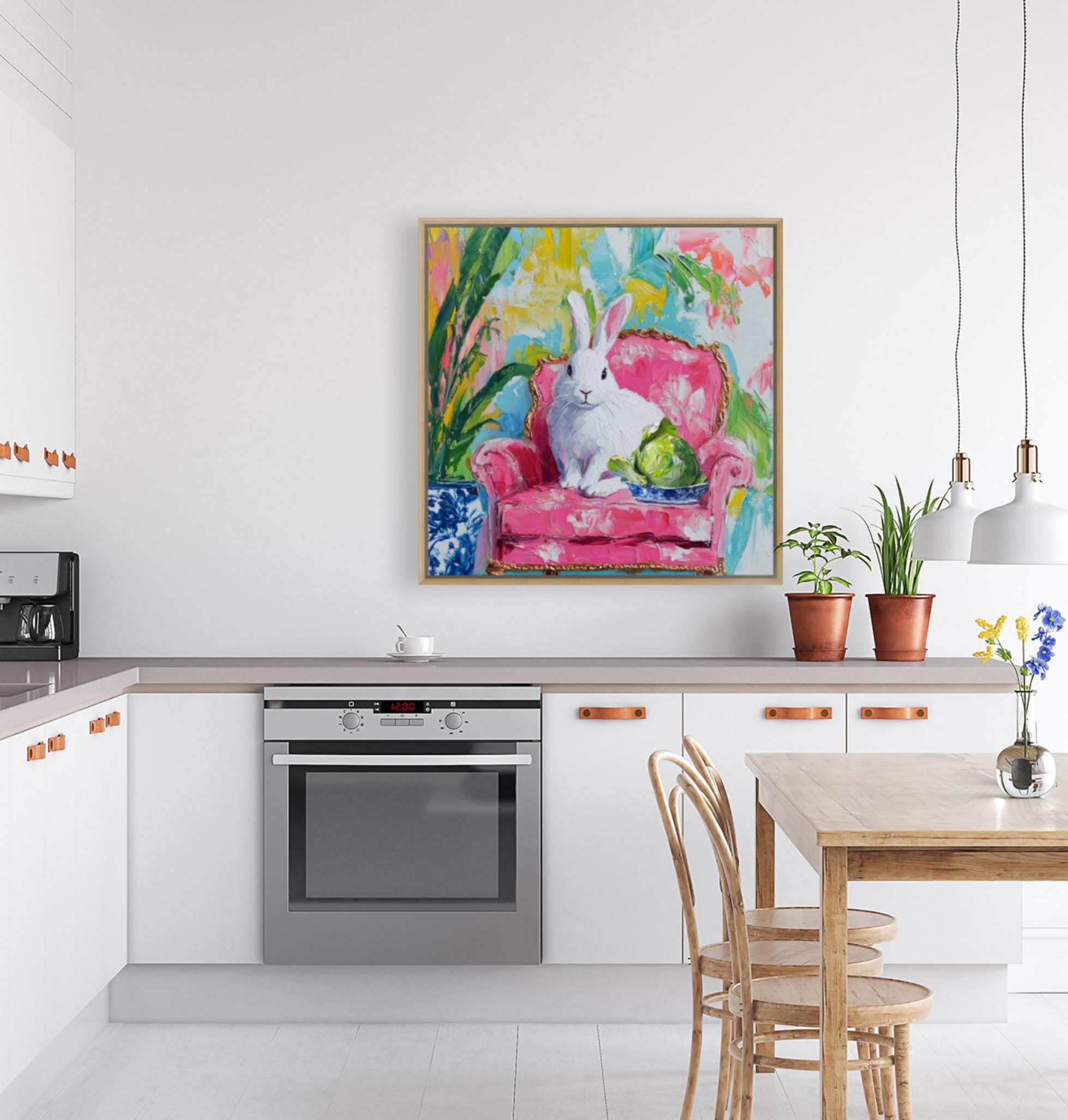 Grandmillennial art, Bunny on a pink chair, whimsical fine art