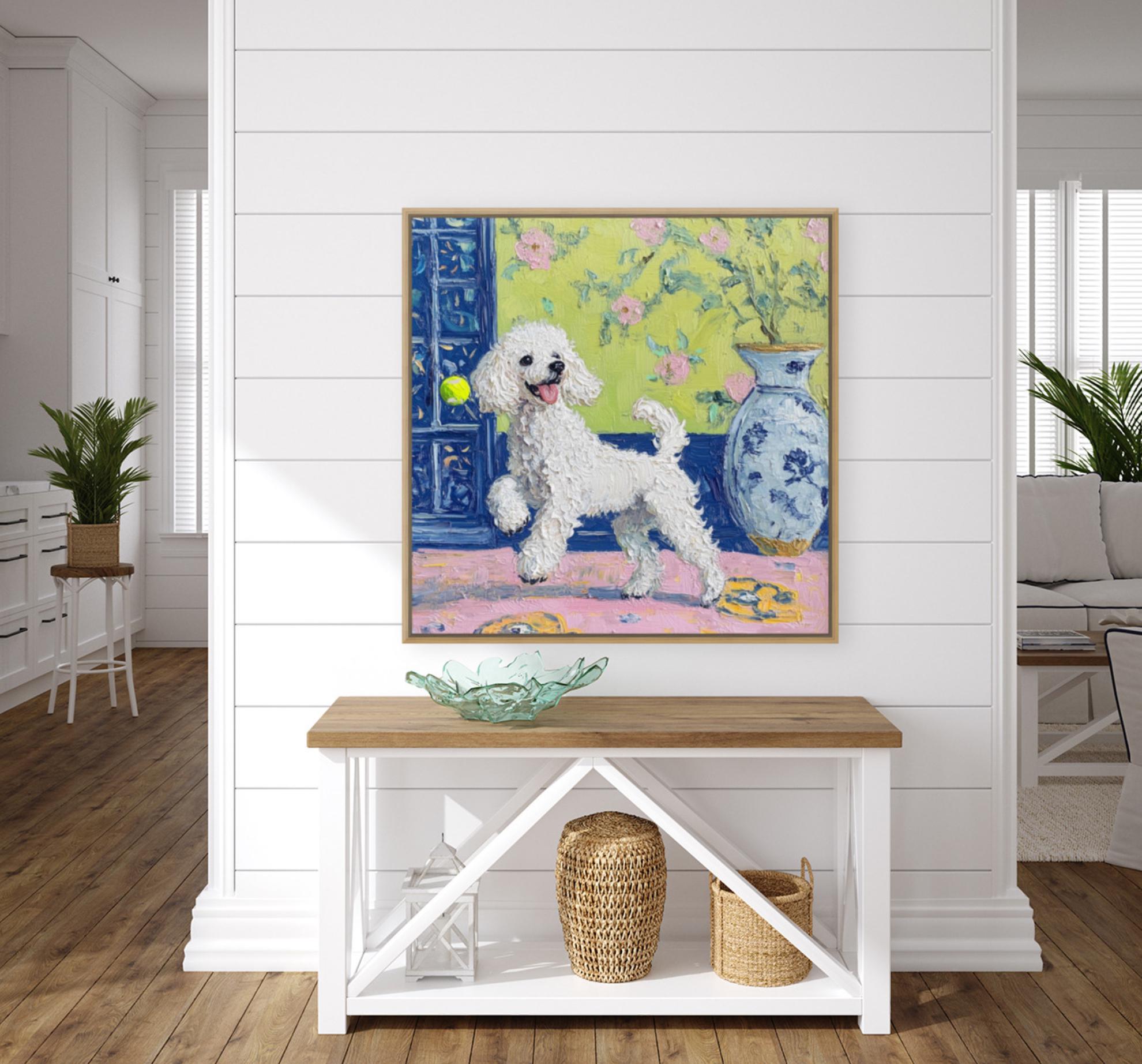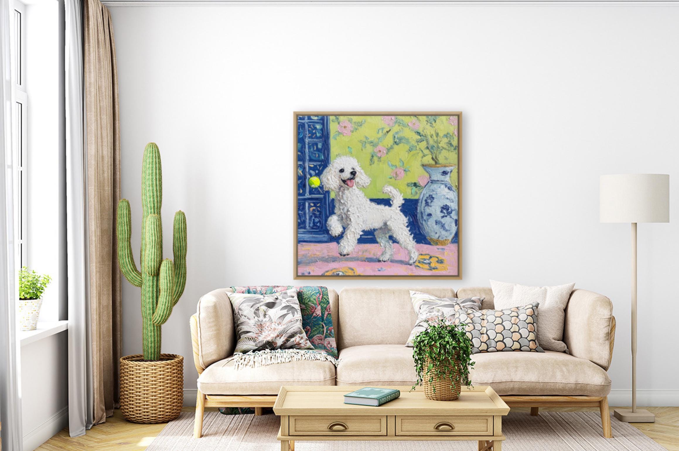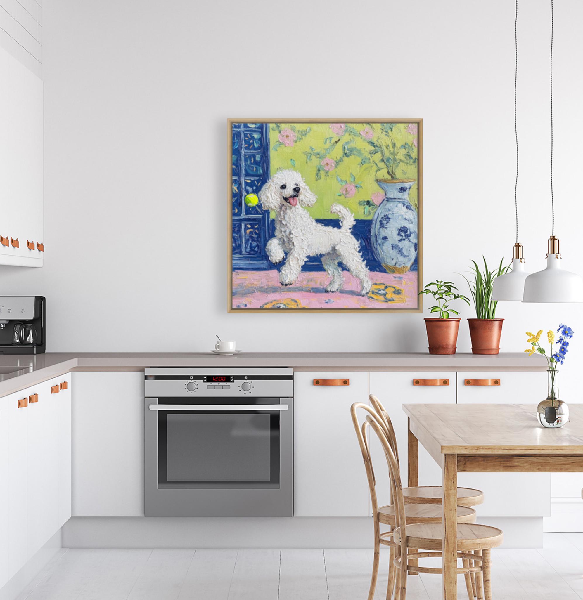 Grandmillennial art, Catching a ball, whimsical poodle art