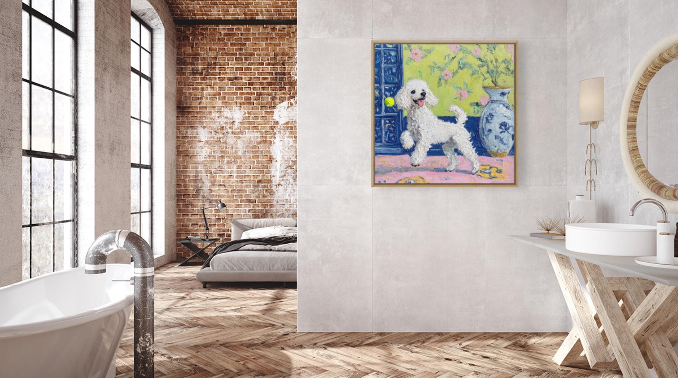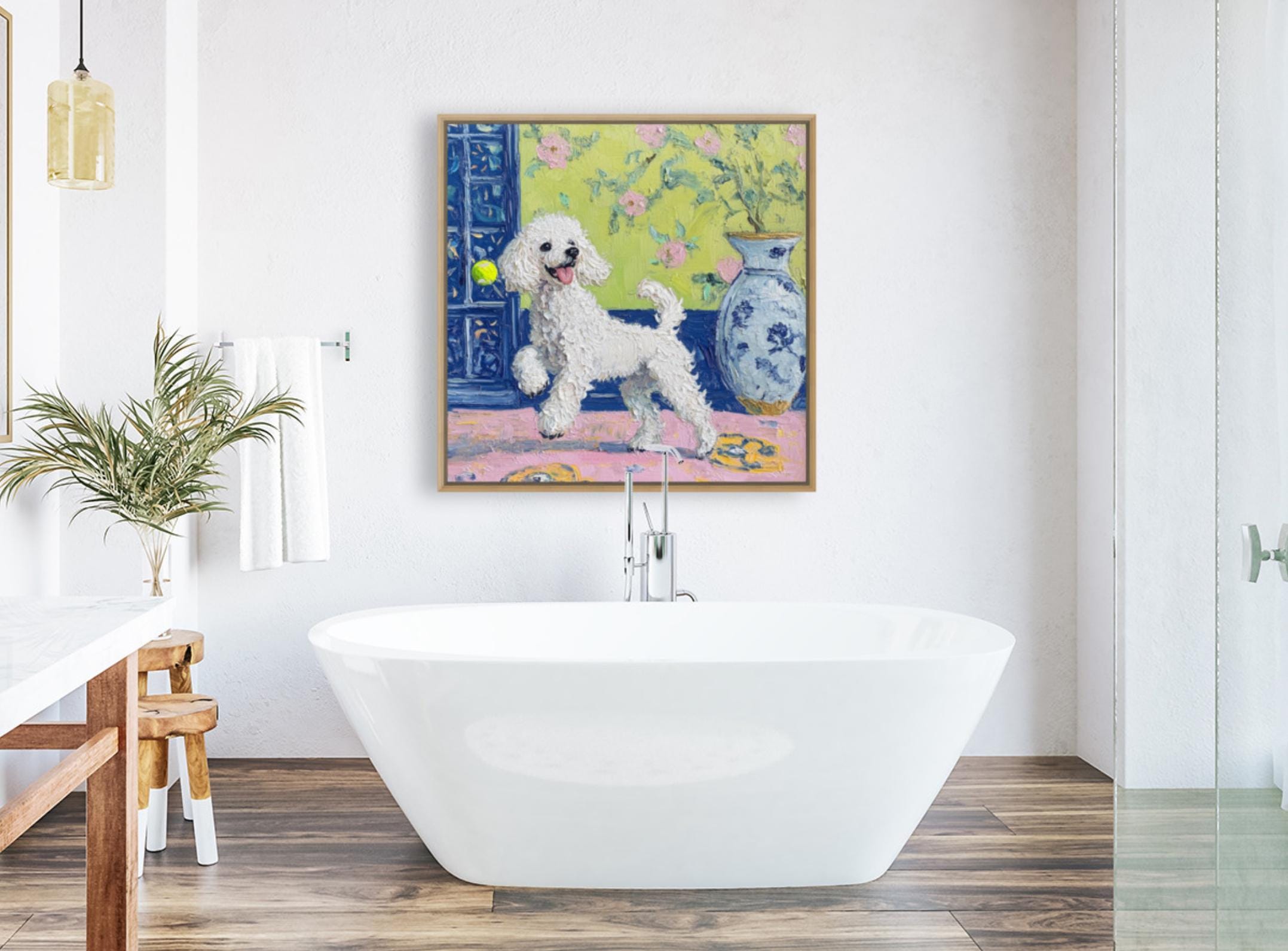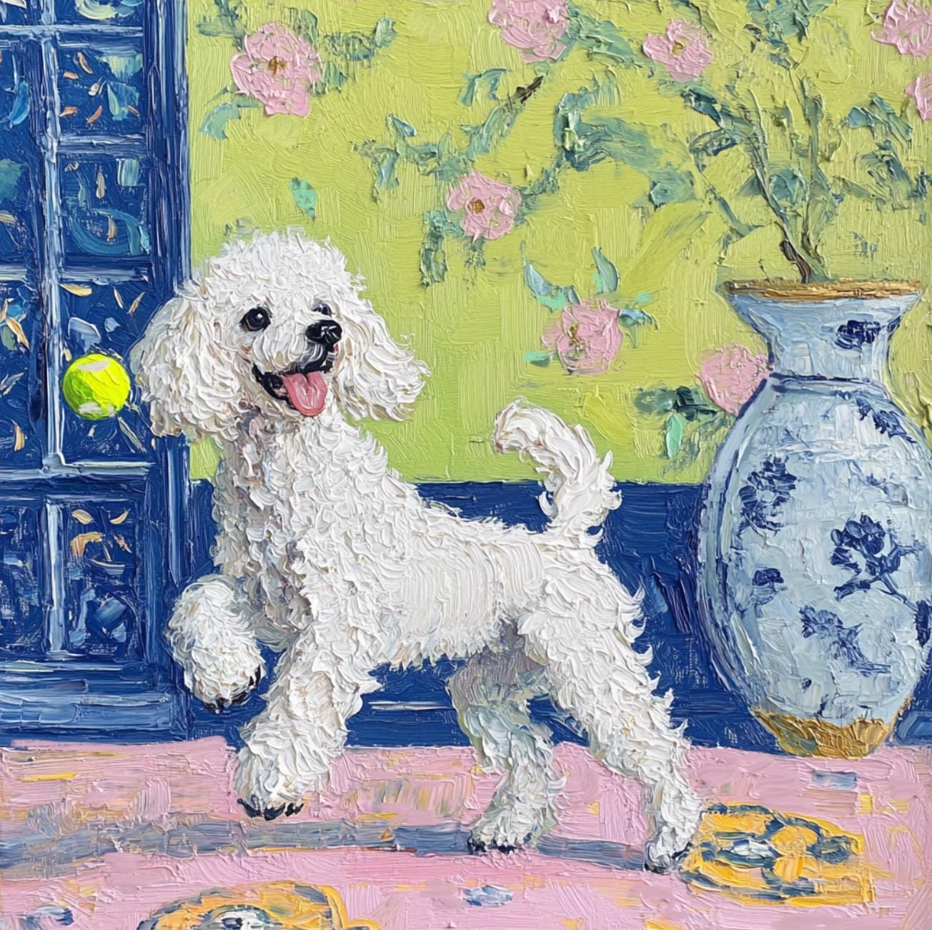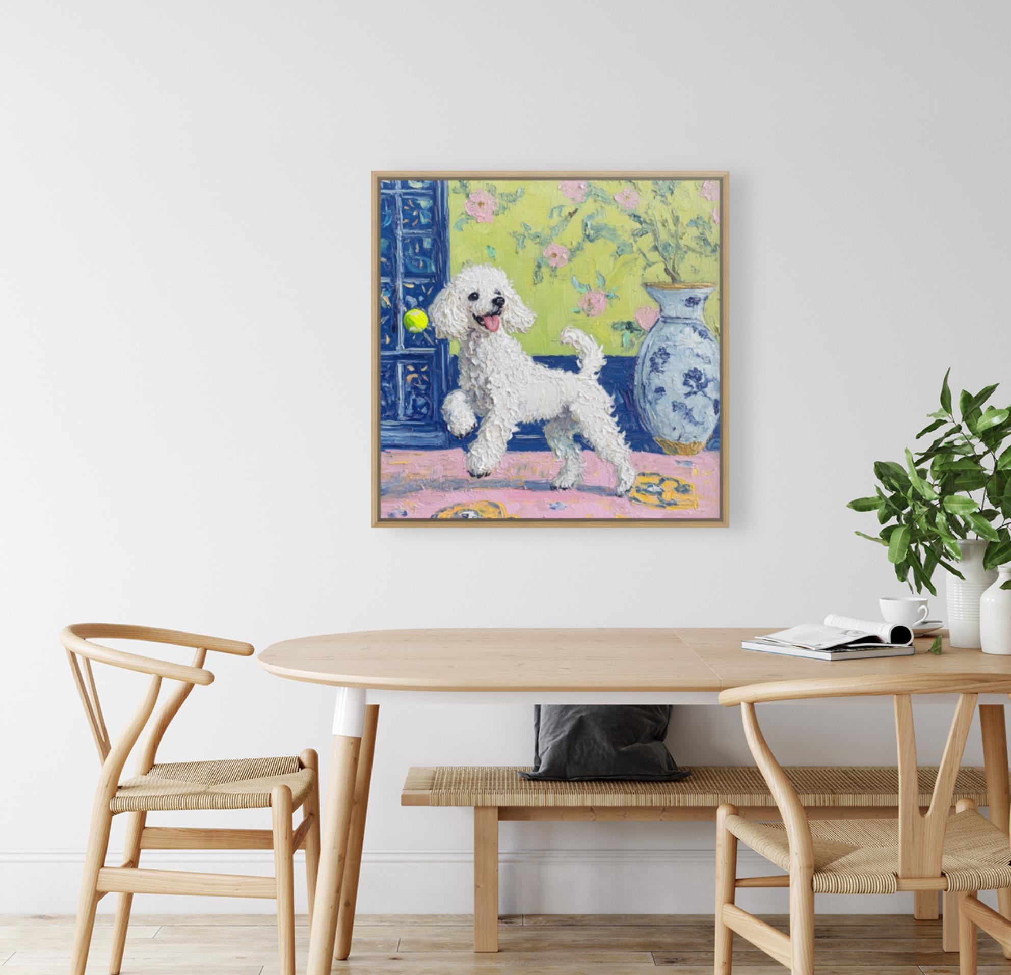 Grandmillennial art, Catching a ball, whimsical poodle art