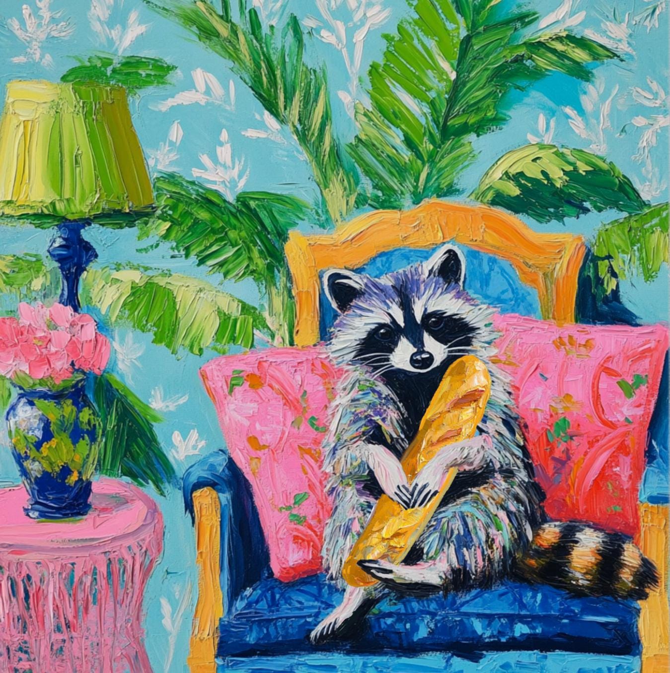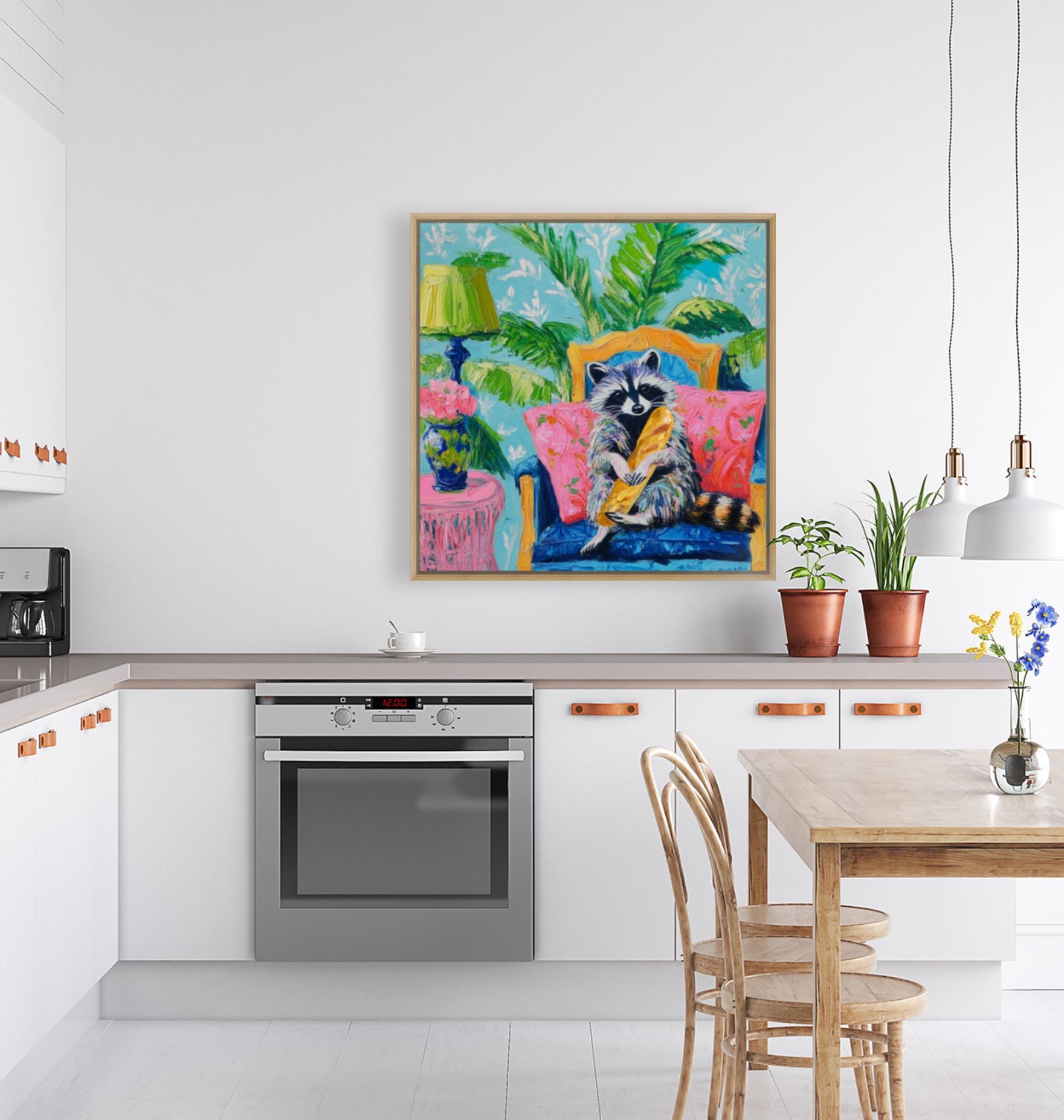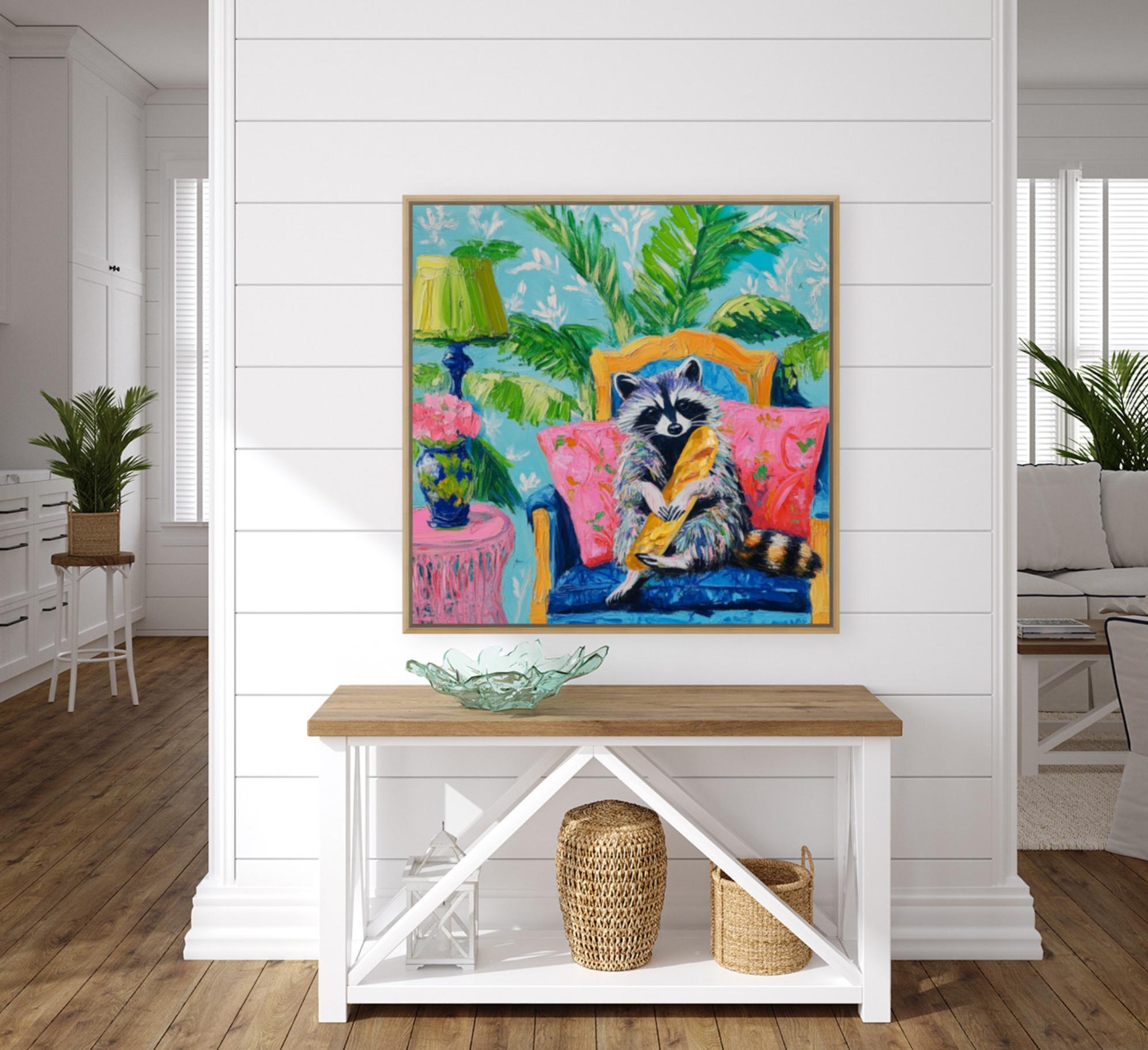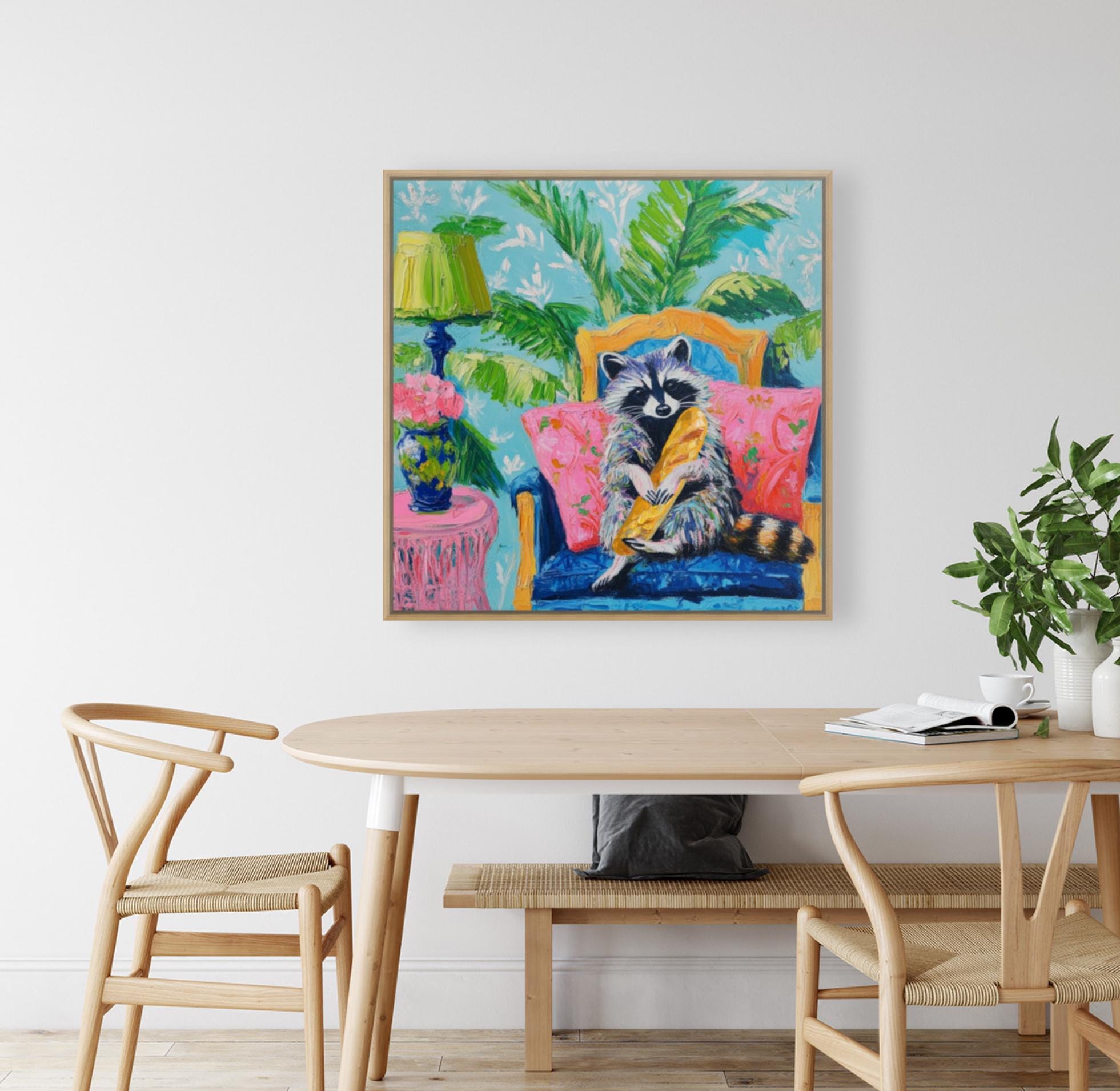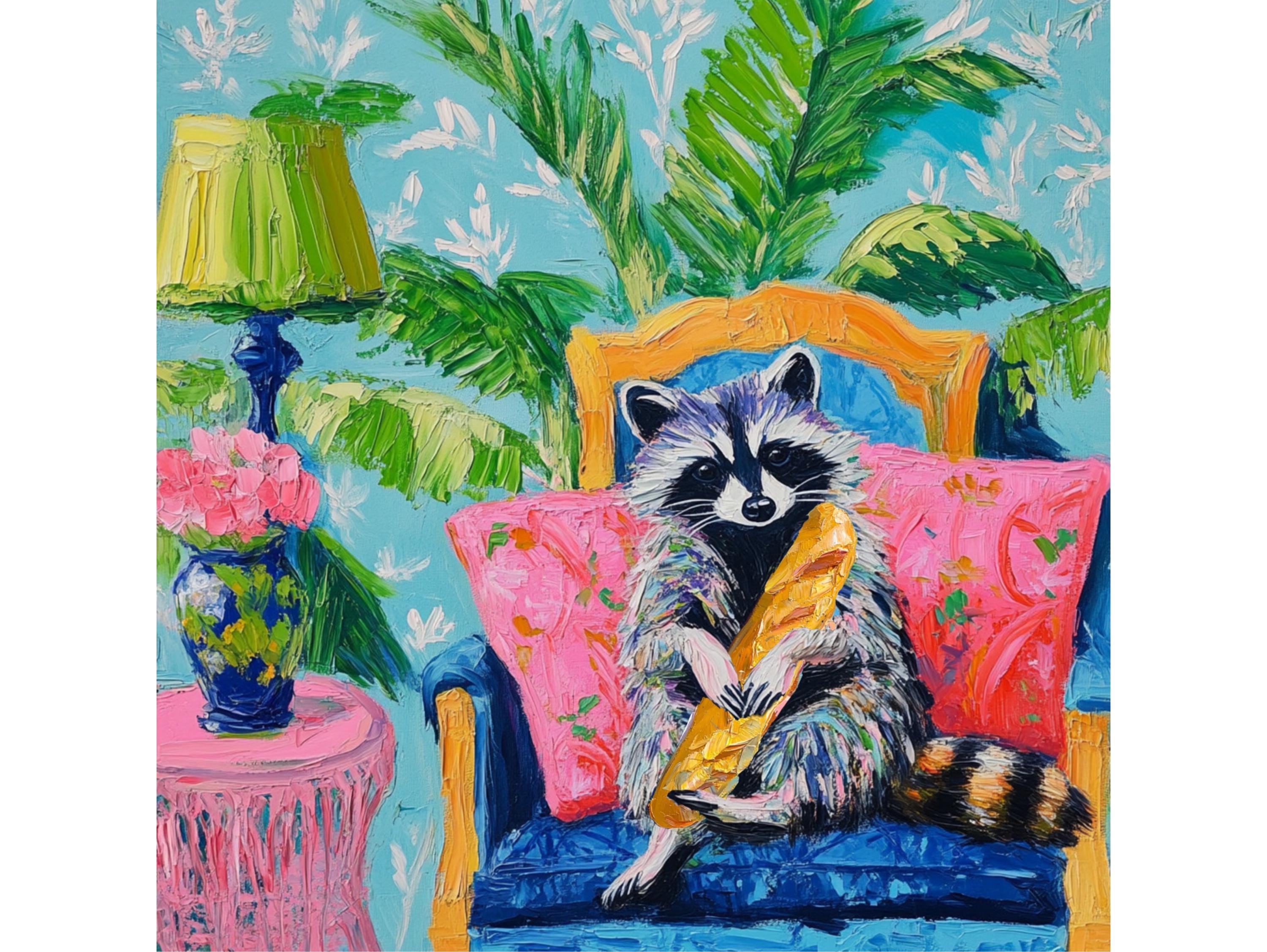 Grandmillennial art, Raccoon and the French Baguette, whimsical fine art
