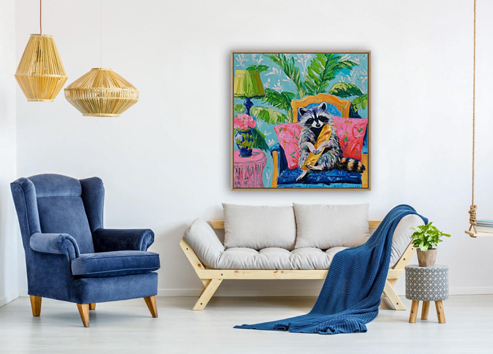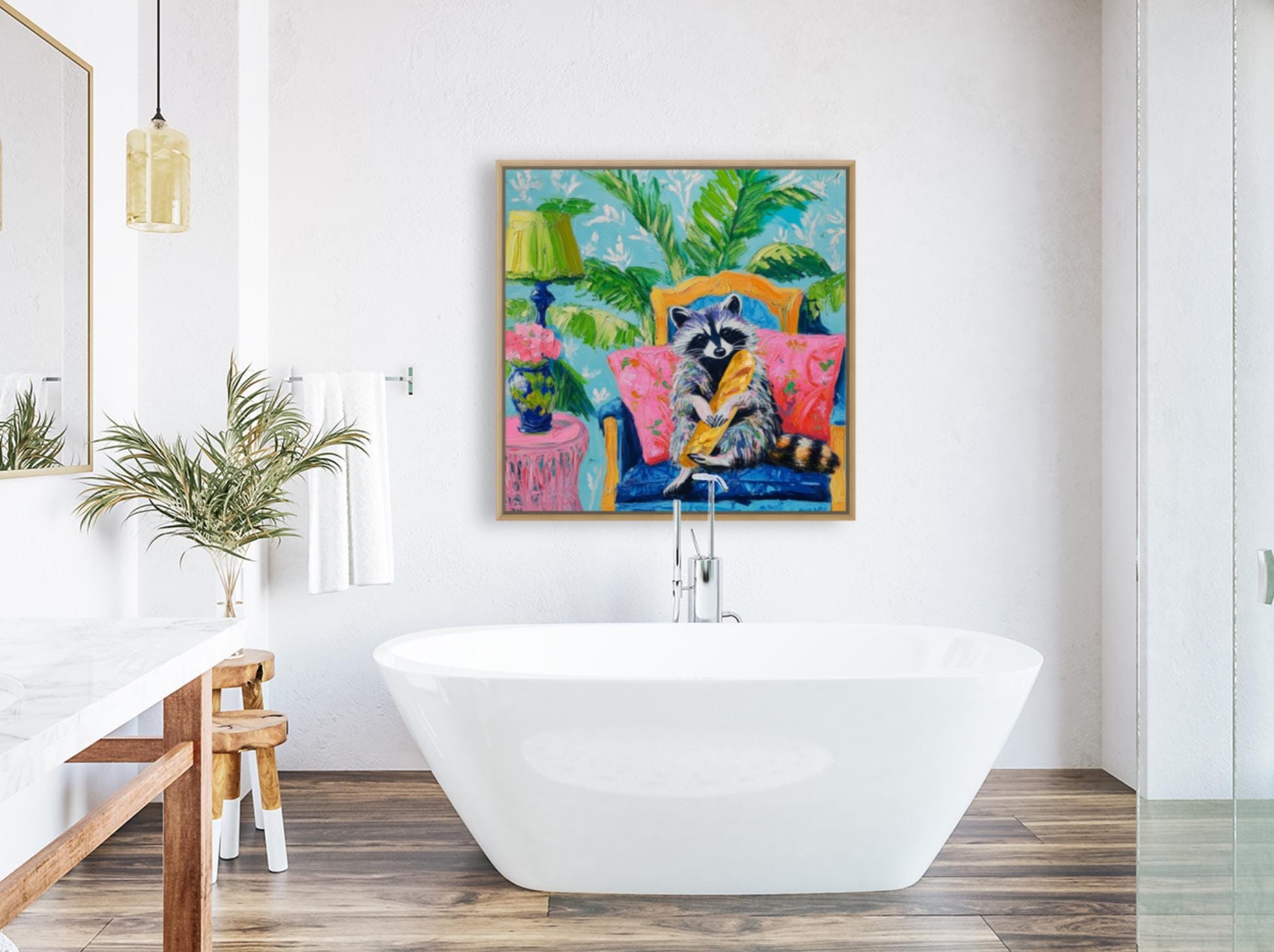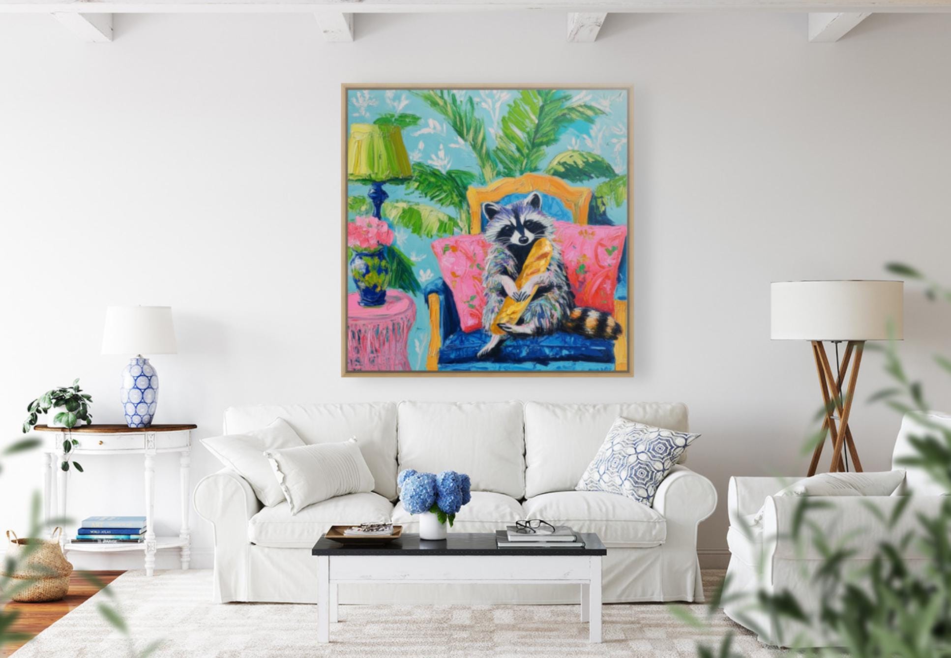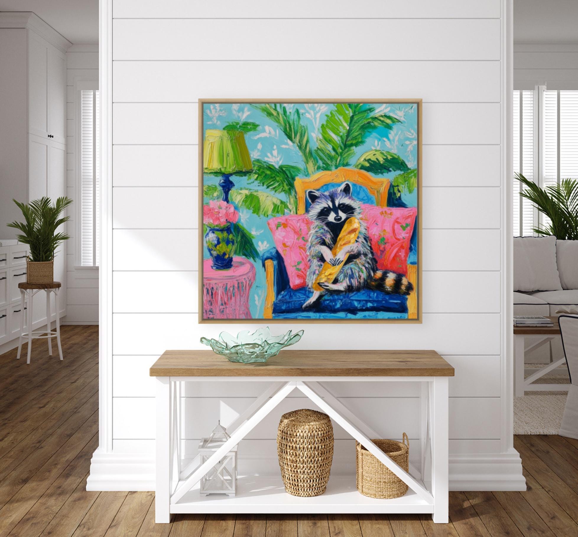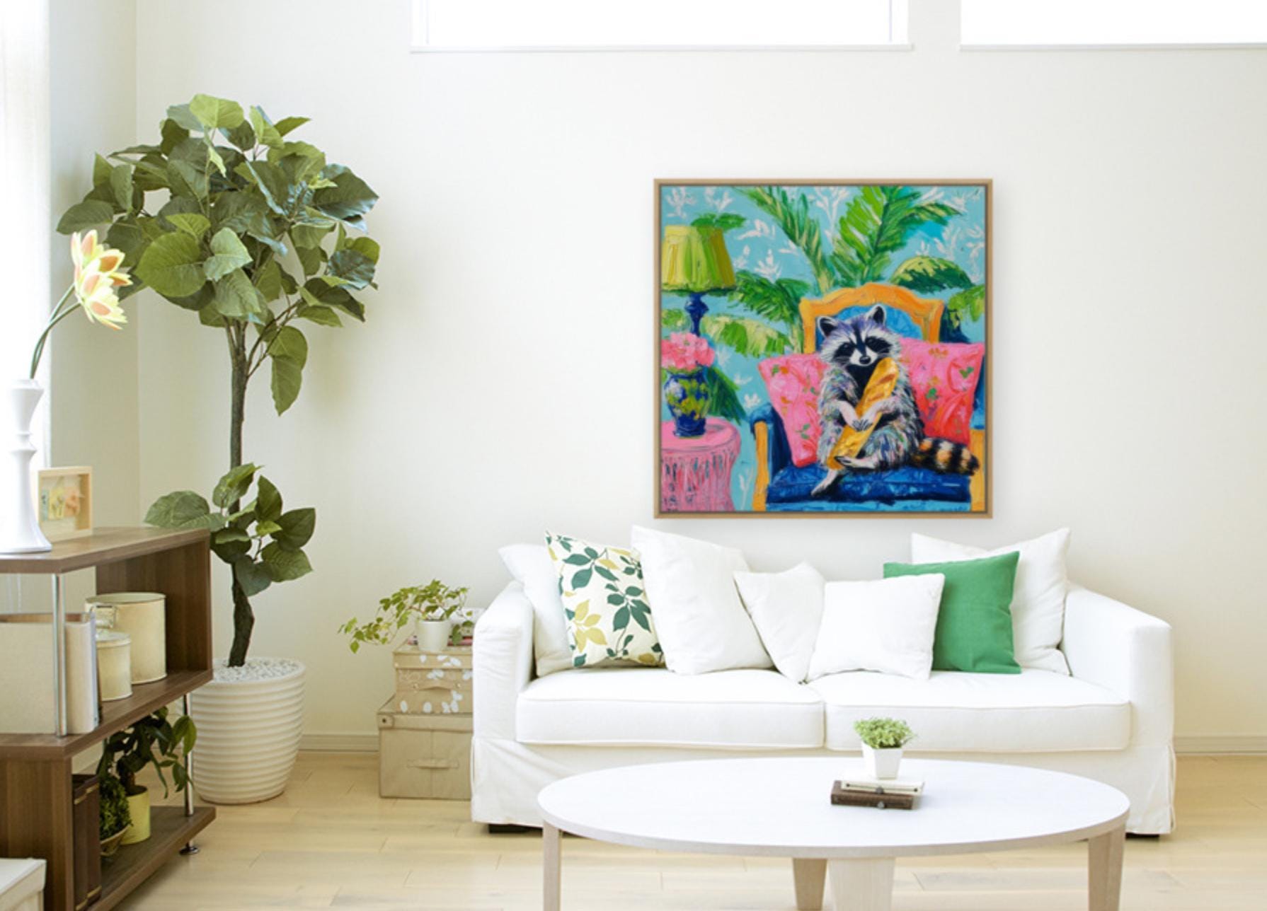 Grandmillennial art, Raccoon and the French Baguette, whimsical fine art