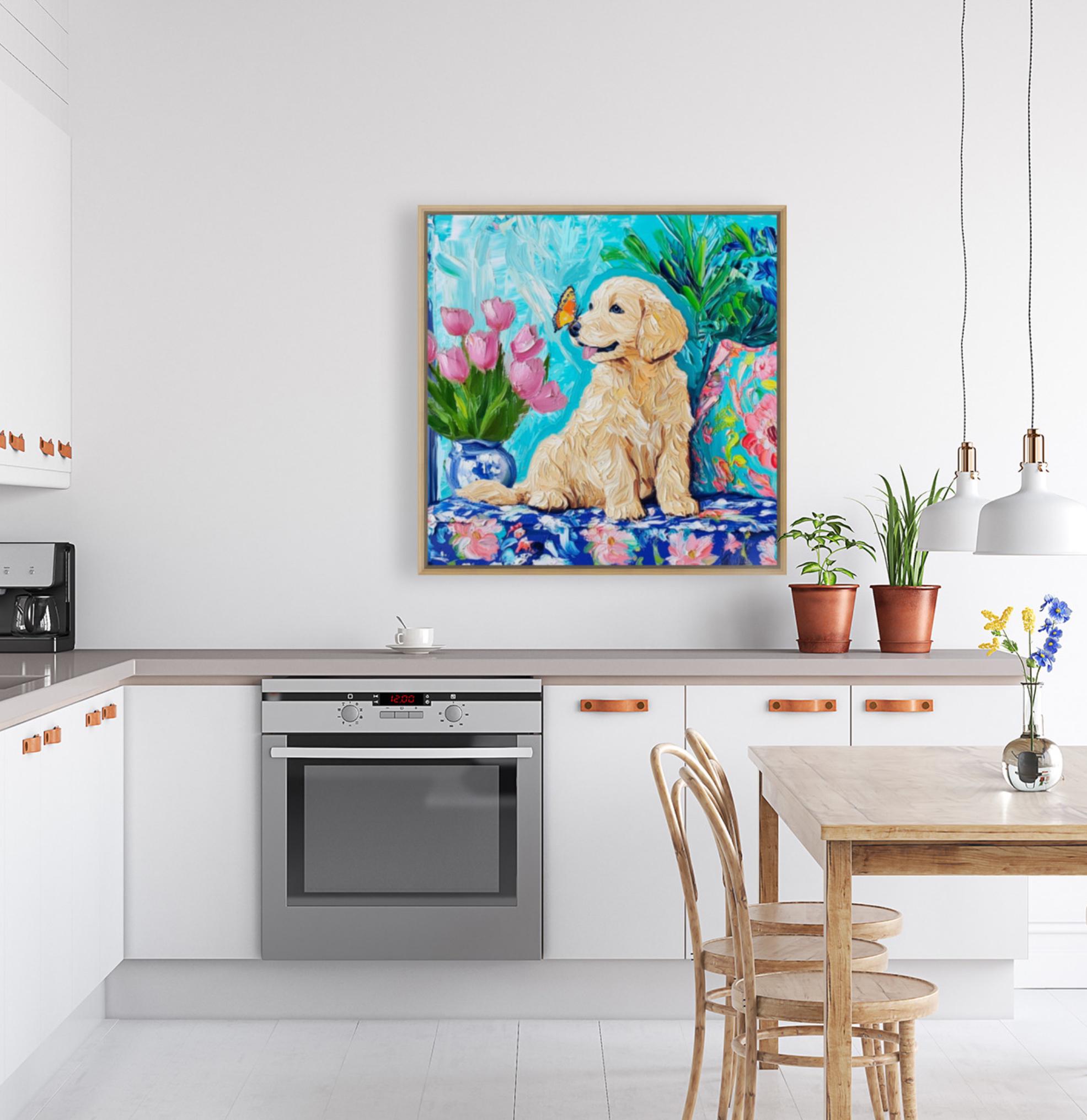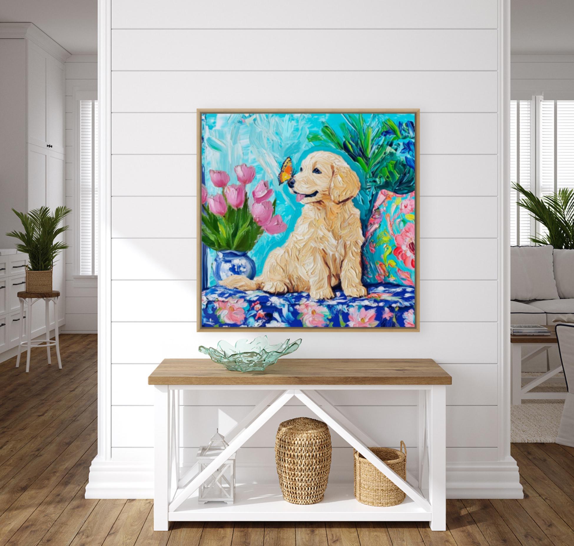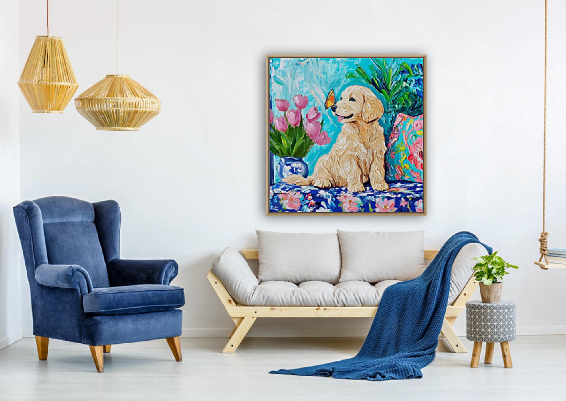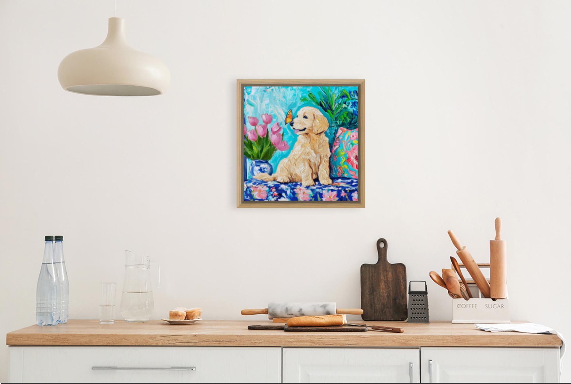 Grandmillennial art, Labrador puppy and a butterfly, whimsical fine art