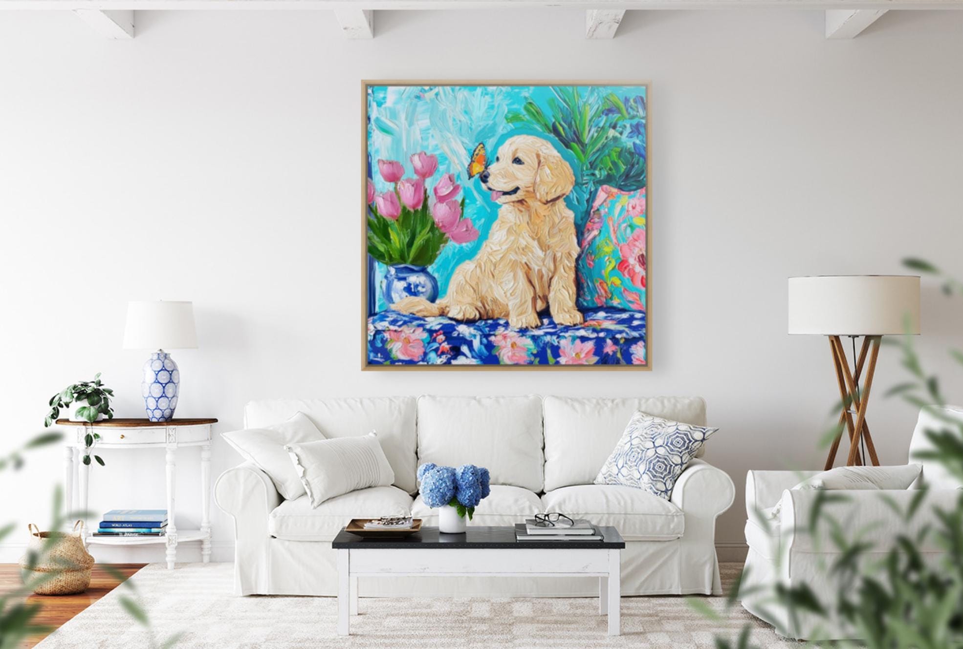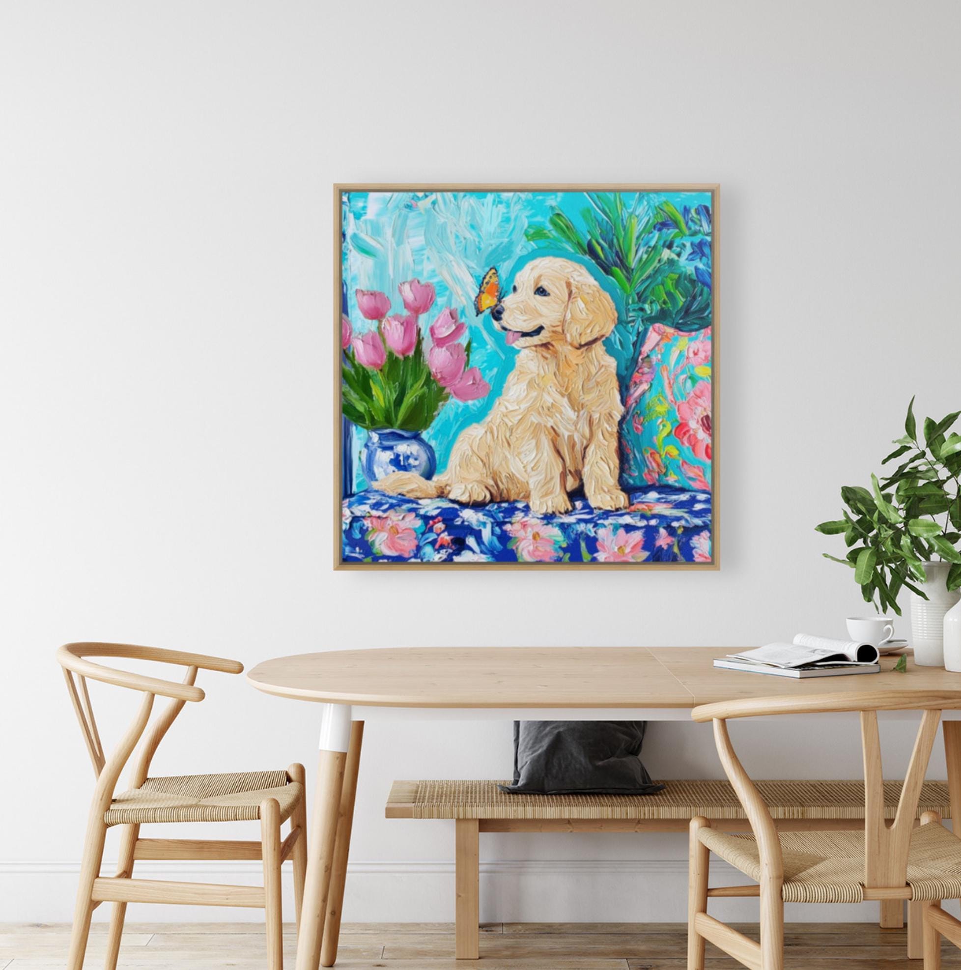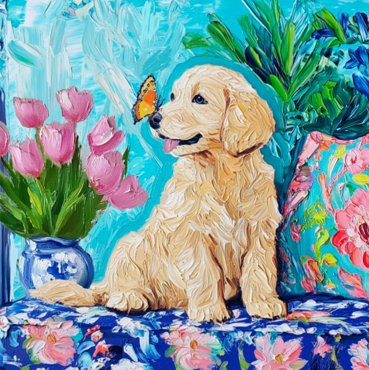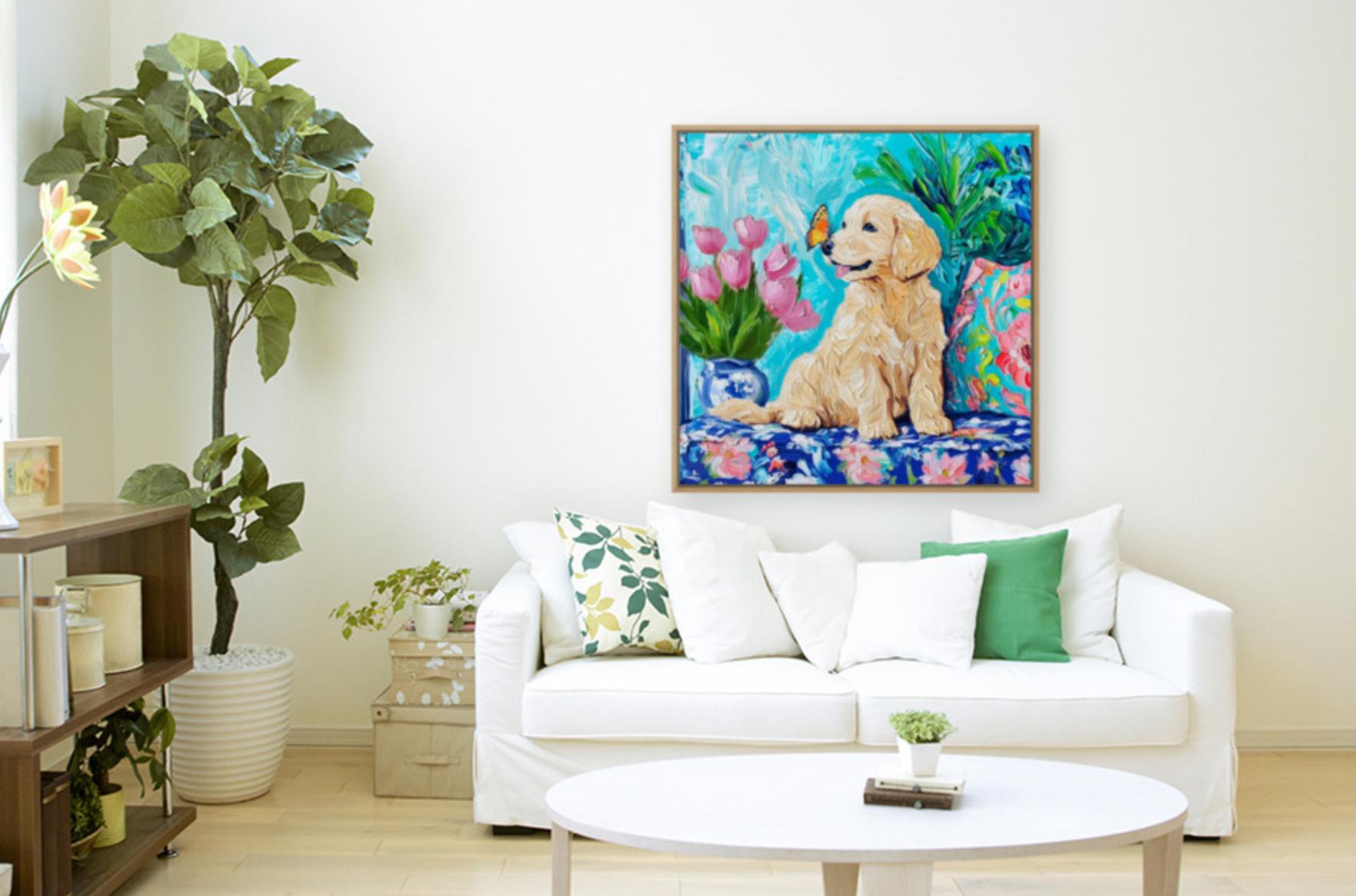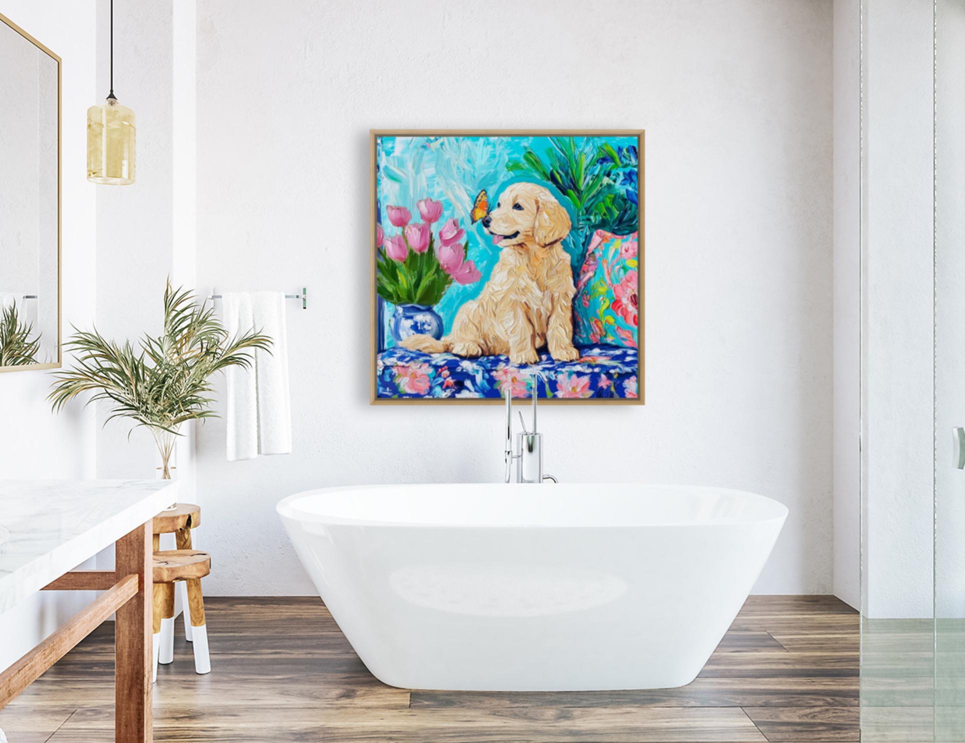 Grandmillennial art, Labrador puppy and a butterfly, whimsical fine art