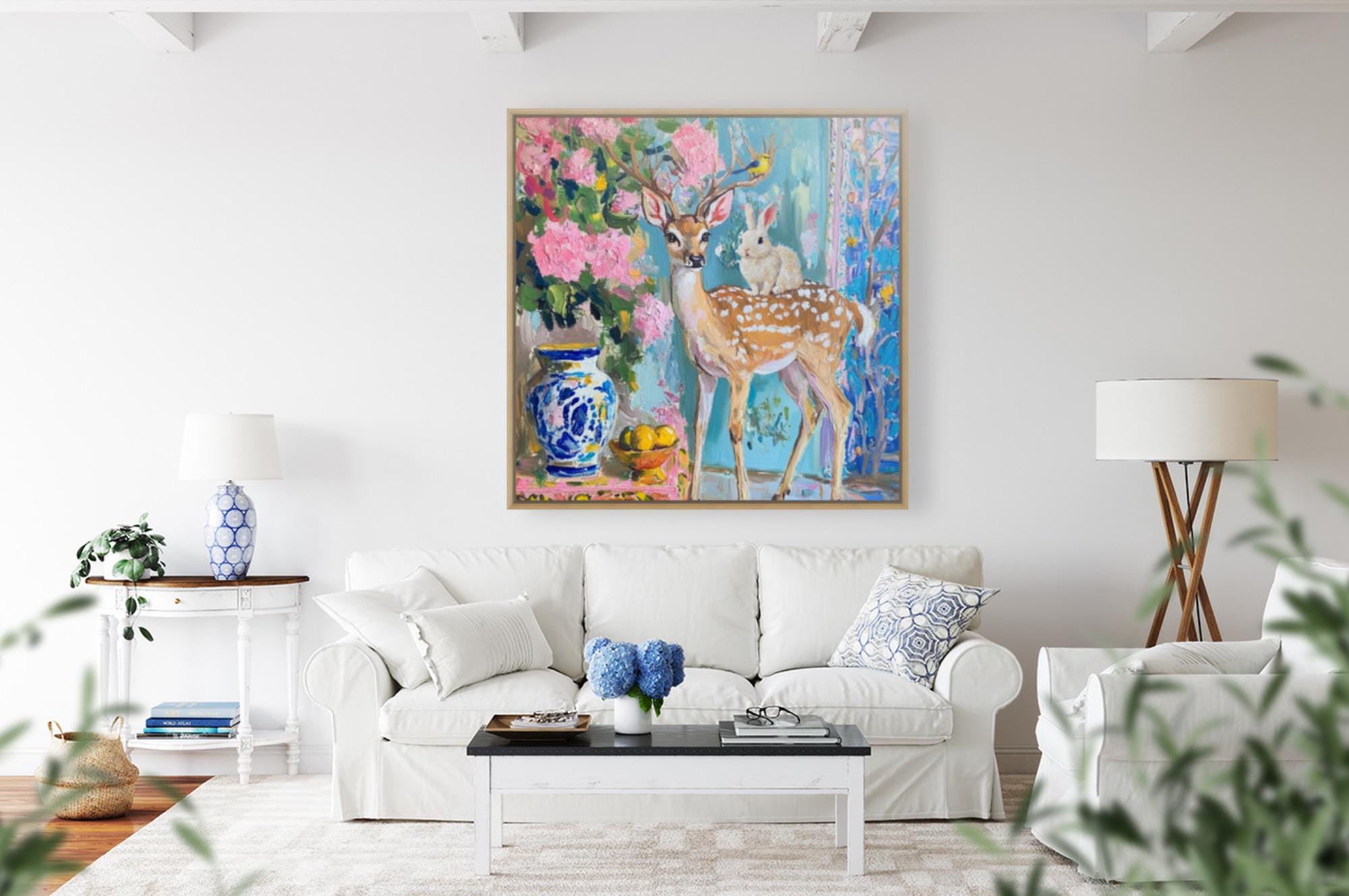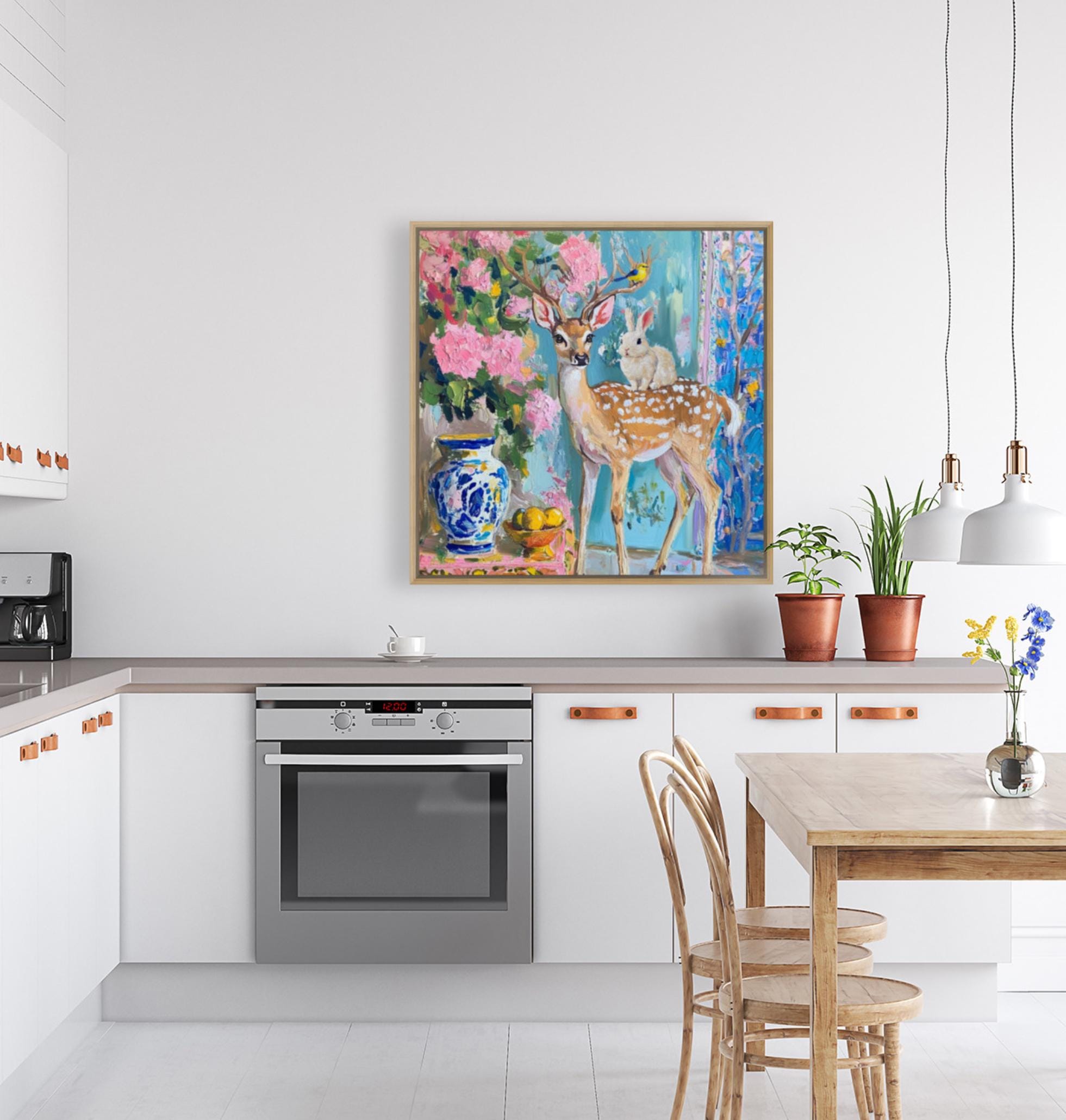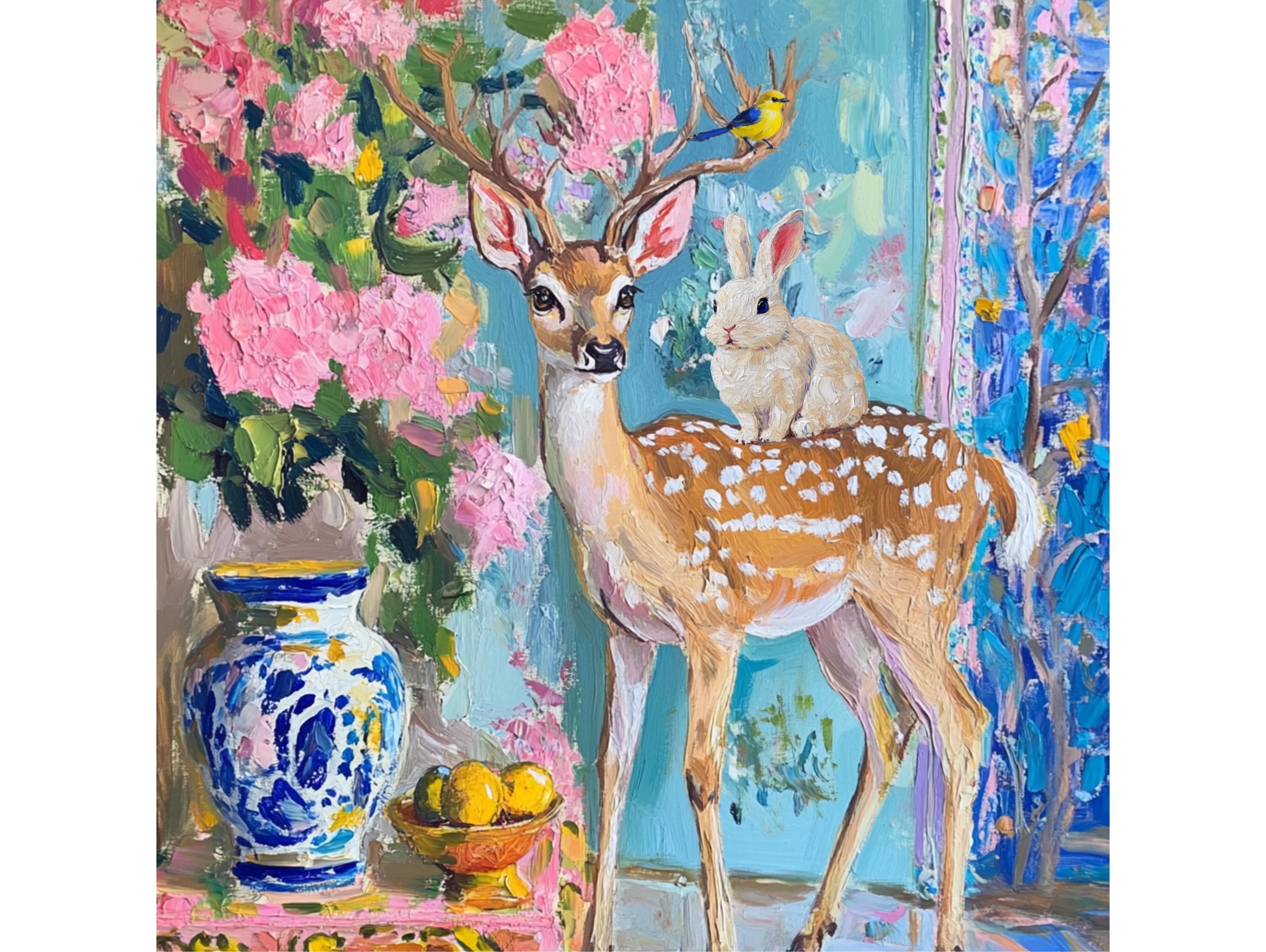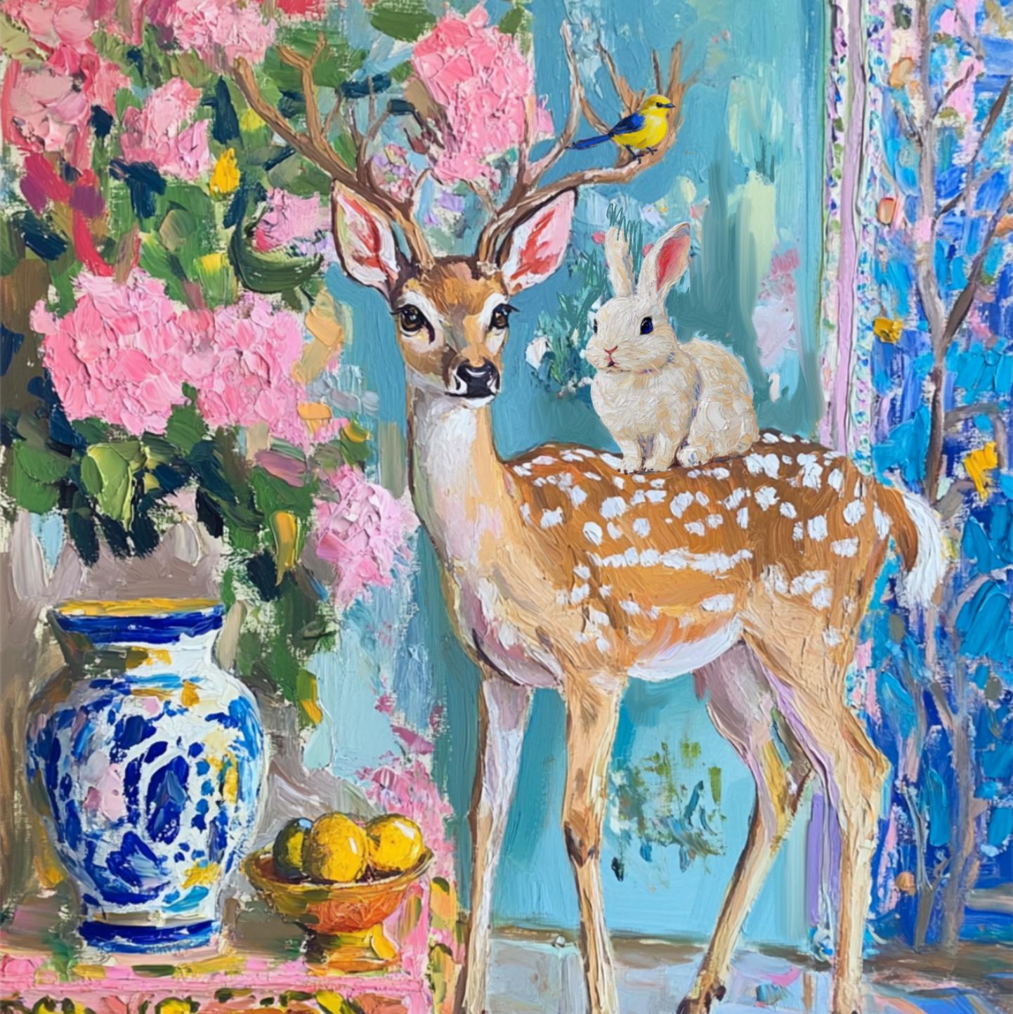 Grandmillennial art, A Free Ride Anyone? whimsical deer art
