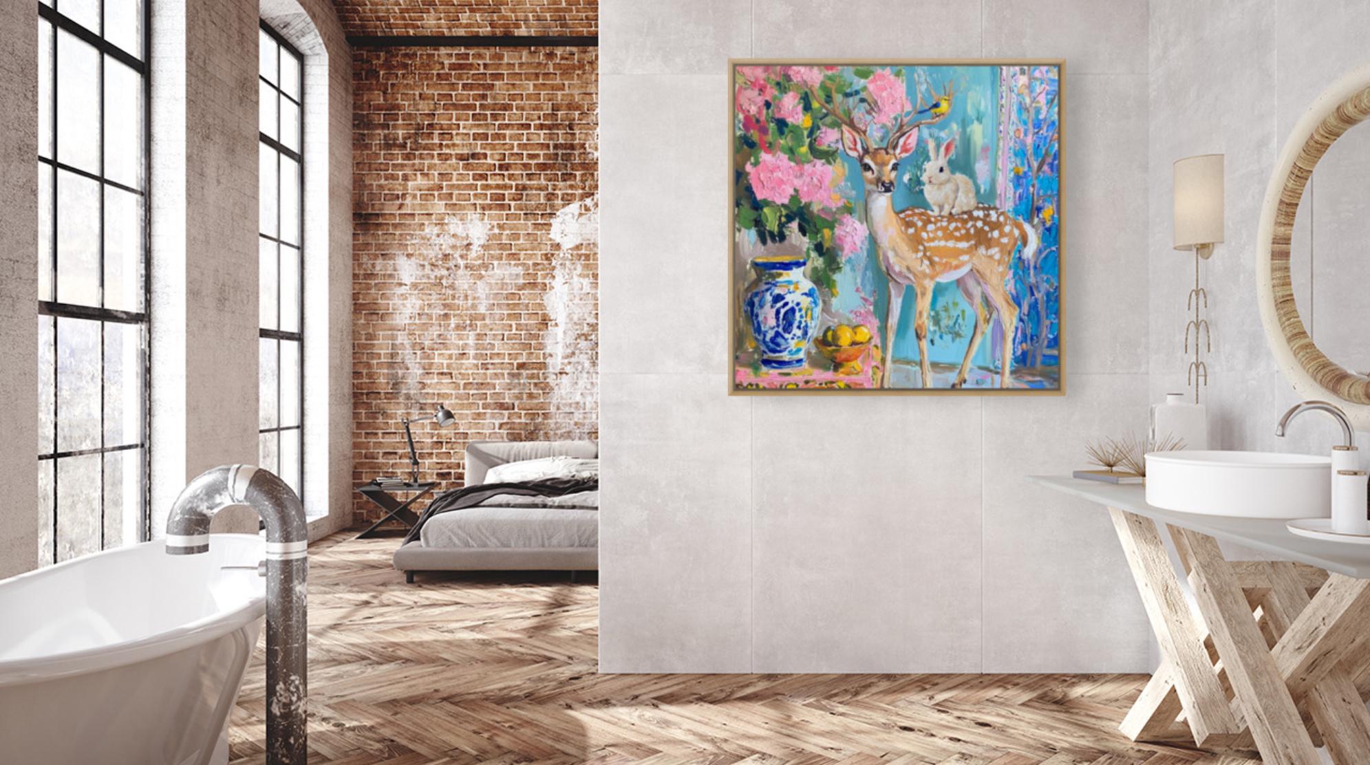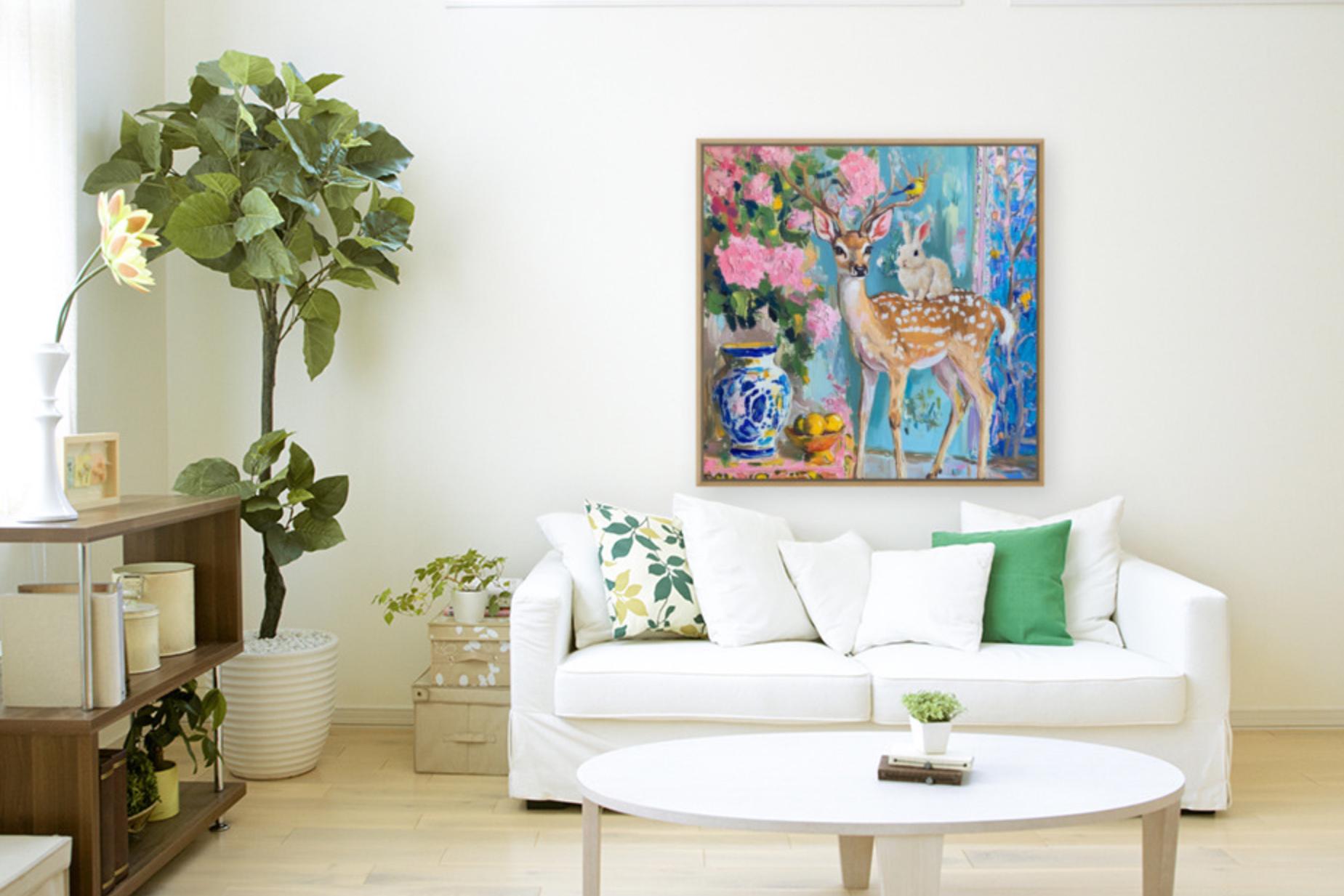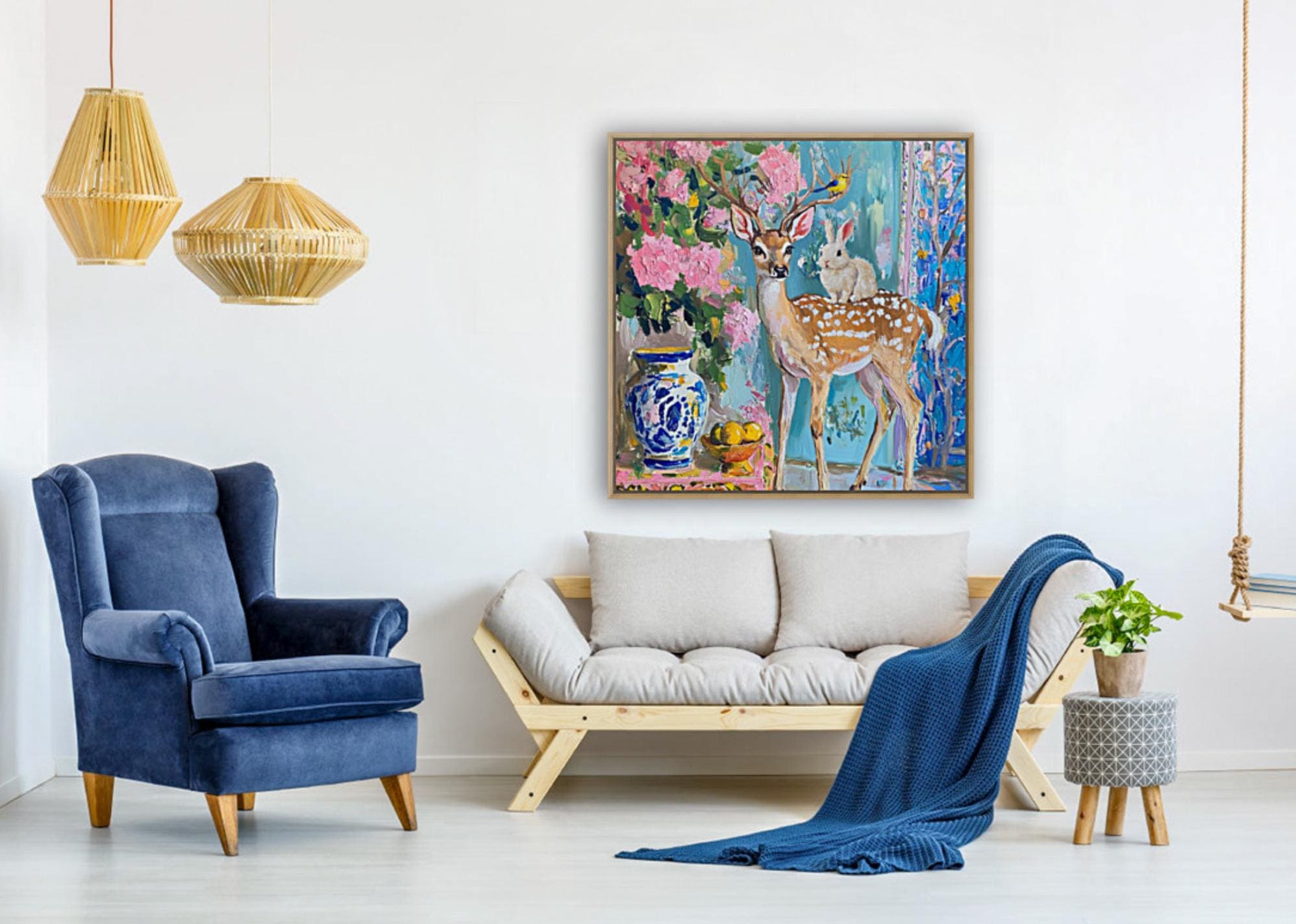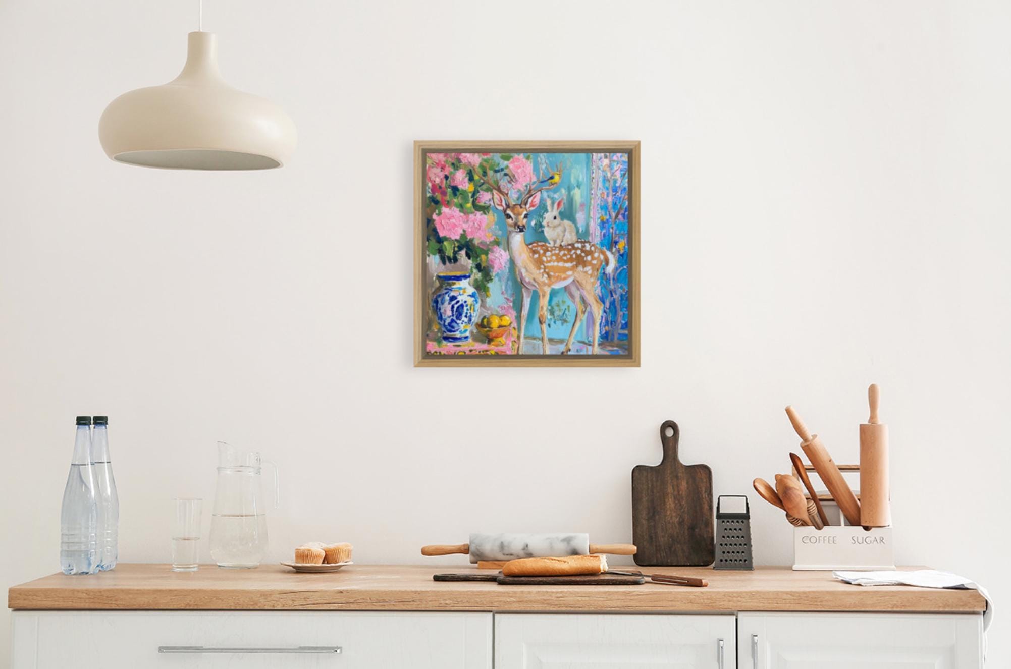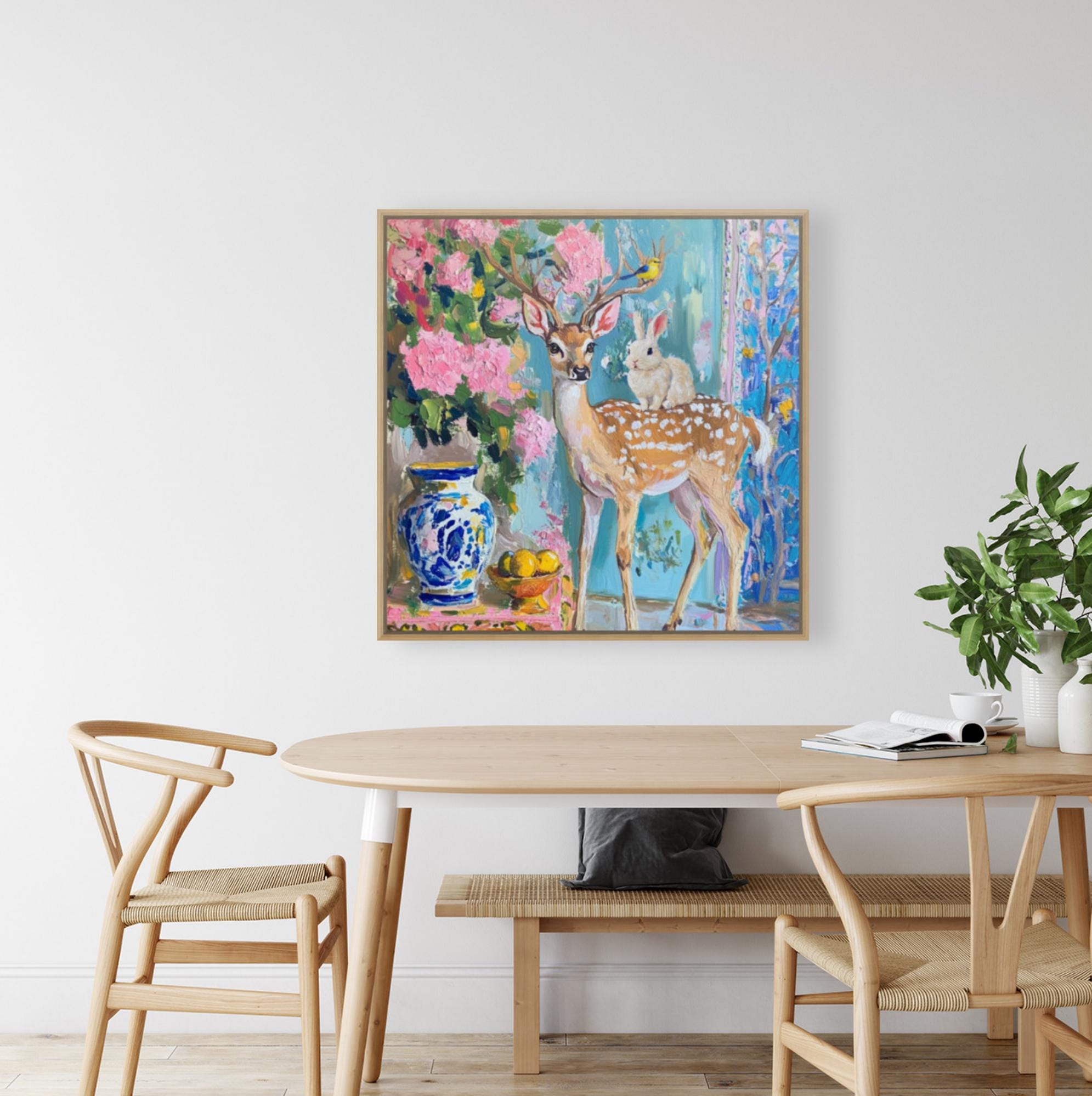 Grandmillennial art, A Free Ride Anyone? whimsical deer art