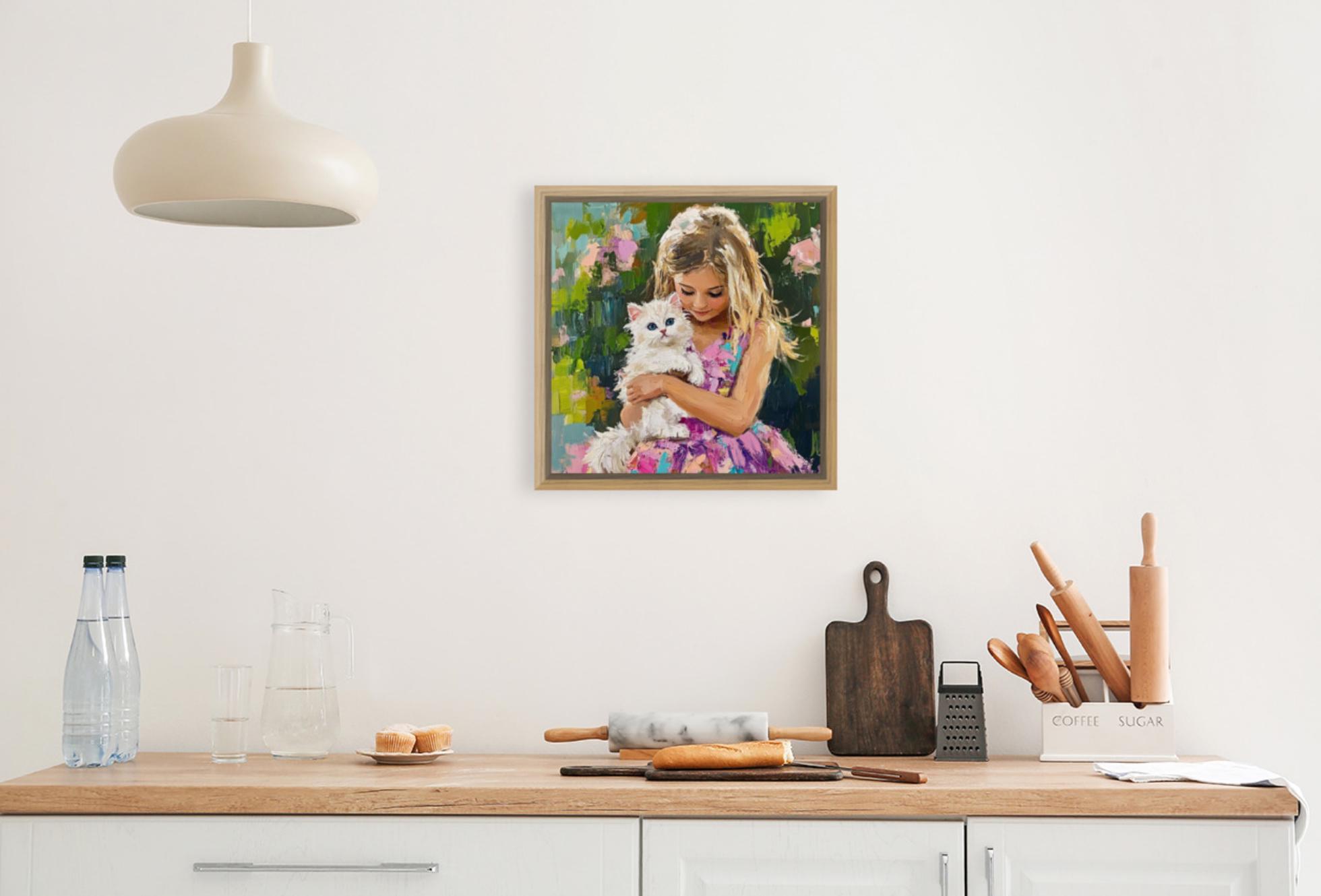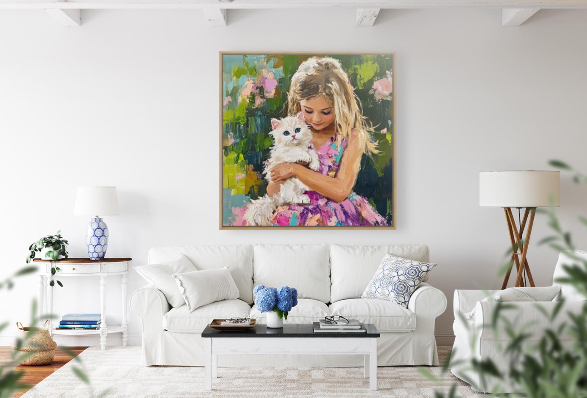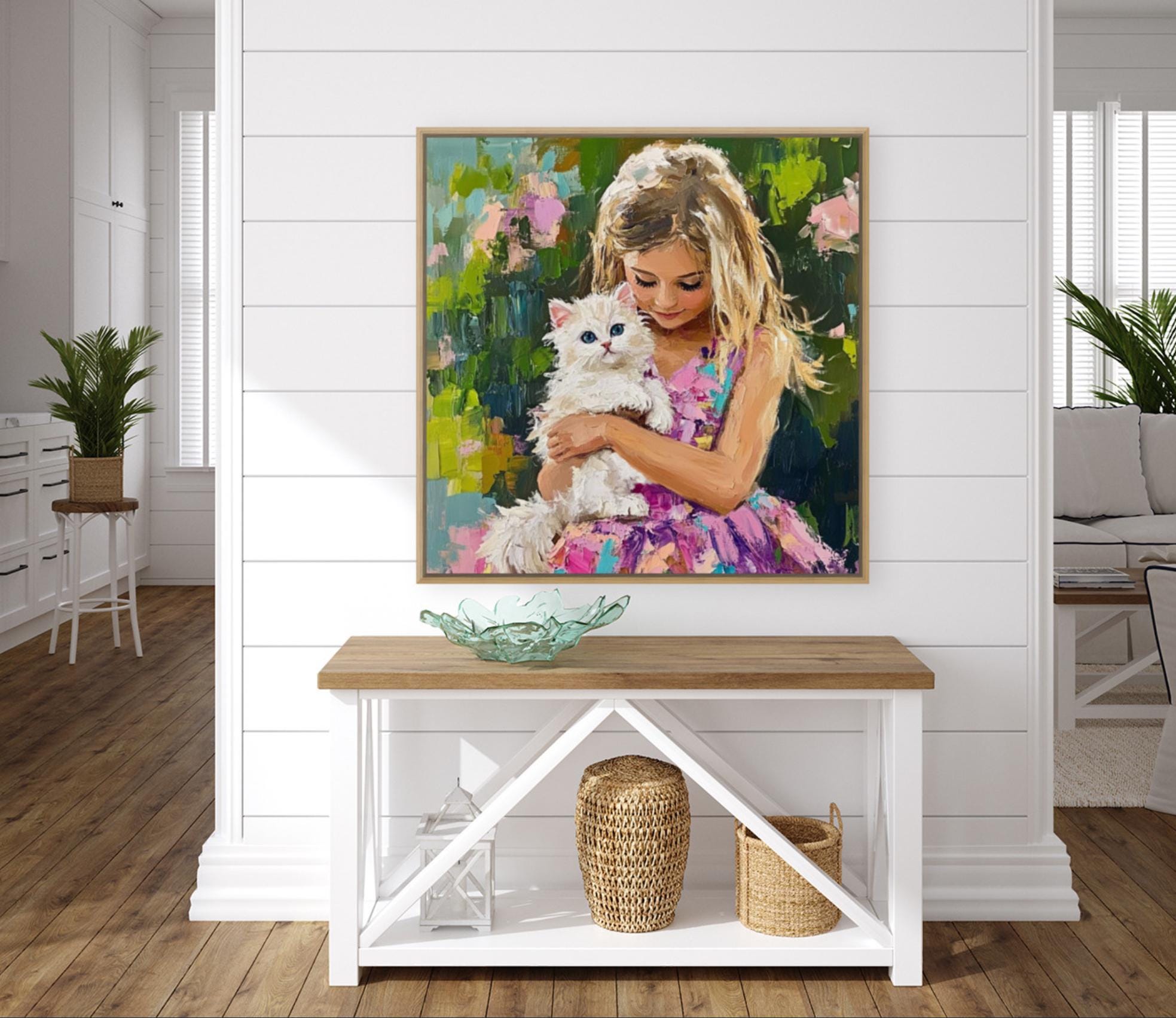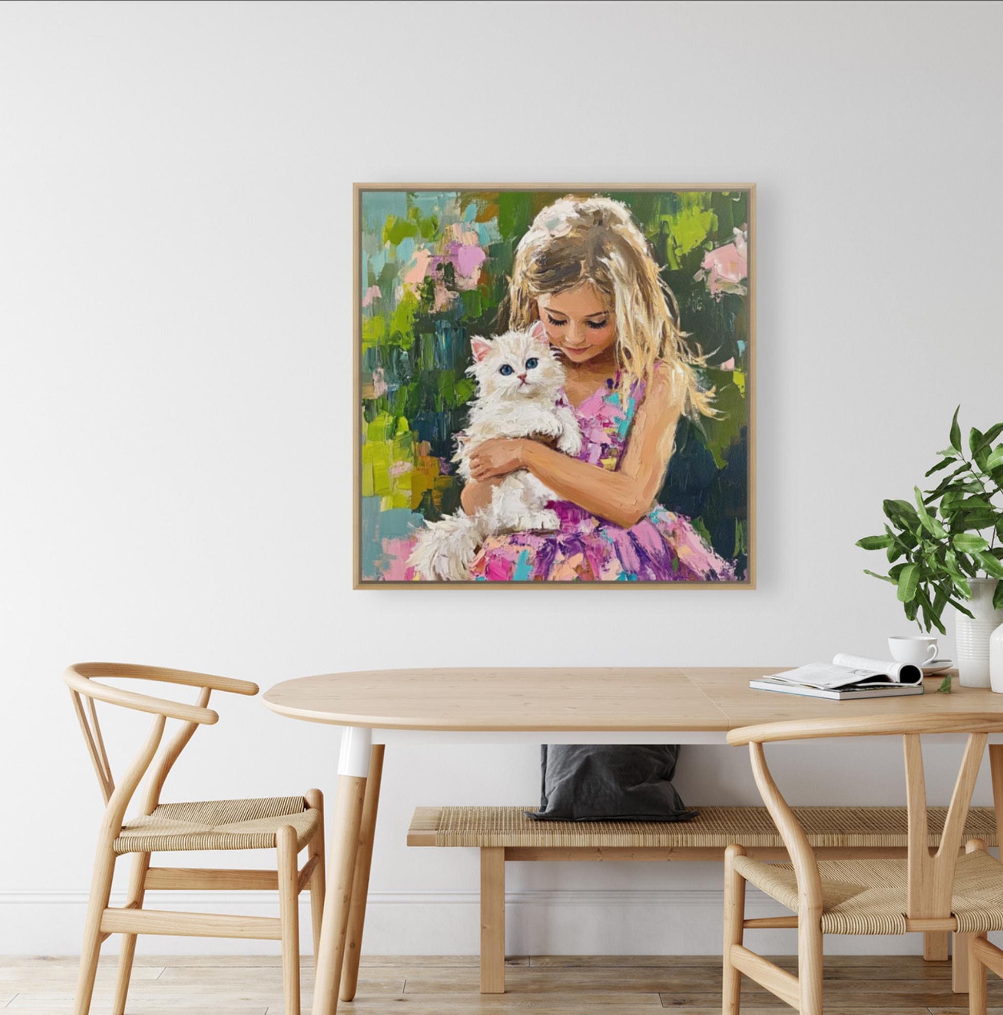 Grandmillennial art, Girl with a white kitten, whimsical fine art