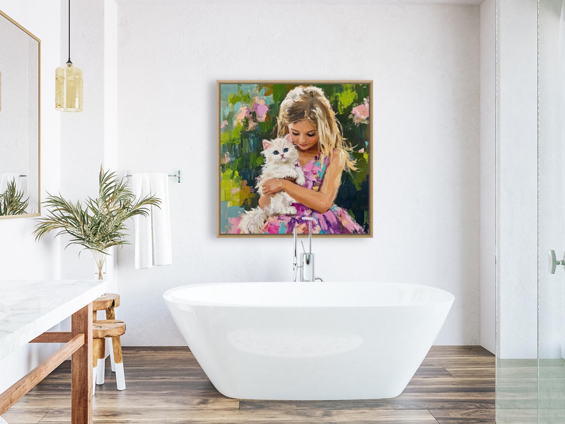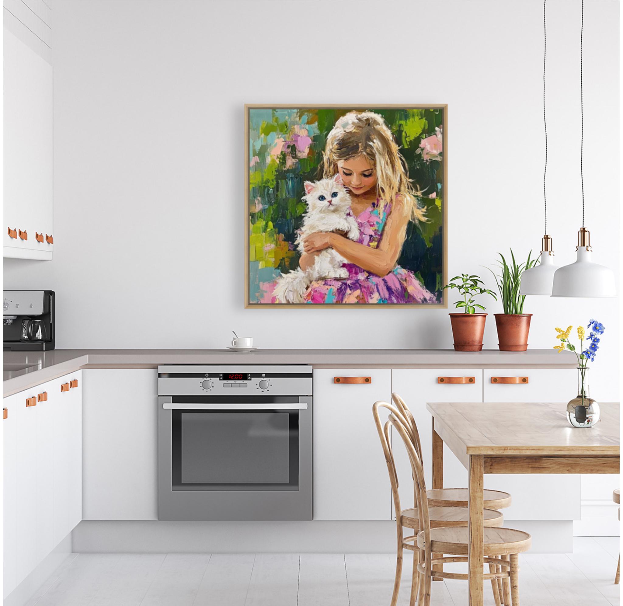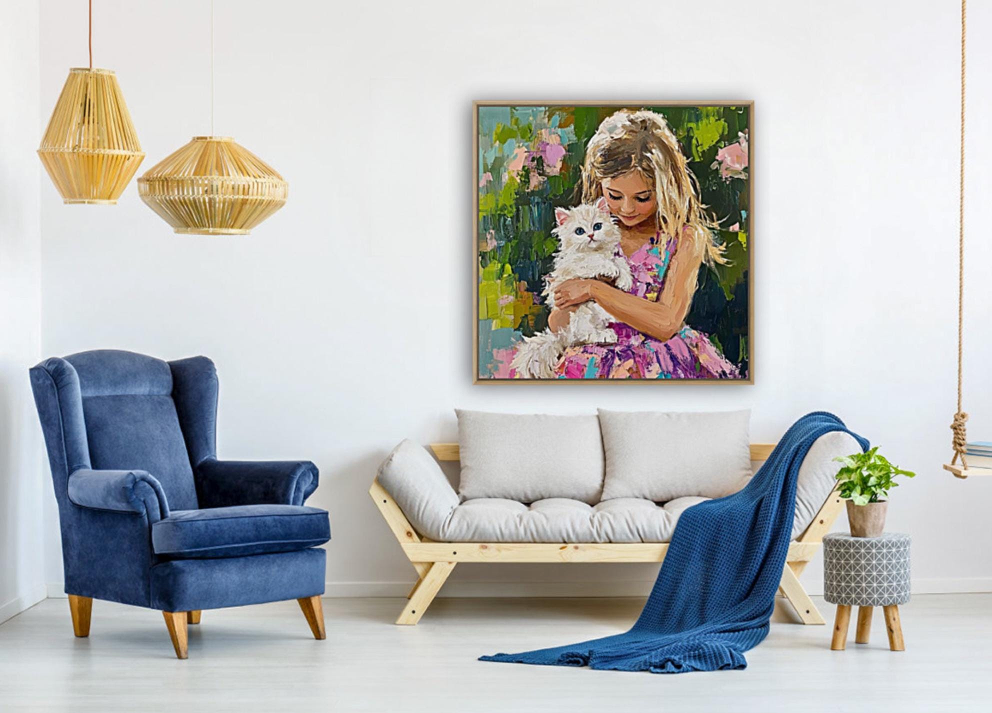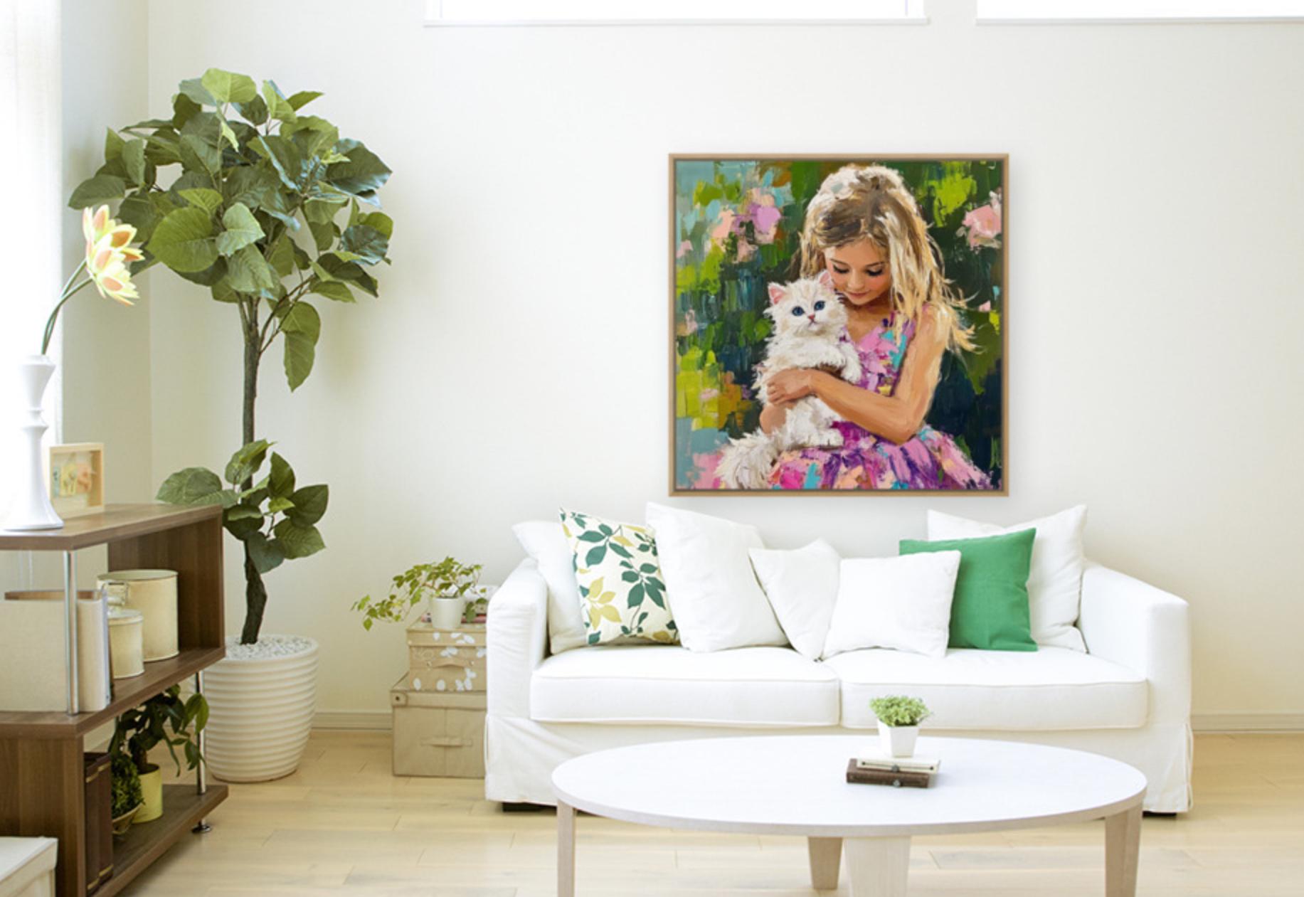 Grandmillennial art, Girl with a white kitten, whimsical fine art