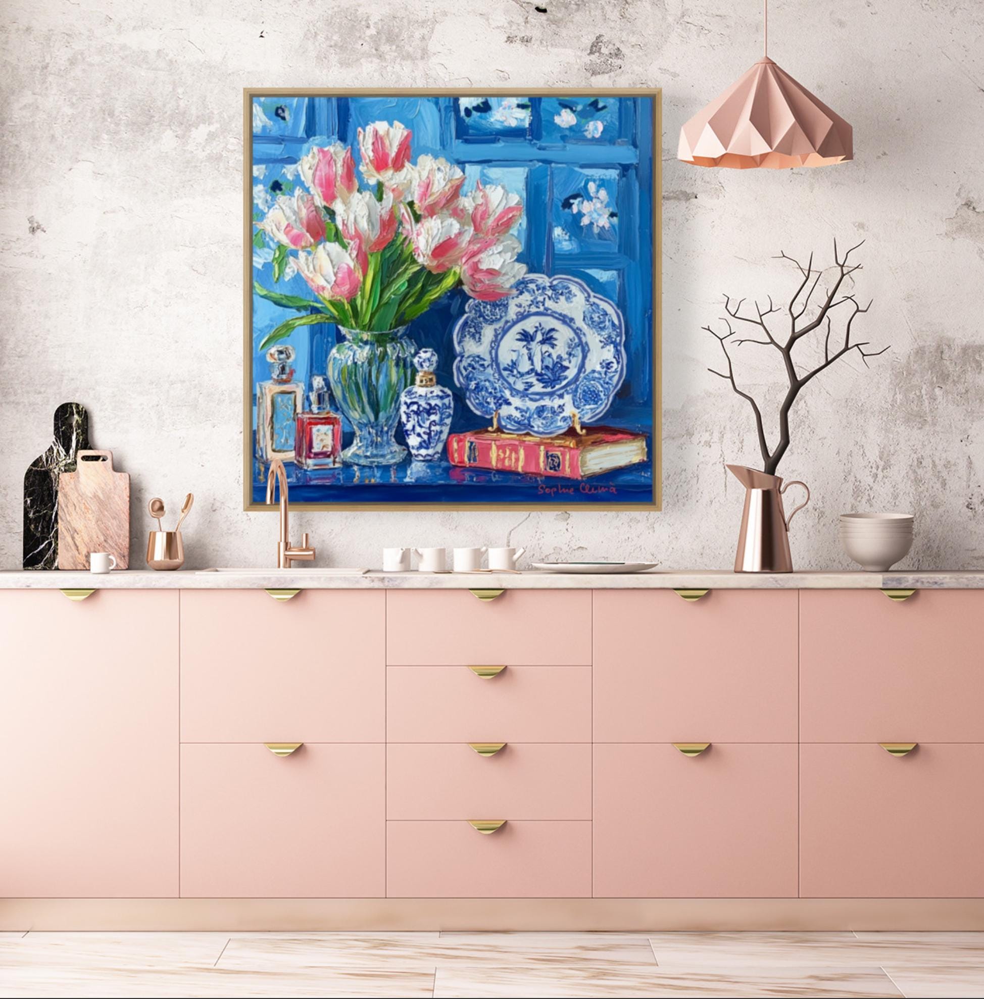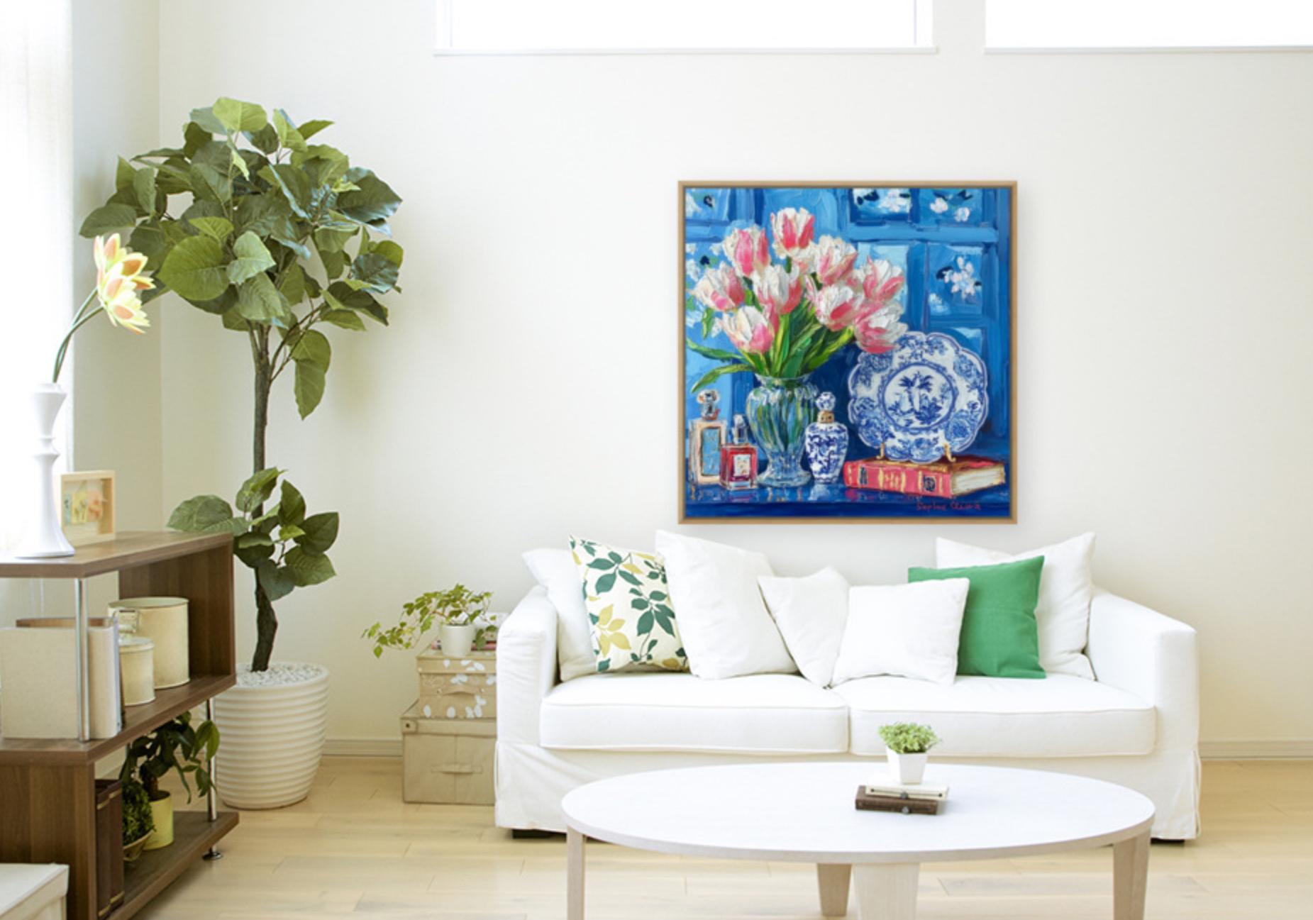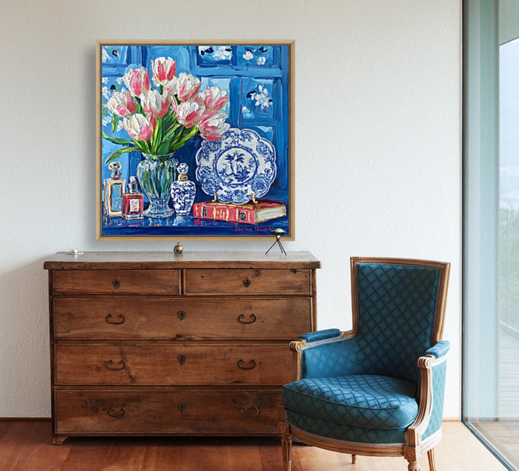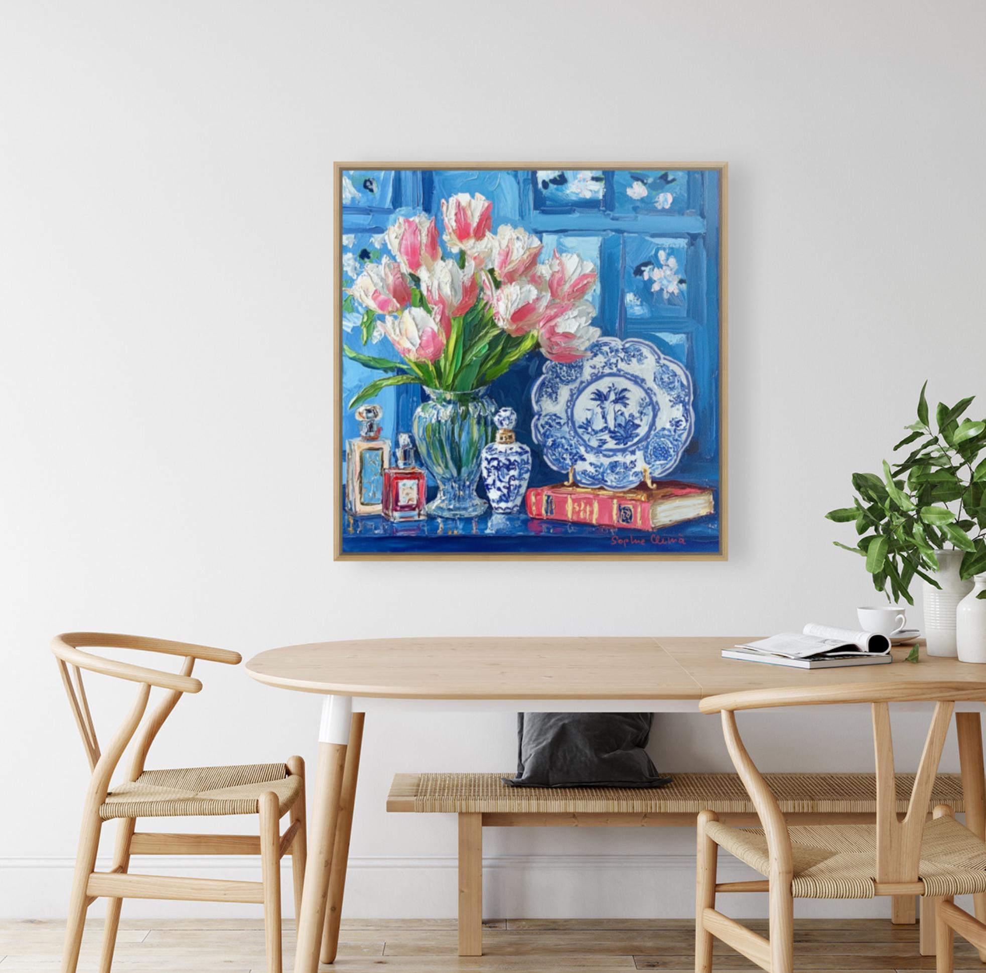 grandmillennial art, Still life with pink tulips in blue and white china, oil painting