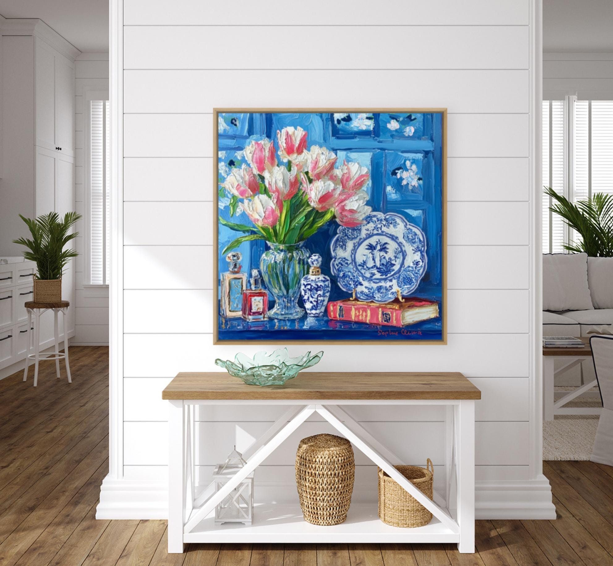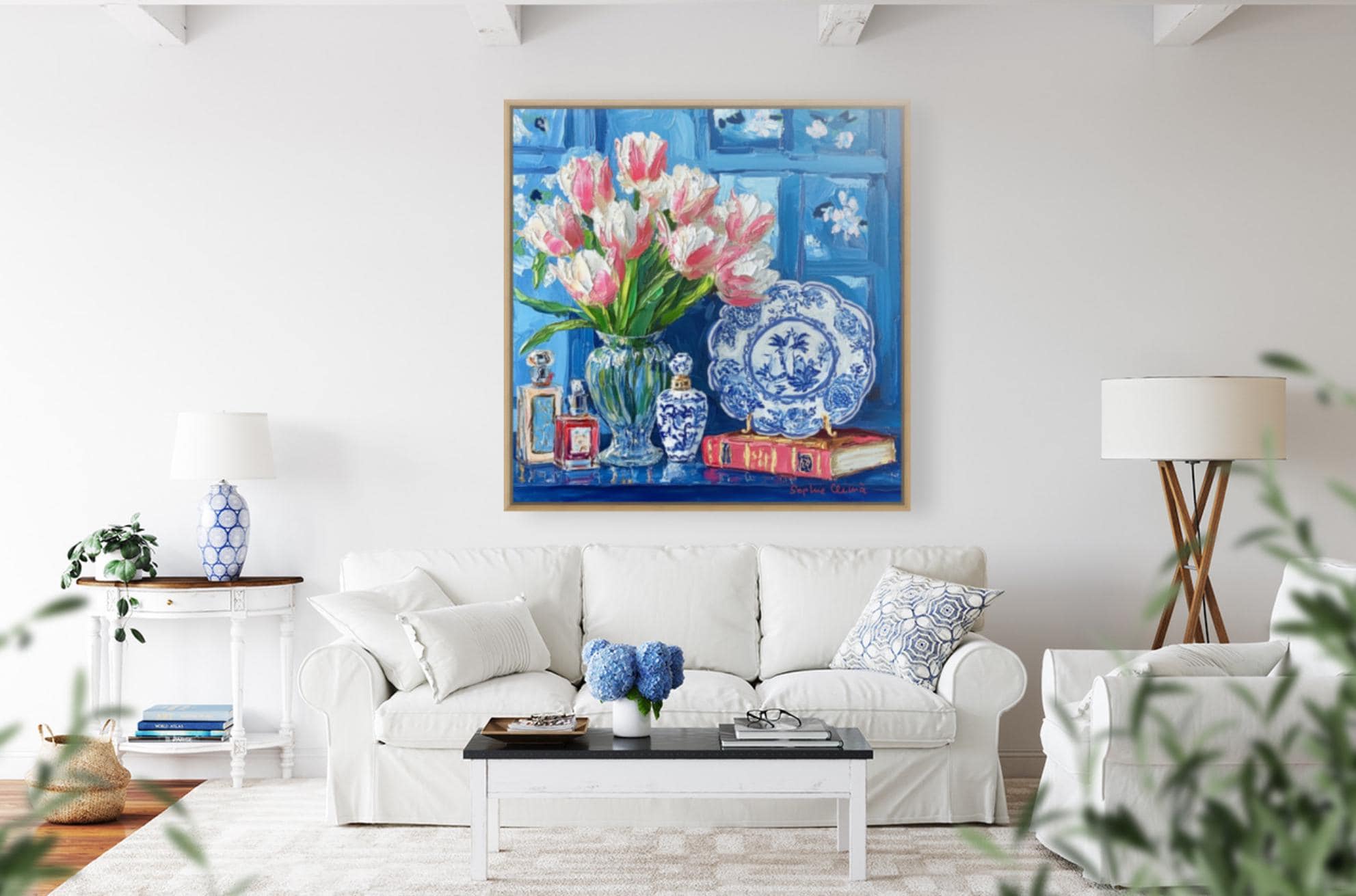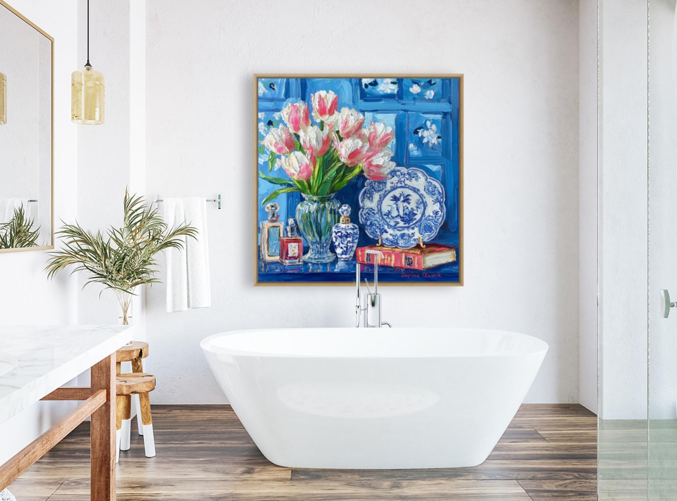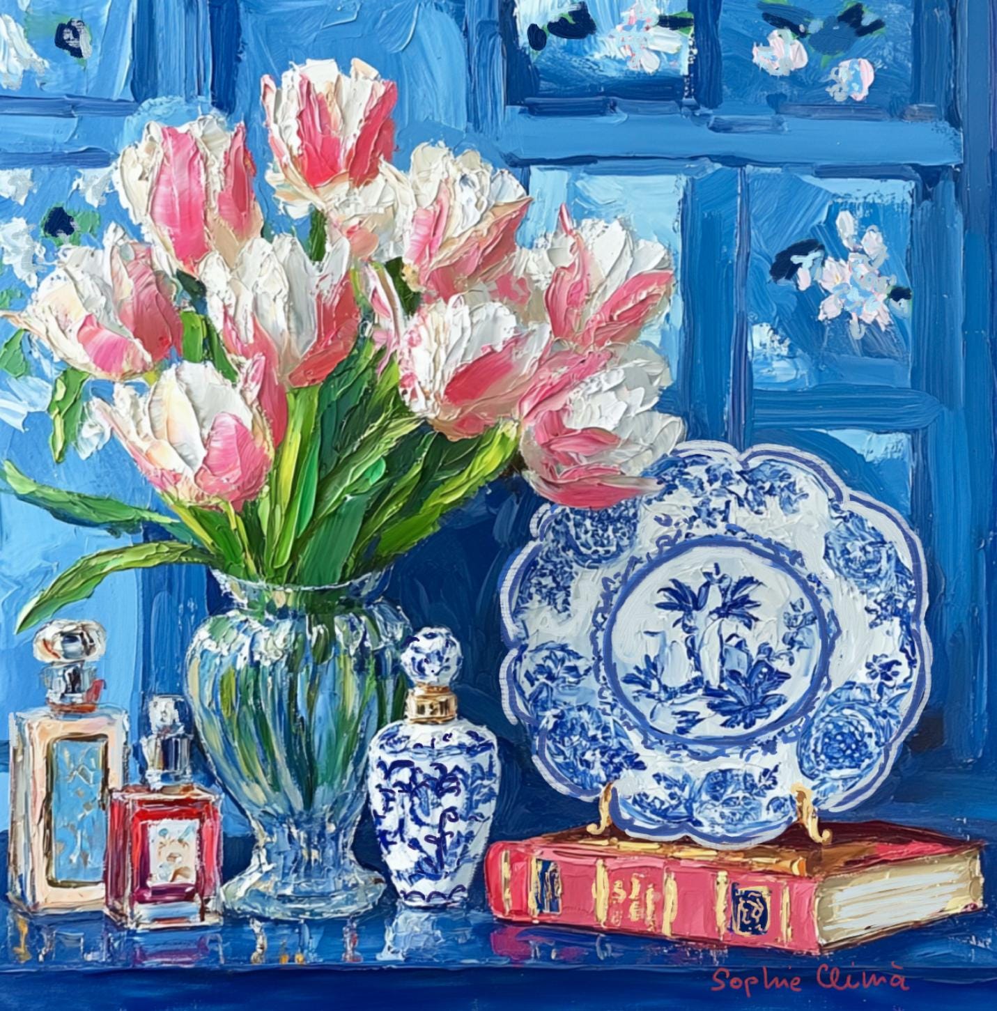 grandmillennial art, Still life with pink tulips in blue and white china, oil painting