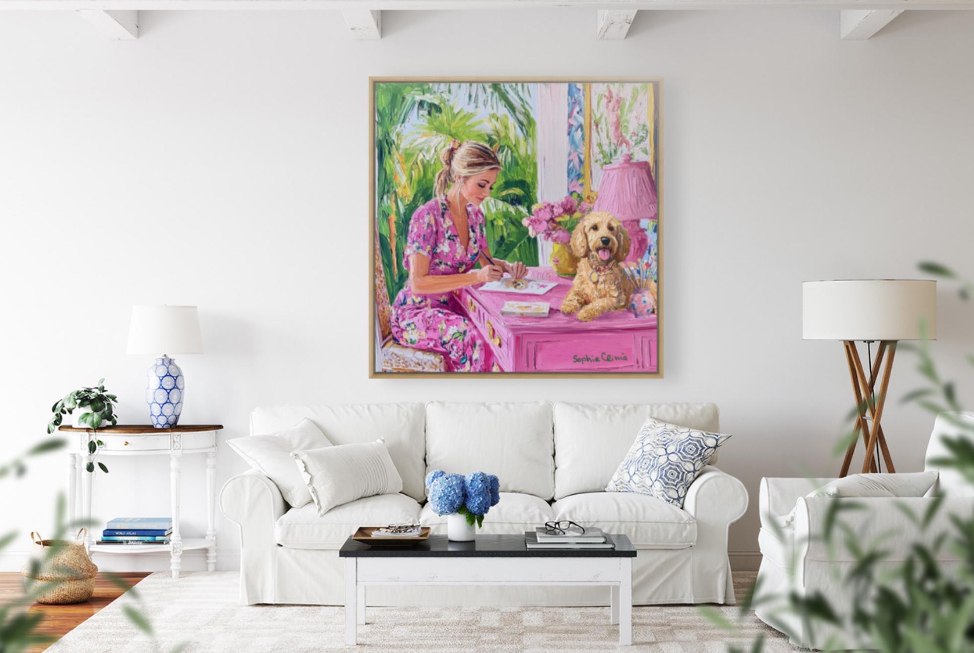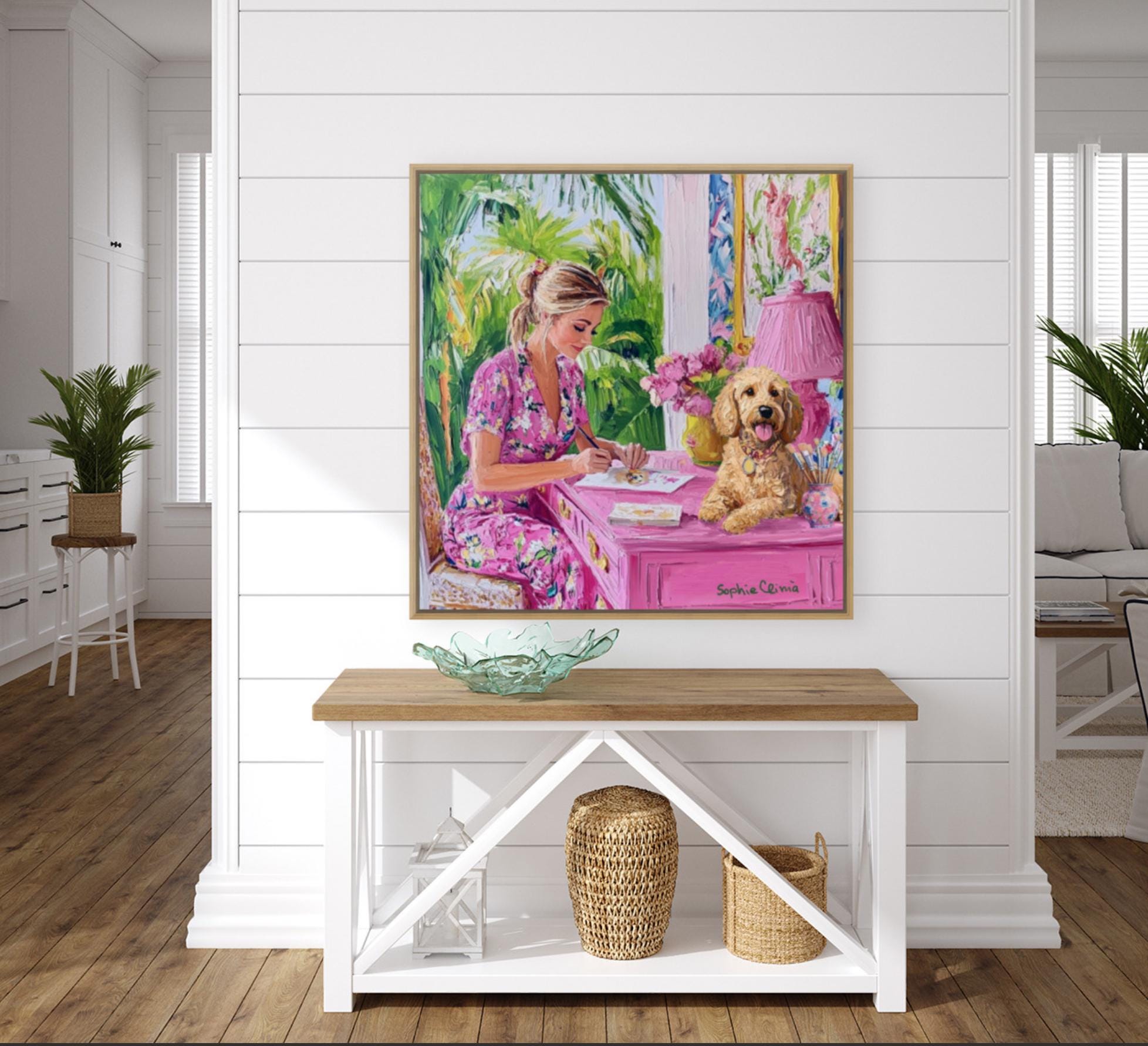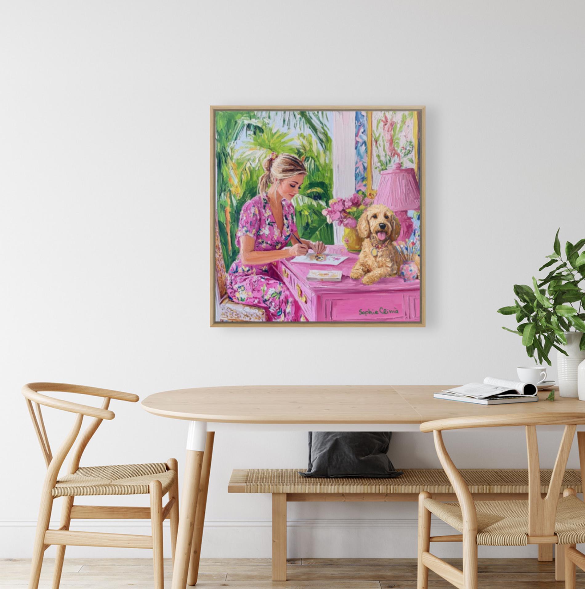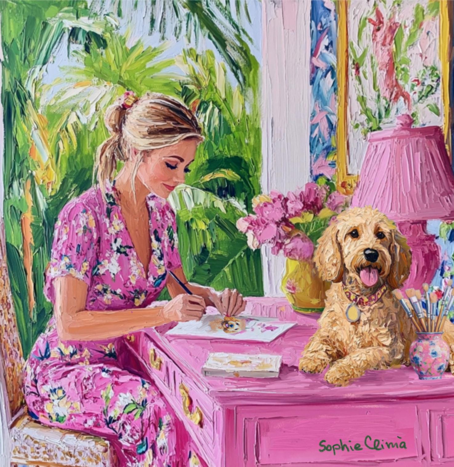 Grandmillennial Art Print: Woman and Dog, Whimsical Watercolor