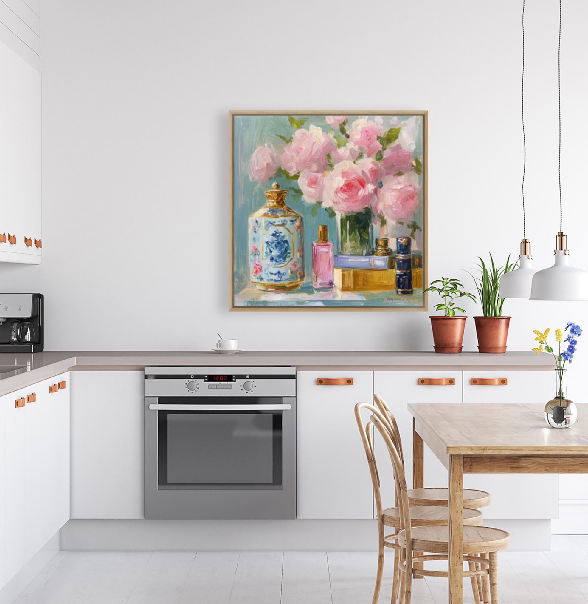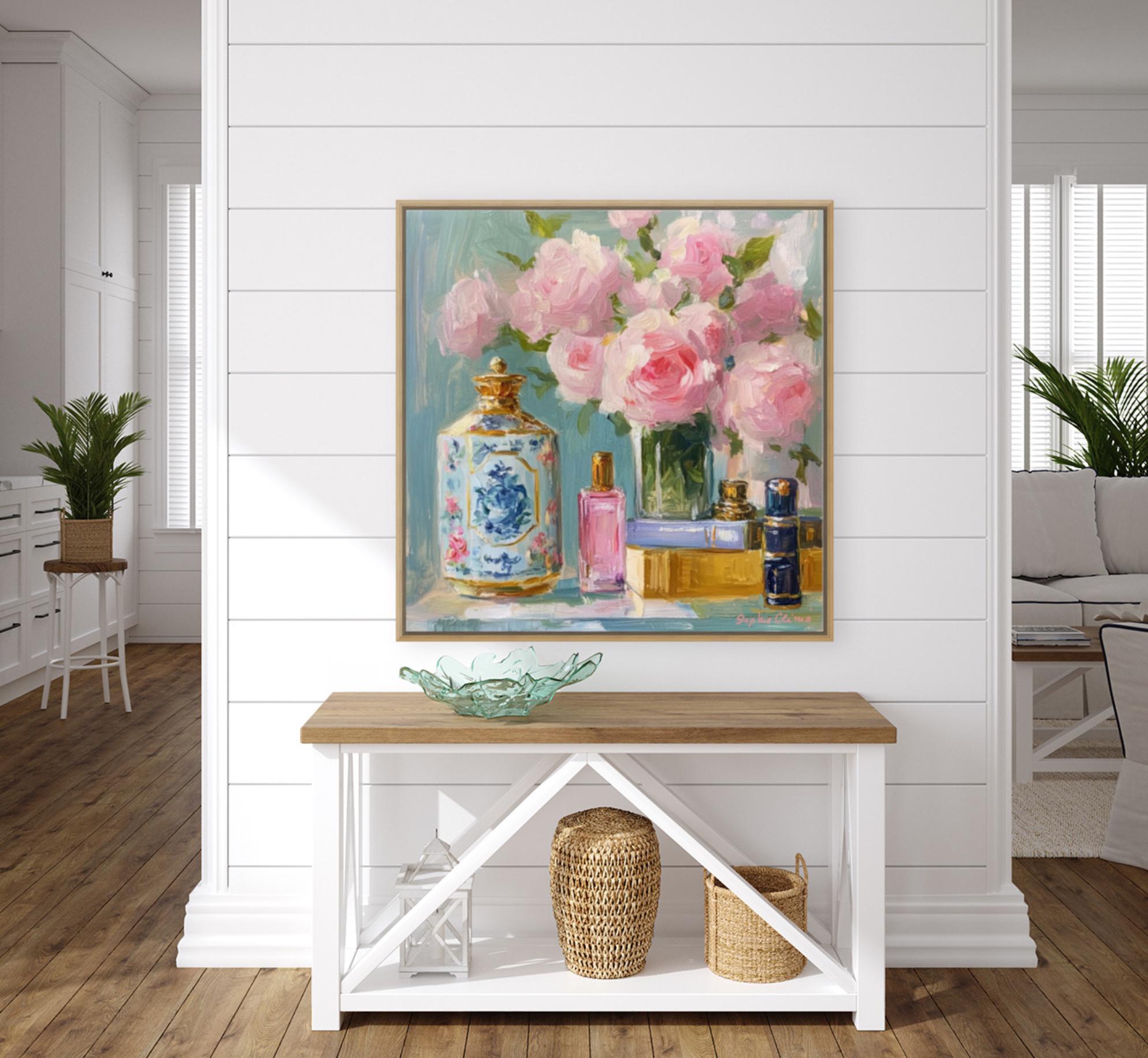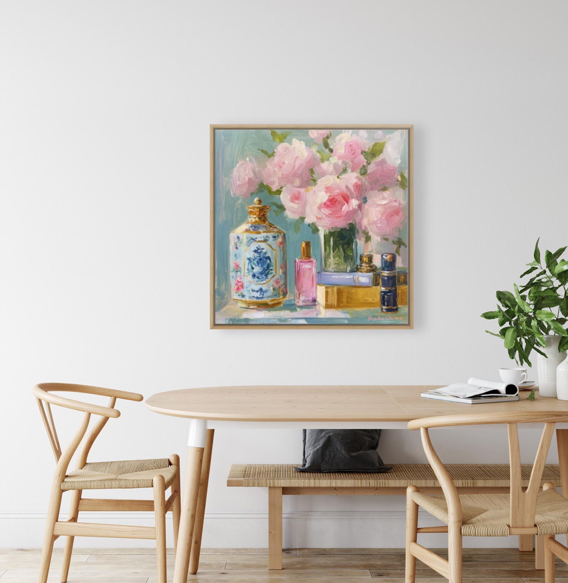 Enhance your space with this Grandmillennial floral still life print by Sophie Clima. This high-quality giclée print of an original oil painting captures the timeless elegance of blooming pink roses, vintage books, and delicate perfume bottles. A blend of French country charm and cottagecore romance, this piece makes a statement in any room.