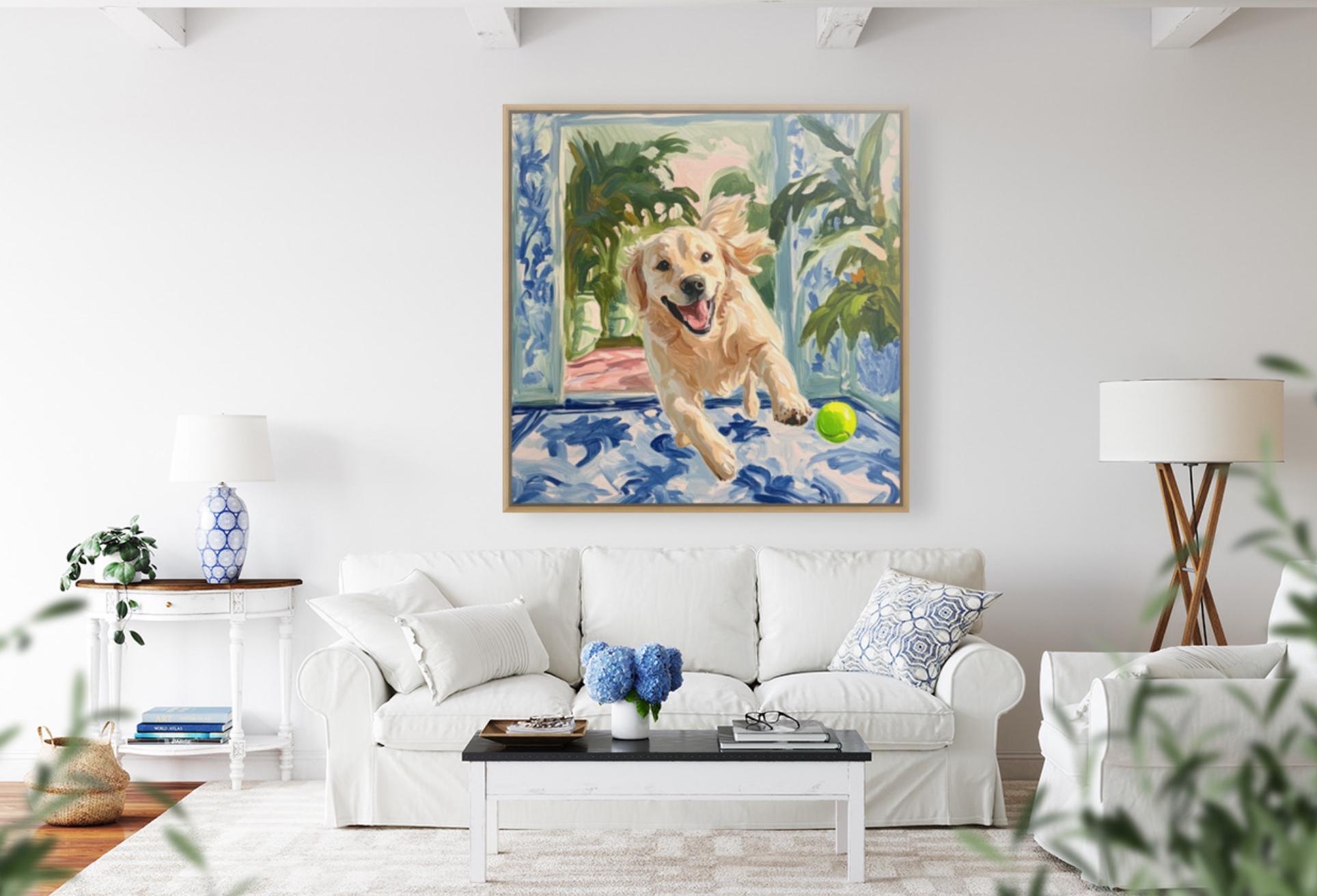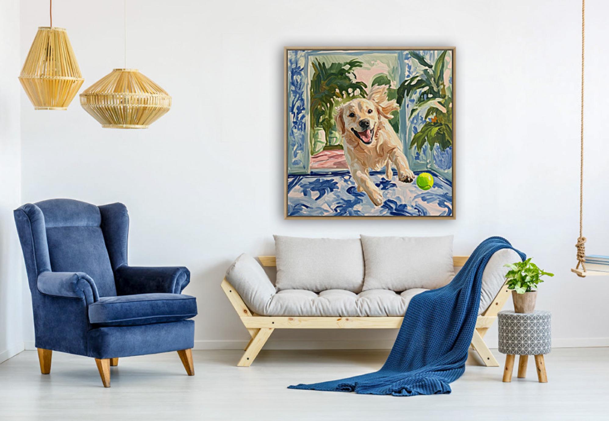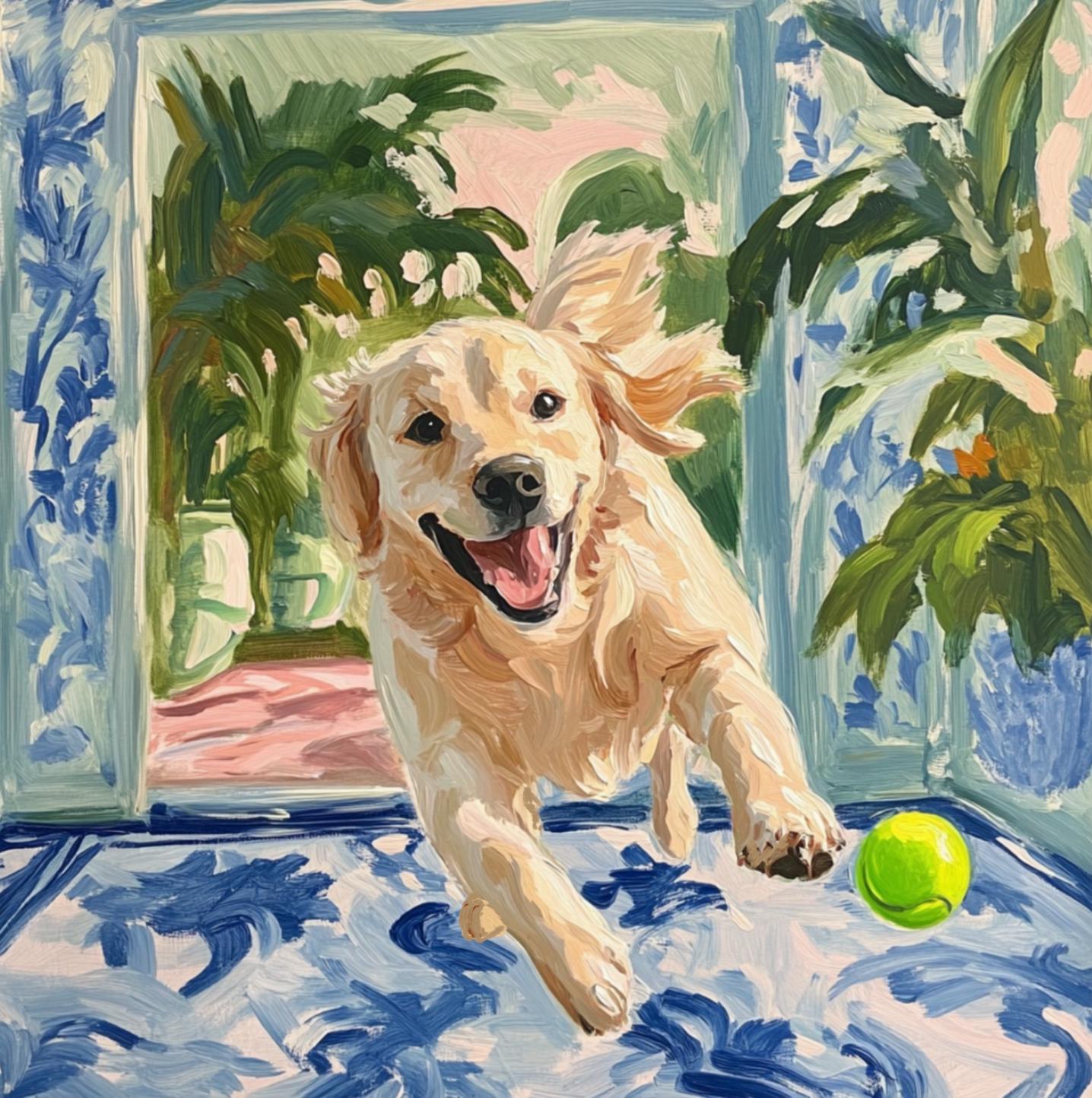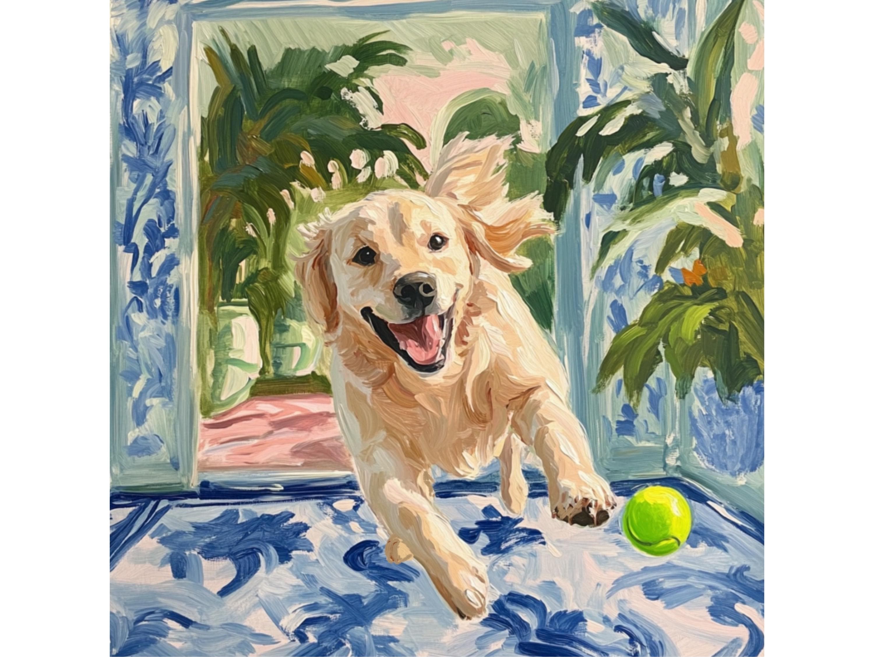 Grandmillennial art, Golden Retriever chasing a tennis ball, whimsical fine art