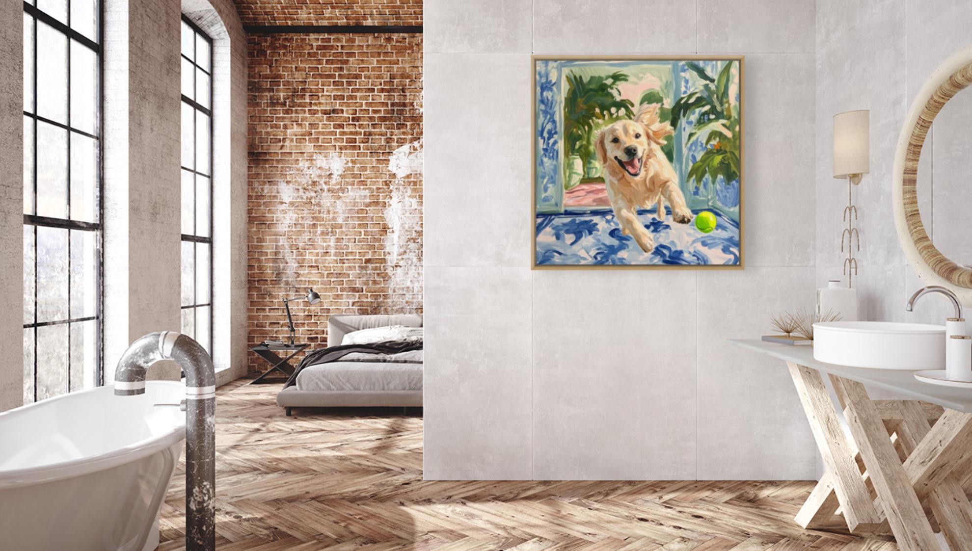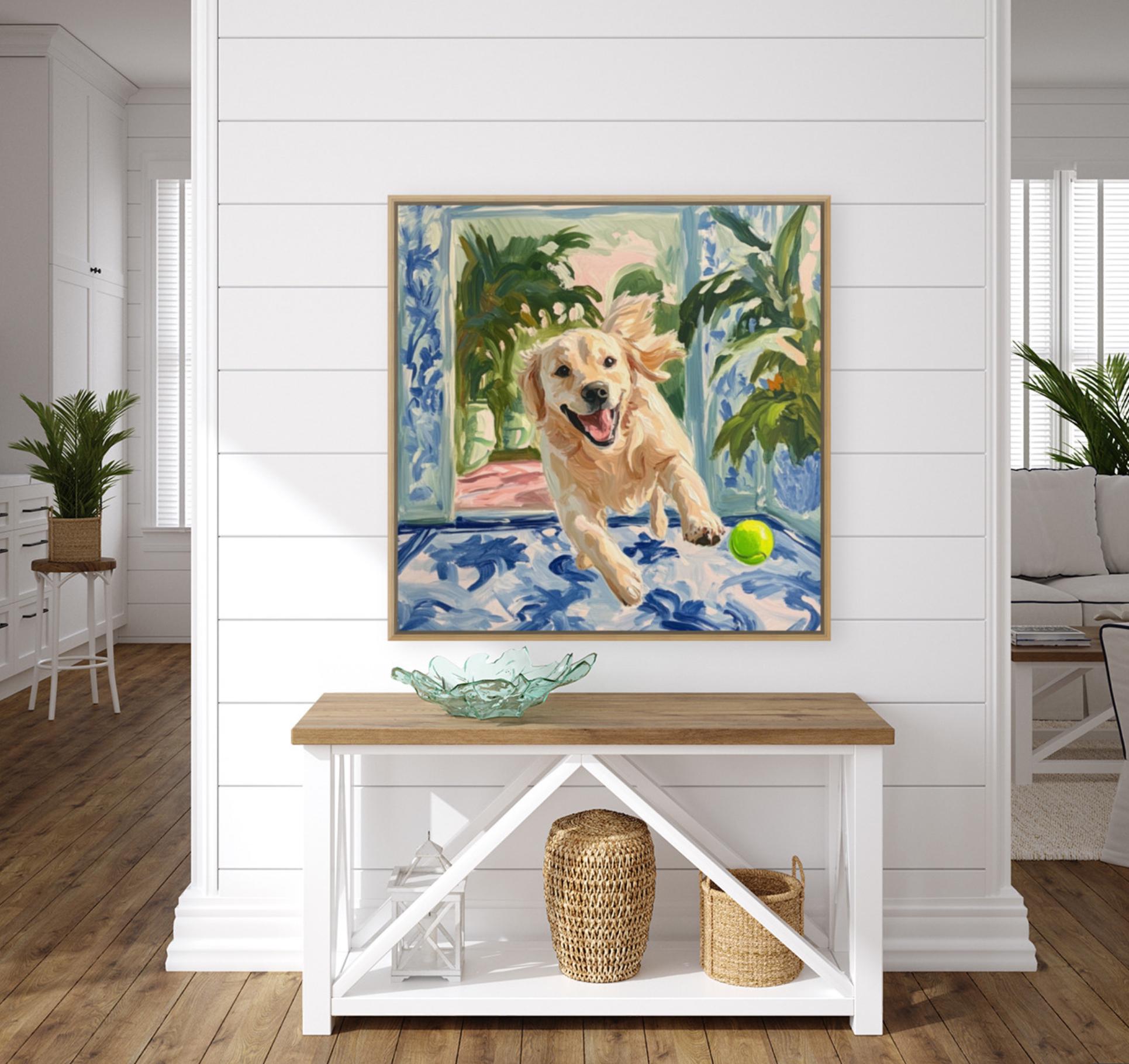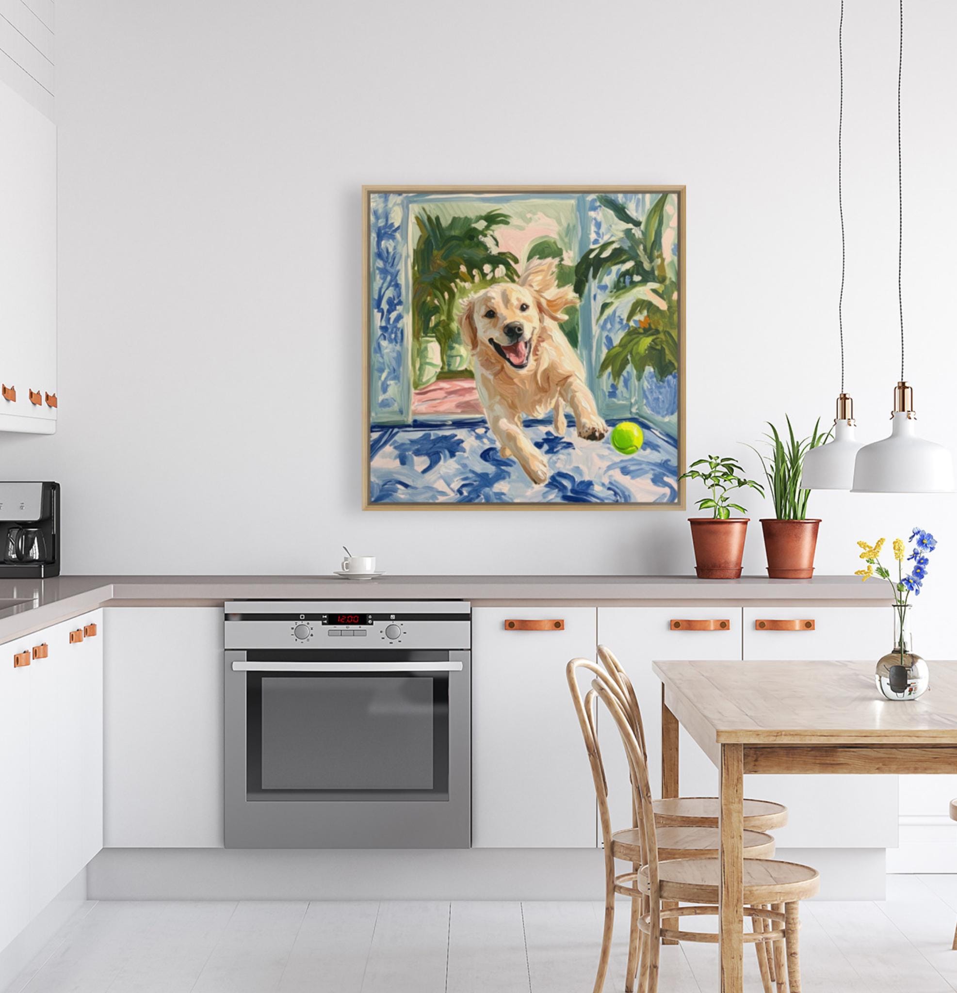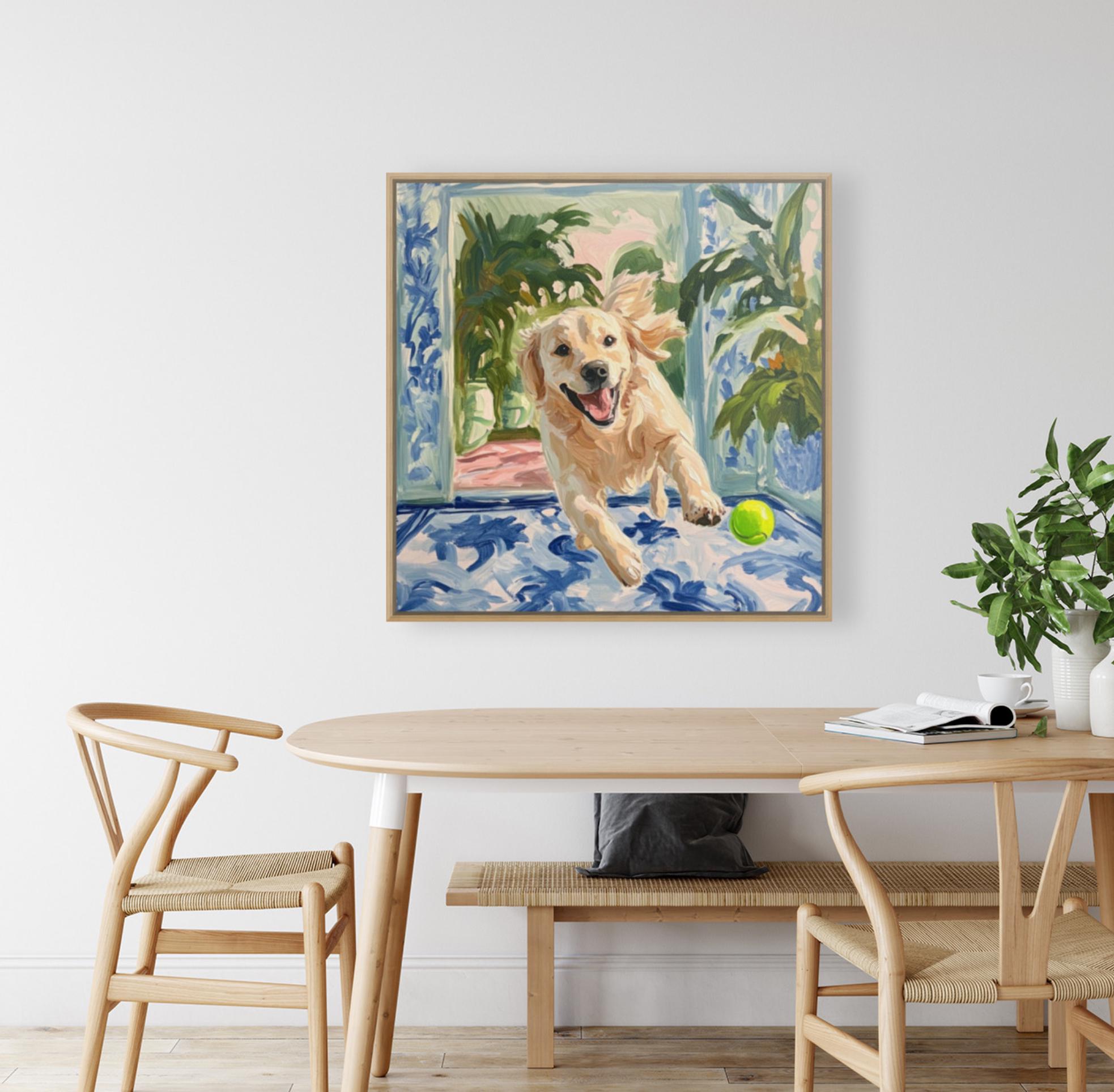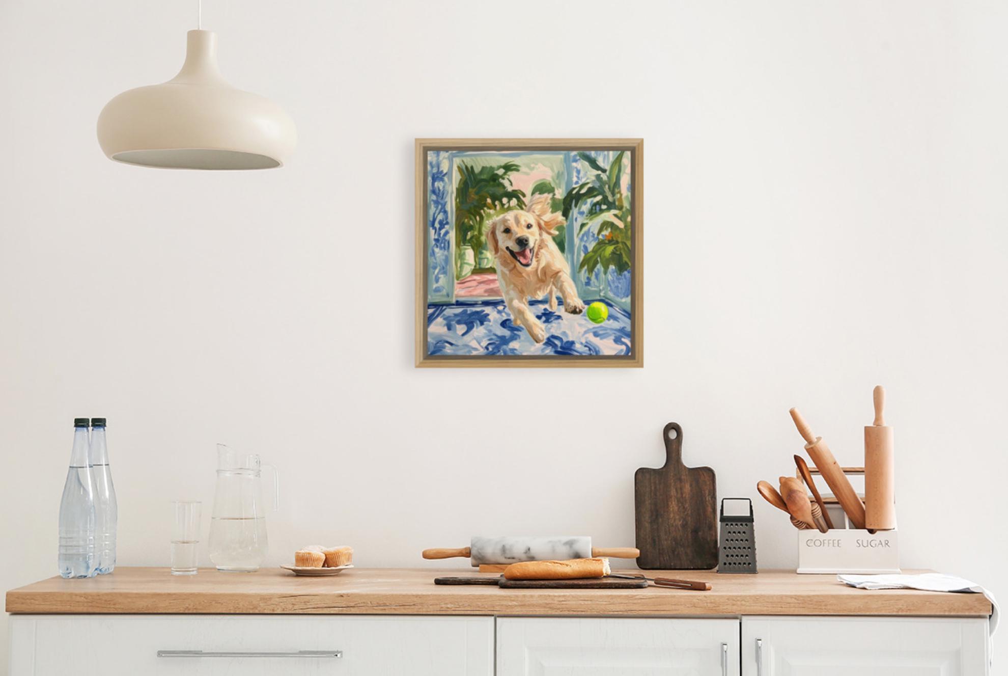 Grandmillennial art, Golden Retriever chasing a tennis ball, whimsical fine art