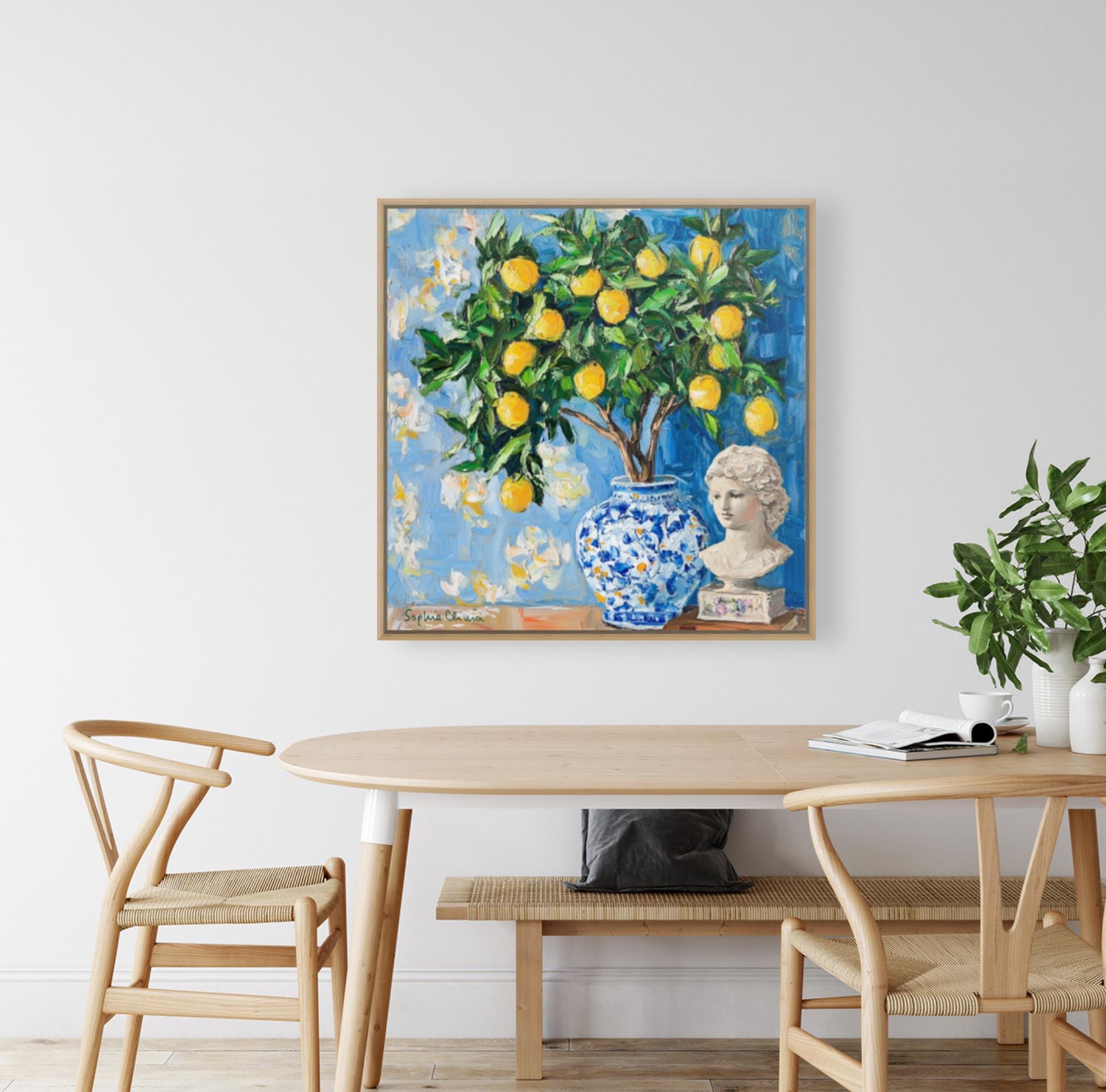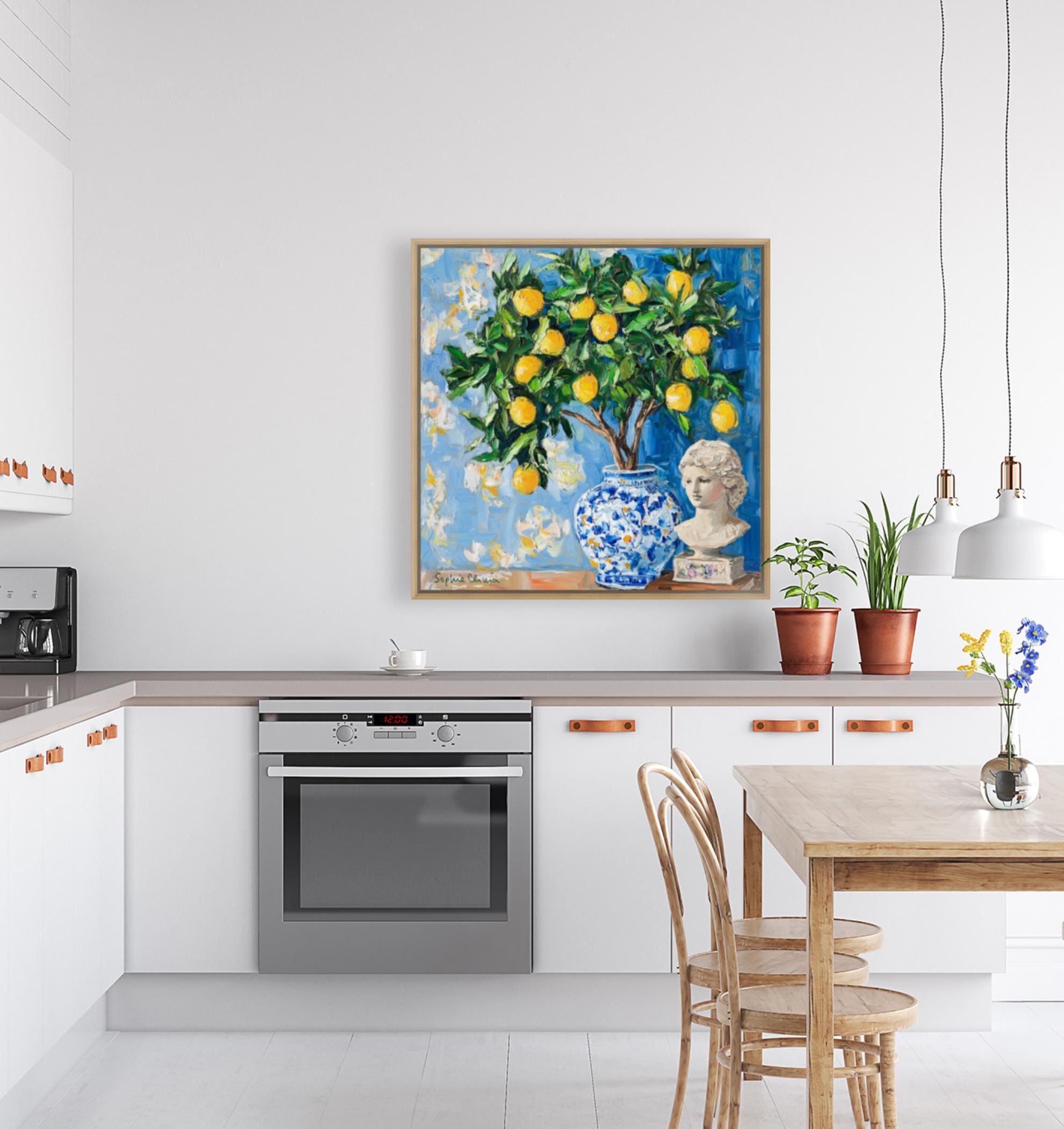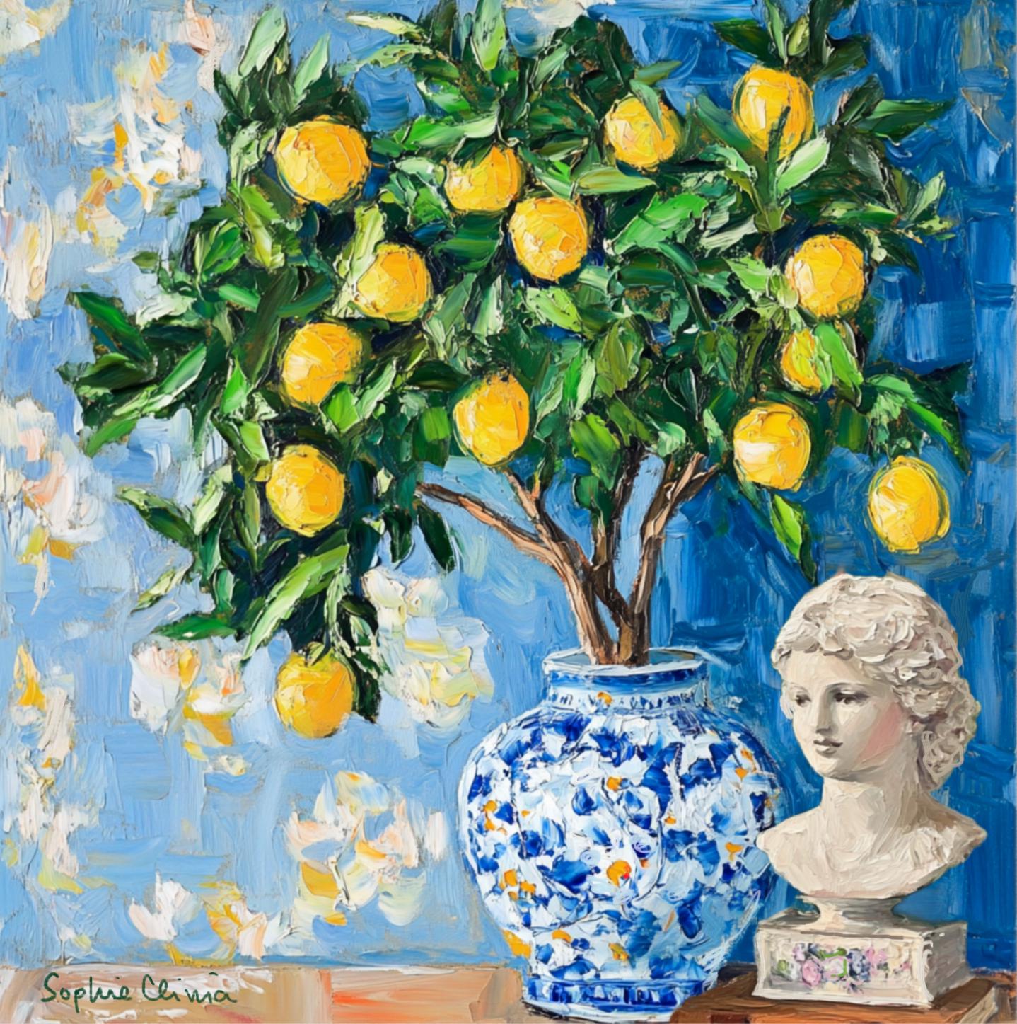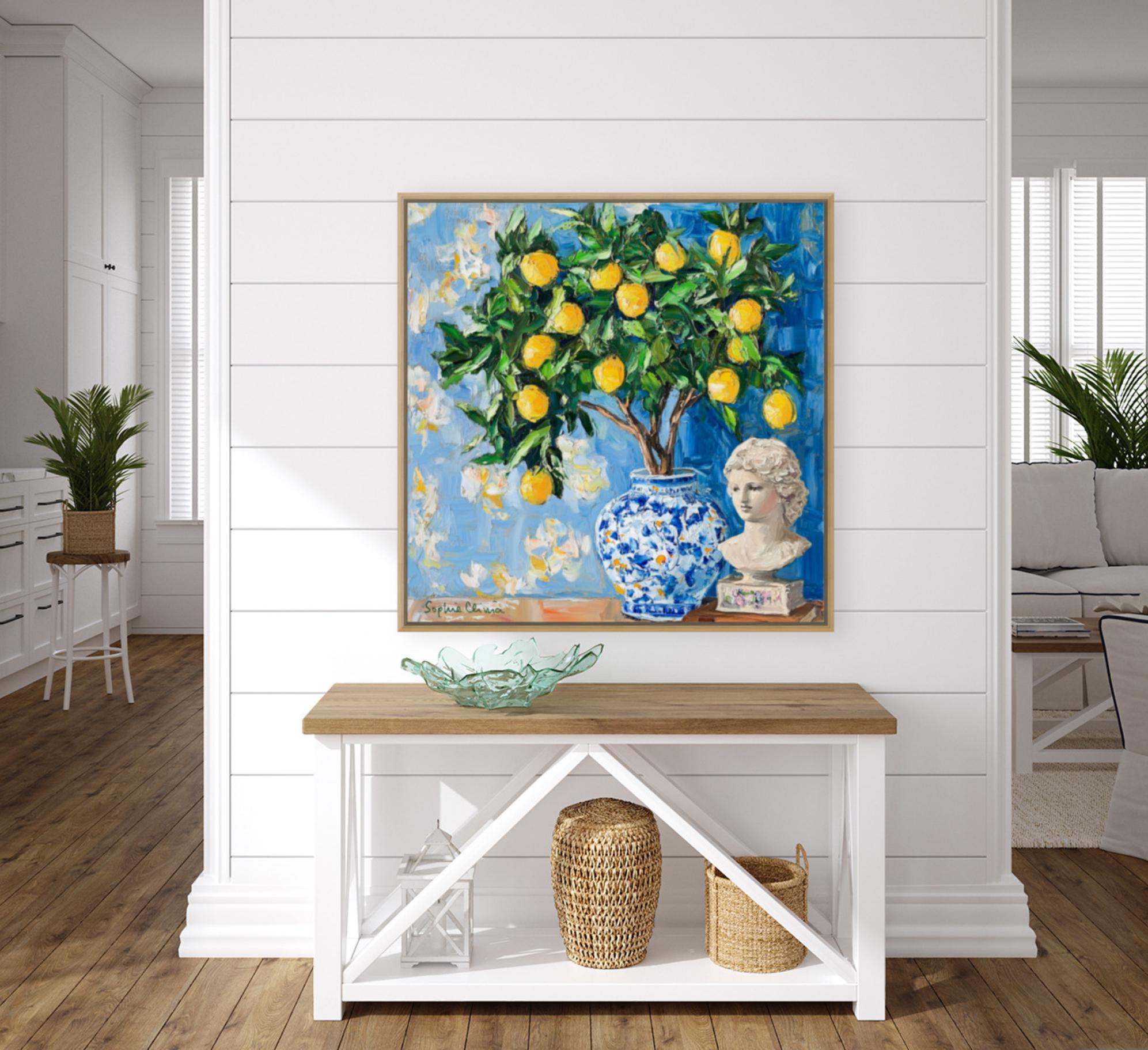 grandmillennial art, Still life with lemon tree in ginger jar, oil painting