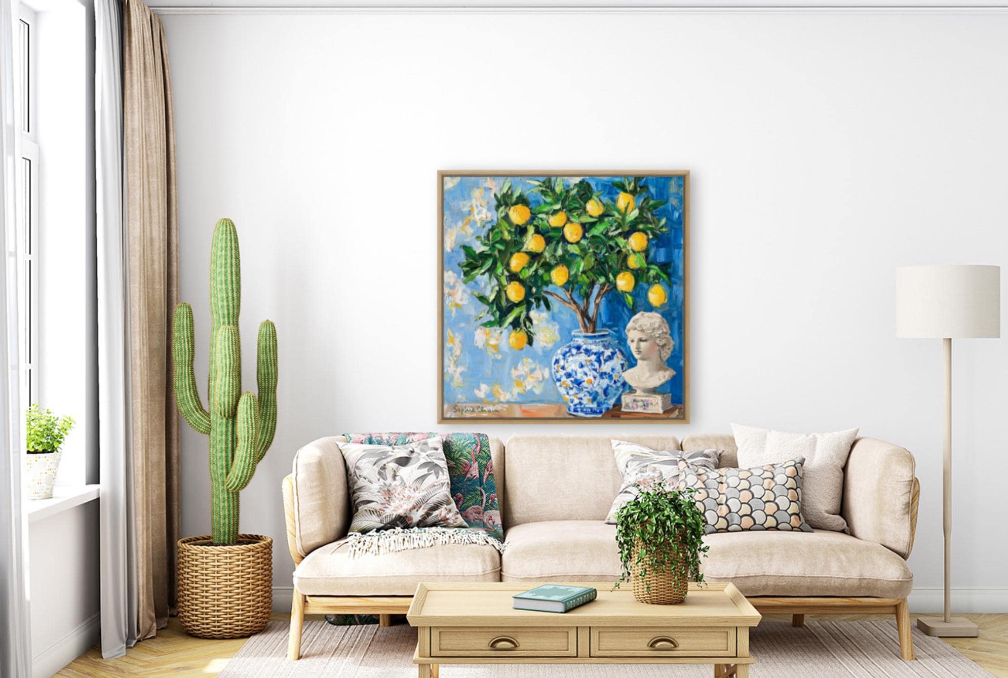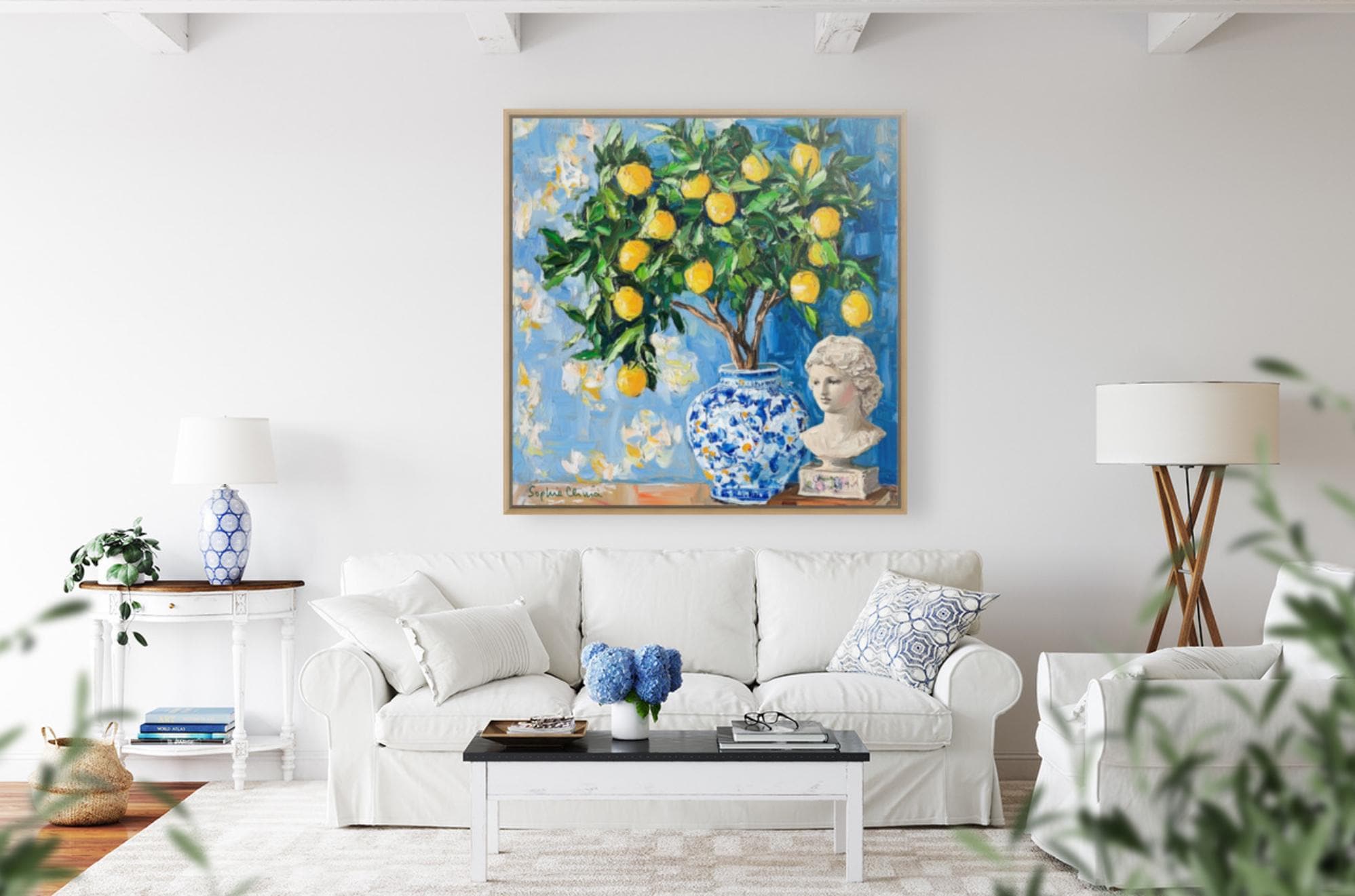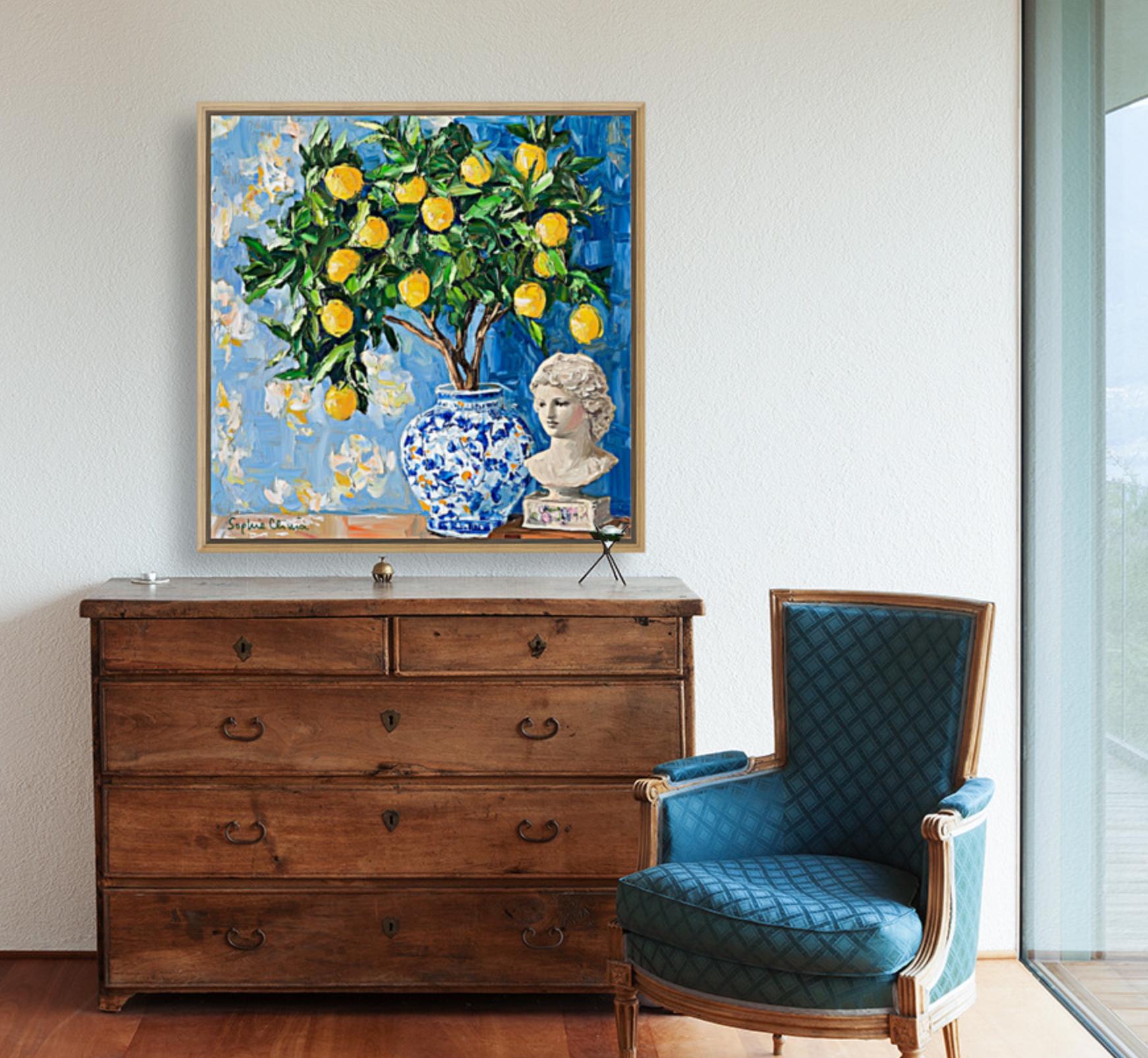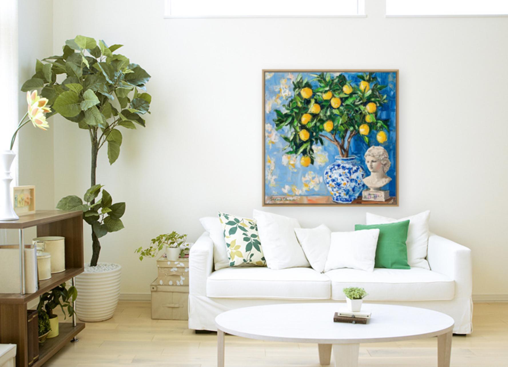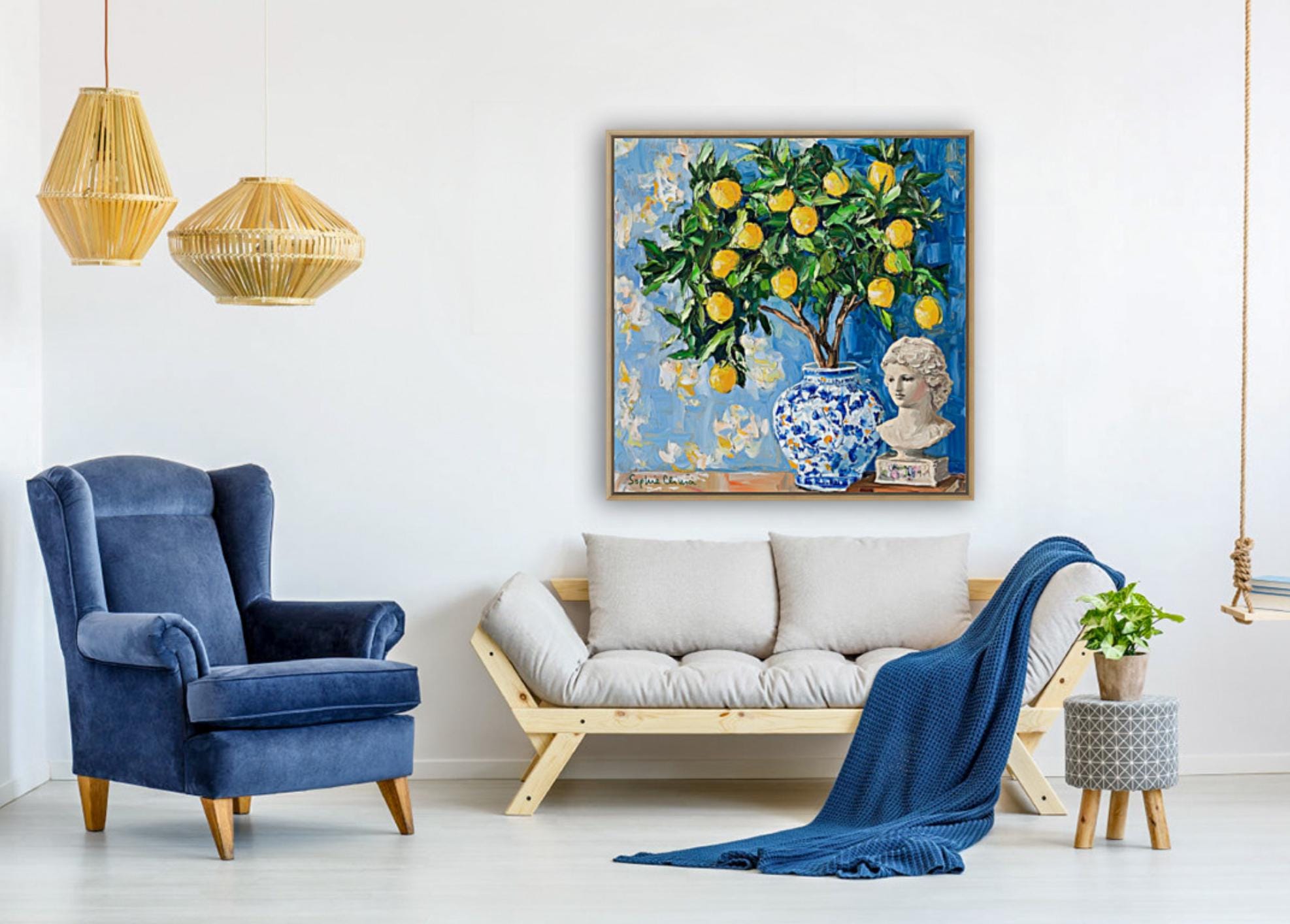 grandmillennial art, Still life with lemon tree in ginger jar, oil painting