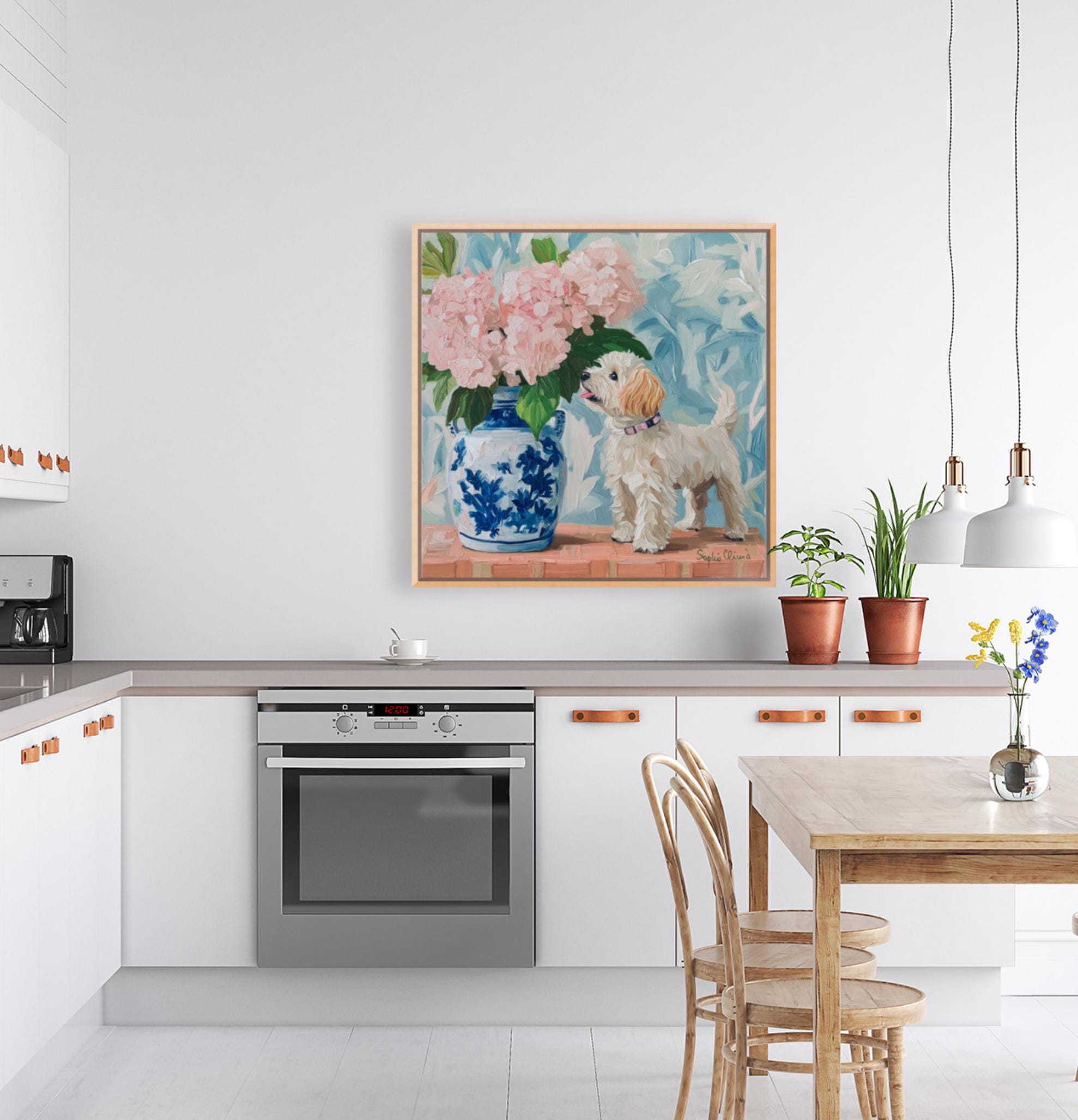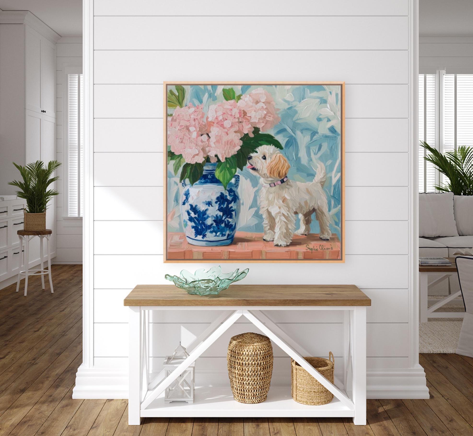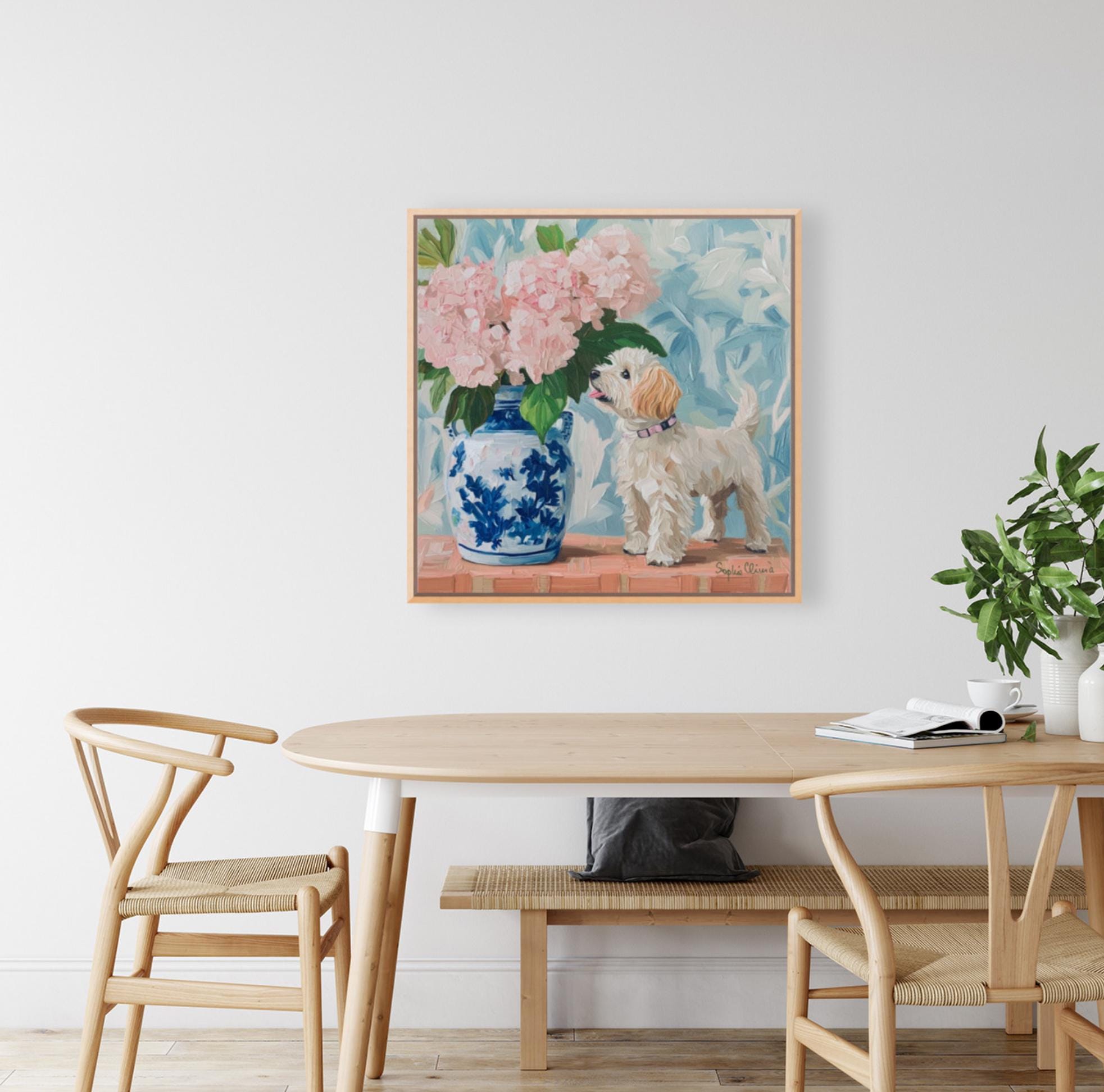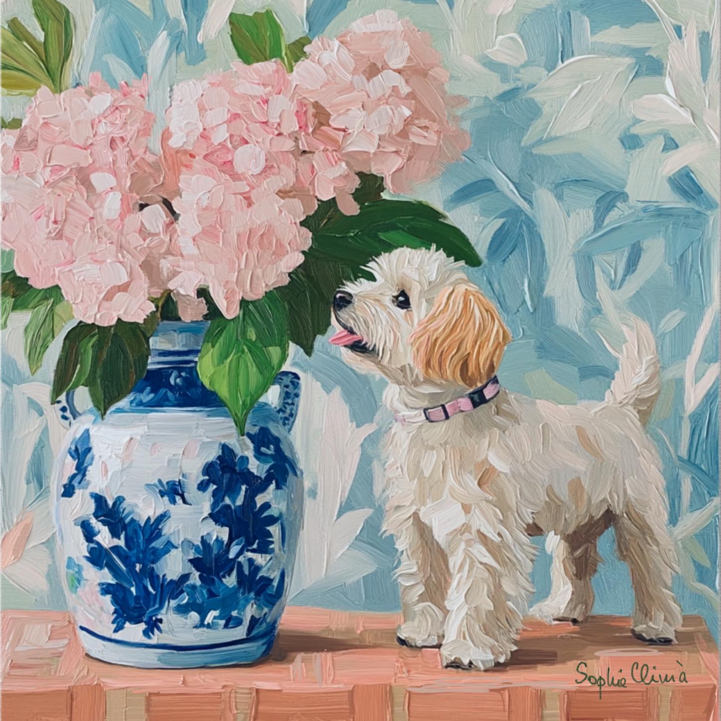 Grandmillennial art, Admiring the pink hydrangea, whimsical dog art