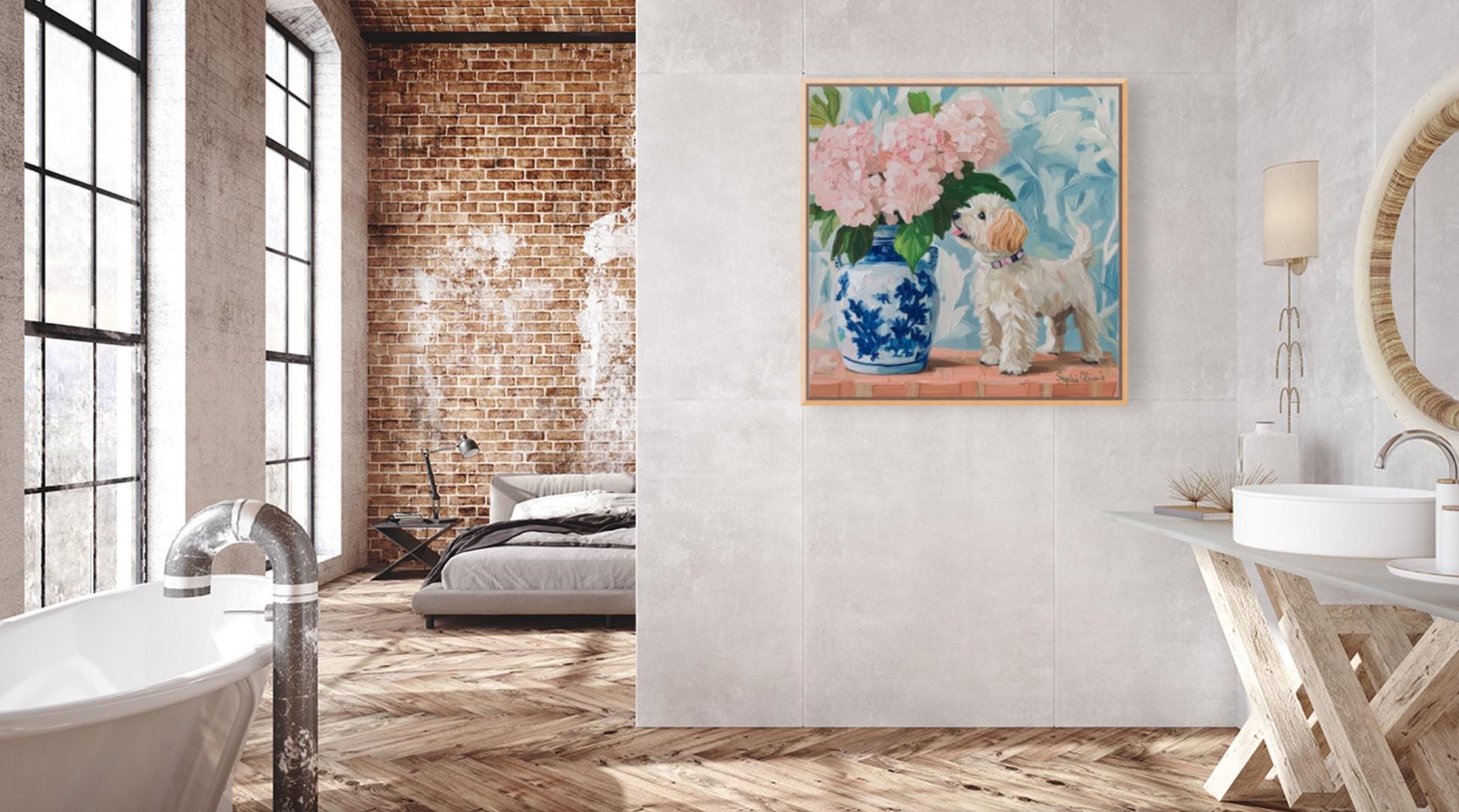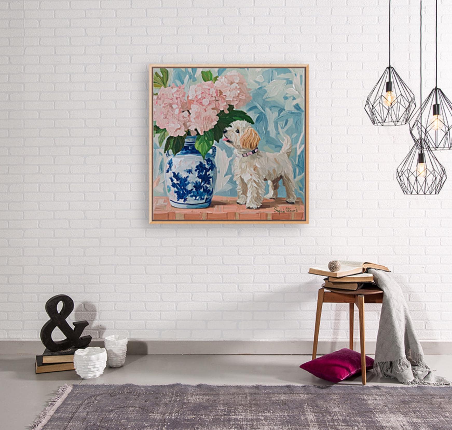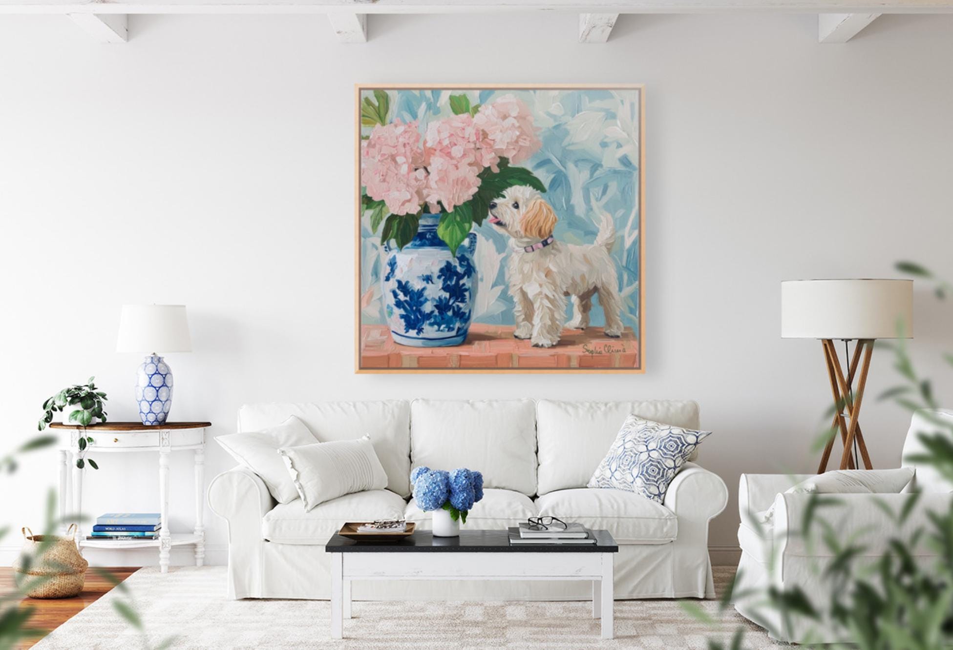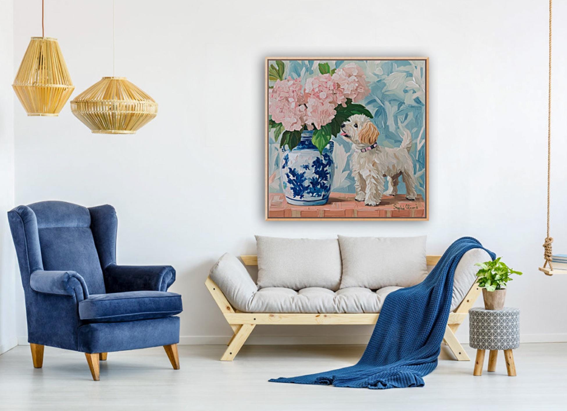 Grandmillennial art, Admiring the pink hydrangea, whimsical dog art
