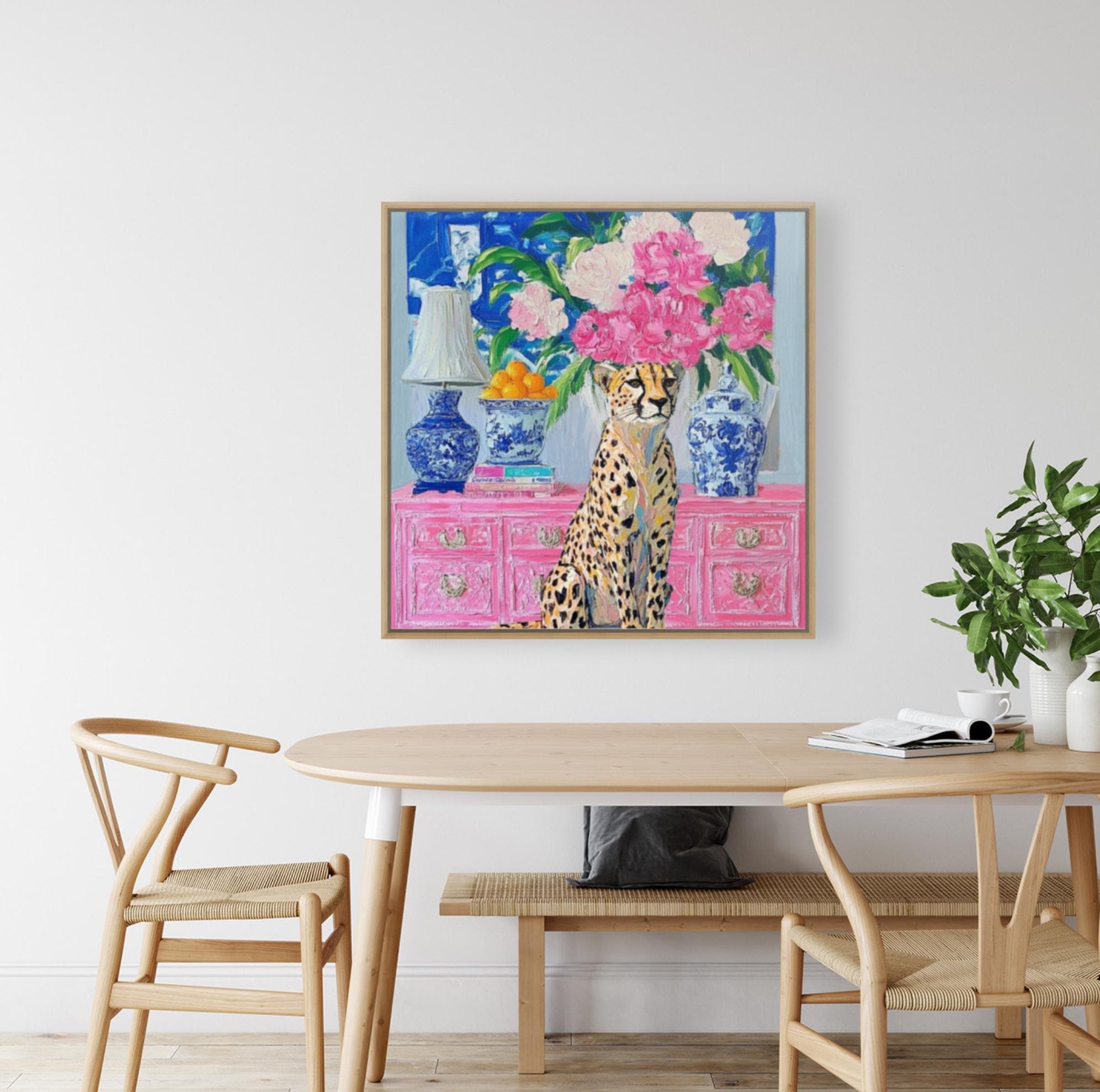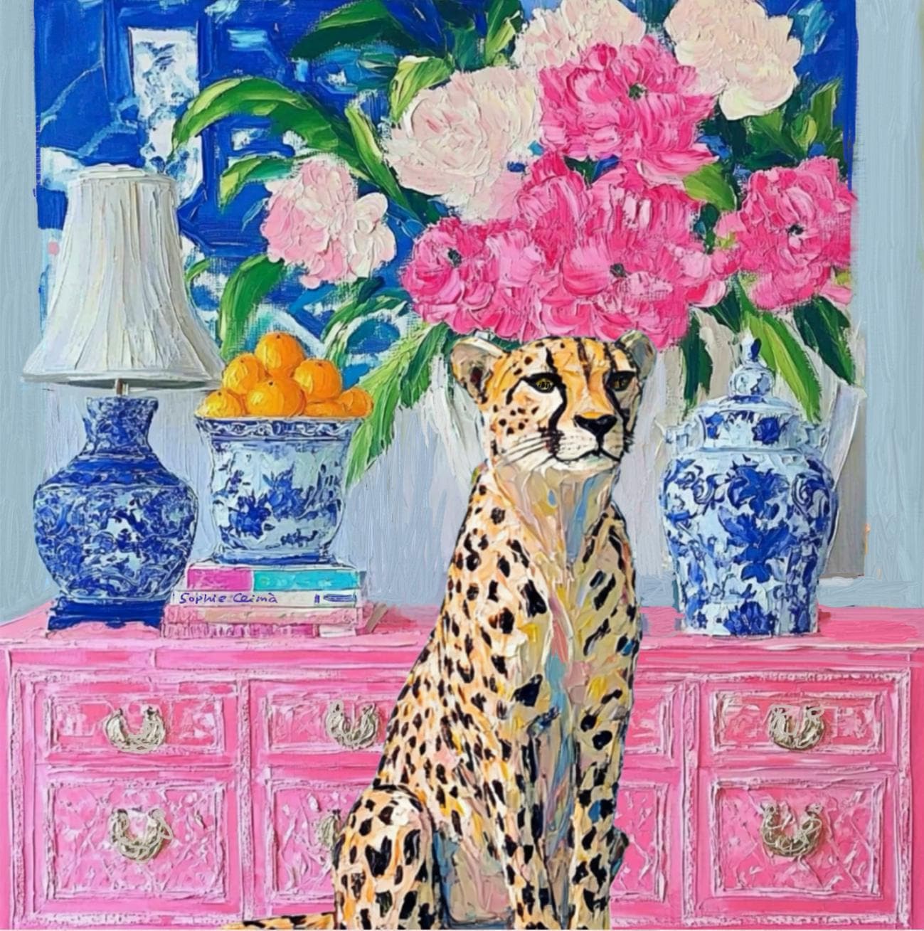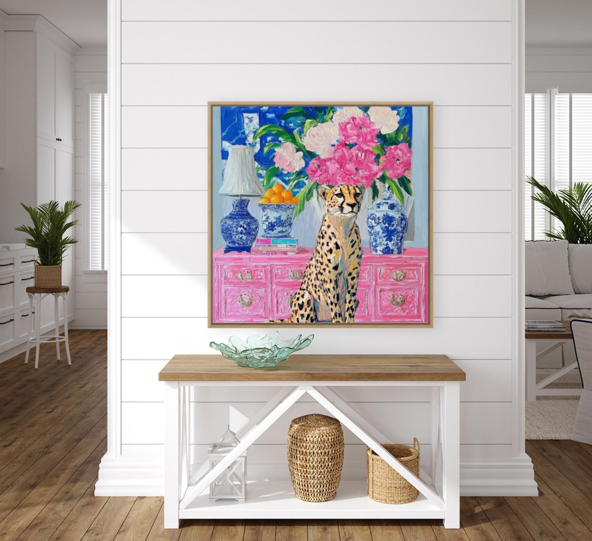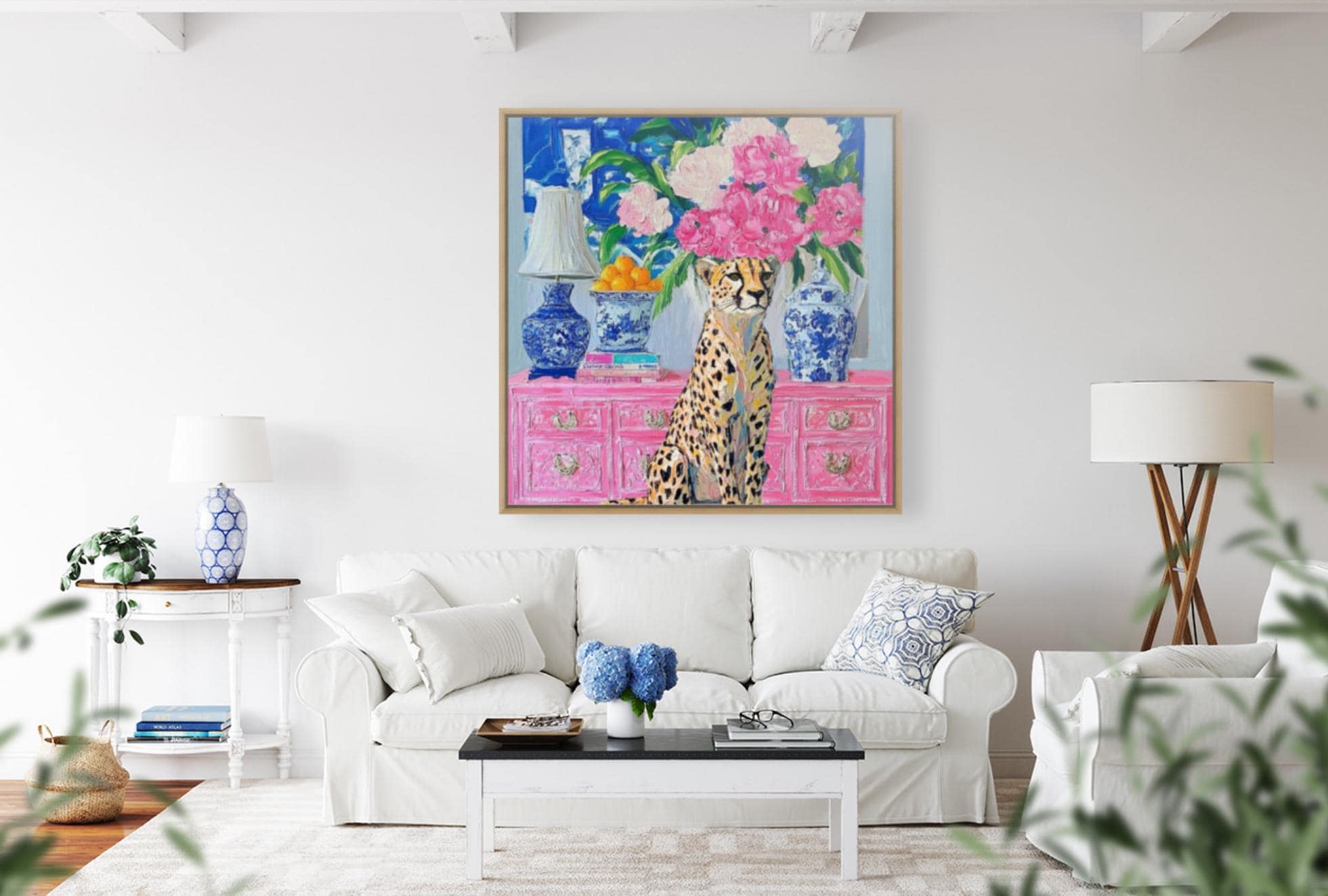 Grandmillennial art, Cheetah in preppy pink interior with ginger jars